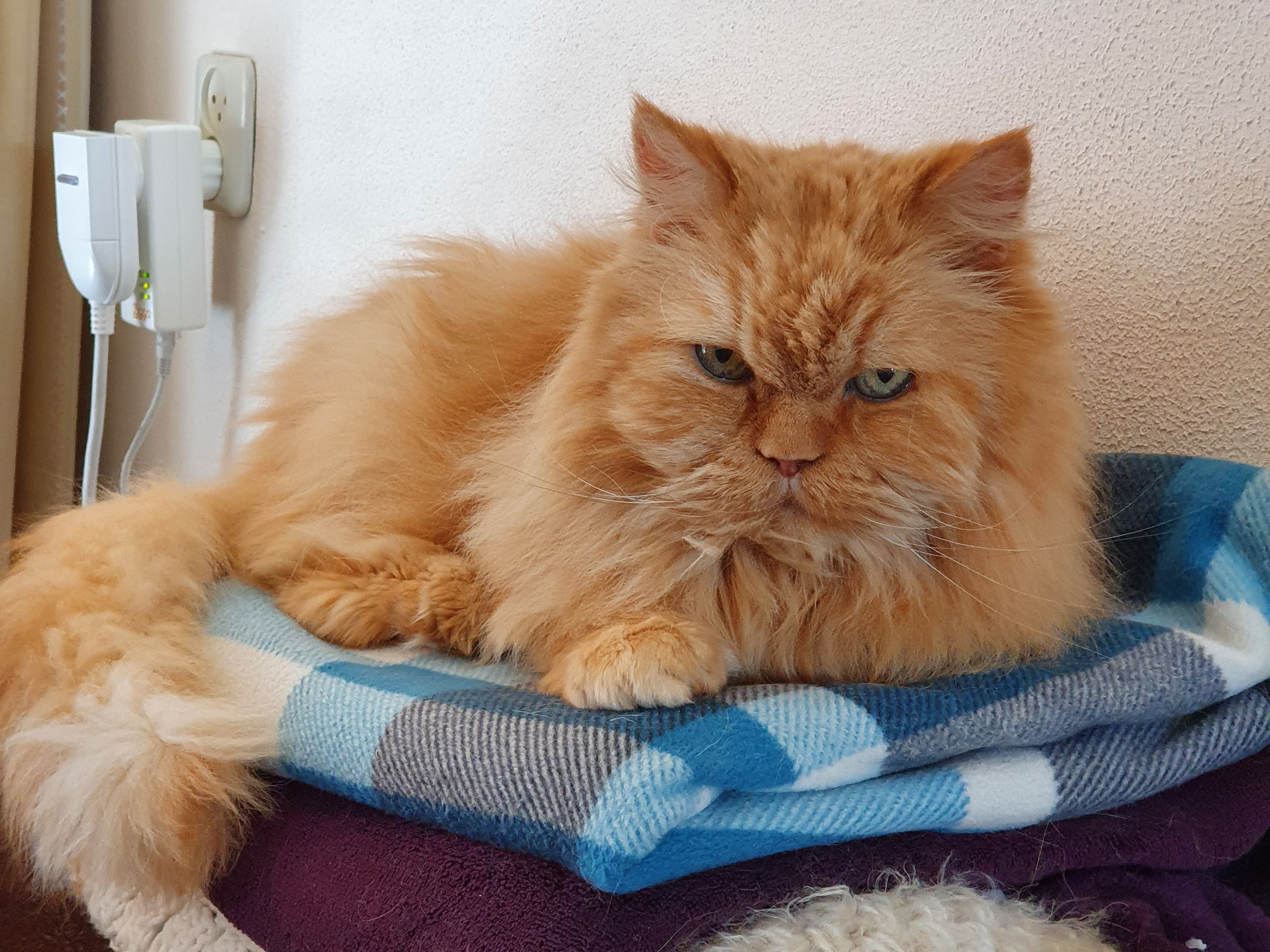 Hij was ook altijd ons “krolse poezen detector”. Nooit dekkater geweest, al op jonge leeftijd gecastreerd, maar als er een poes krols was, dan was meneer van de partij… hij moest dan van ons op zijn vaste plekje op de bank gaan liggen, wat hij ook wel deed, maar met tegenzin. Ook gisteren had hij Leia nog lastig gevallen die beginnend krols is. Hij was dan misschien oud, maar er zat nog heel veel pit in hem.