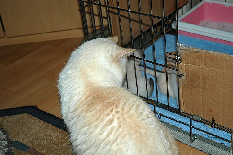 Niet alleen is ze waaks, ze kan haar kinderen geen moment missen. Als we ze de fles geven, moeten we mams in de bench opsluiten, anders haalt ze de kleintjes uit je handen of van de weegschaal vandaan en brengt ze terug naar de bench. Op een gegeven moment was het zelf zo erg, dat ze Taji op de kattenbak had verstopt omdat hij de fles nog moest krijgen.