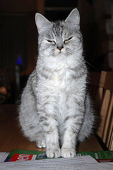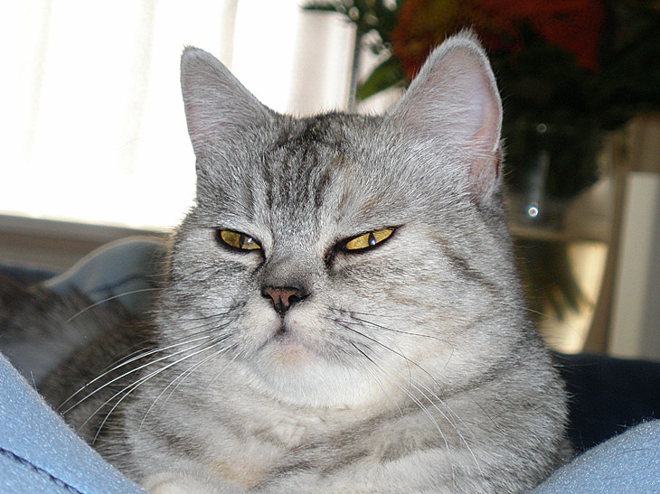 Blue Tess is ontzettend waaks. Ze heeft Demi (onze Westie) al een dreun gegeven en als een van de andere katten ook maar in de buurt van de bench durft te blazen, dan vliegt ze er achteraan en jaagt ze hem/haar naar de keuken. Vervolgens gaat ze weer rustig terug naar de bench en is de vrede hersteld.