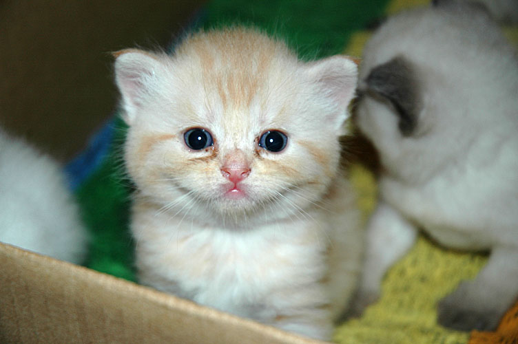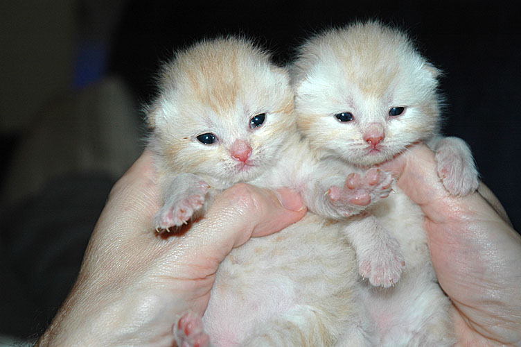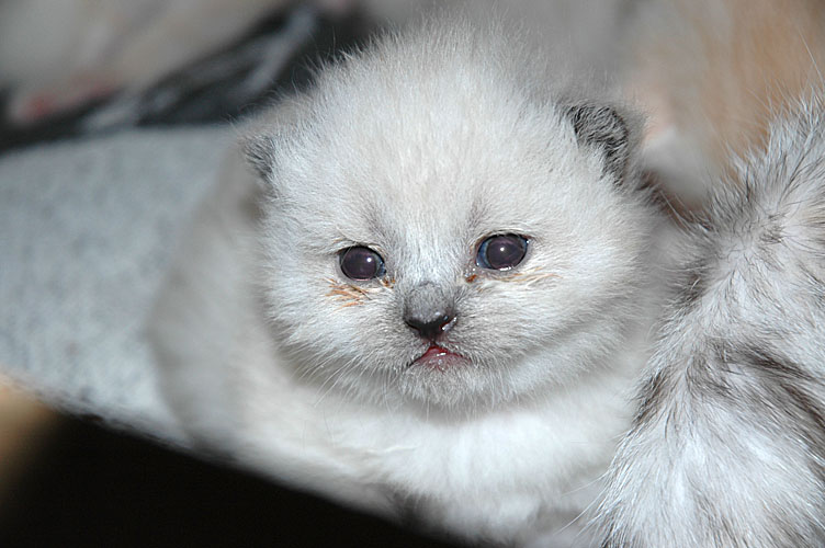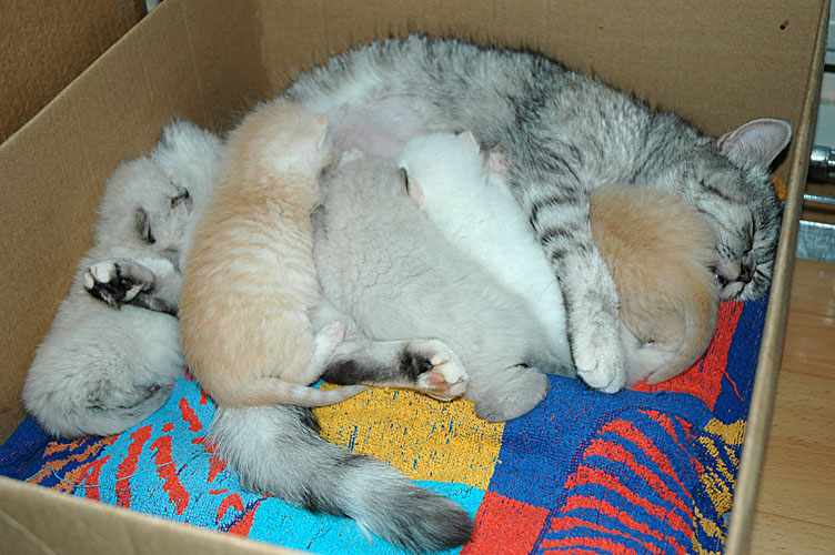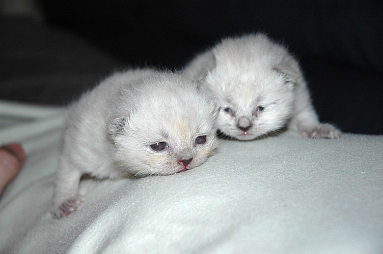 Er is veel gebeurd de afgelopen week. De explosieve start heeft toch een beetje zijn tol geëist. Omdat Blue Tess niet in de juiste houding ging liggen, konden de kittens niet meteen drinken. Als gevolg hiervan waren een paar kleintjes te zwak om na het tweede bezoek aan de dierenarts zelf te drinken en zijn we ze de fles gaan geven. De dames kwamen daarbij wat moeilijk op gang, maar de heren pikten het snel op en gingen kort daarna ook bij mams drinken, niet volledig maar voldoende om niet af te vallen. In de tweede helft van de week ging het steeds beter en begonnen ook de dametjes goed op gewicht te komen en gingen ze af en toe bij mams drinken.