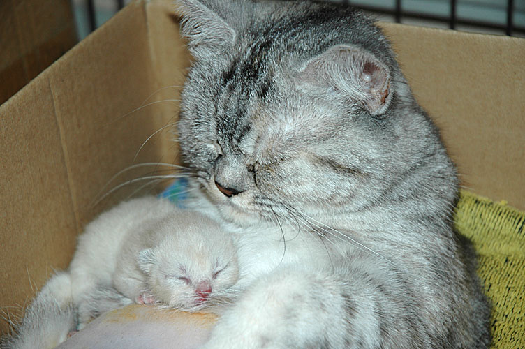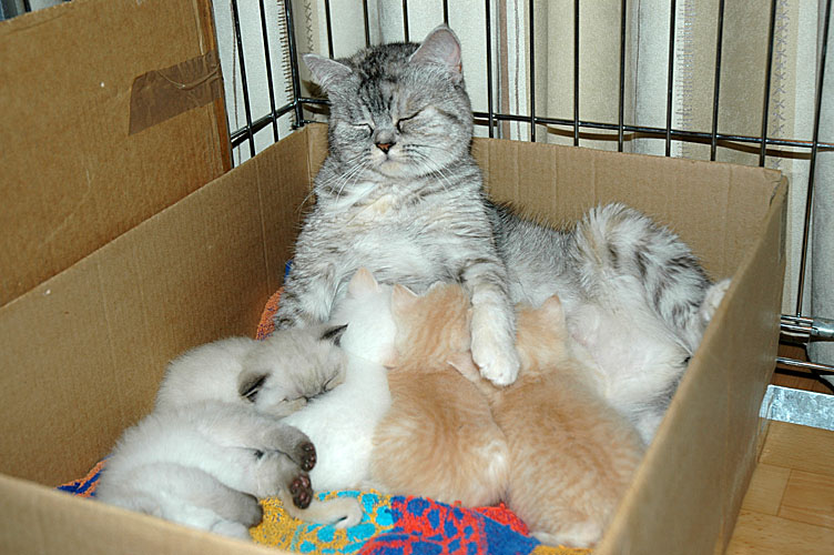 Jullie hebben er een dagje op moeten wachten, maar we hebben goed nieuws. Gisteren is Blue Tess bevallen (via een keizersnede) van vijf gezonde kittens.