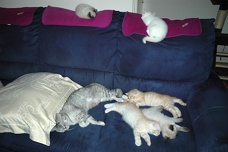 Vorige week woensdag zijn de hechtingen bij Blue Tess verwijderd. Ze heeft er geen mooie wond aan overgehouden. Een paar hechtingen waren er al door de kleintjes uitgehaald en ze hadden met hun scherpe nageltjes in de wond gekrabt, waardoor deze een beetje open was gegaan. Ook heeft ze een schrale plek op haar buik. Dit alles is er waarschijnlijk de oorzaak van dat ze in het begin wat minder geduld had voor haar kleintjes. De pijn was erger dan haar moederdrang. Nu is het soms ook nog zo dat ze de kittens “afschudt”. Dan zijn ze met elkaar aan het vechten om een tepel en krabben ze over haar wond of schrale plek. Dit doet Blue Tess zo’n pijn dat ze het letterlijk uitschreeuwt en de kleintjes van zich afschudt. Arm beest!!