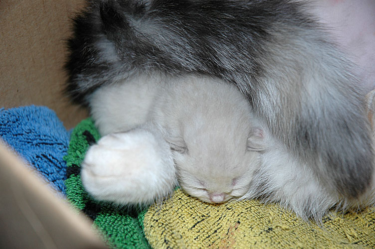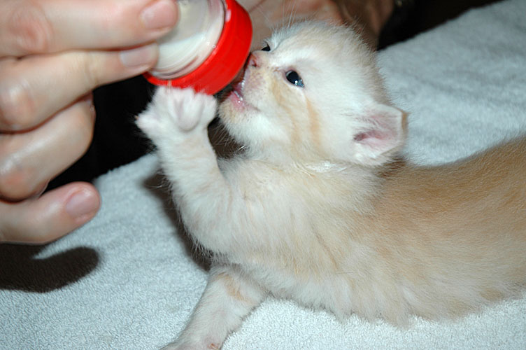 Nu hadden we een nieuw probleem. De kittens waren gedurende dag zoveel afgevallen en zo vermoeid dat ze niet zelf bij mams konden drinken. Daarnaast is Blue Tess een onervaren moeder en weet dus ook nog niet zo goed wat ze met het grut aan moet, behalve schoonhouden dan. Om te voorkomen dat de kleintjes teveel gewicht verliezen, zijn we gisteravond met “flessen” begonnen en dat gaat goed. Een van de kittens, Kai, drinkt wel zelf bij zijn moeder, dus blijft de melkvloed op gang en als de rest wat sterker wordt, zullen ze zeker een tepel vinden en gaan drinken.