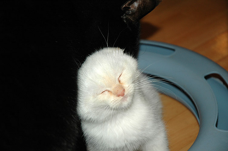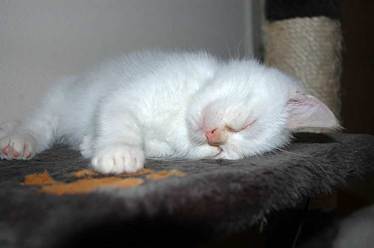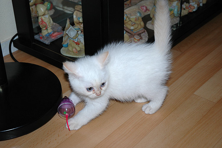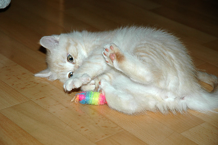 Laleh heeft een nieuw speeltje: een stukje papier. Ze is er zo fel op dat als een andere kat in haar buurt komt, als zij een papiertje heeft, ze dat papiertje vastklemt tussen haar tandjes en begint te grommen. Prachtig is dat… en tja… dan kun je als broer natuurlijk niet achterblijven, dus een paar daagjes later zat ook Macho met een papiertje in zijn bekje te grommen.