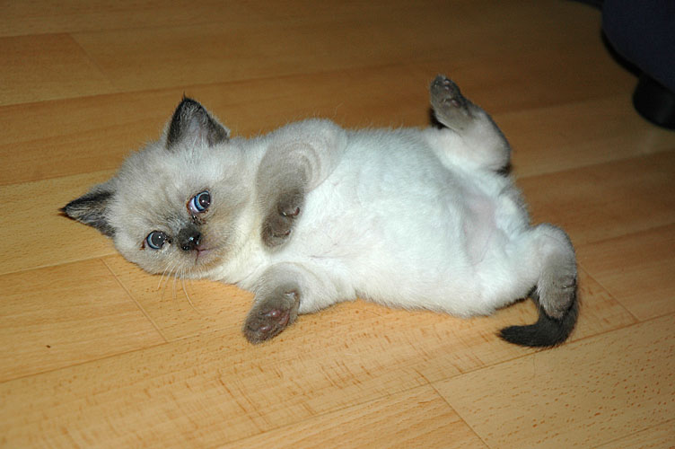 Tegelijkertijd is Kyra met een charme offensief bezig. Met haar droefoogjes kijkt ze je aan, gaat dan op haar rugje liggen om gekroeld te worden, komt dapper op je afstappen voor een kroeltje en meer van dat soort dingen. Ook zij is een scheetje, maar ja… we kunnen toch niet alle katjes houden… 😦
