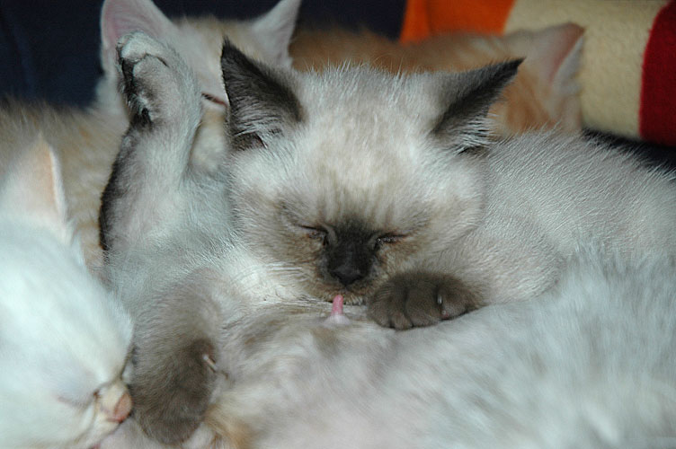 Alweer drie weken oud. Als je ze zo ziet liggen, dan geloof je het bijna niet… ze lijken wel ouder! Het lichtste kitten uit dit nest is net zo zwaar als het zwaarste kitten uit het vorige nest. Ongelooflijk!
