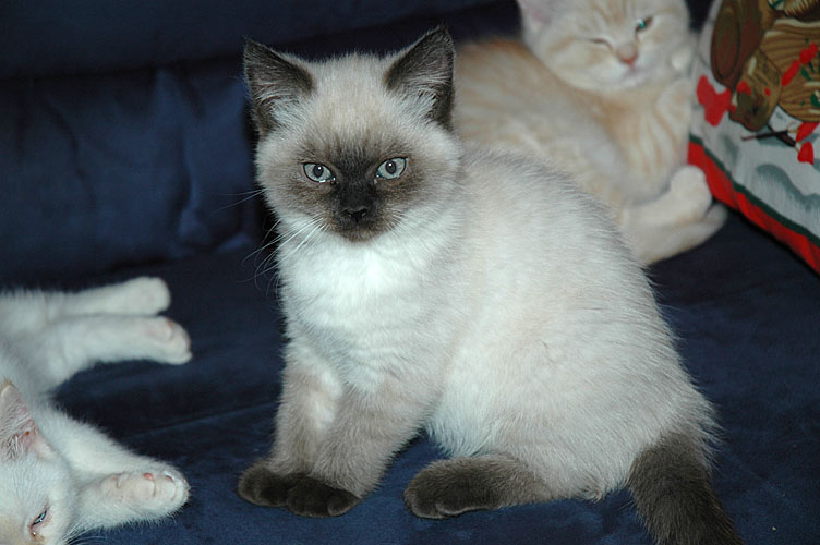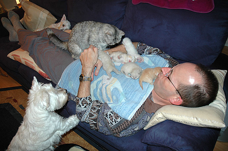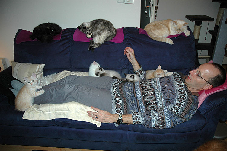 Rob met kittens, Blue Tess, Demi en op de achtergrond Quincy