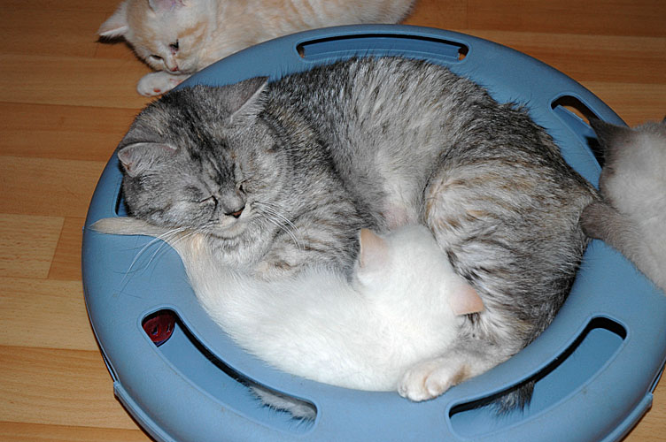 Zondag was Blue Tess de kluts kwijt. Waarschijnlijk door alle drukte van zaterdag. Terwijl Ria rustig op de bank zat hoorde ze tumult in de bench. Toen ze ging kijken zat Blue Tess naar de kattenbak te kijken en kwam daar een angstig gepiep vandaan. Wat bleek, mams had Macho daar verstopt. Het arme beestje. Zijn hele bekje vol met kattenkorrels. Geen wonder dat hij in paniek was. Dus snel de korreltjes eruit gehaald en mams een standje gegeven, dat dit toch echt niet de bedoeling is! En dat ze de mensentaal toch niet helemaal begrijpt bleek vandaag. Eerst was Rob Laleh kwijt en ja hoor, ook weer in de kattenbak. Even later weer tumult in de bench. Rob gaat weer kijken en telt slechts vier kittens. Inspectie in de kattenbak wees uit dat dit keer Frodo ontvoerd en verstopt was. Dus heeft Rob haar weer een standje gegeven, maar ja, of dit helpt?!