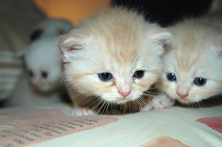 Inmiddels zijn ook alle oogjes open en kijken de kittens wijs de wereld in. De oortjes zijn nog dicht, maar niet voor lang meer, denken we.