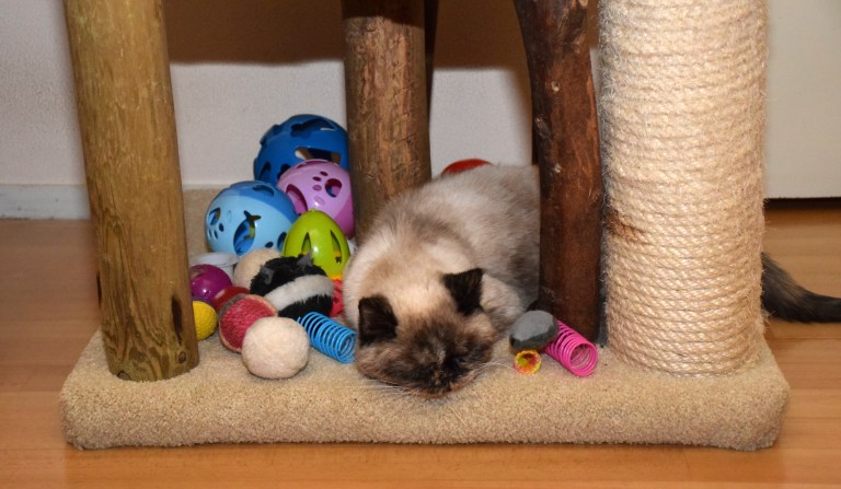 Gelukkig knapte ze hierna snel en goed op en moest ze zelfs op dieet omdat ze onverzadigbaar was met eten. Ze at gewoon net zolang door tot er niets meer was. Tja en dan vliegen de pondjes er bij het dametje toch aan, dus ’s nachts in de bench met een afgemeten hoeveelheid voer en overdag geen voer meer neergezet. Dat was voor de andere katten ook even wennen, maar iedereen paste zich snel aan en het duurde niet lang of Feline had weer een mooi gewicht.
