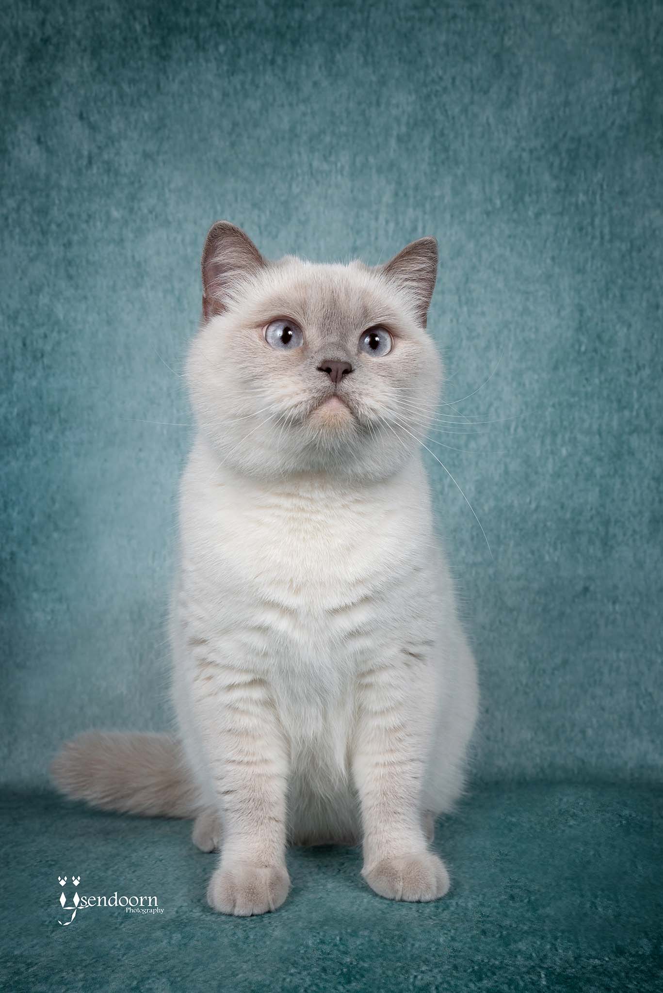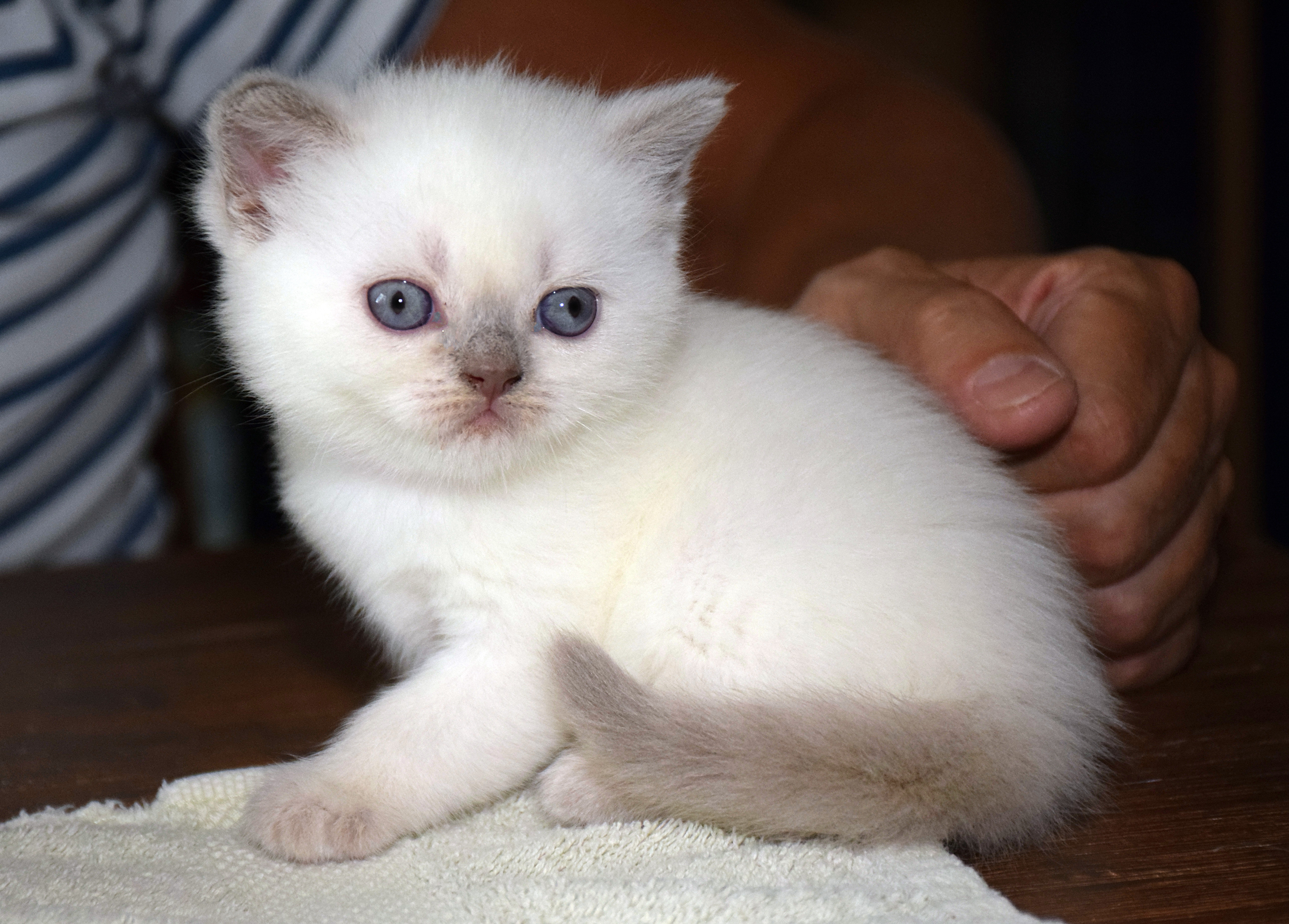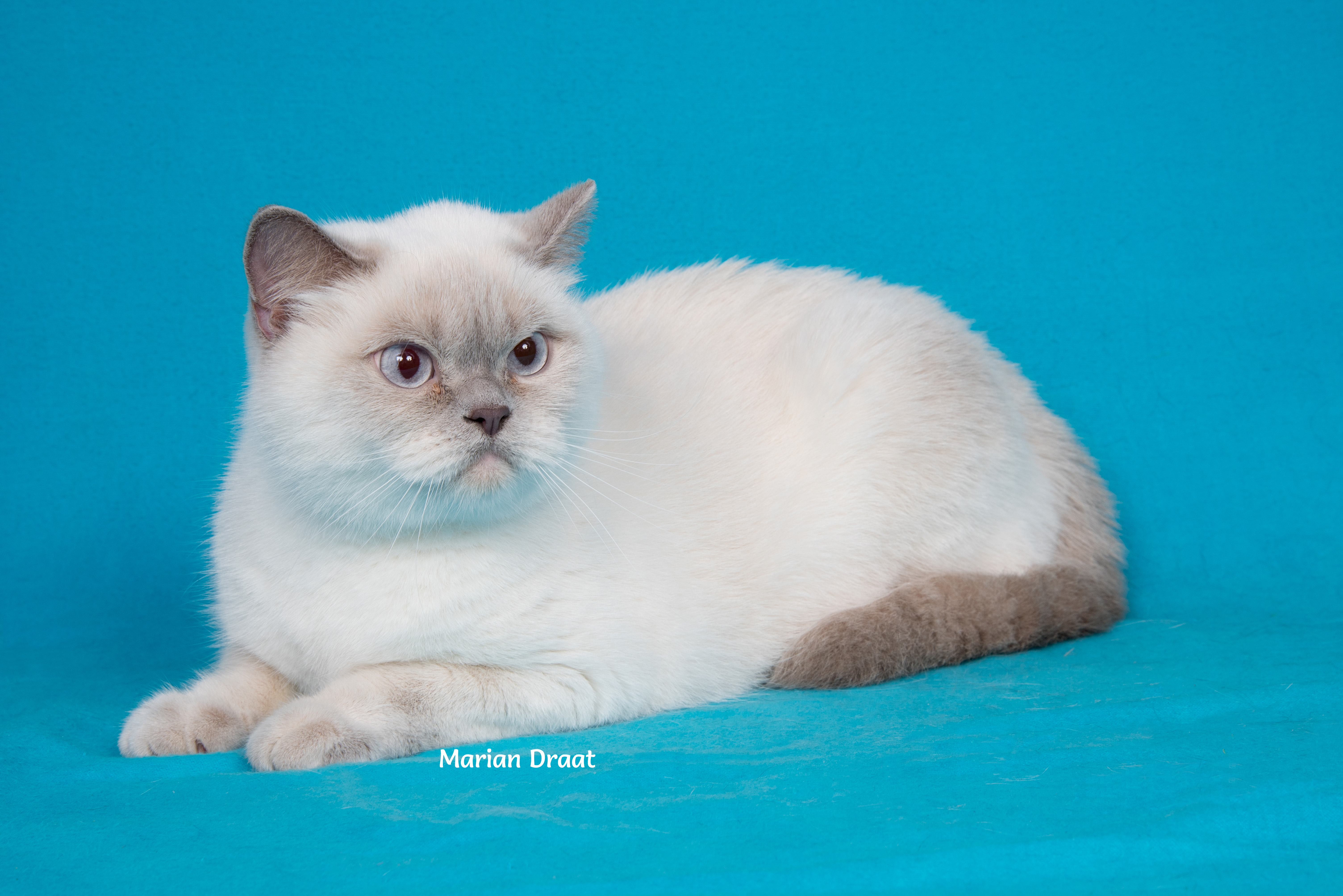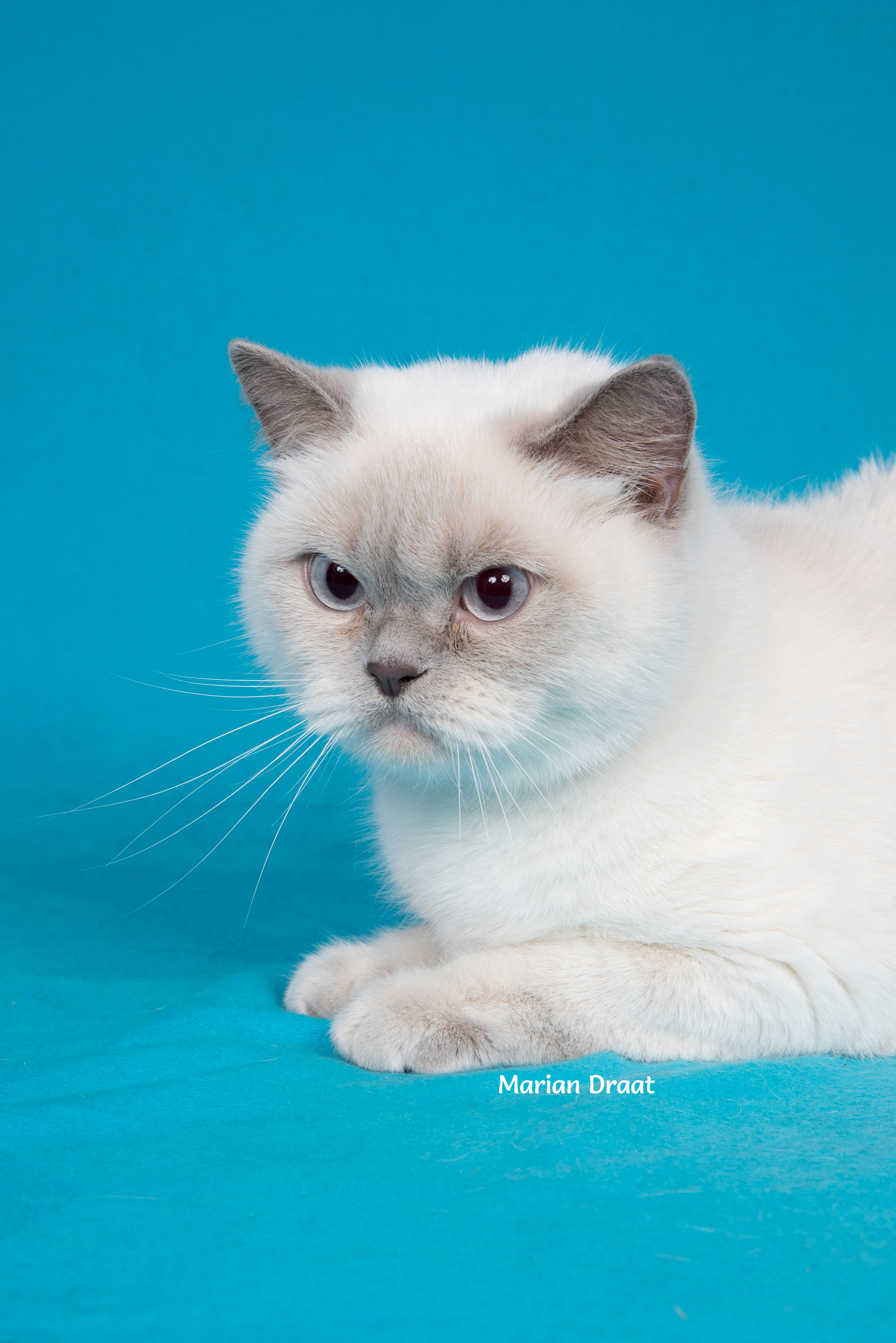 Na een aantal pogingen en vooral veel geduld, waren we ontzettend blij dat Shanna zwanger was. Wat keken we uit naar haar kittens. Van de zes kittens die ze droeg mochten er helaas maar vier het levenslicht zien. Een van deze vier kittens was een poesje en wat voor een. Al meteen na de geboorte zagen we het, dat mooie ronde bolletje zou gaan uitgroeien tot een mooi poesje. Haar koppie was bijna 2x zo breed als dat van haar broertjes, de oortjes stonden letterlijk aan de zijkant van haar bolletje. En… na een paar weken wisten we ook zeker dat ze lilac point was. Onze droom kwam uit: een lilac point poesje met mooie typering uit eigen fok. Wat ook zo leuk was: ze was een kroeltje. Ze genoot van de kroeltjes die je haar gaf en al snel wist ze dit genoeglijk te ondersteunen met een lief zacht gespin.