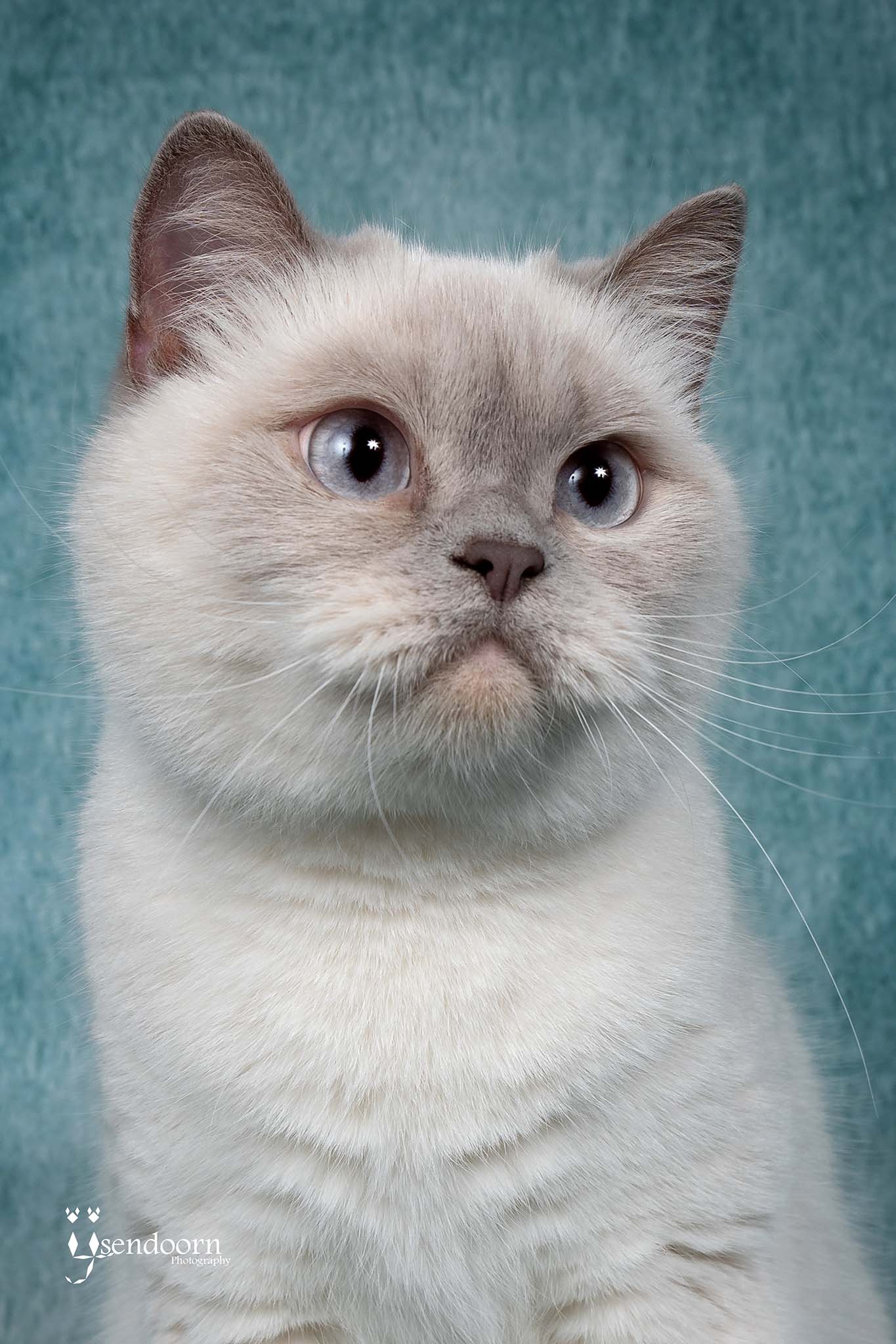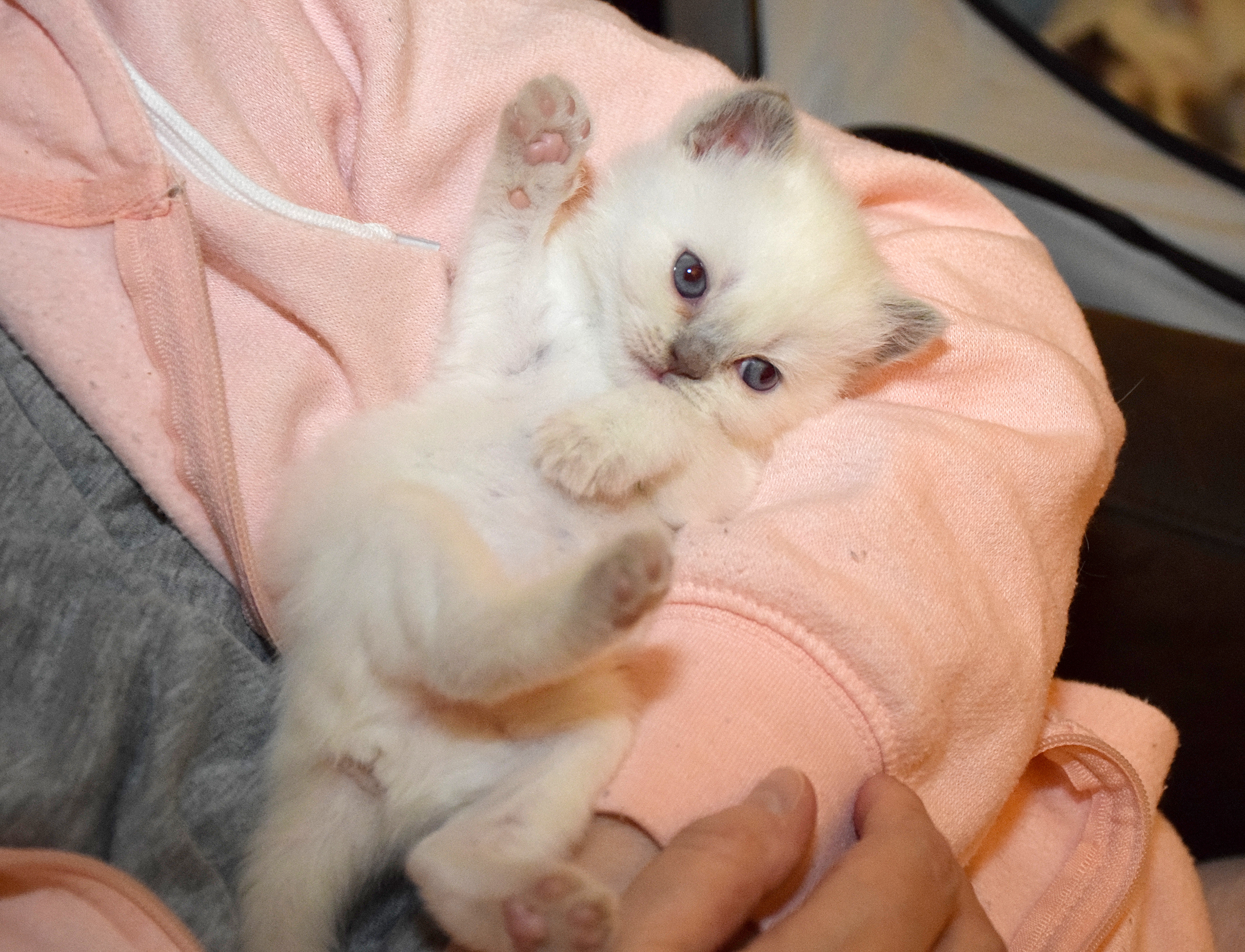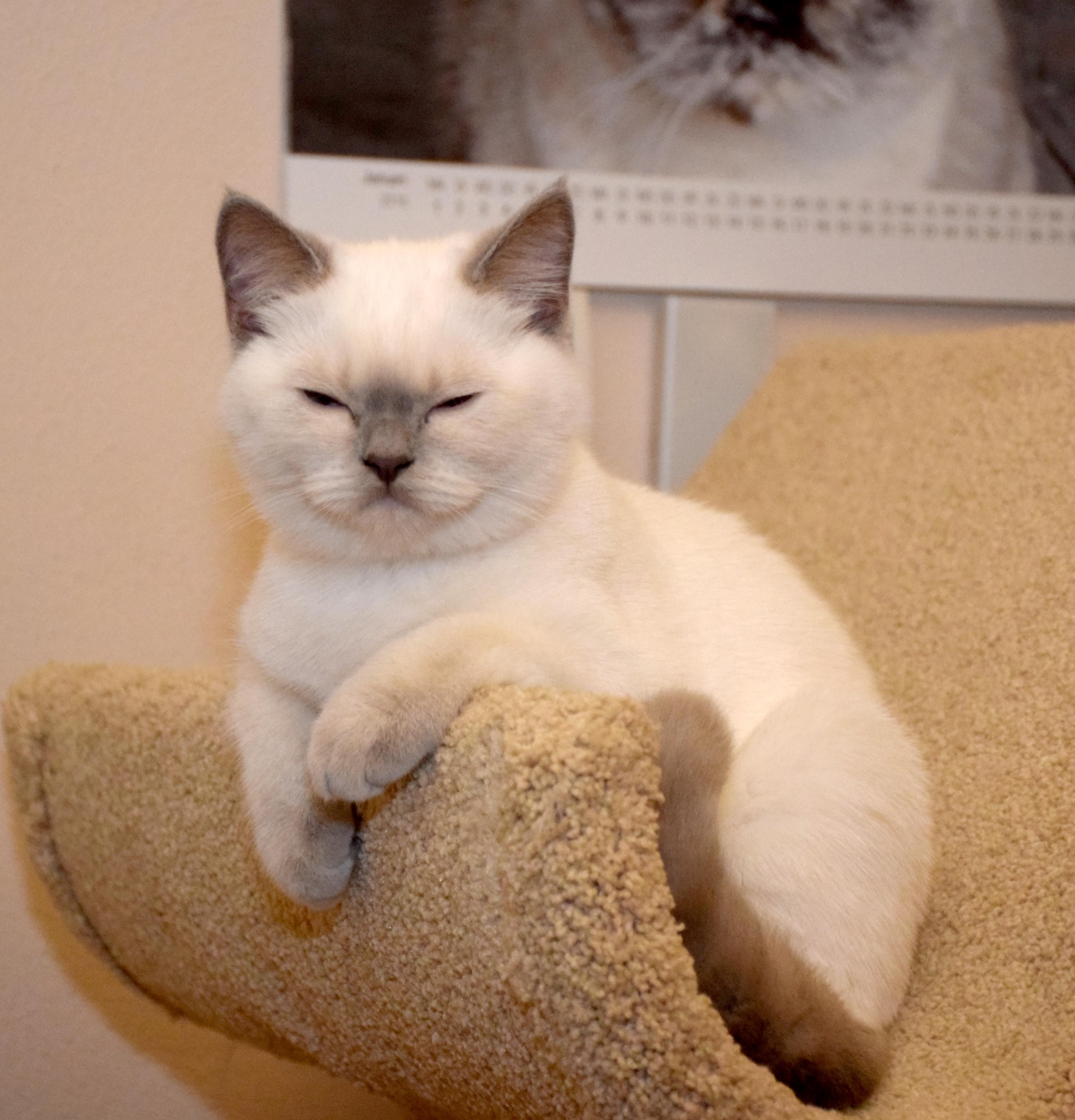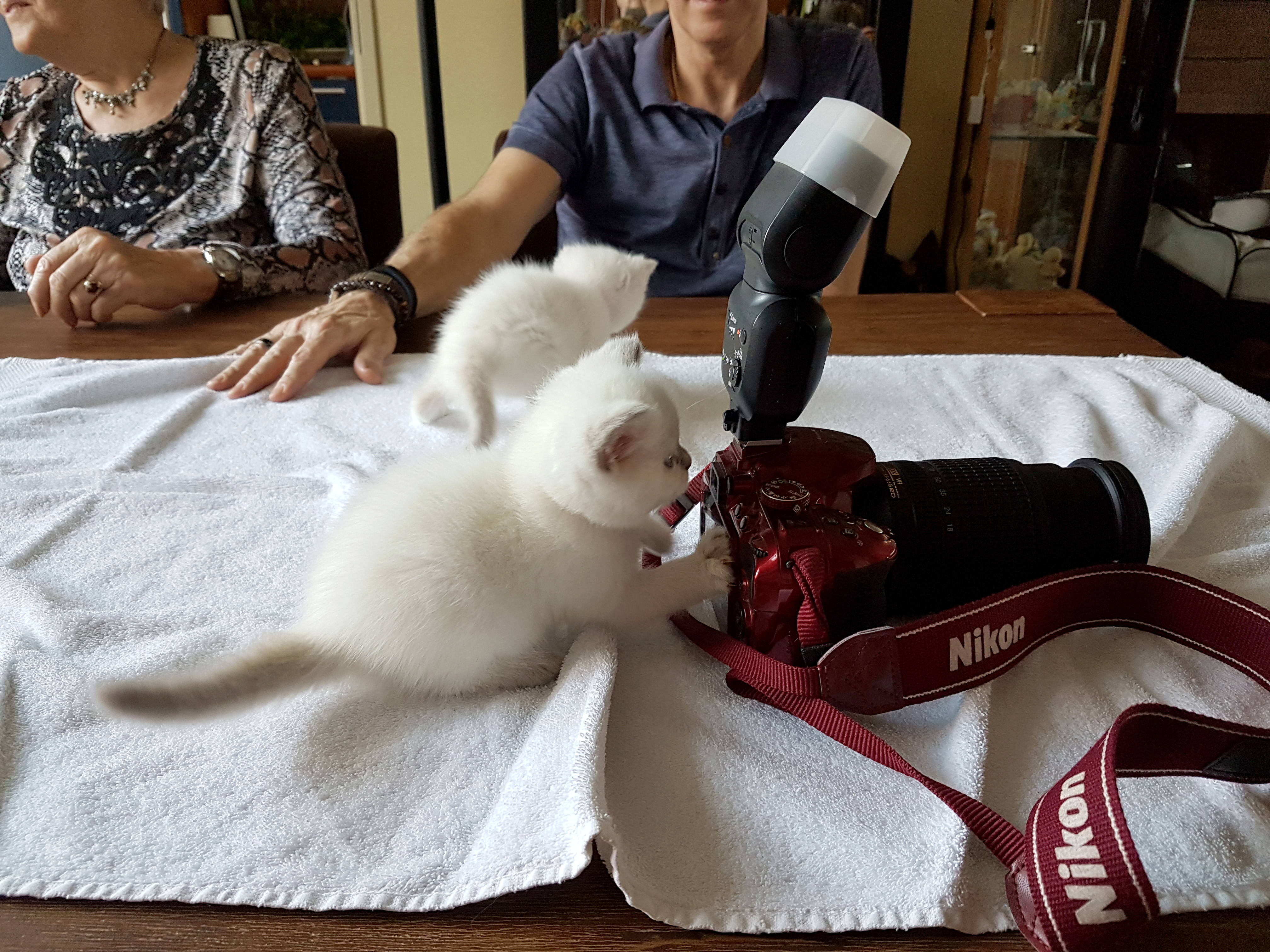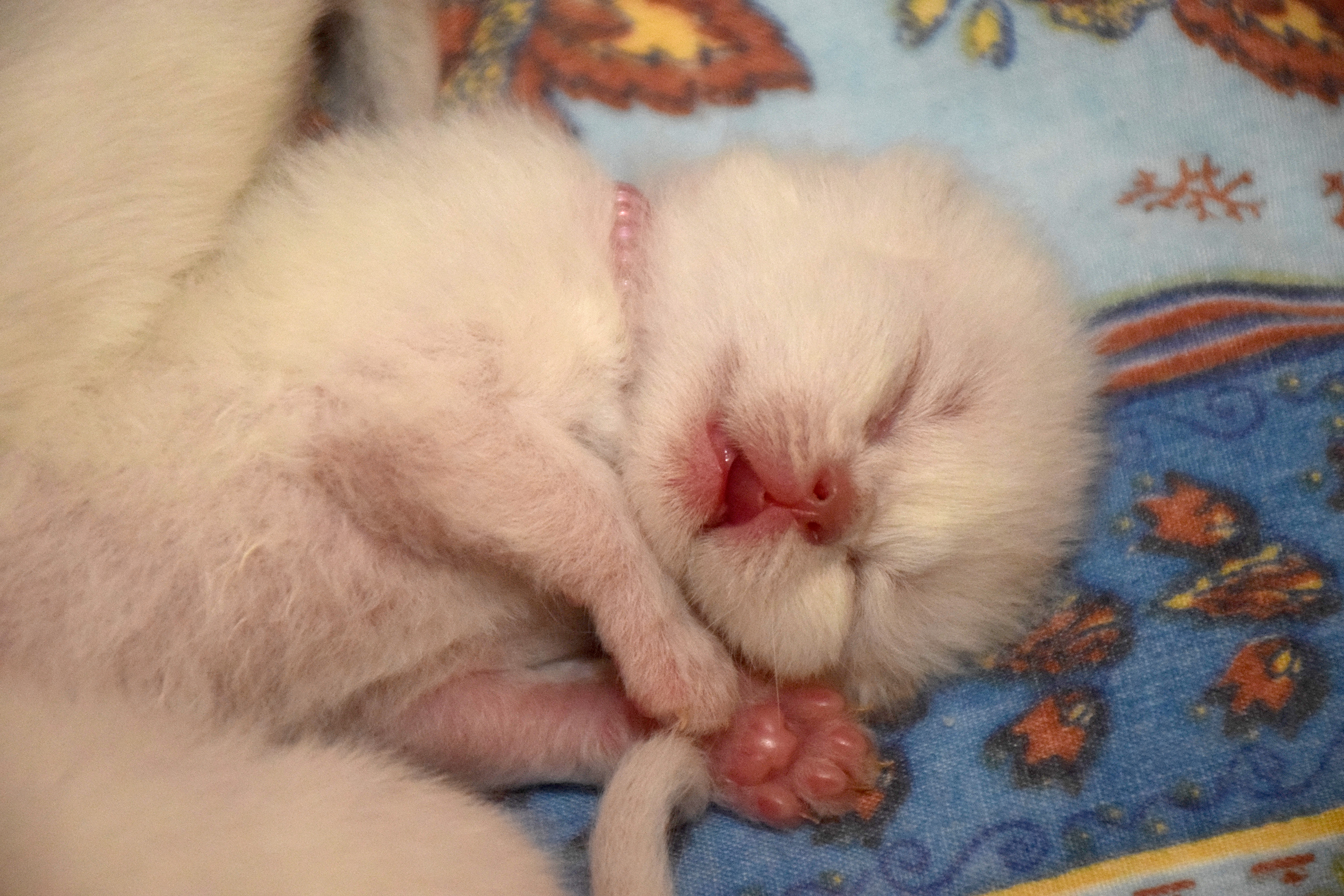 Na een aantal pogingen en vooral veel geduld, waren we ontzettend blij dat Shanna zwanger was. Wat keken we uit naar haar kittens. Van de zes kittens die ze droeg mochten er helaas maar vier het levenslicht zien. Een van deze vier kittens was een poesje en wat voor een. Al meteen na de geboorte zagen we het, dat mooie ronde bolletje zou gaan uitgroeien tot een mooi poesje. Haar koppie was bijna 2x zo breed als dat van haar broertjes, de oortjes stonden letterlijk aan de zijkant van haar bolletje. En… na een paar weken wisten we ook zeker dat ze lilac point was. Onze droom kwam uit: een lilac point poesje met mooie typering uit eigen fok. Wat ook zo leuk was: ze was een kroeltje. Ze genoot van de kroeltjes die je haar gaf en al snel wist ze dit genoeglijk te ondersteunen met een lief zacht gespin.