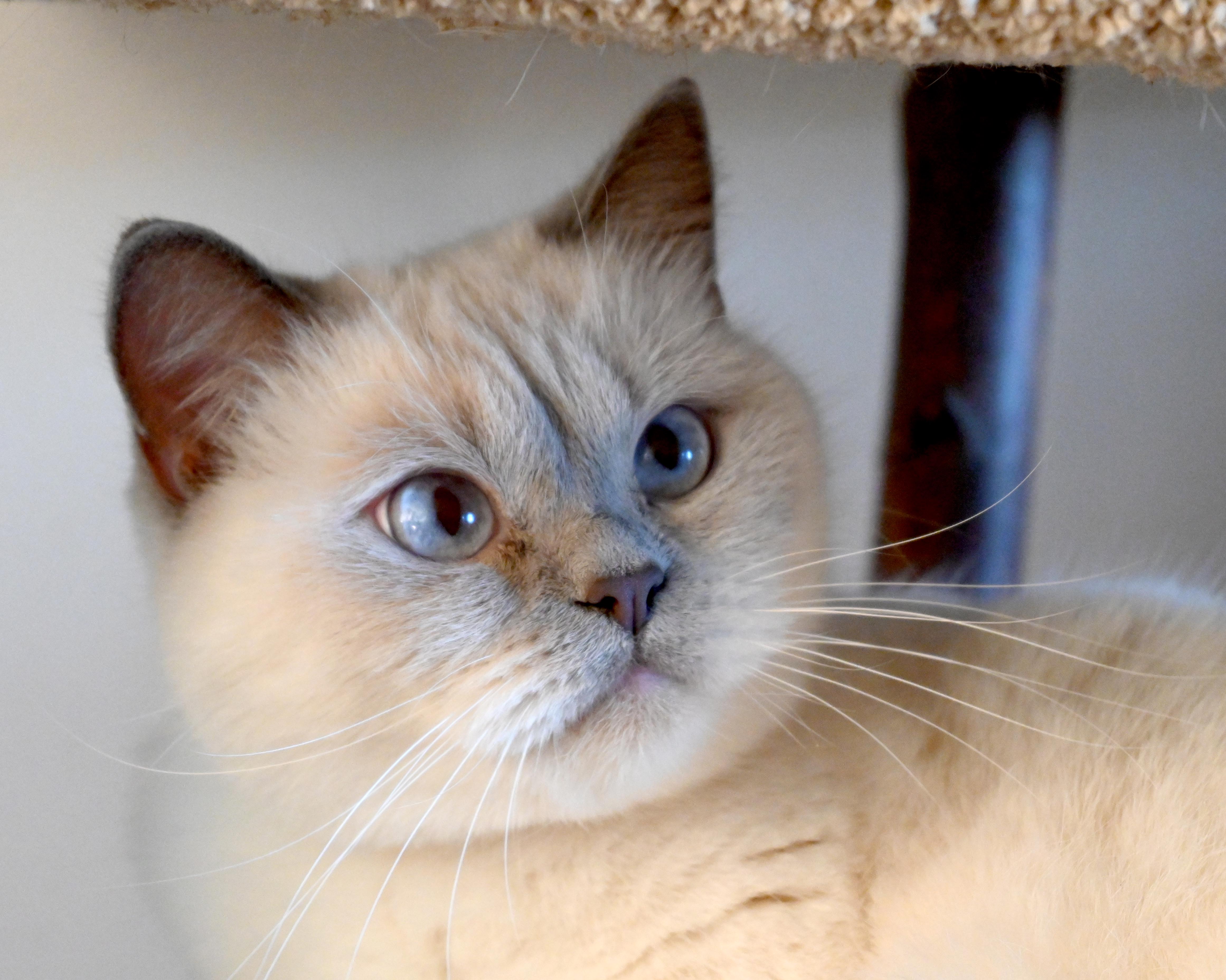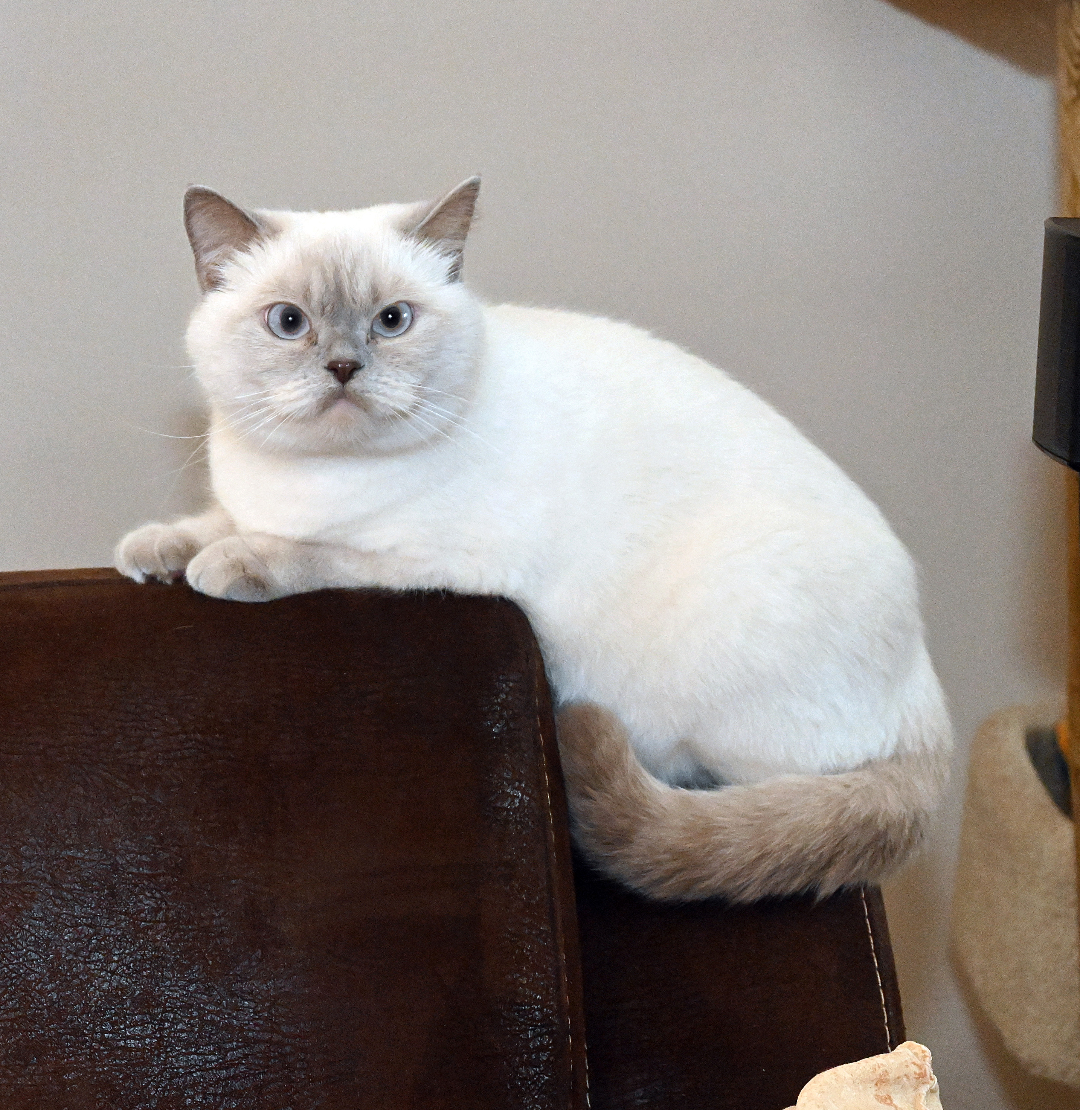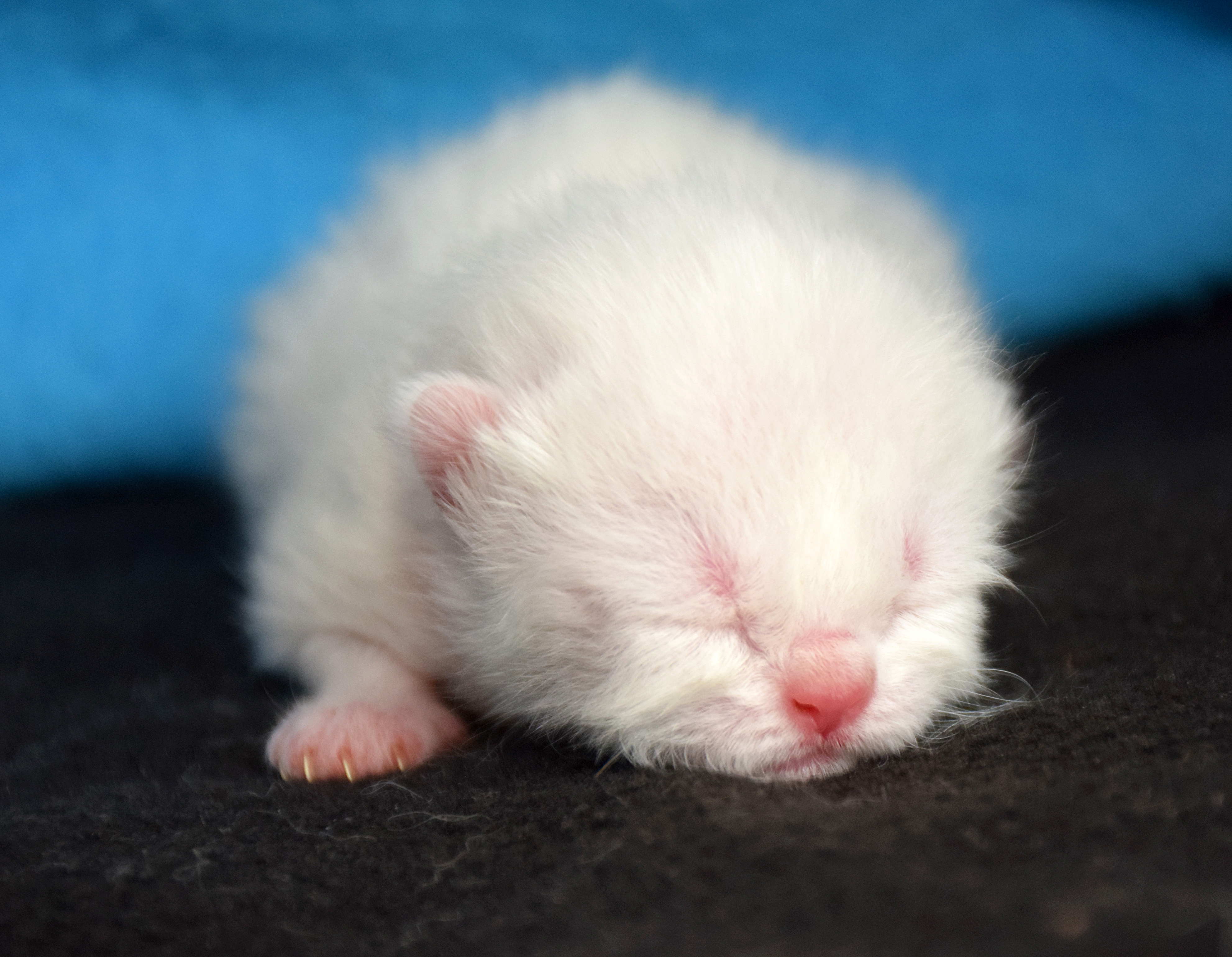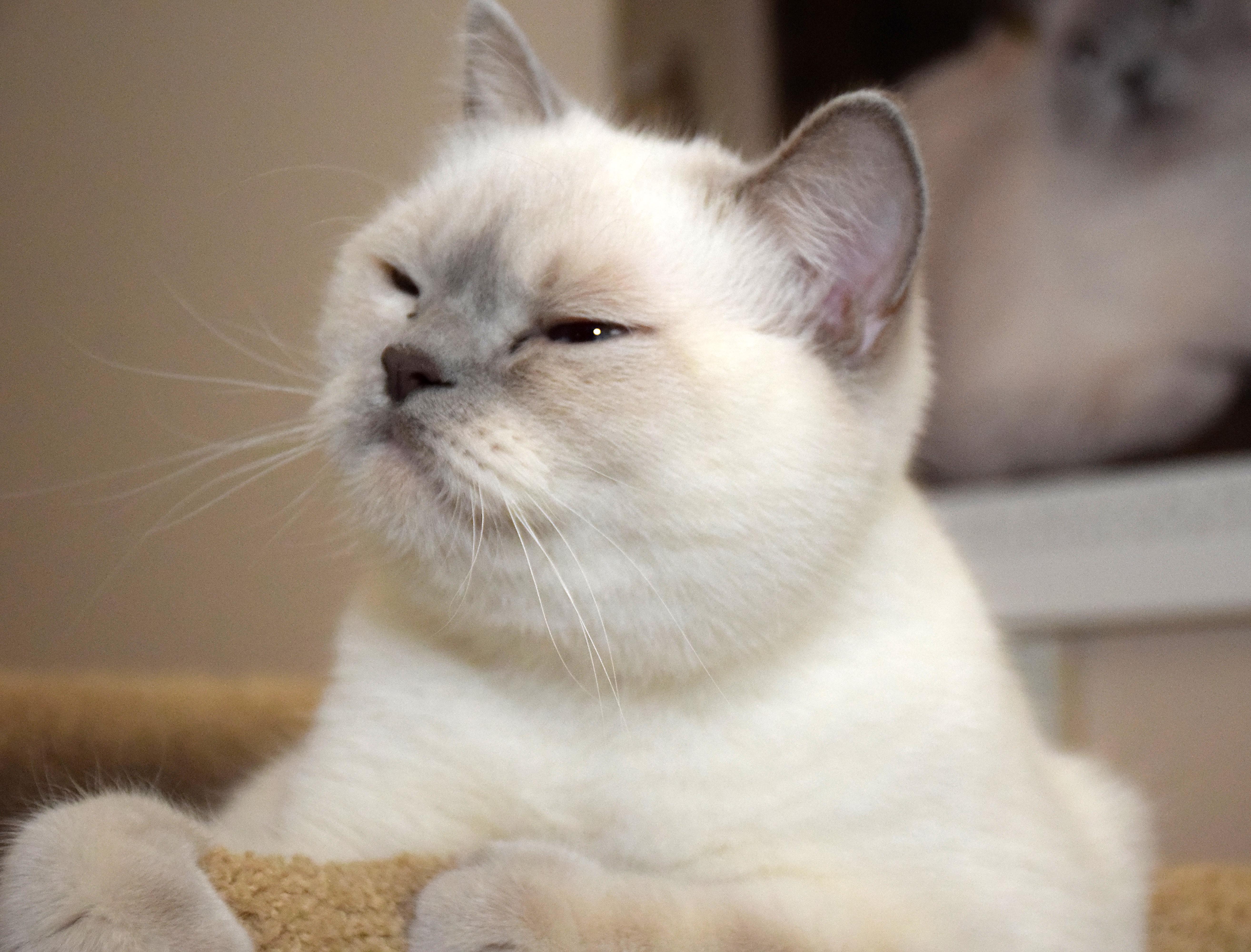 Na een aantal pogingen en vooral veel geduld, waren we ontzettend blij dat Shanna zwanger was. Wat keken we uit naar haar kittens. Van de zes kittens die ze droeg mochten er helaas maar vier het levenslicht zien. Een van deze vier kittens was een poesje en wat voor een. Al meteen na de geboorte zagen we het, dat mooie ronde bolletje zou gaan uitgroeien tot een mooi poesje. Haar koppie was bijna 2x zo breed als dat van haar broertjes, de oortjes stonden letterlijk aan de zijkant van haar bolletje. En… na een paar weken wisten we ook zeker dat ze lilac point was. Onze droom kwam uit: een lilac point poesje met mooie typering uit eigen fok. Wat ook zo leuk was: ze was een kroeltje. Ze genoot van de kroeltjes die je haar gaf en al snel wist ze dit genoeglijk te ondersteunen met een lief zacht gespin.