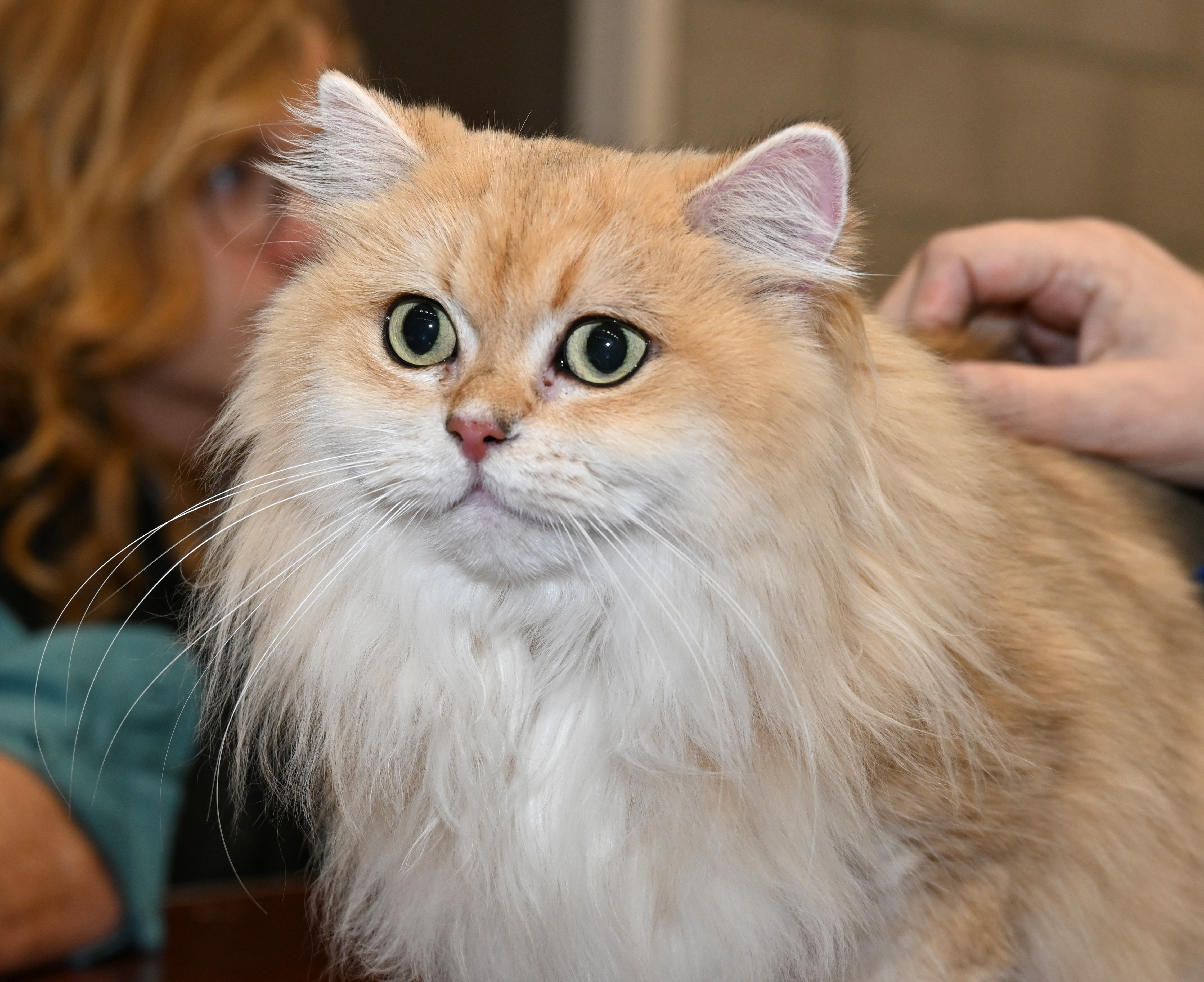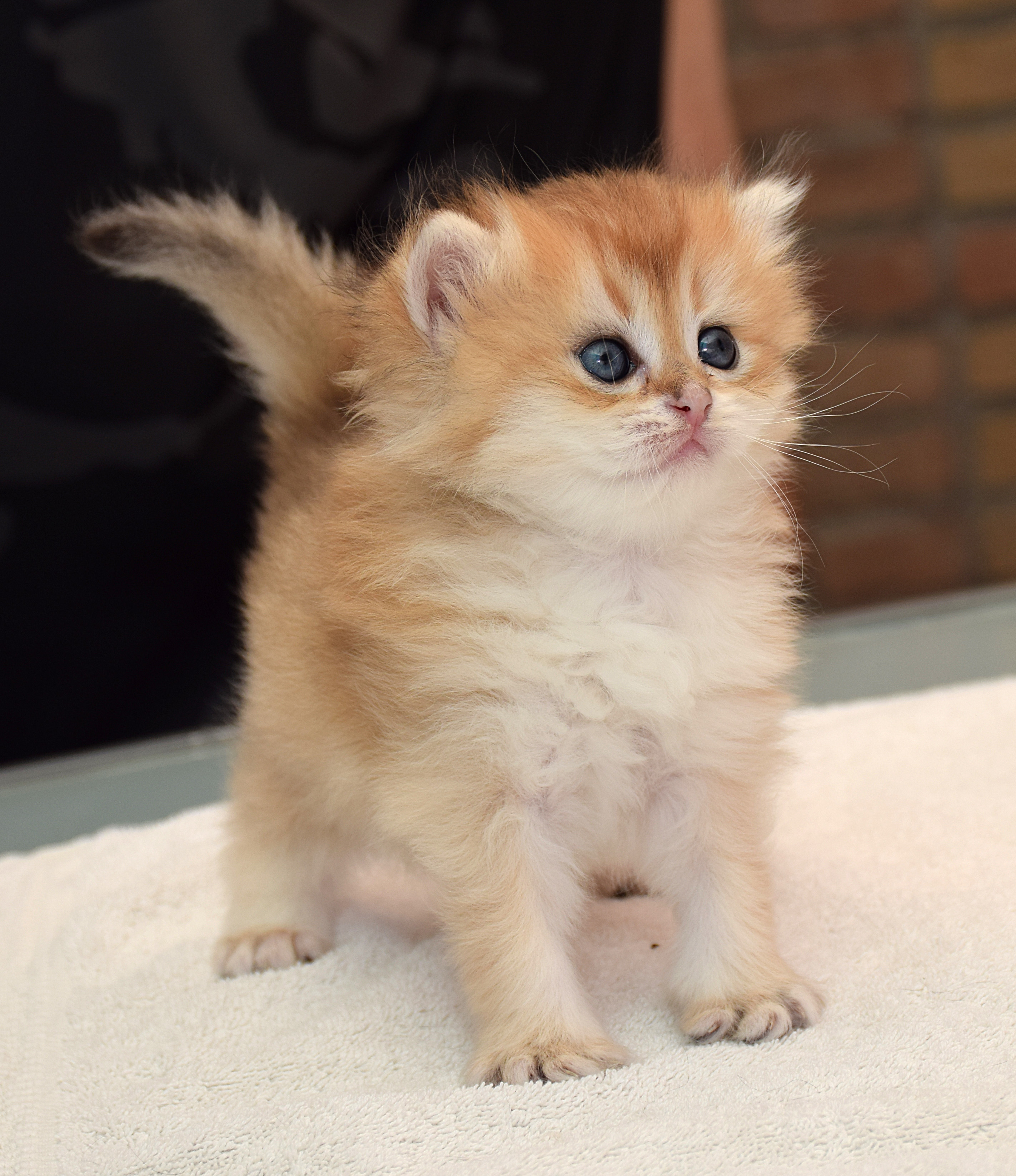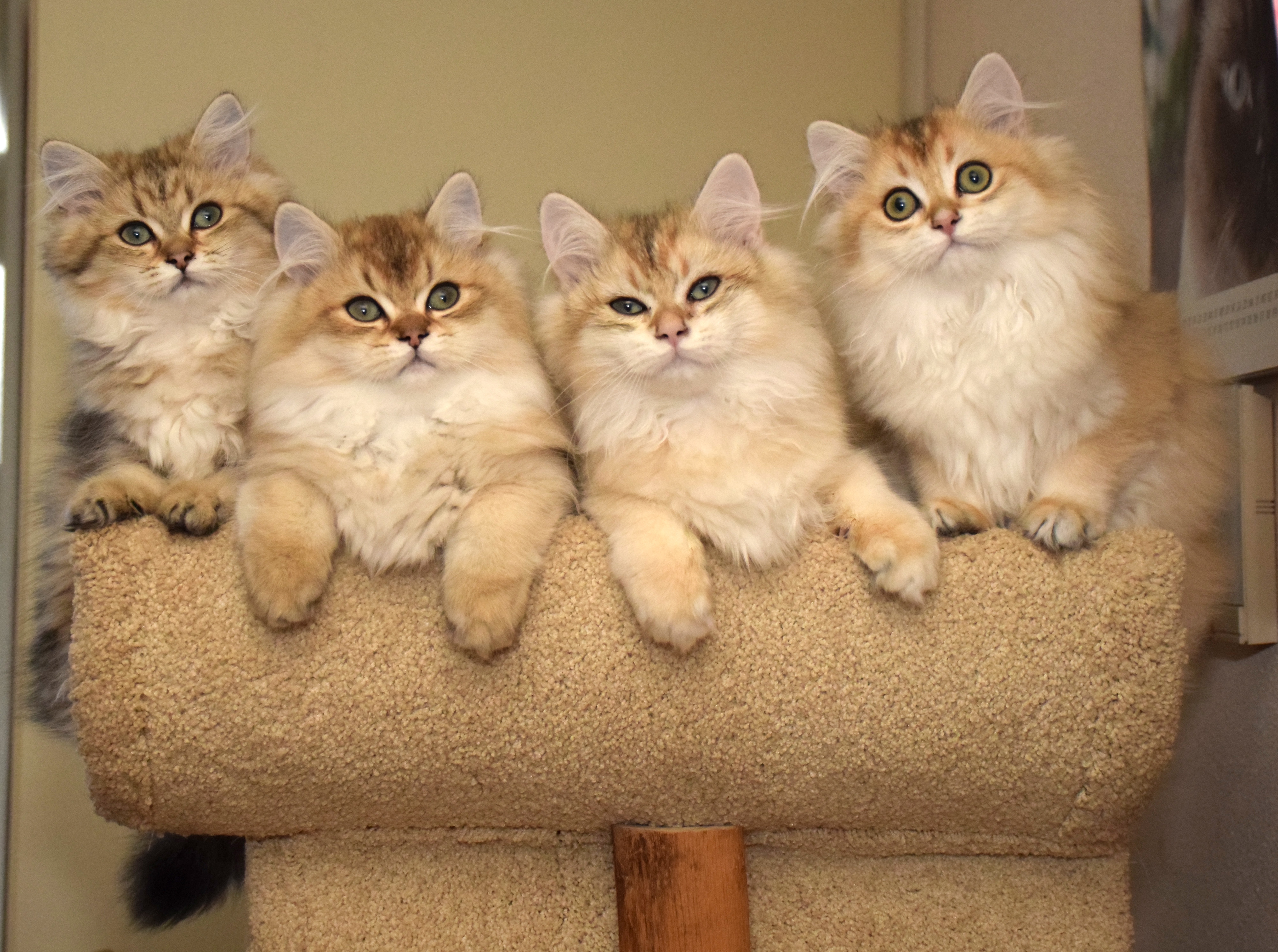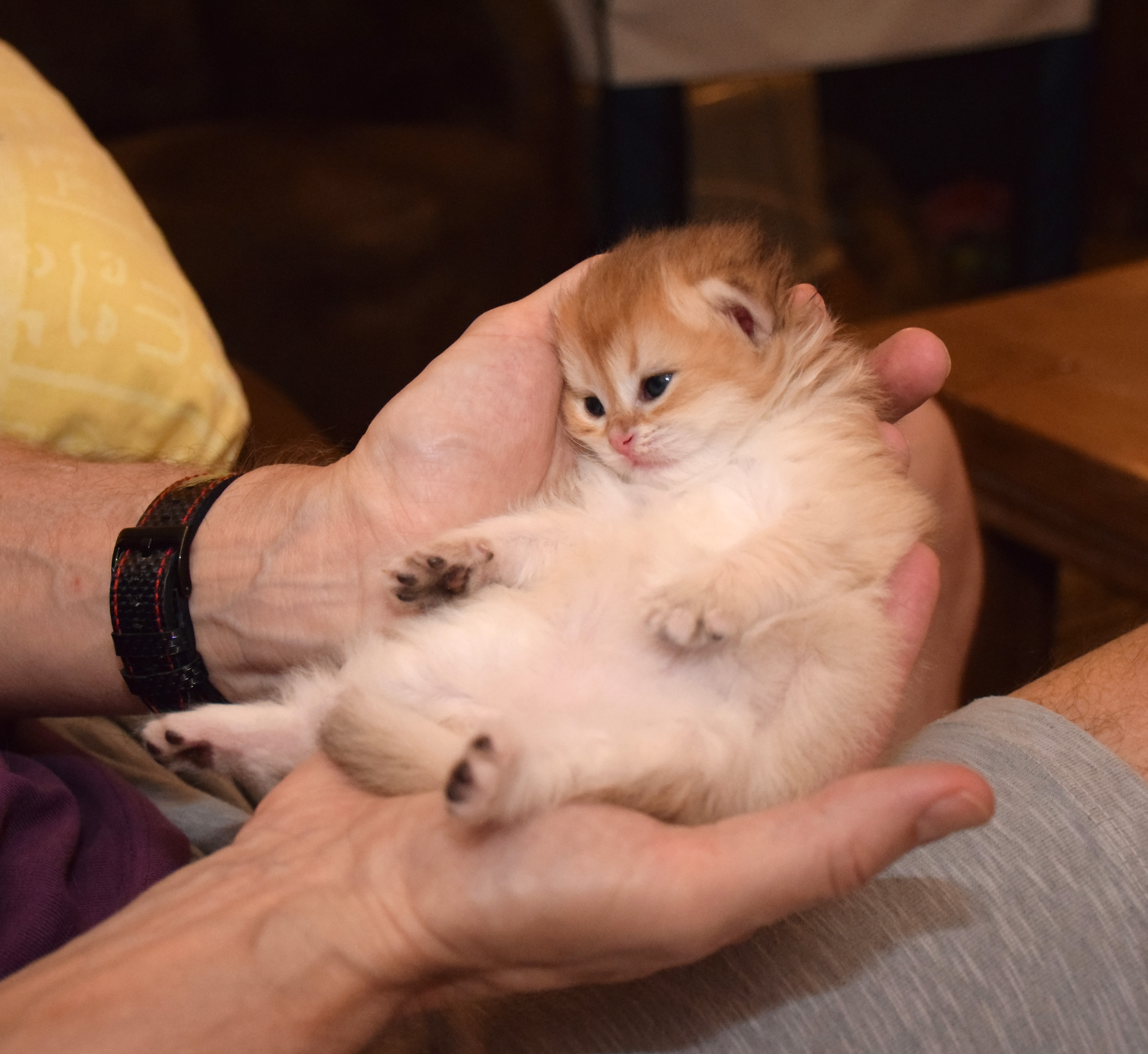Helaas werd die angst waarheid en moesten de kittens via een keizersnede ter wereld komen. Maar, wat een mooie kittens. Wat waren we blij en trots. Twee katertjes en twee poesjes. Net als bij Aislinn was iedereen meteen verliefd op “het pyamaatje” Lacey. Omdat we zelf al zo’n gestreept eigenwijs poesje hadden, ging onze aandacht meer uit naar het licht gekleurde poesje. Mja, haar neusje was wel wat groot en haar kopje wat vlak, dus even wachten wat er ging gebeuren. Bij Aislinn was dit ook zo, echter in een wat mindere mate. Na een paar weken begonnen we er toch serieus aan te denken om dit kleine wondertje in onze cattery op te nemen, maar haar typering bleef ons nog even parten spelen. Het kleine dametje groeide op en palmde ons in… zo lief… ze gaf zich helemaal aan ons over als we haar oppakten. En haar kleur was toch ook wel heel bijzonder. te licht om shaded te zijn, dus moest ze wel chinchilla zijn. Zouden we zoiets in een volgend nest nog eens krijgen? Dat weet je nooit. Toen het bericht ons bereikte dat Bono, de papa van het nest, overleden was, wisten we dat de kans op weer een chinchilla meisje heel klein zou worden. Maar haar typering was nog niet wat we wilden… dus meer twijfels en toch maar een reservering voor ons zelf genomen op haar. Naarmate de weken verstreken, kroop dit kleine murmeltje met haar prachtige golden kleur steeds meer in ons hart en wisten we dat, ondanks dat haar typering niet super was, ze hier niet meer weg zou gaan.