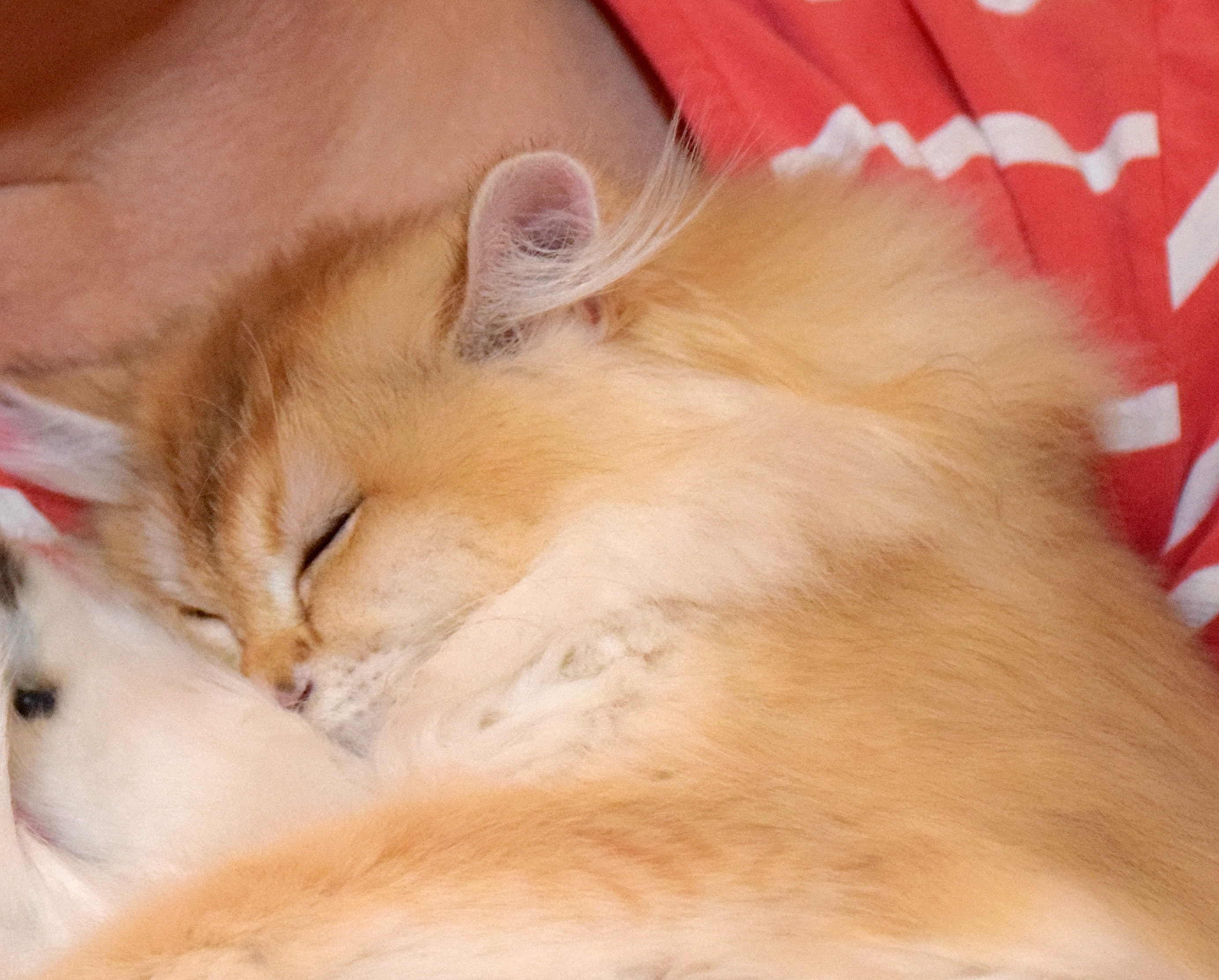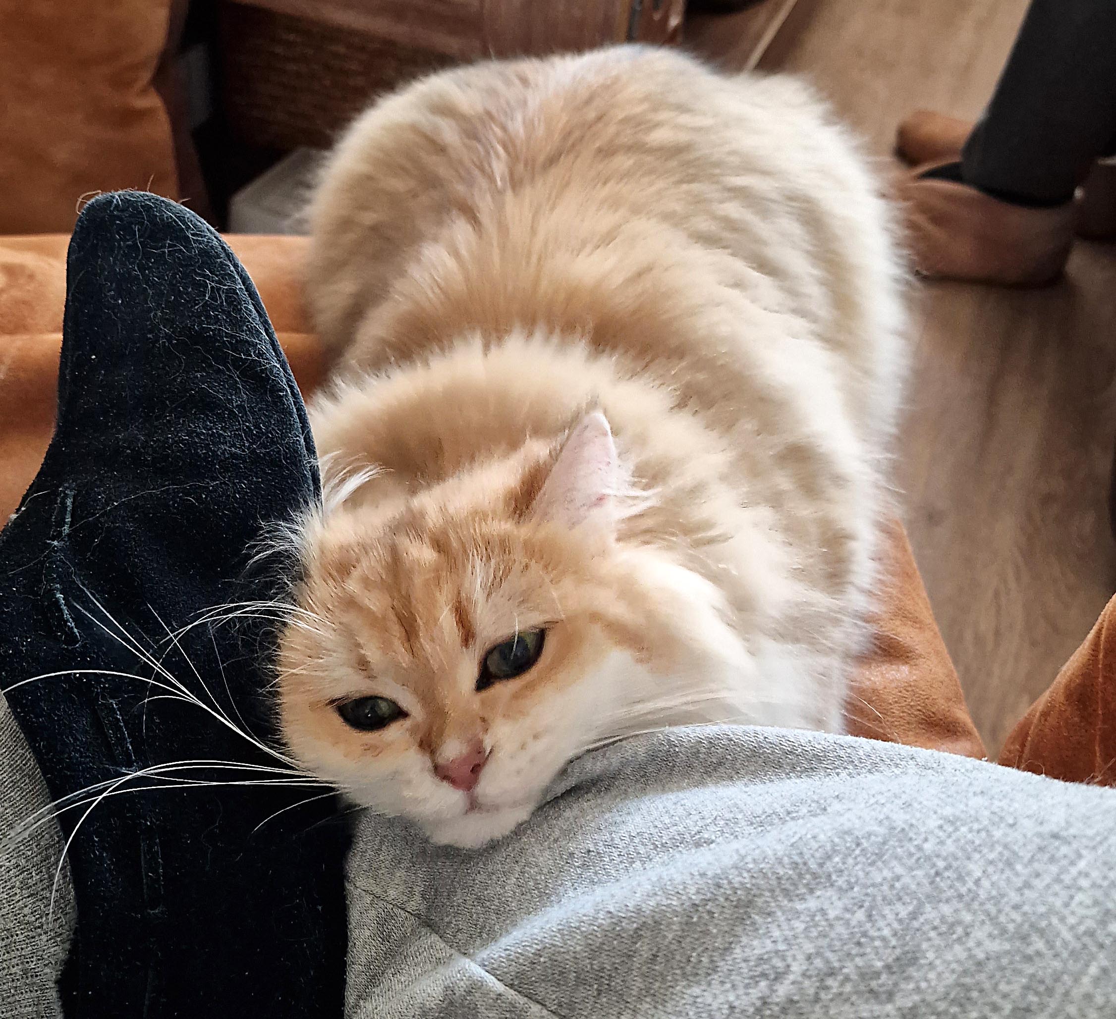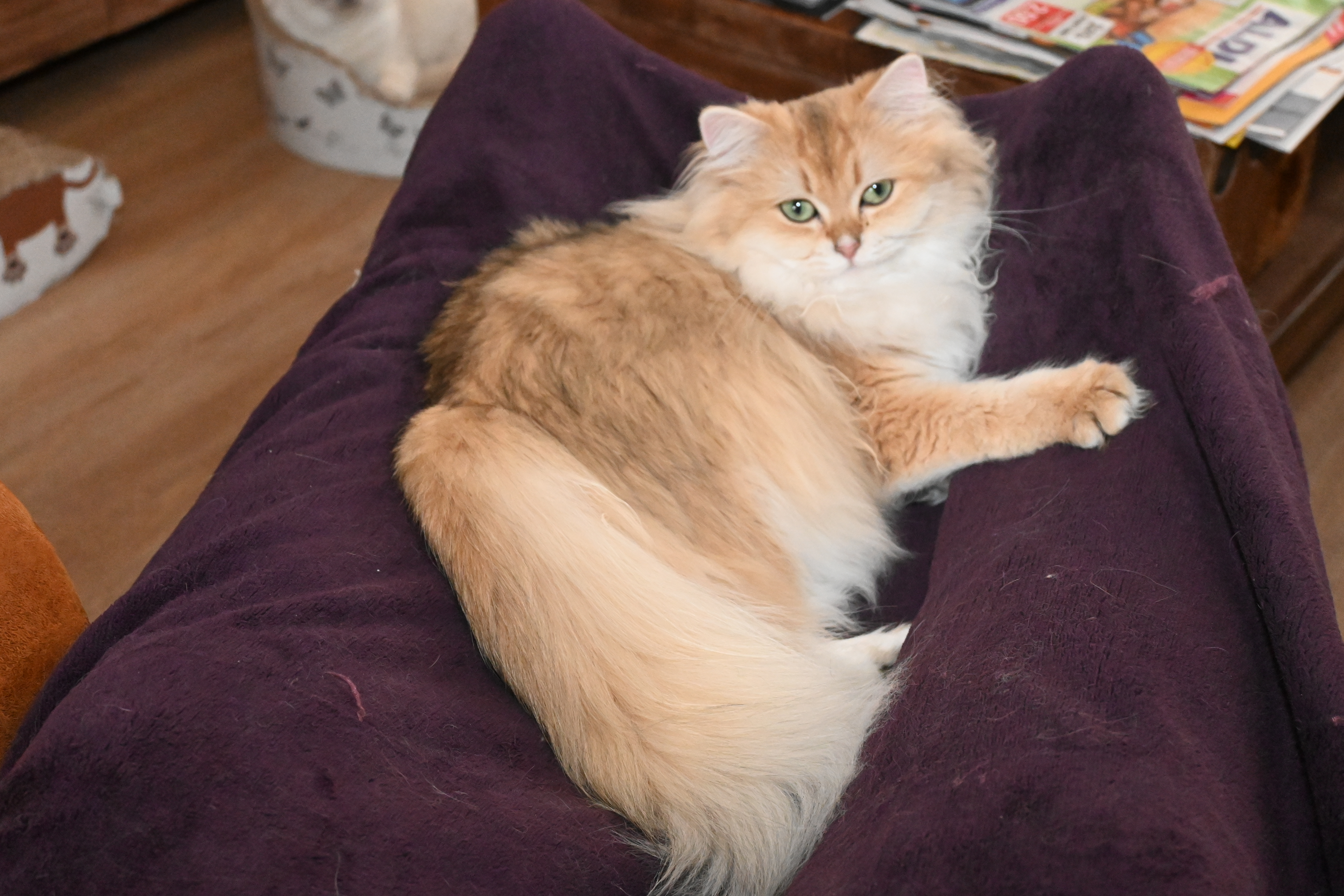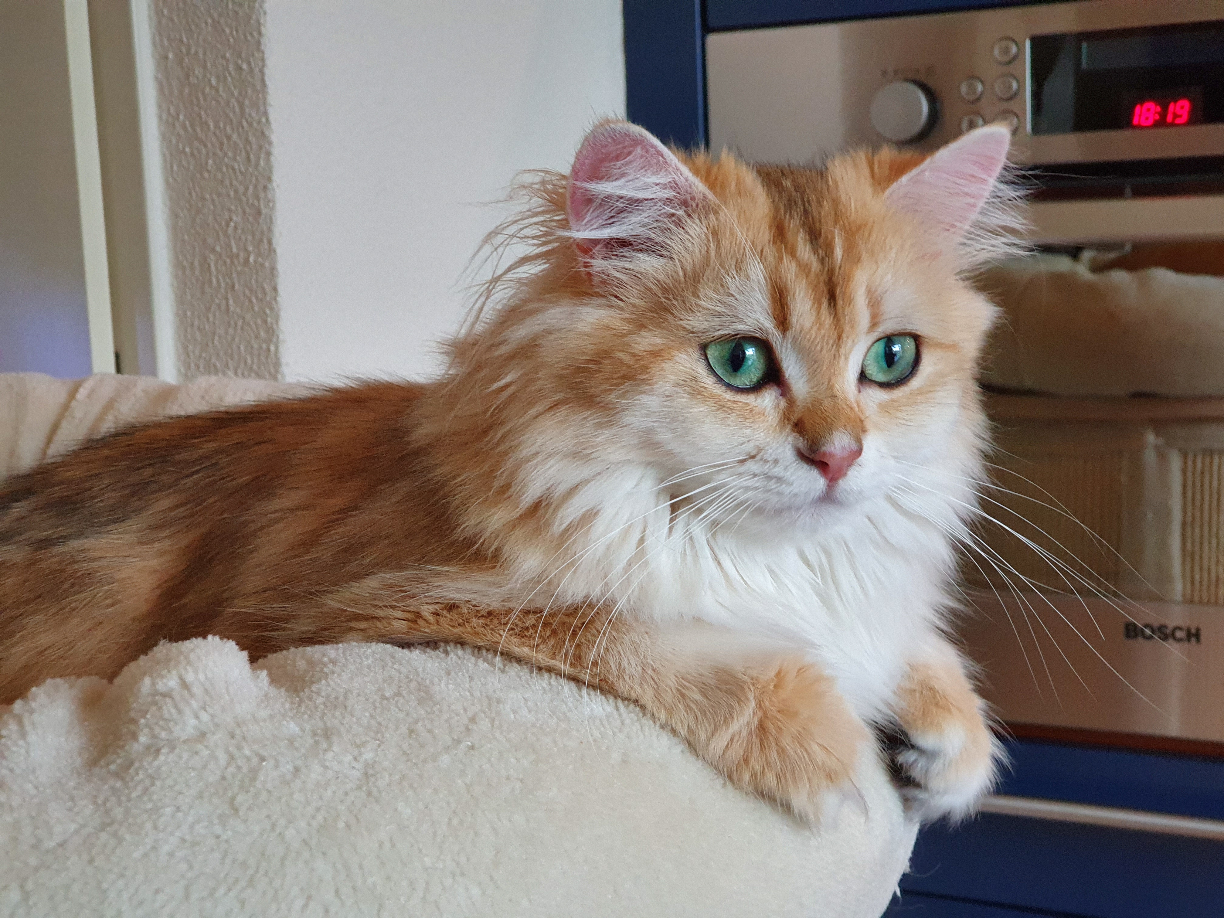 En wat zijn we blij met haar, ons “Vosje”, want daar lijkt ze nog het meest op, als ze bij je wegloopt. Die mooie golden staart, aan de onderkant wit en die mooie zwarte punt danst door de lucht en de haren veren in het ritme mee. En haar karakter is al net zo goud als haar vachtje. Ze kan heel ondeugend zijn, maar bovenal is ze lief. Je pakt haar op en haar spinmotortje begint meteen te snorren, steeds harder. Heerlijk ding.