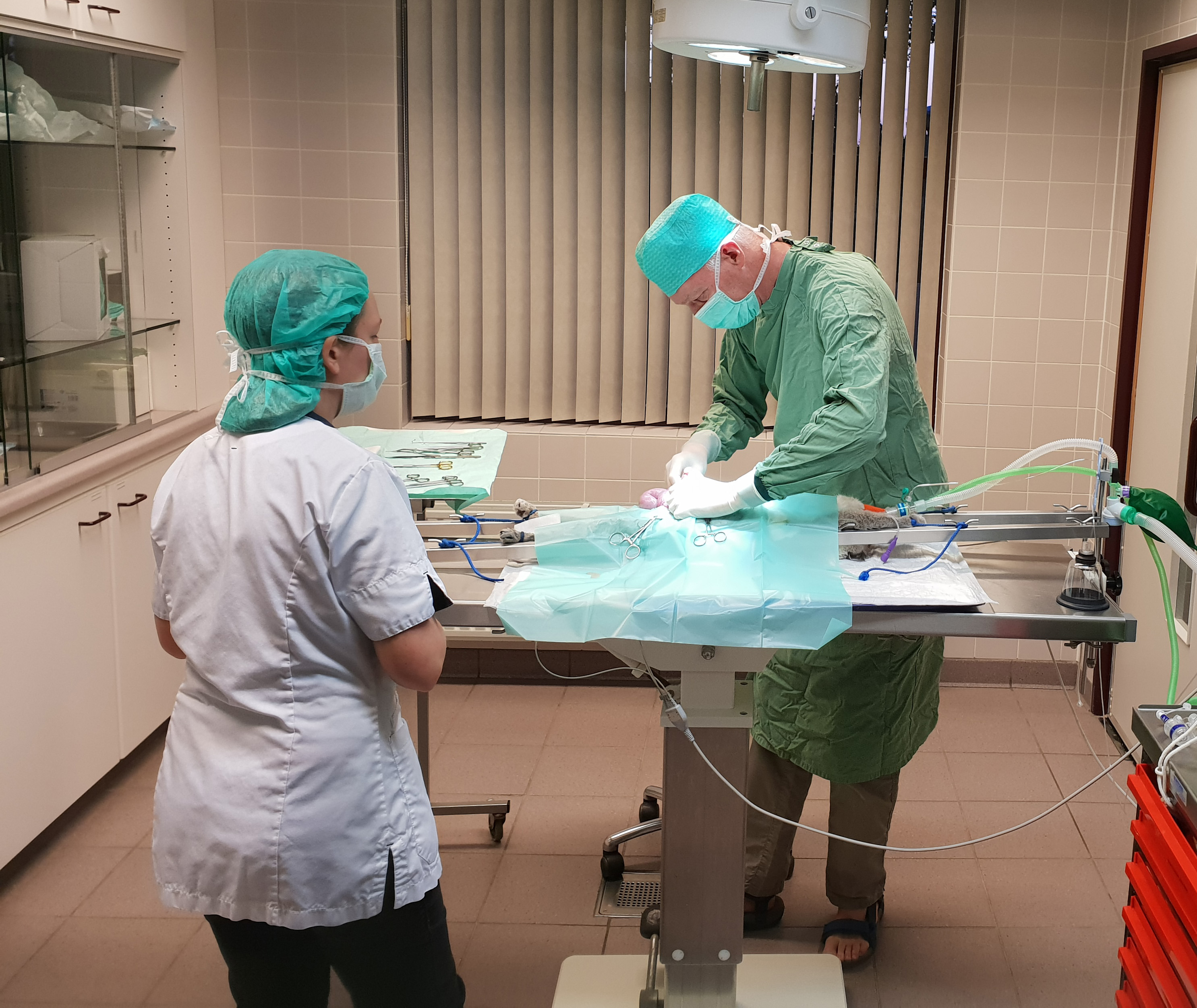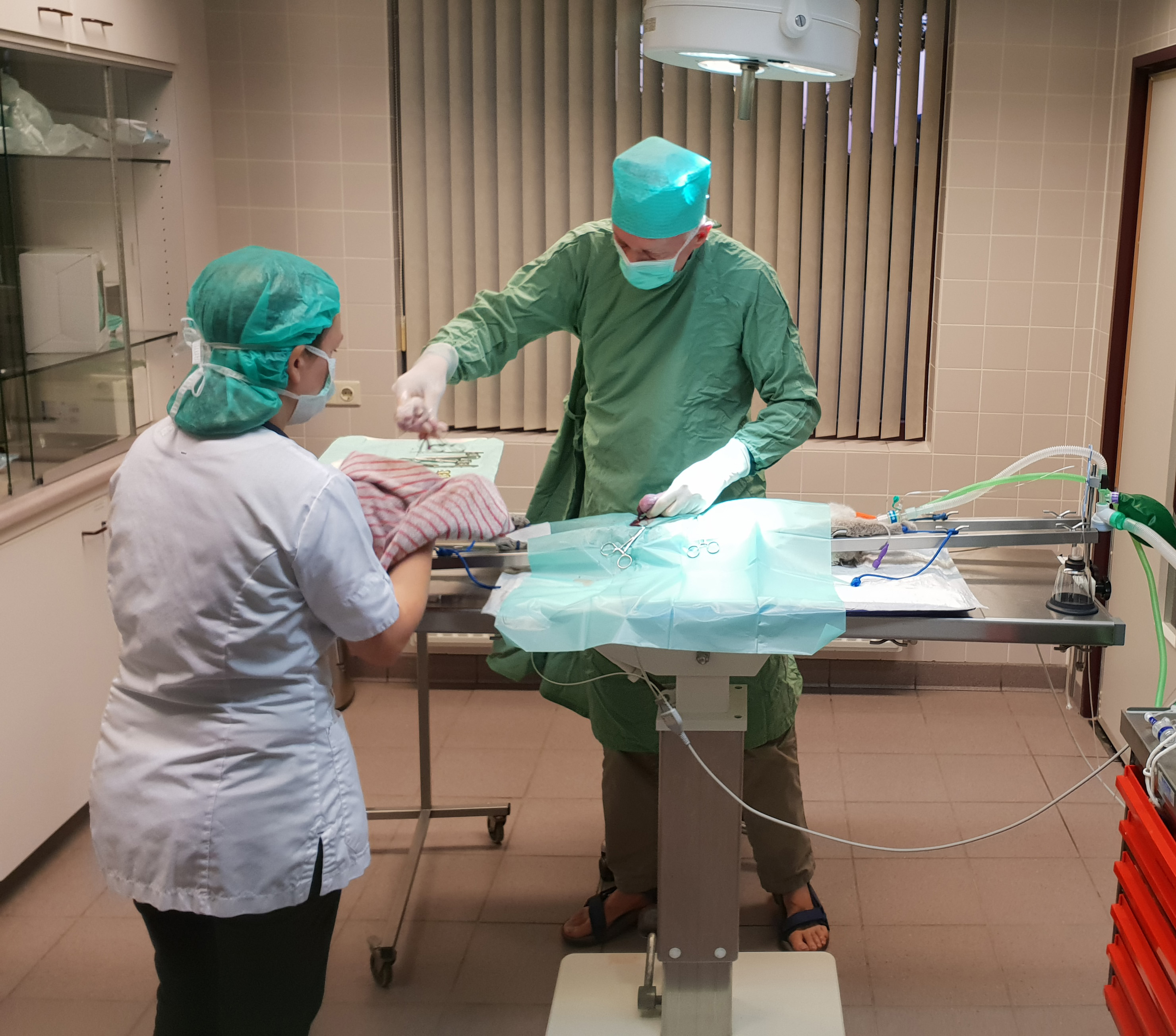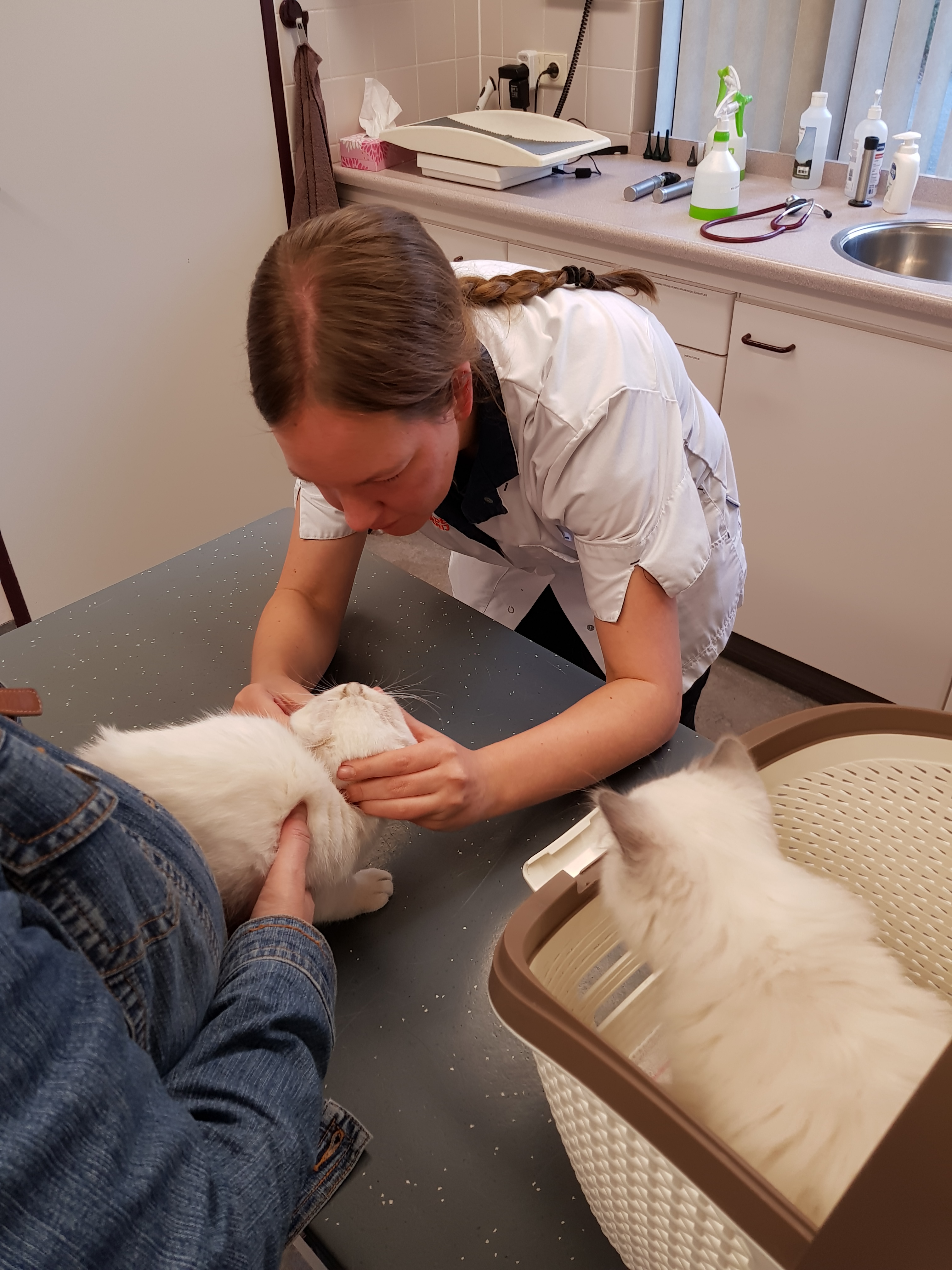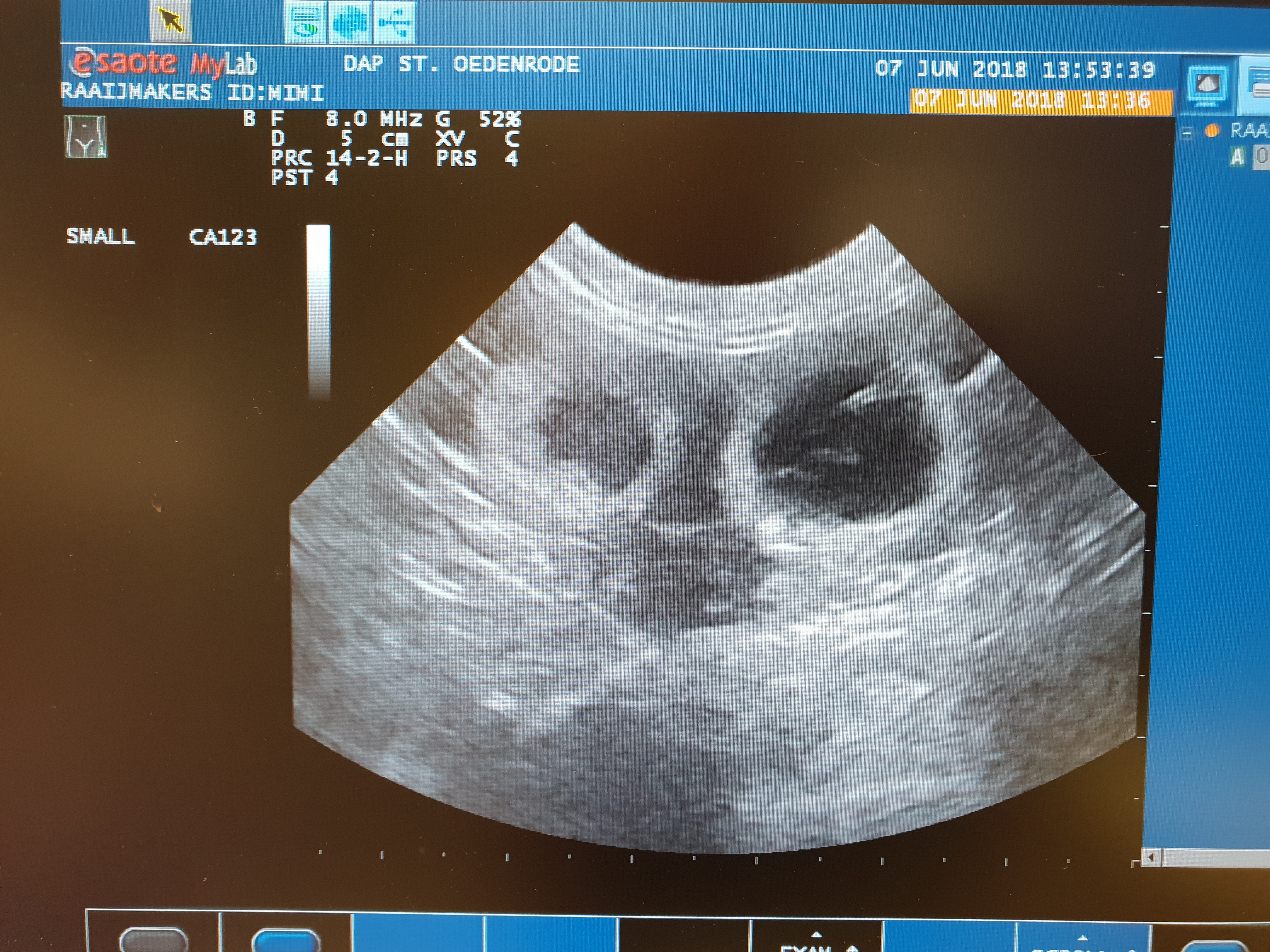 21.15 uur. Nog altijd niets, maar wel nog iets in haar buikje, dus gaan we na overleg met Kees naar de praktijk. Op een echo zien we nog minstens één hartje kloppen en zeker nog twee kittens zitten. De keuze is zo gemaakt. Die kittens moeten eruit en Mili is inmiddels te uitgeput om dit nog op eigen kracht te doen, dus besluiten we dat het helaas toch een keizersnede moet worden en gaan we alles voorbereiden. We… want er is op dat moment niemand beschikbaar om te assisteren. Het ziet er naar uit dat ik vandaag Kees zijn assistente mag zijn.