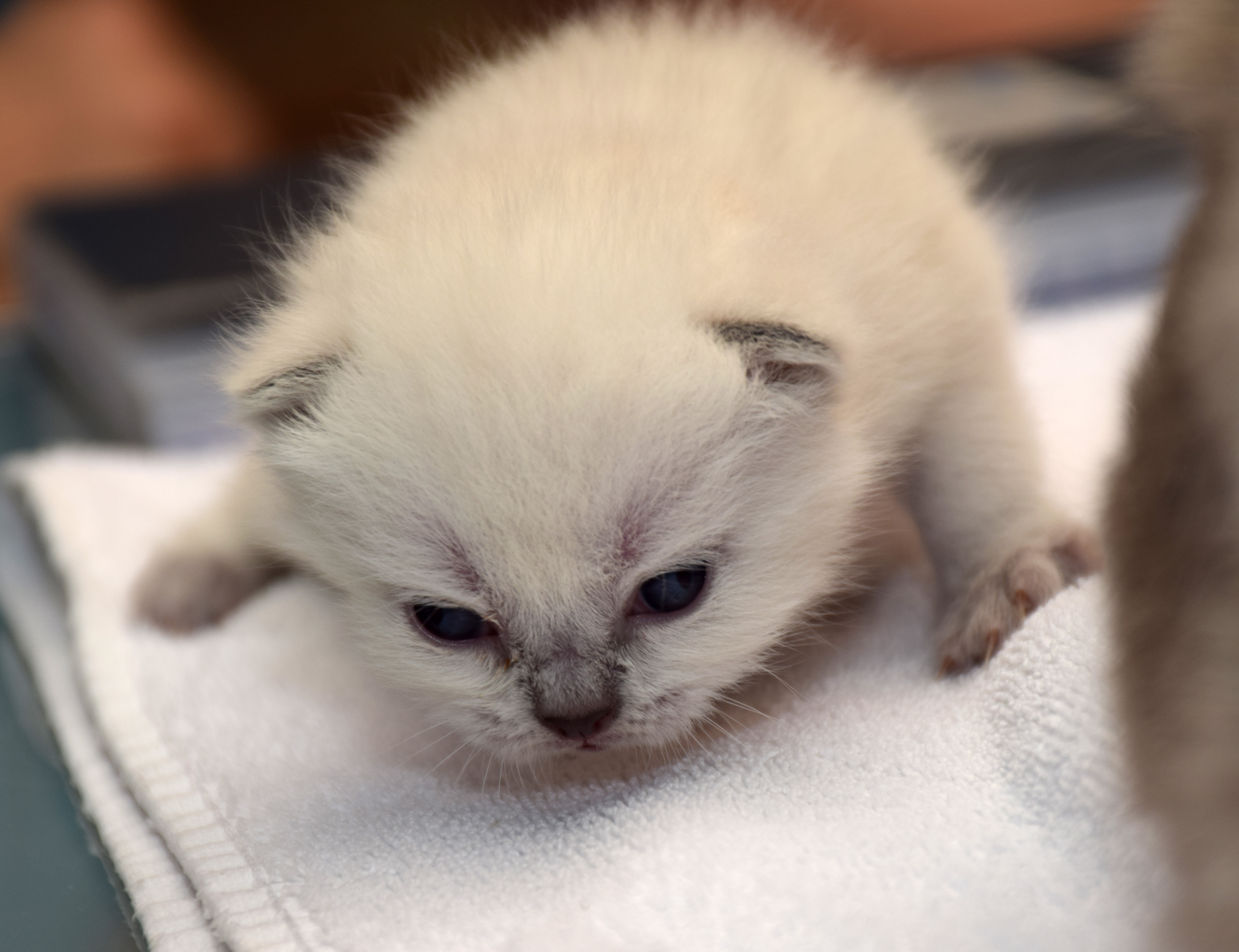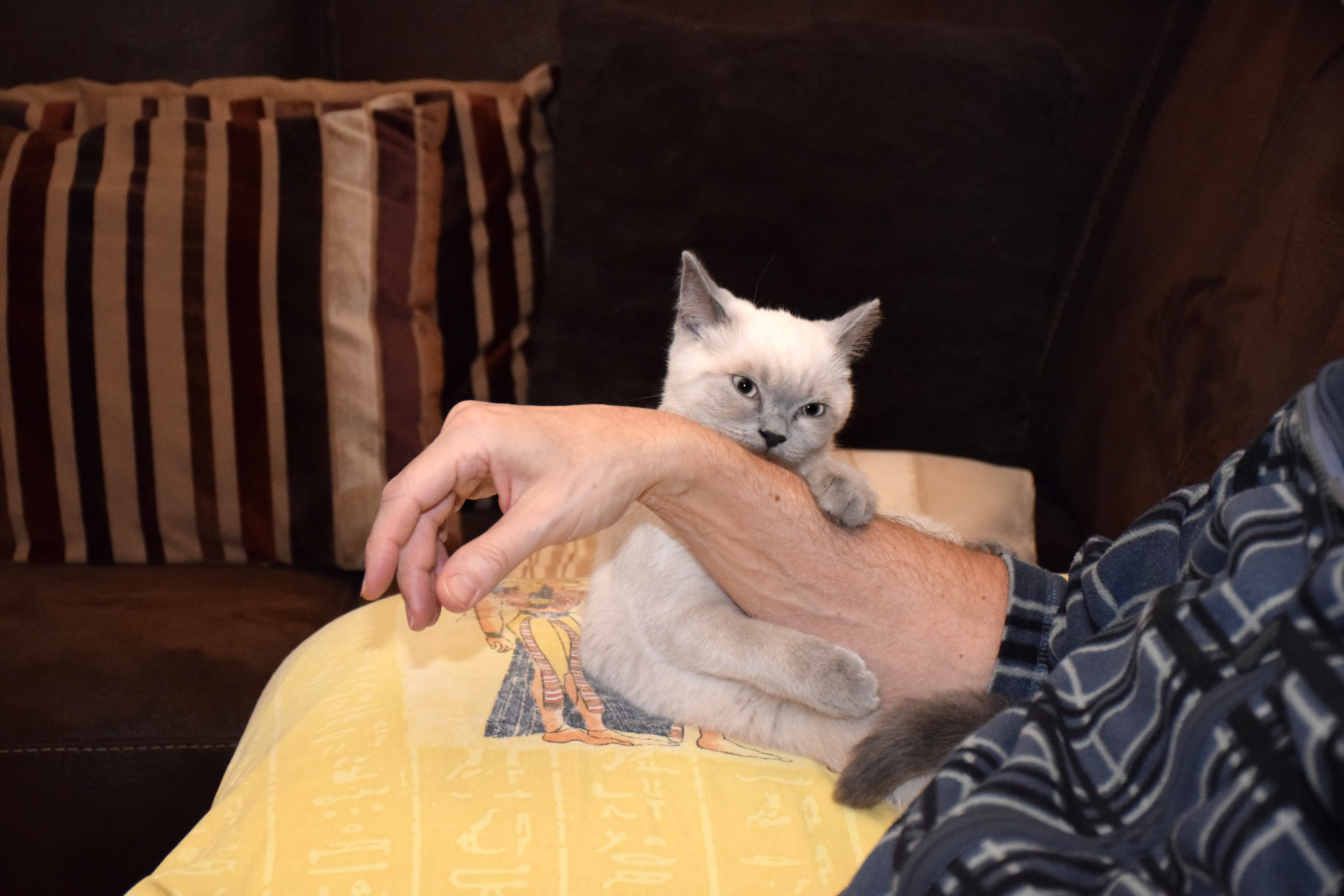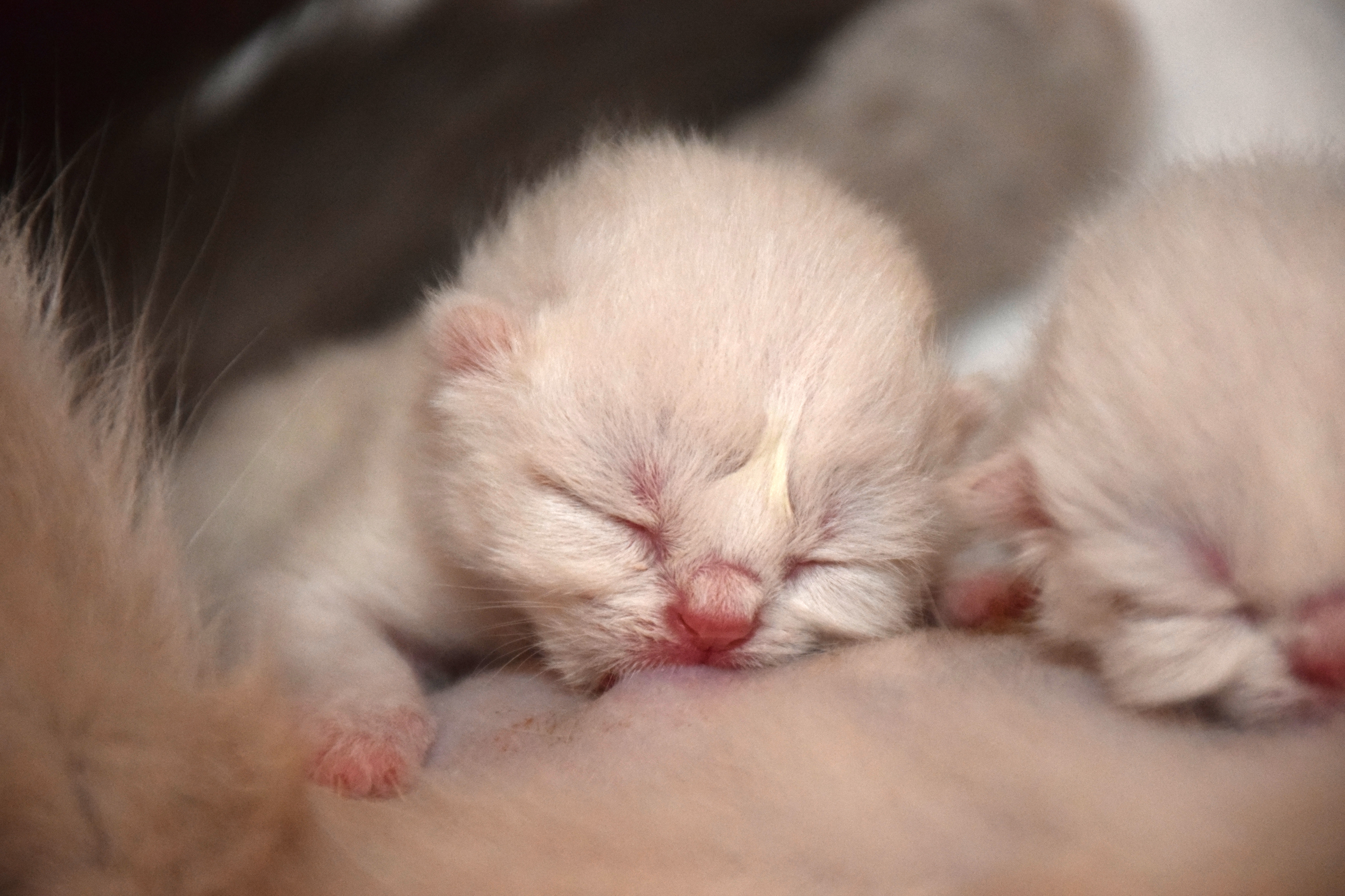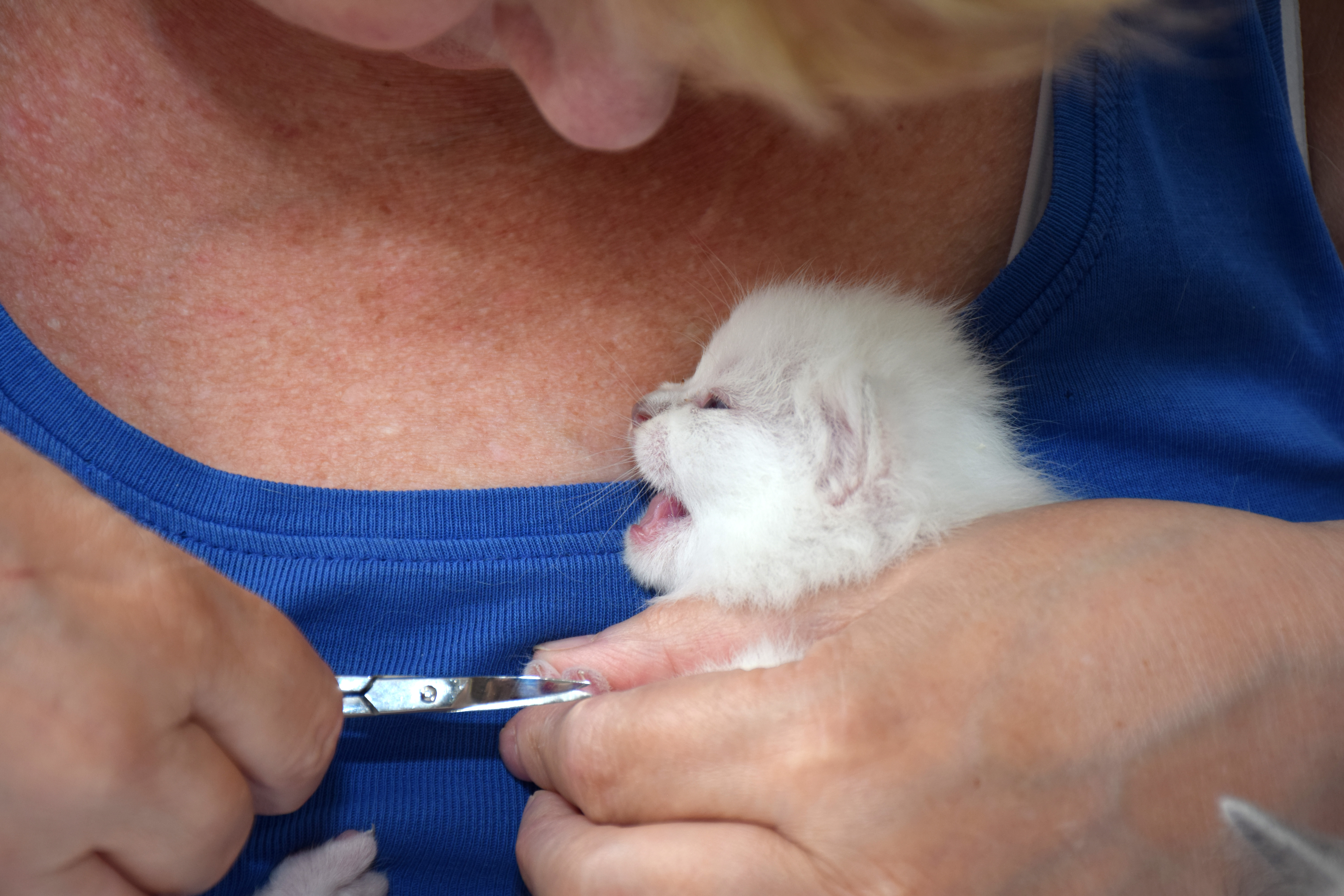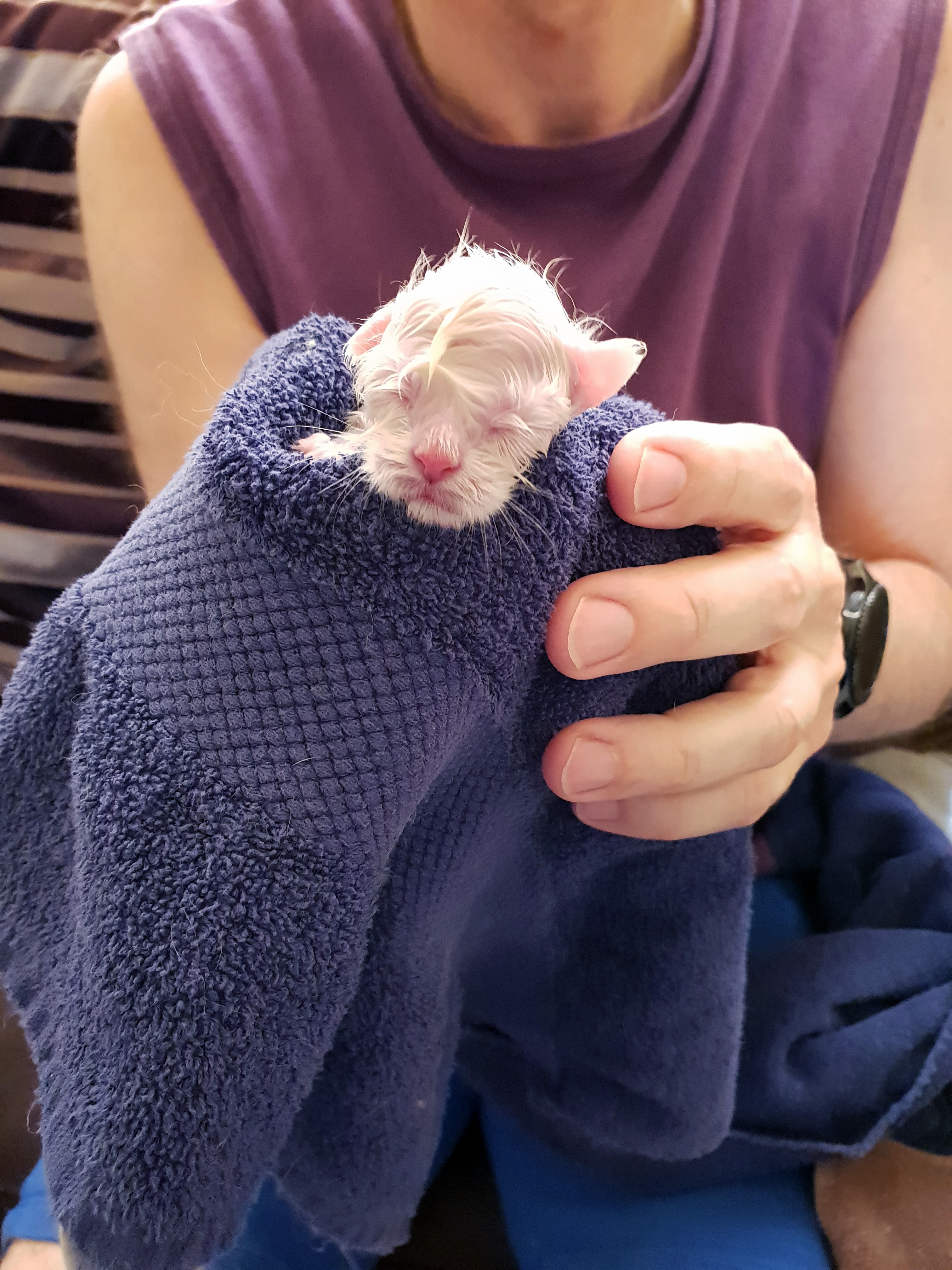 Het laatst geboren kitten is erg hyper en wil niet aangelegd worden. Dit baart ons zorgen. In de loop van de nacht, proberen we het regelmatig, maar zonder succes.