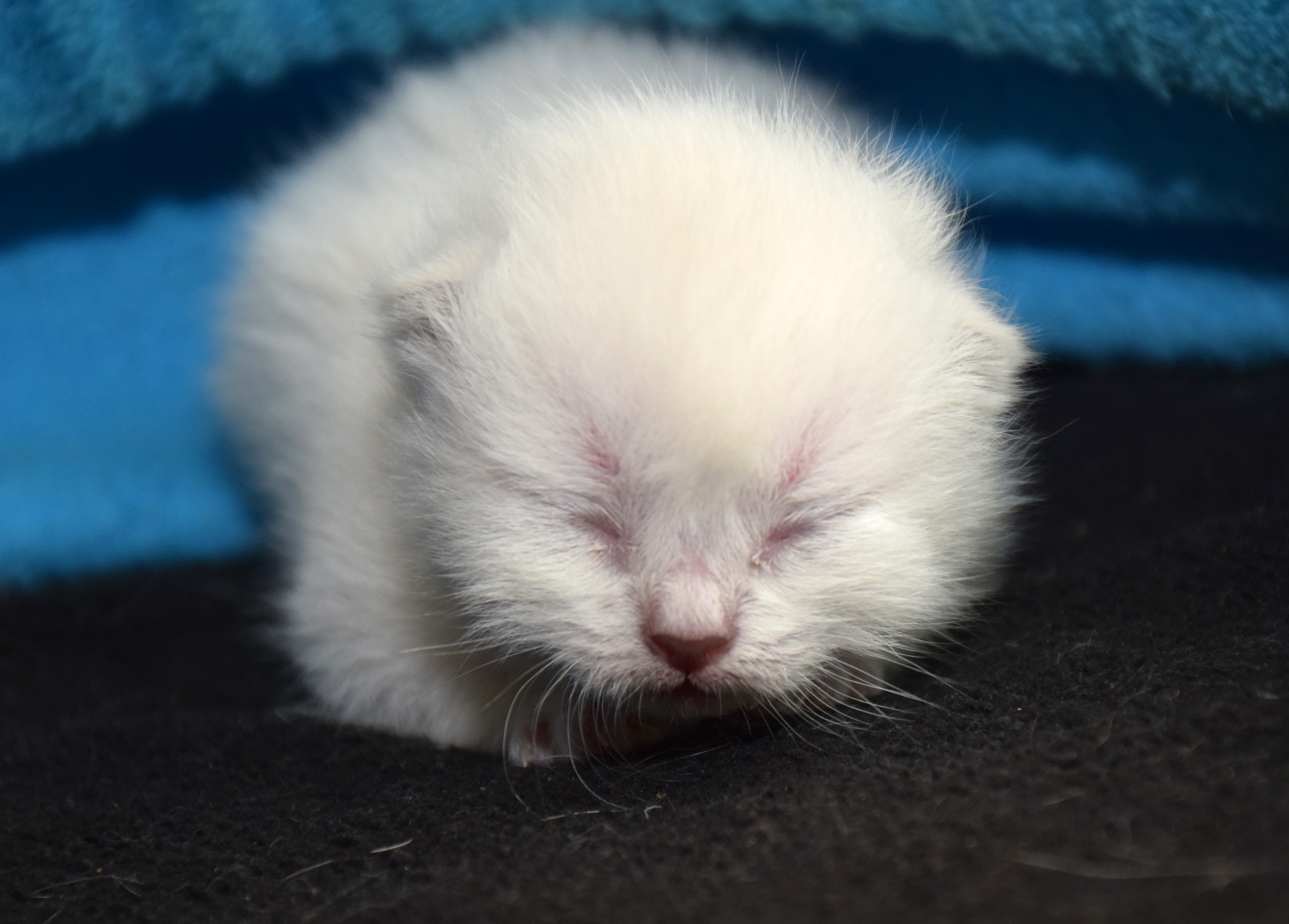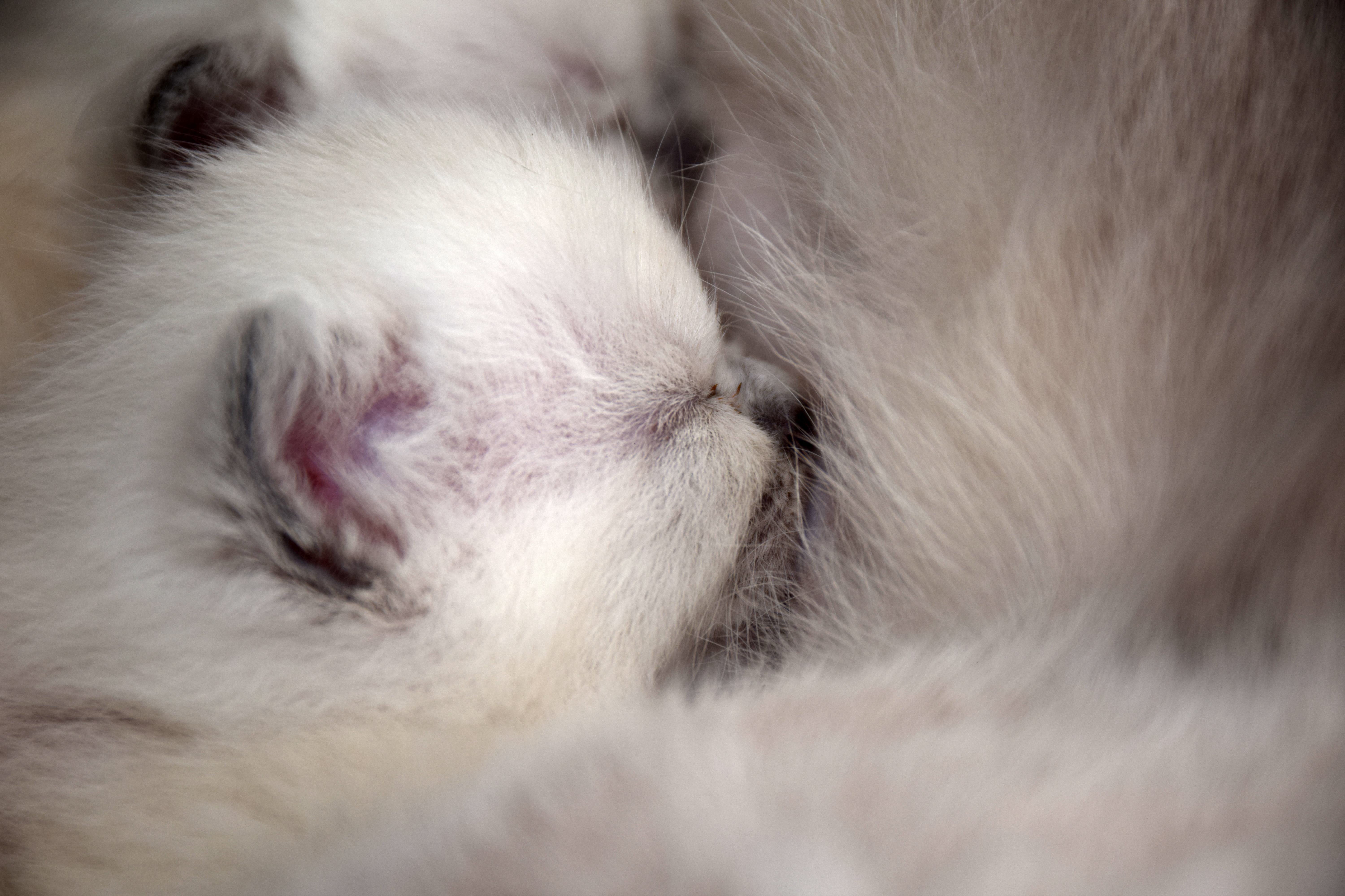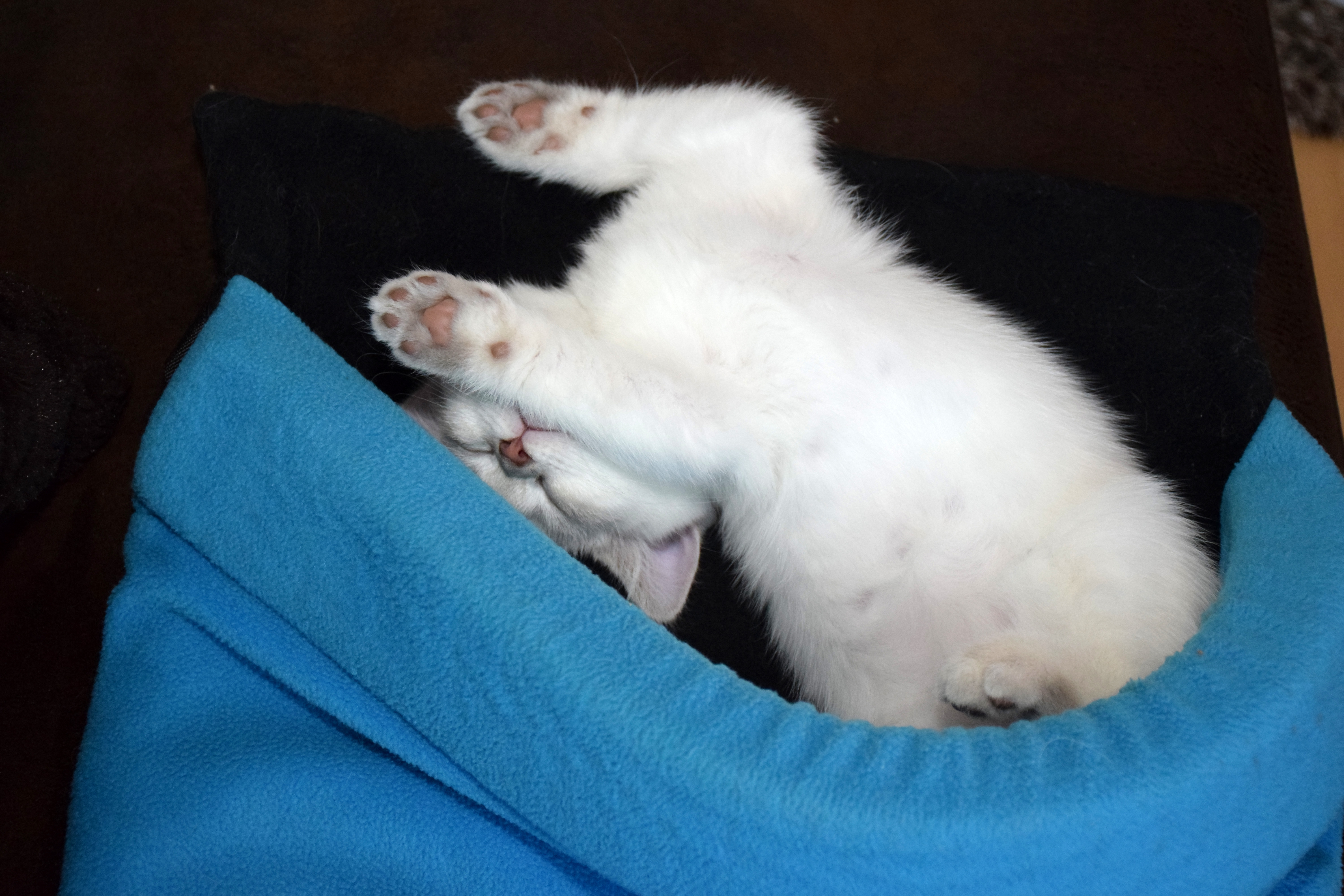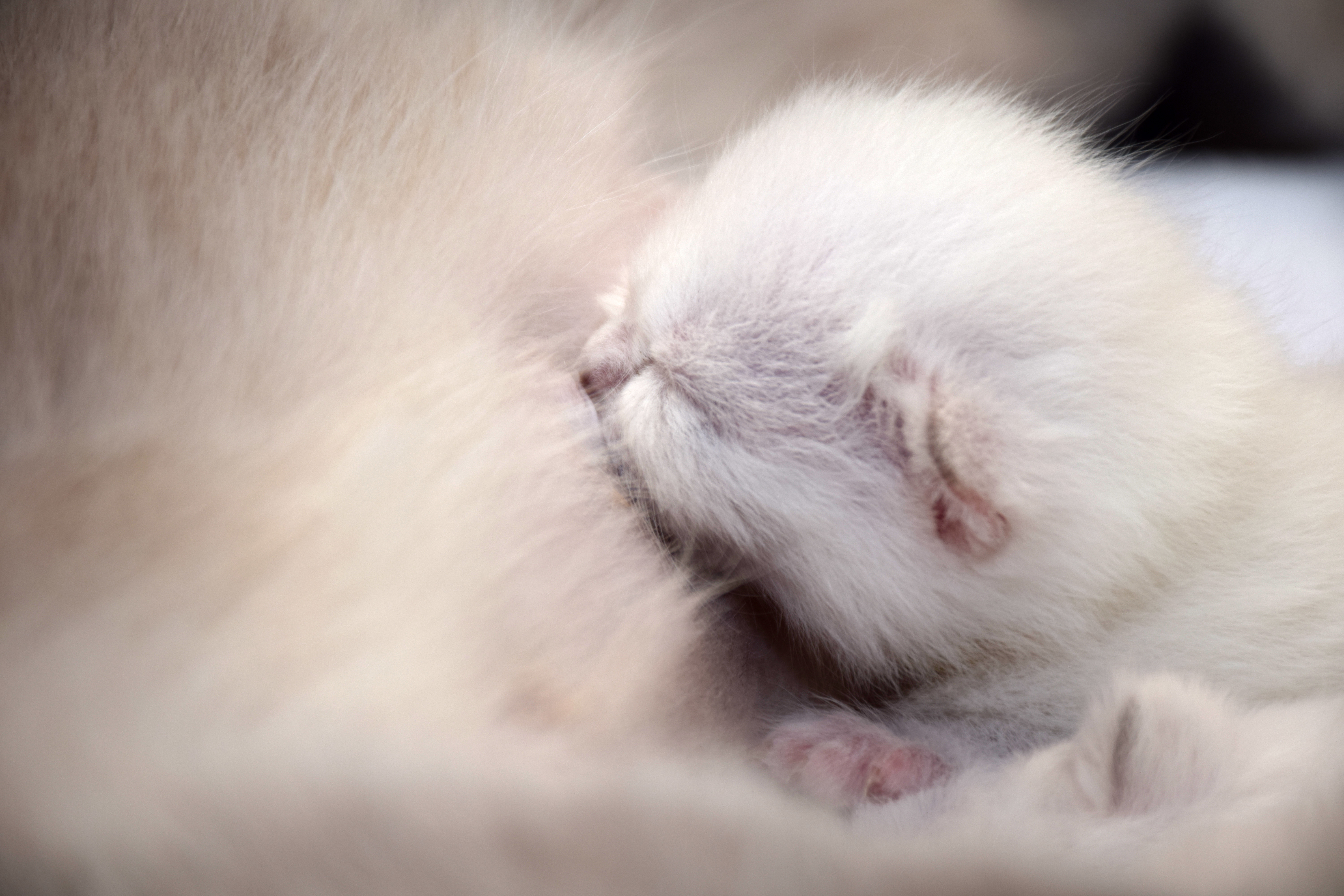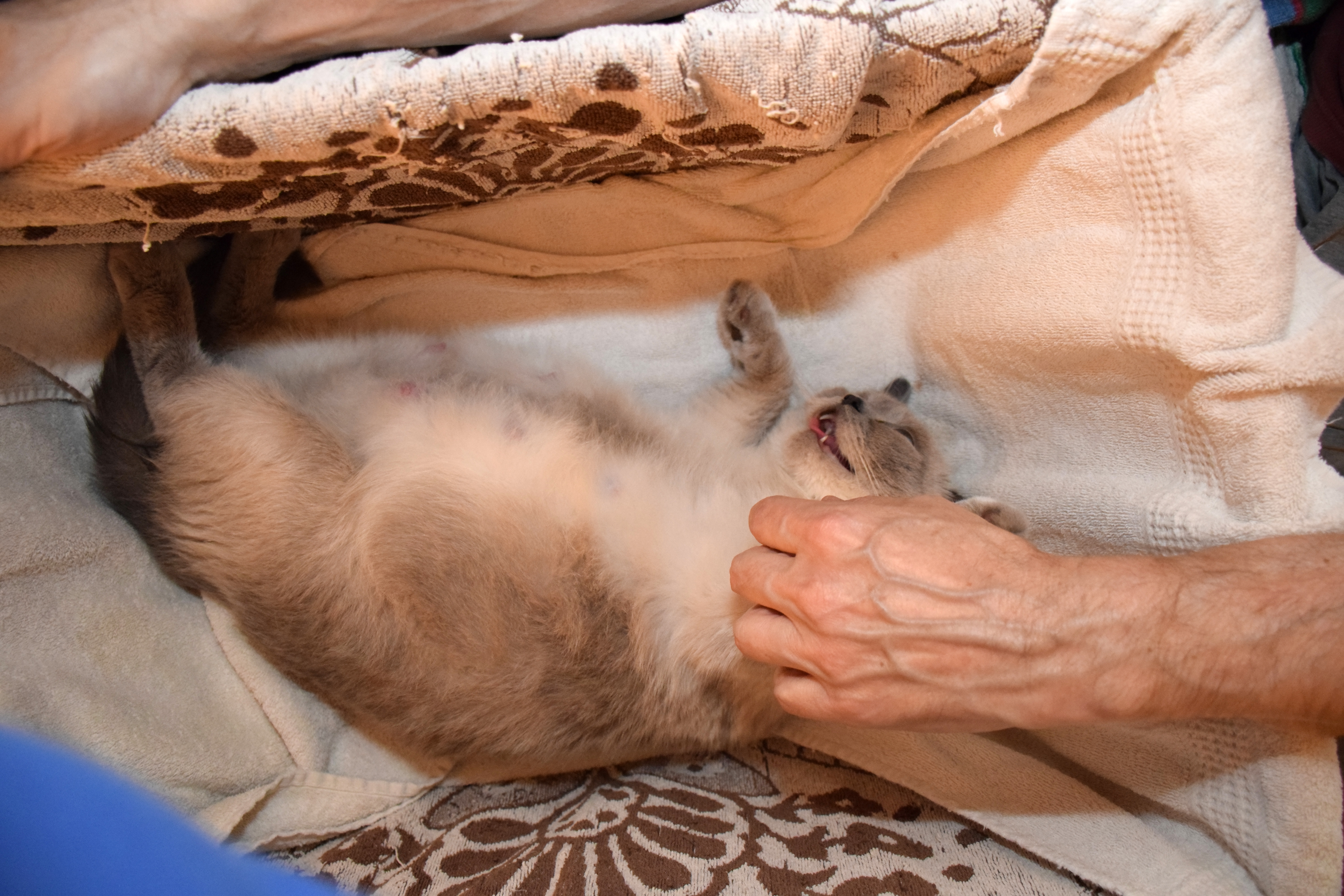 Het laatst geboren kitten is erg hyper en wil niet aangelegd worden. Dit baart ons zorgen. In de loop van de nacht, proberen we het regelmatig, maar zonder succes.