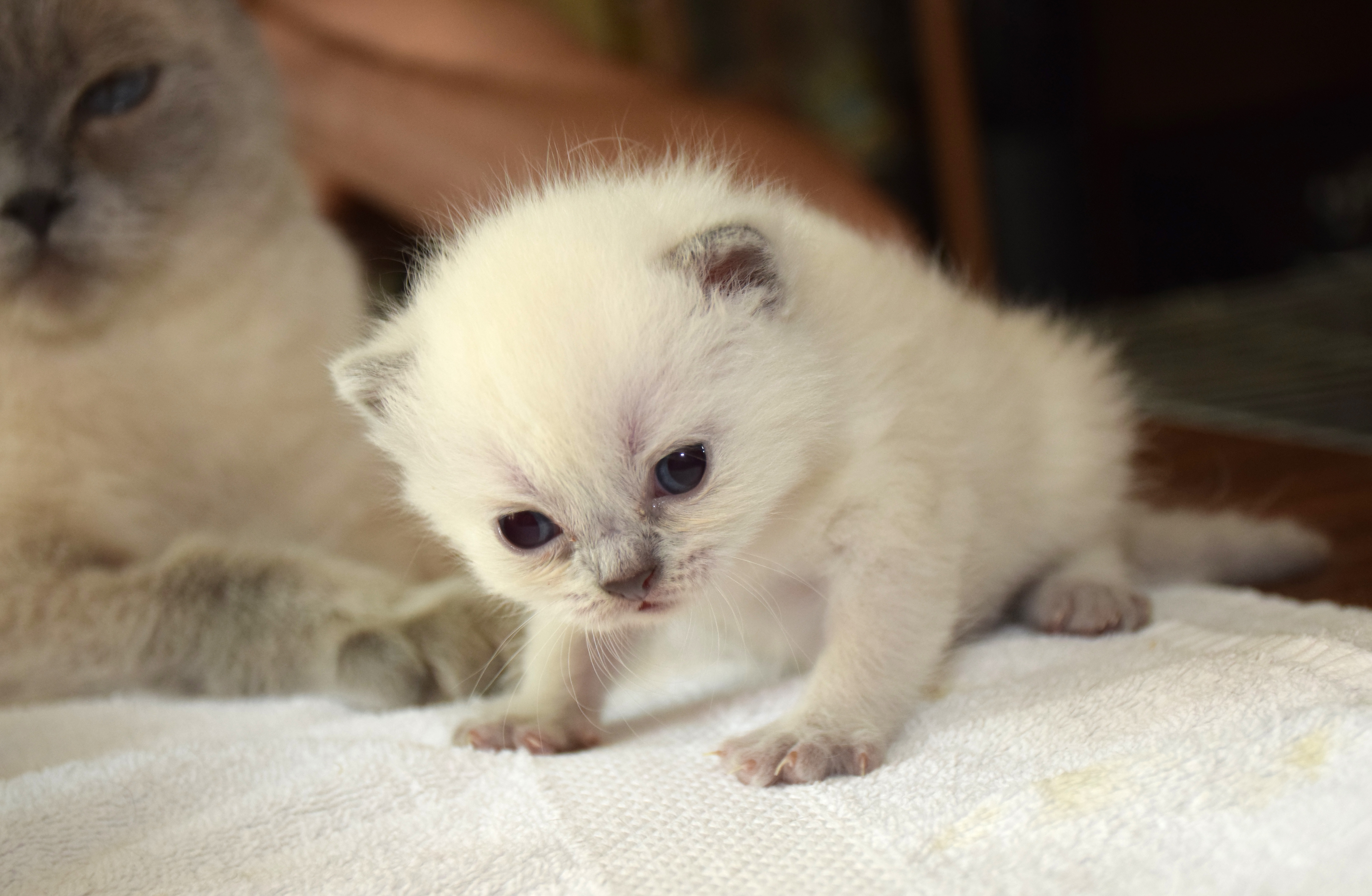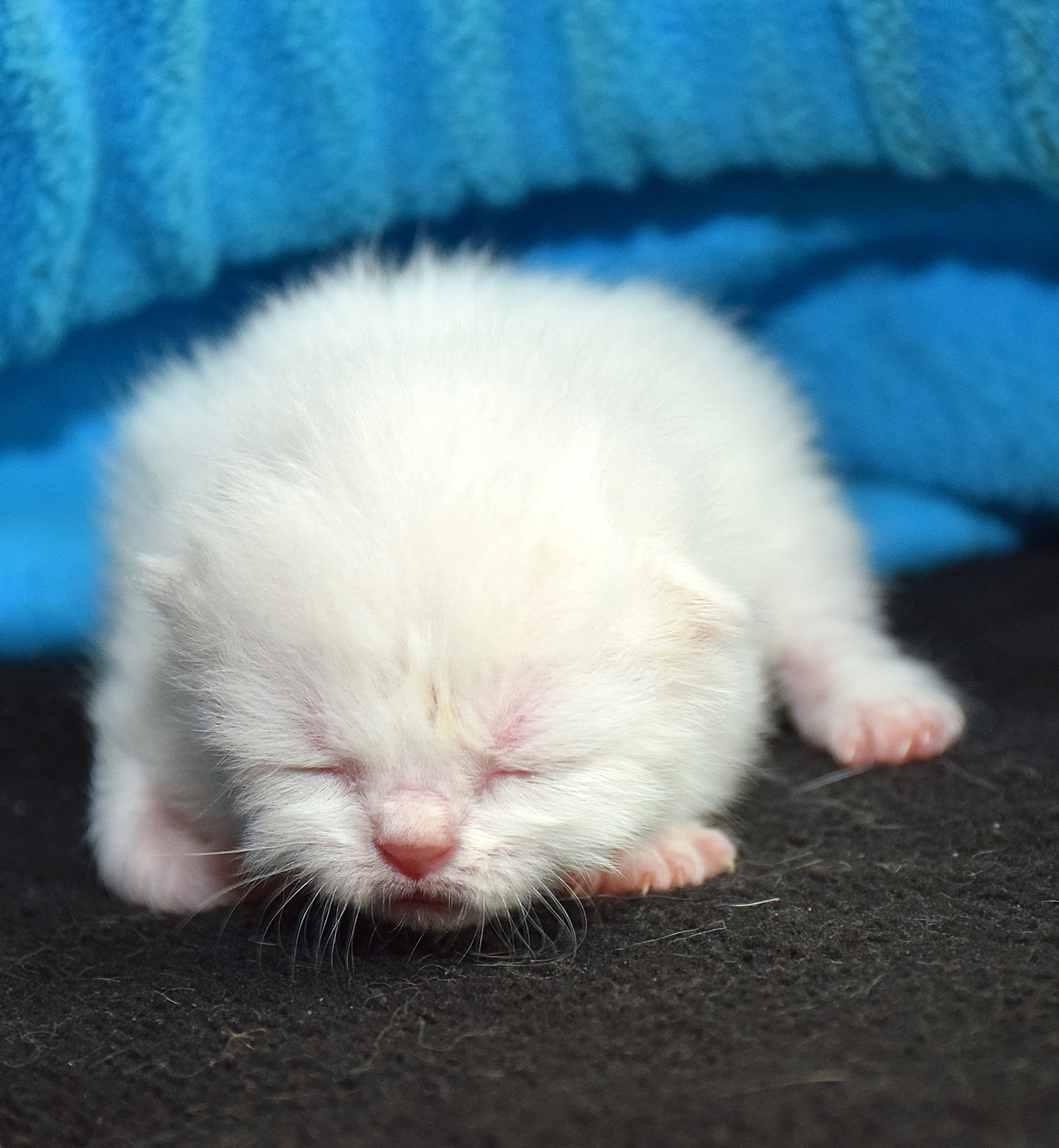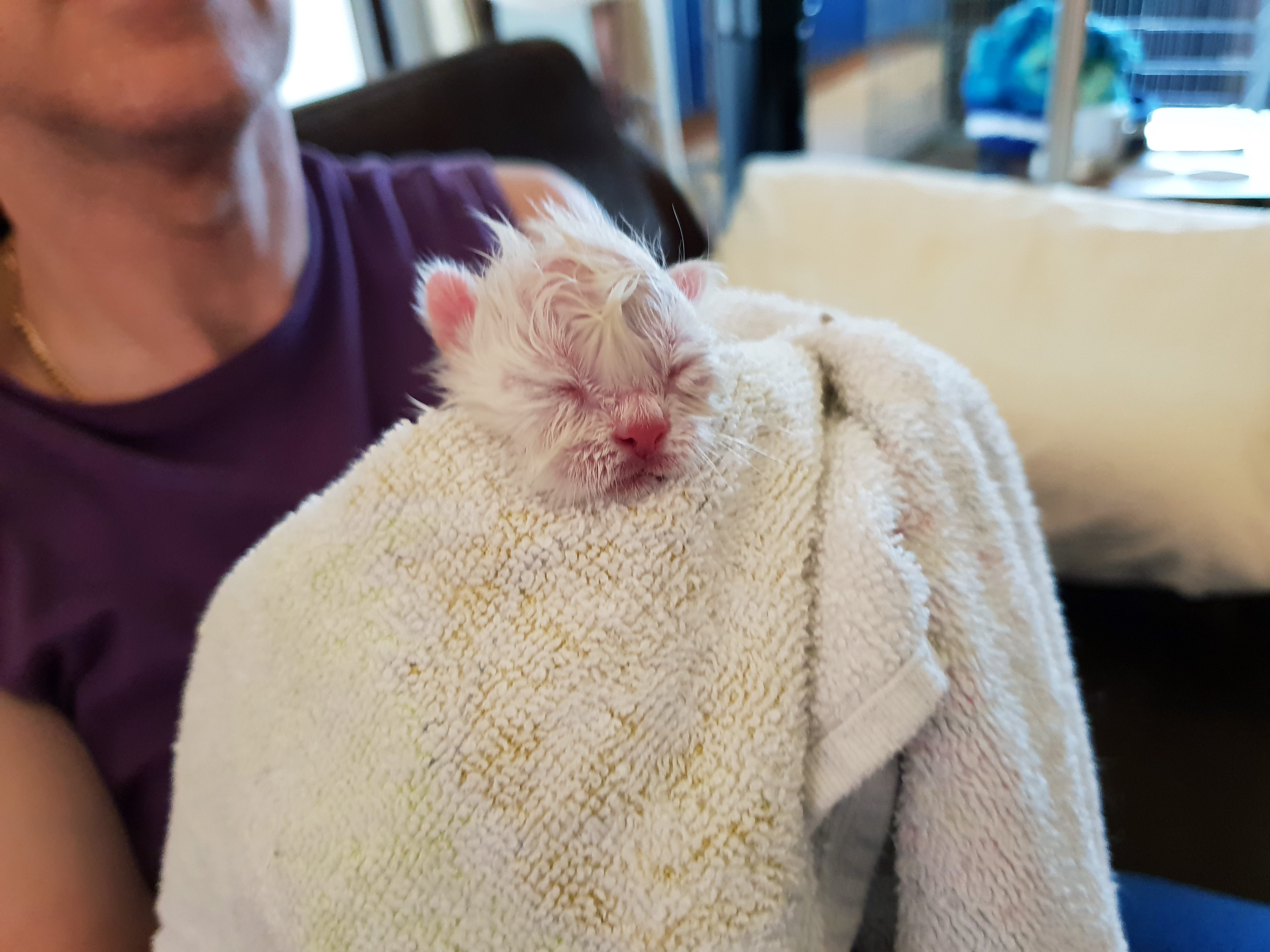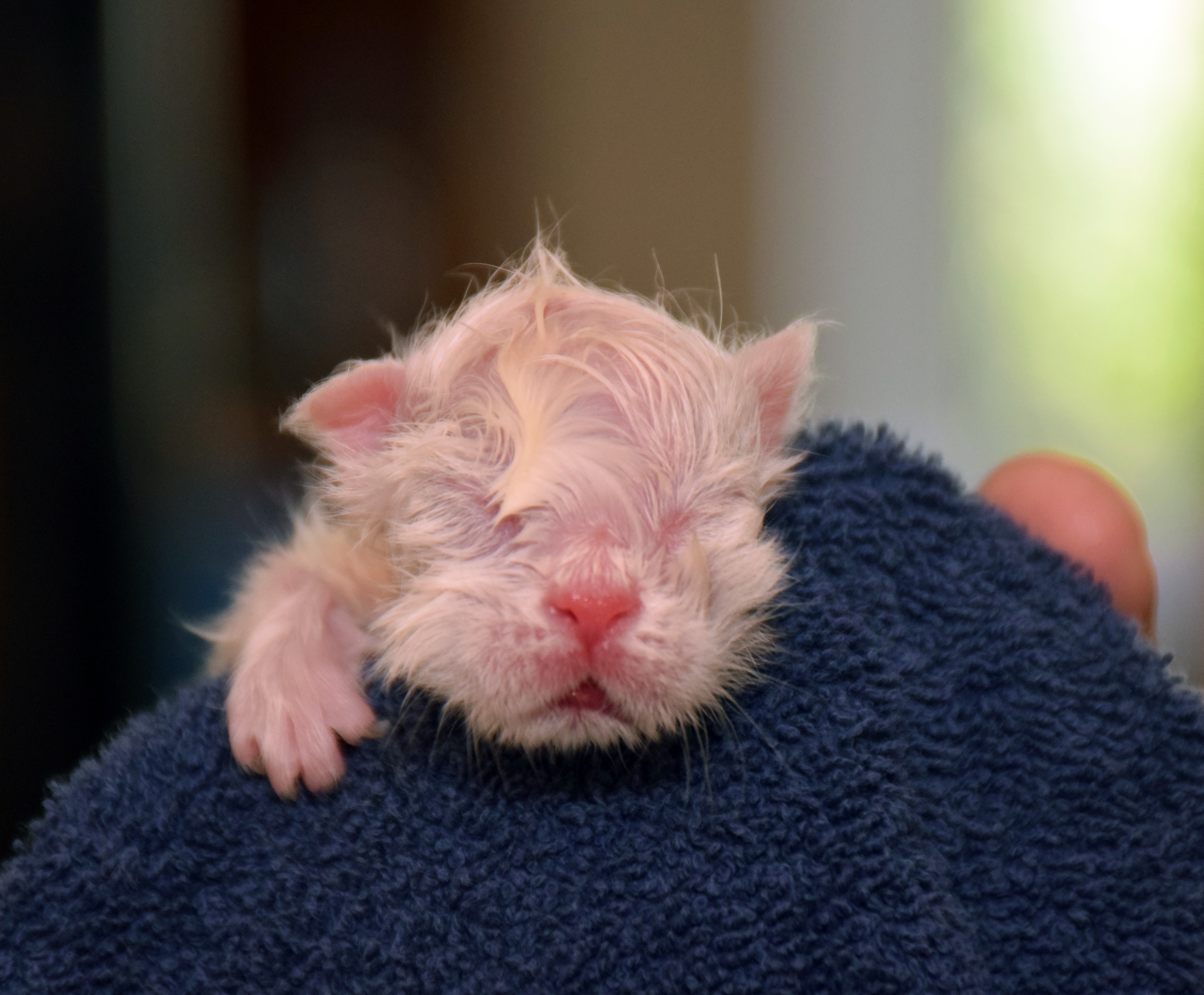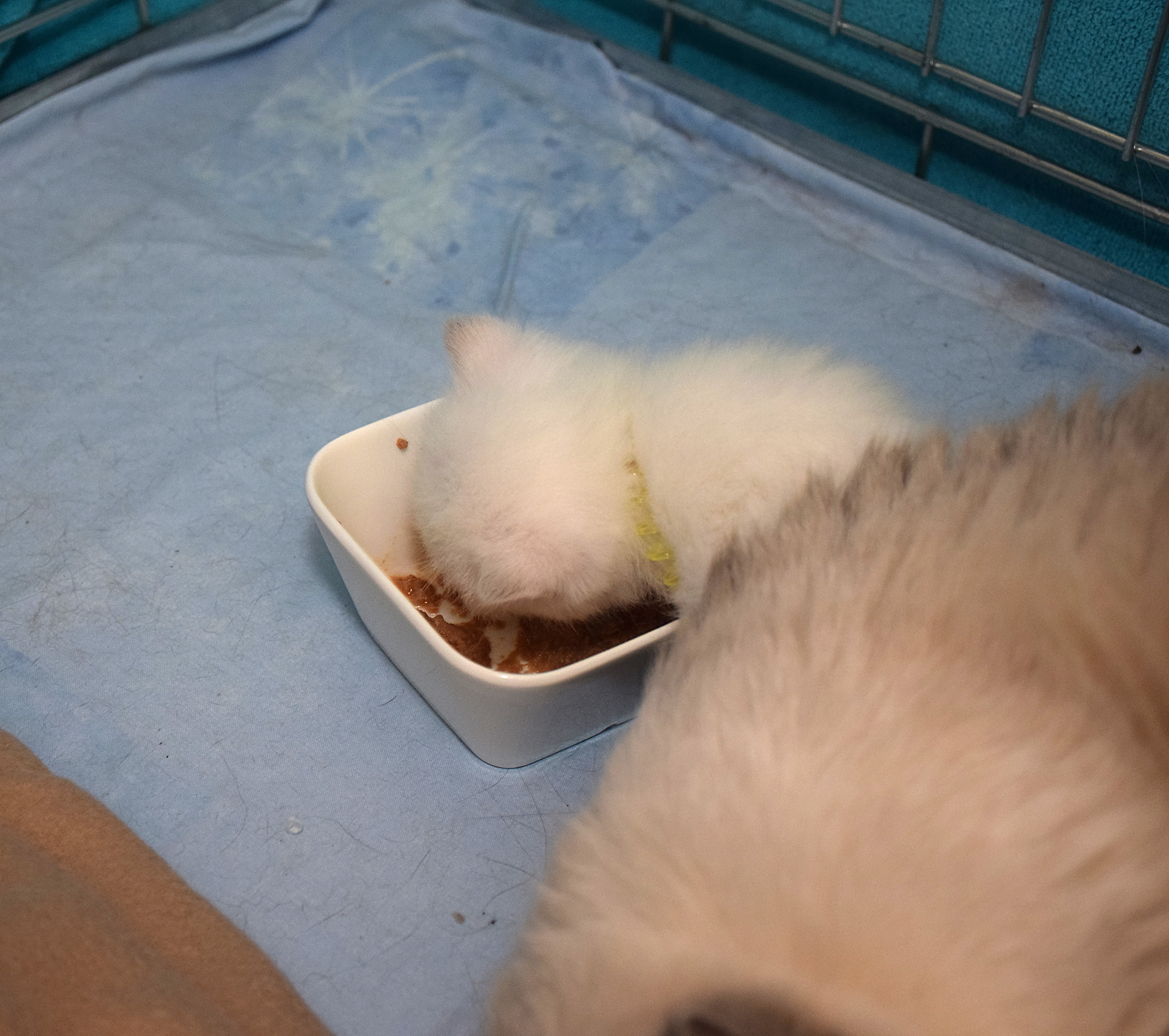 Het laatst geboren kitten is erg hyper en wil niet aangelegd worden. Dit baart ons zorgen. In de loop van de nacht, proberen we het regelmatig, maar zonder succes.