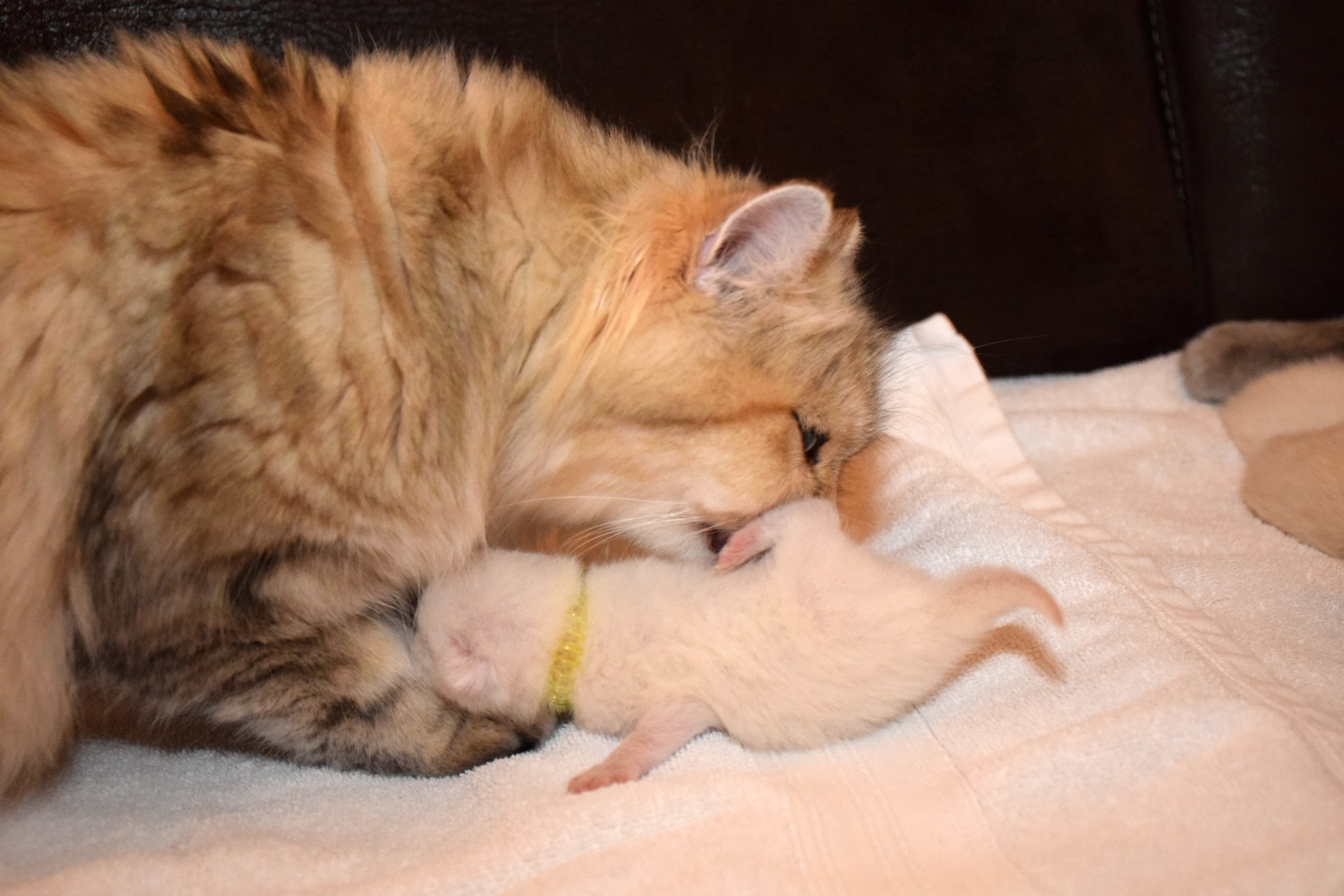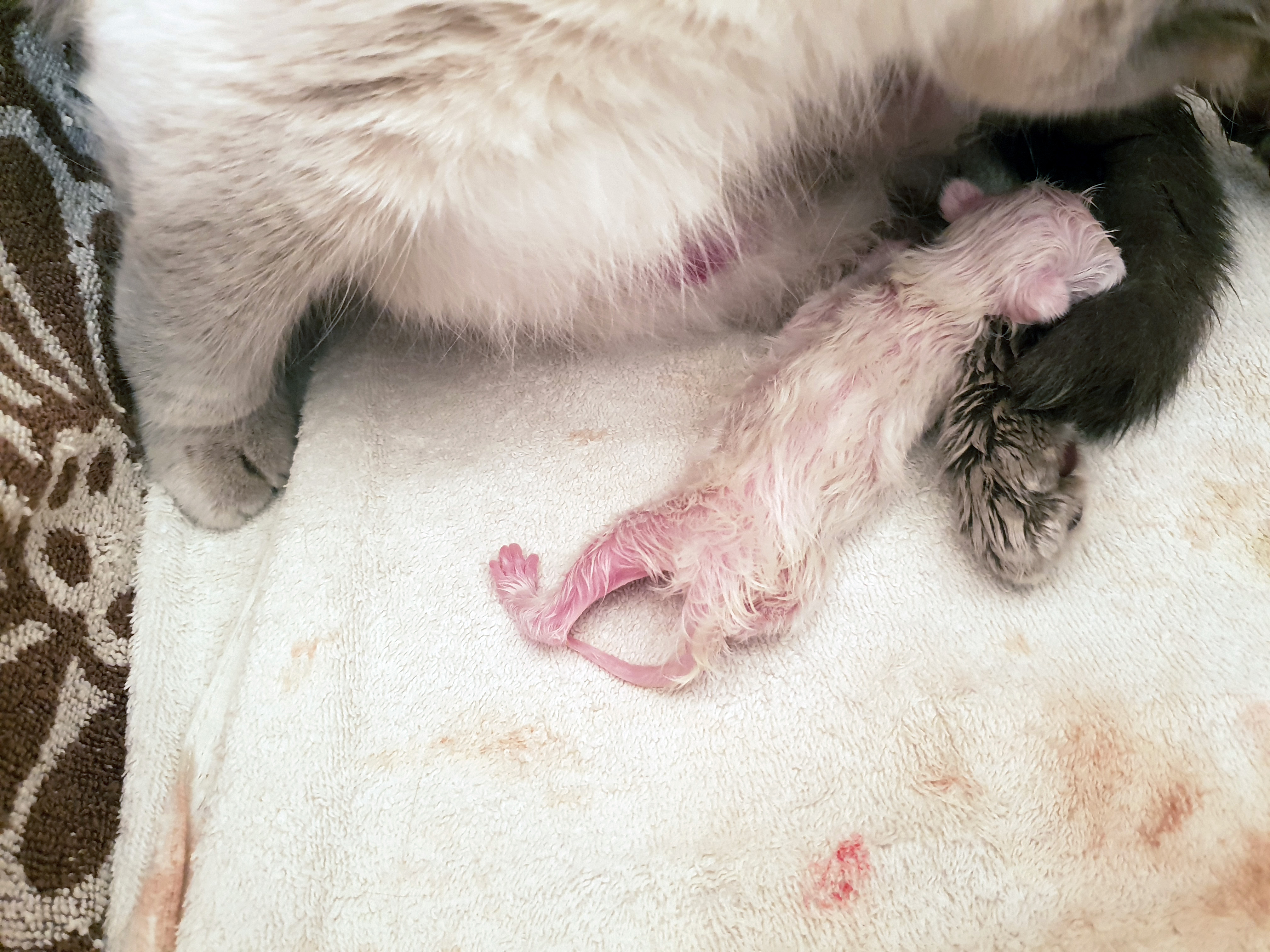 12.08 uur. Het eerst kitten, een poesje (88 gram), floept met een kreet van Mili, haar lijf uit. Het beweegt meteen goed, ademt goed en gaat op zoek naar een tepel. Mili is dolgelukkig.