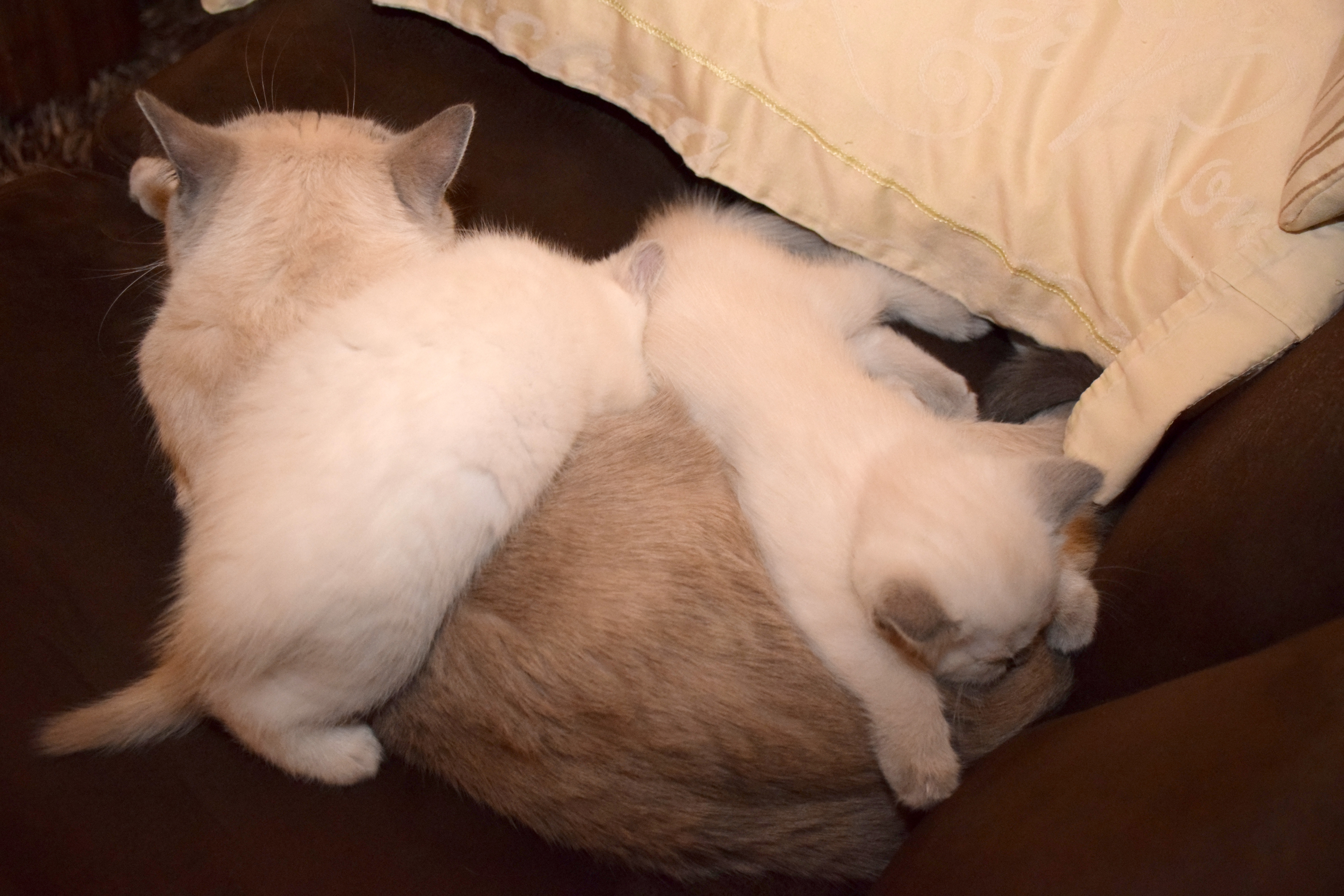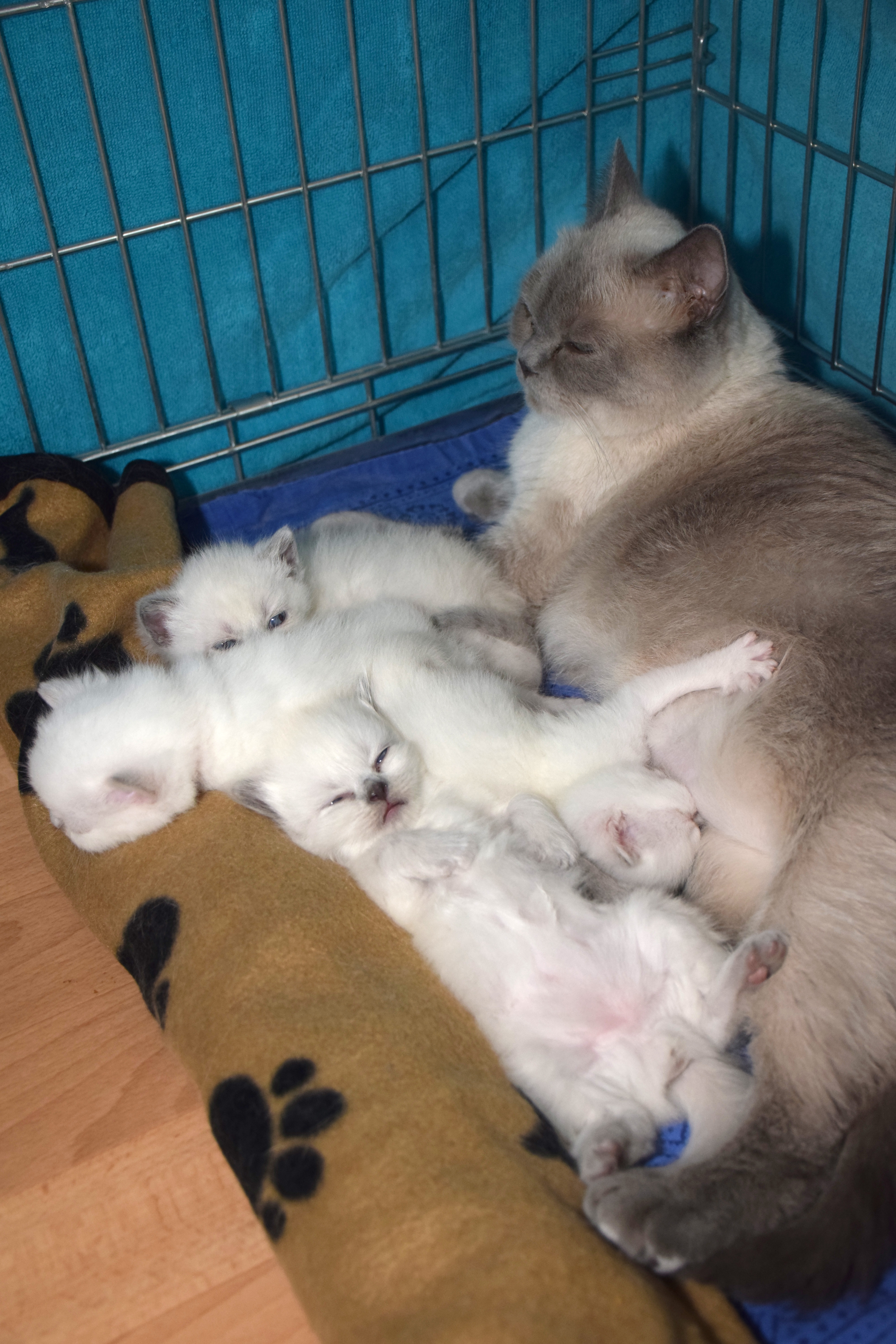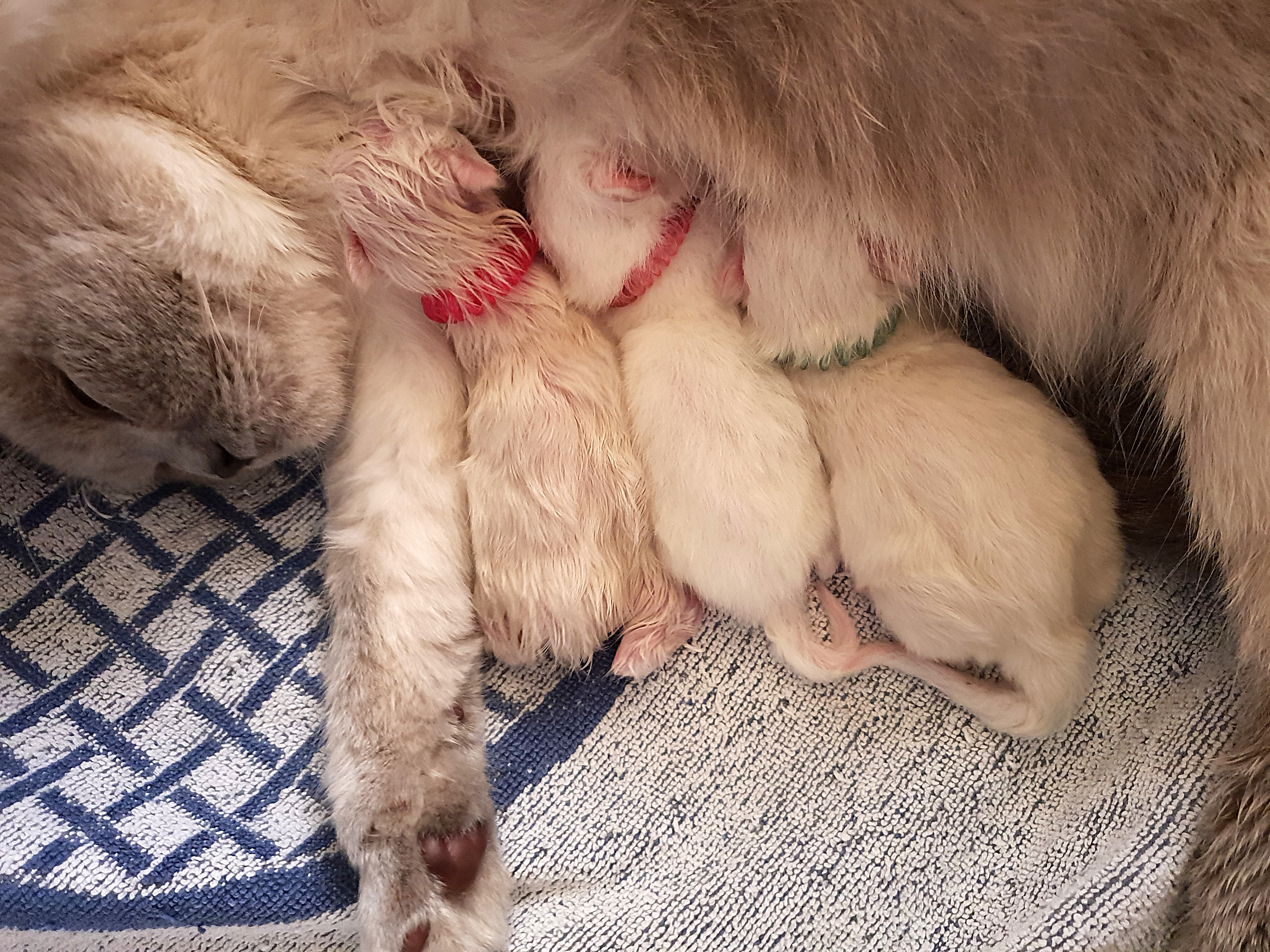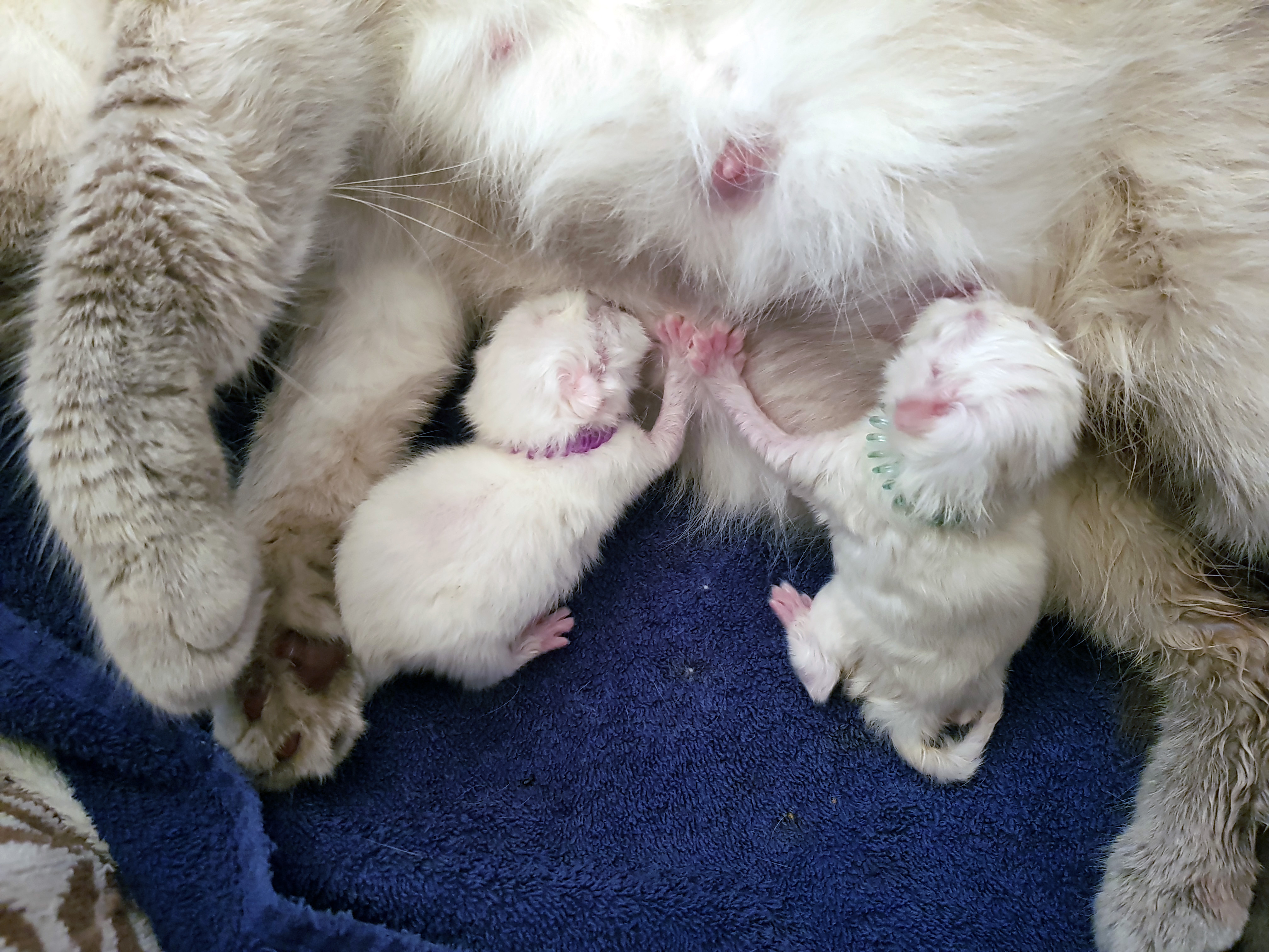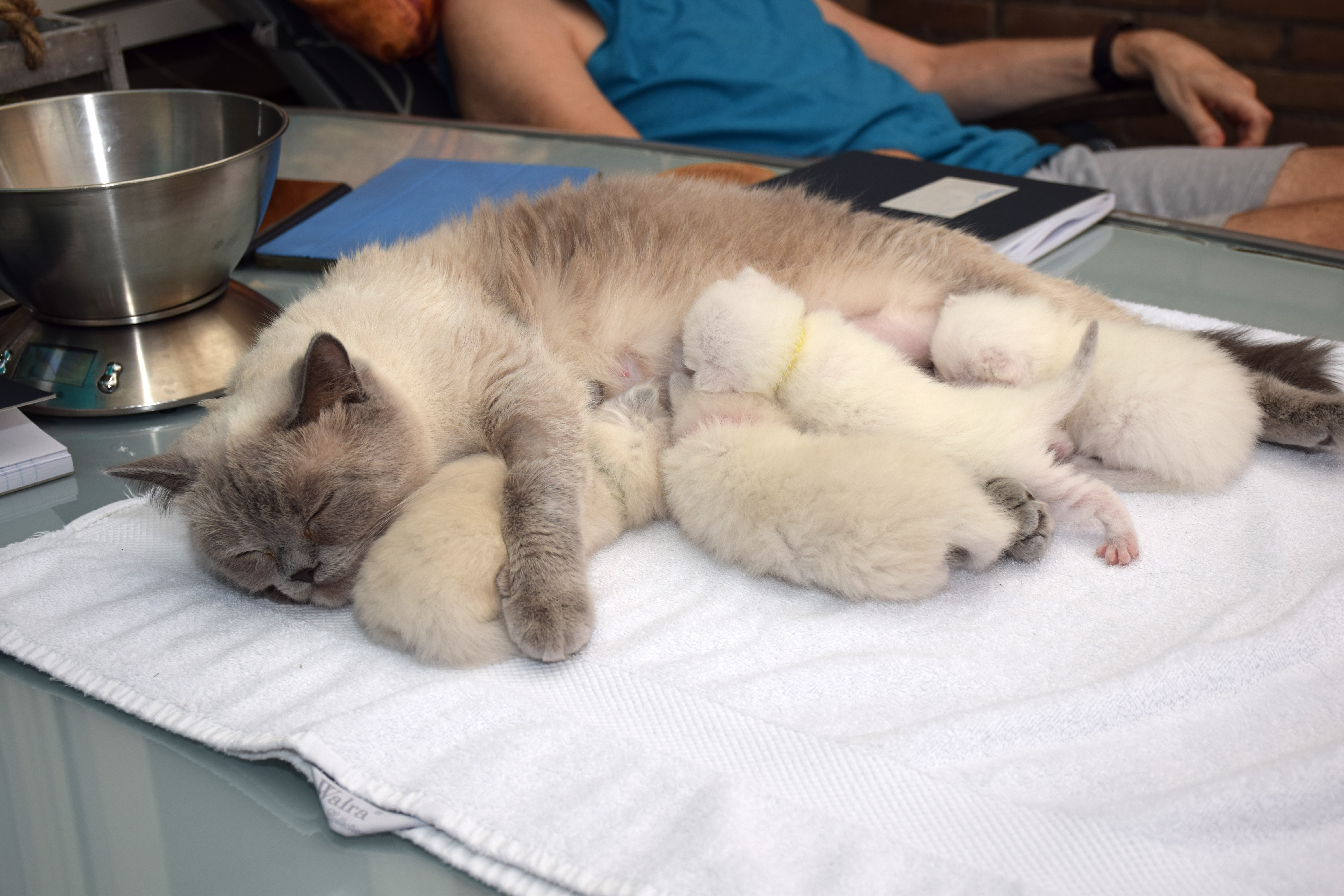 Na de moeizame start gaat het langzaamaan beter. Het duurt een paar dagen voordat Mili haar zorgplicht helemaal op zich neemt. Als gevolg van alle medicatie en de keizersnede heeft ze echt wel tijd nodig om te herstellen. Ze blijft wel goed bij de kleintjes liggen, verzorgd zichzelf ook goed, maar de zorg voor de kittens is wat minder. Geen nood, wij zijn er ook nog en met liefde en plezier nemen wij die zorg op ons: kontjes wassen met name. Je ziet bijna een gelukzalige glimlach op het koppie verschijnen als je ze van hun zware last af helpt… 😉