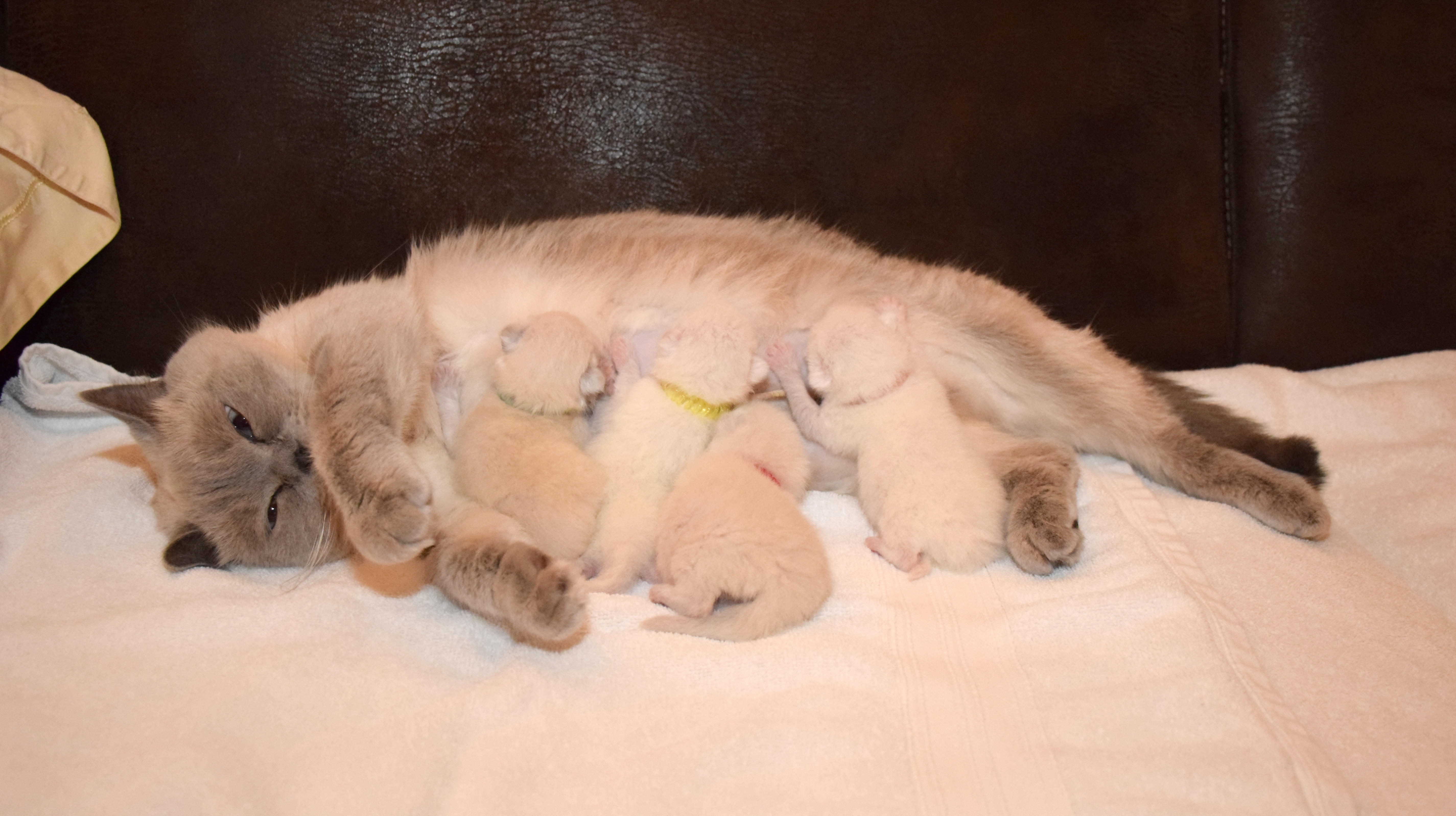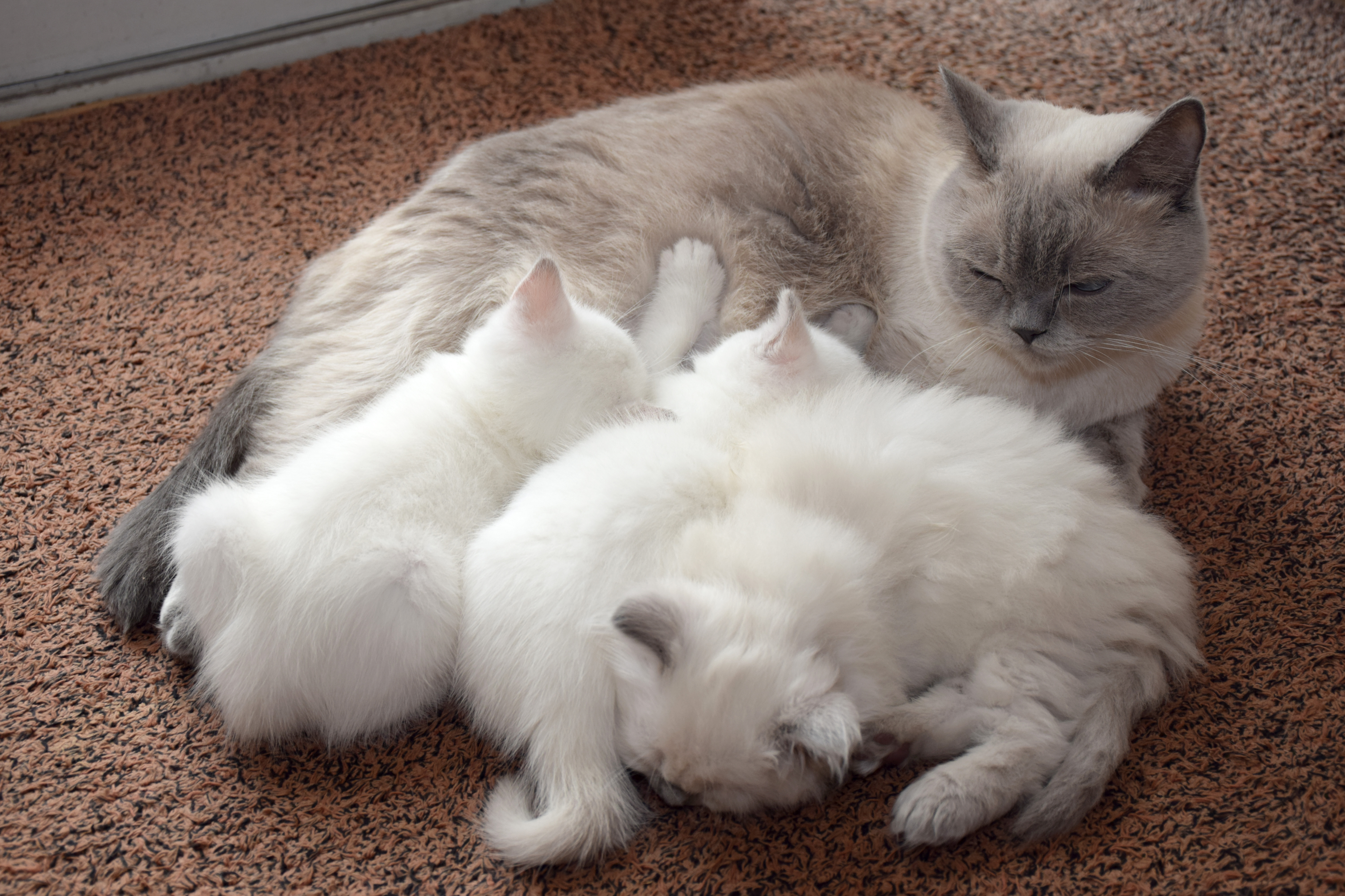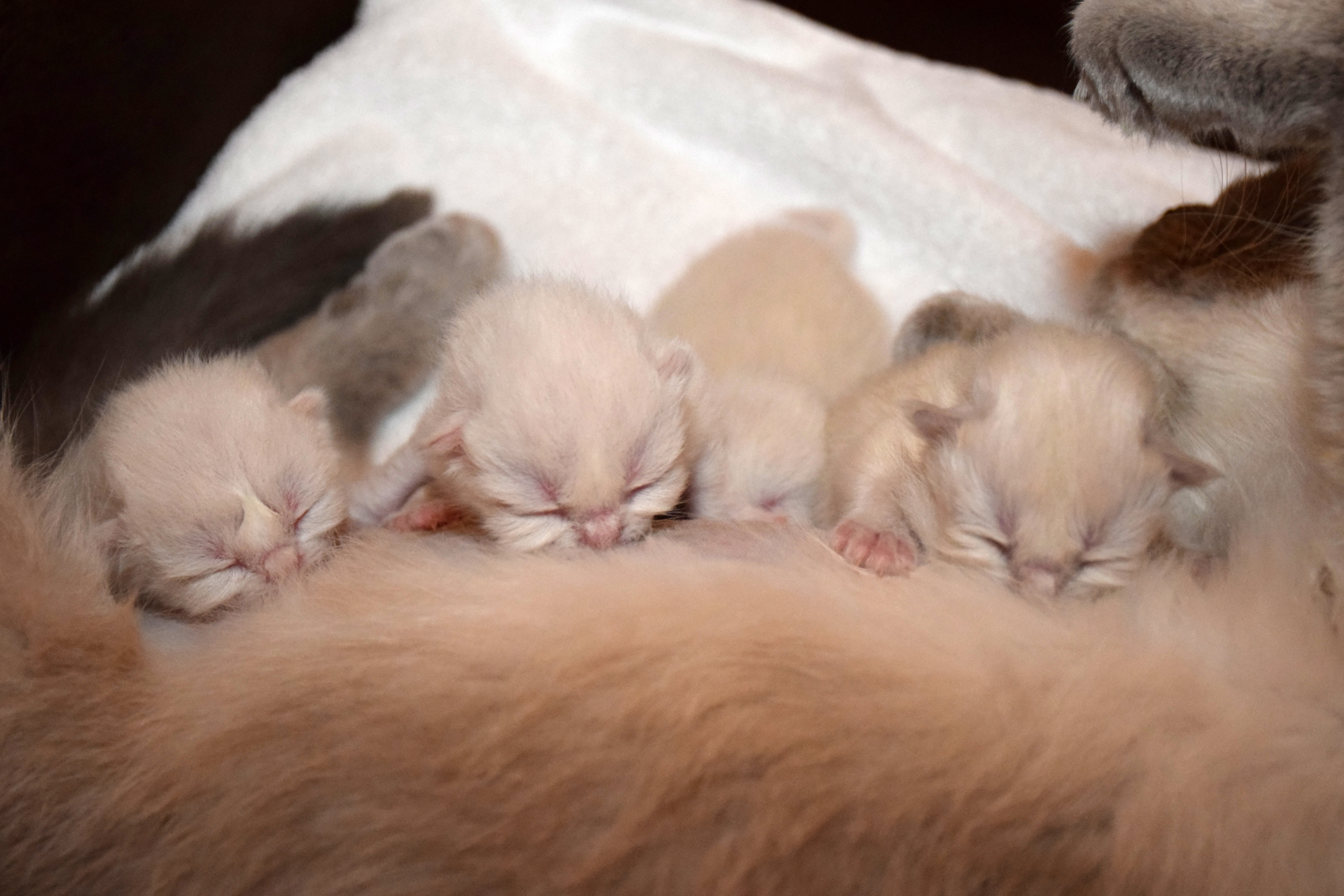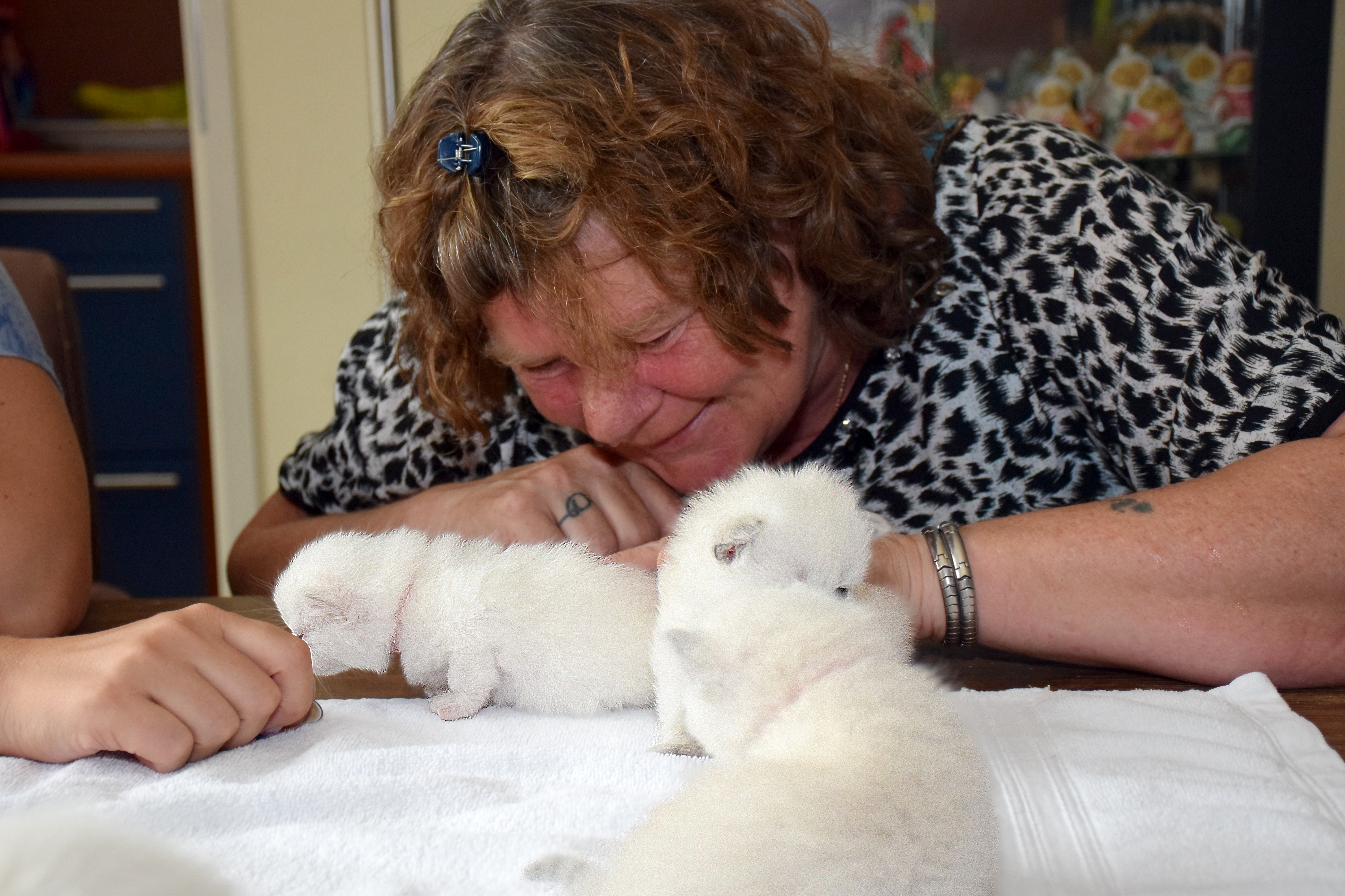 Na de moeizame start gaat het langzaamaan beter. Het duurt een paar dagen voordat Mili haar zorgplicht helemaal op zich neemt. Als gevolg van alle medicatie en de keizersnede heeft ze echt wel tijd nodig om te herstellen. Ze blijft wel goed bij de kleintjes liggen, verzorgd zichzelf ook goed, maar de zorg voor de kittens is wat minder. Geen nood, wij zijn er ook nog en met liefde en plezier nemen wij die zorg op ons: kontjes wassen met name. Je ziet bijna een gelukzalige glimlach op het koppie verschijnen als je ze van hun zware last af helpt… 😉