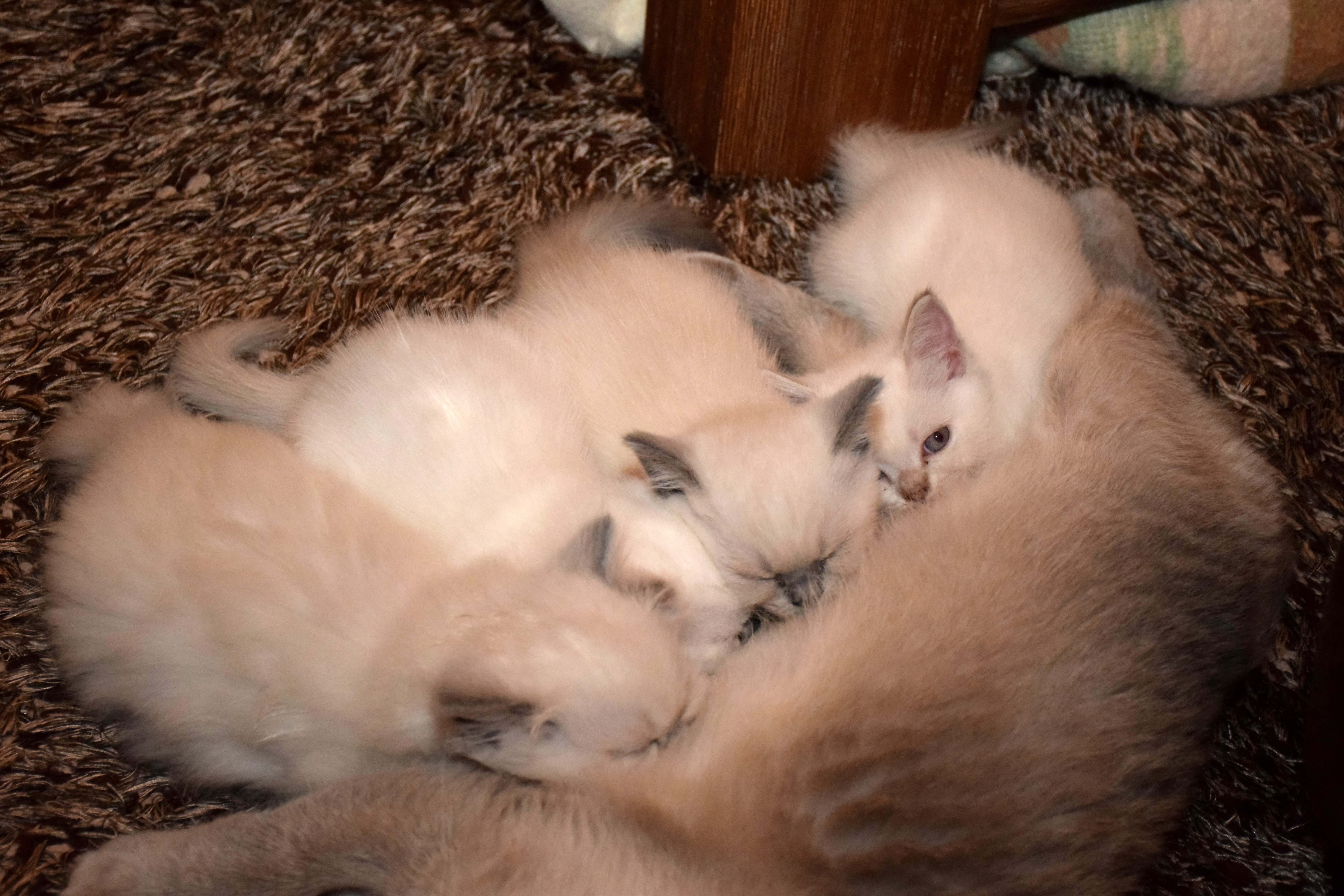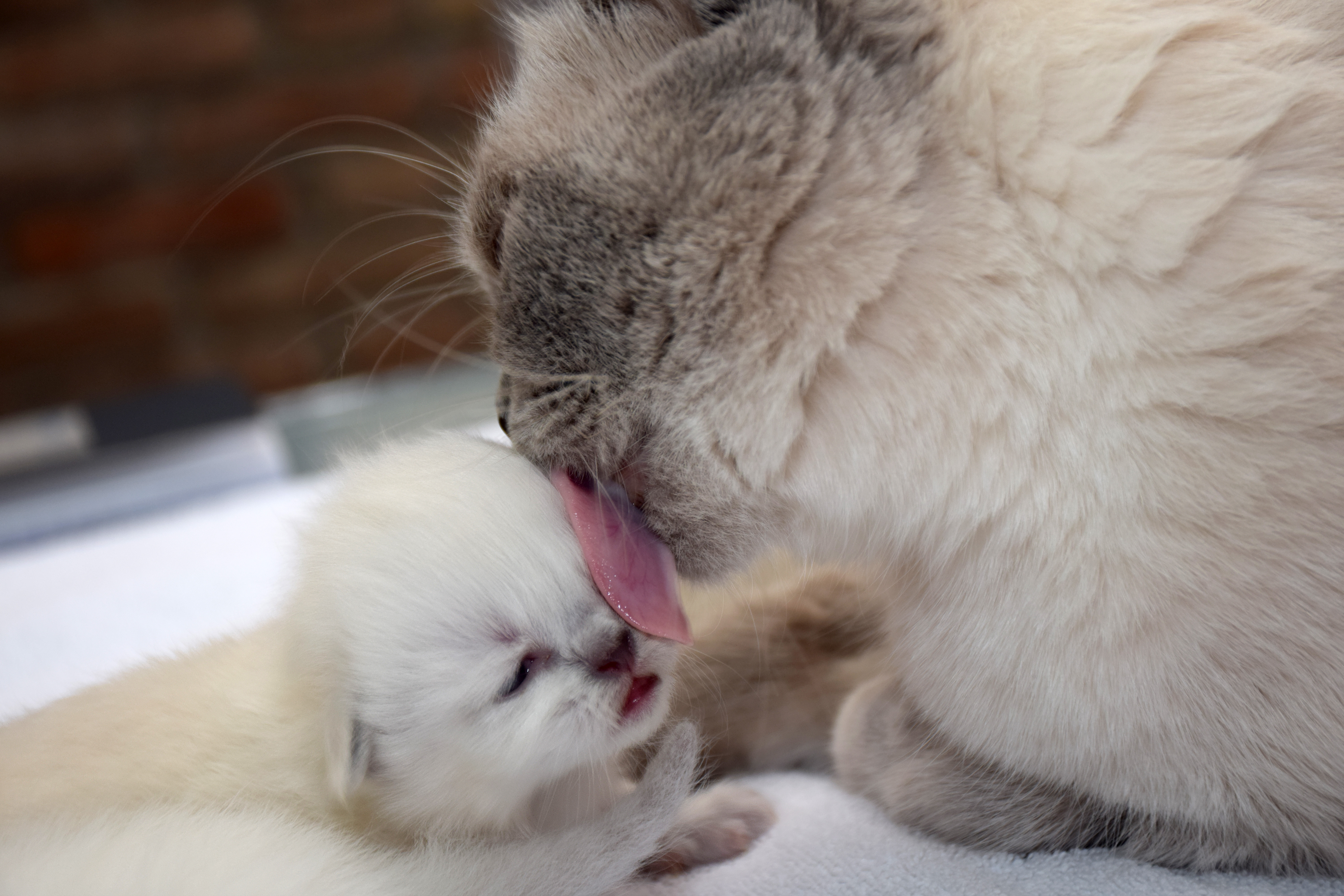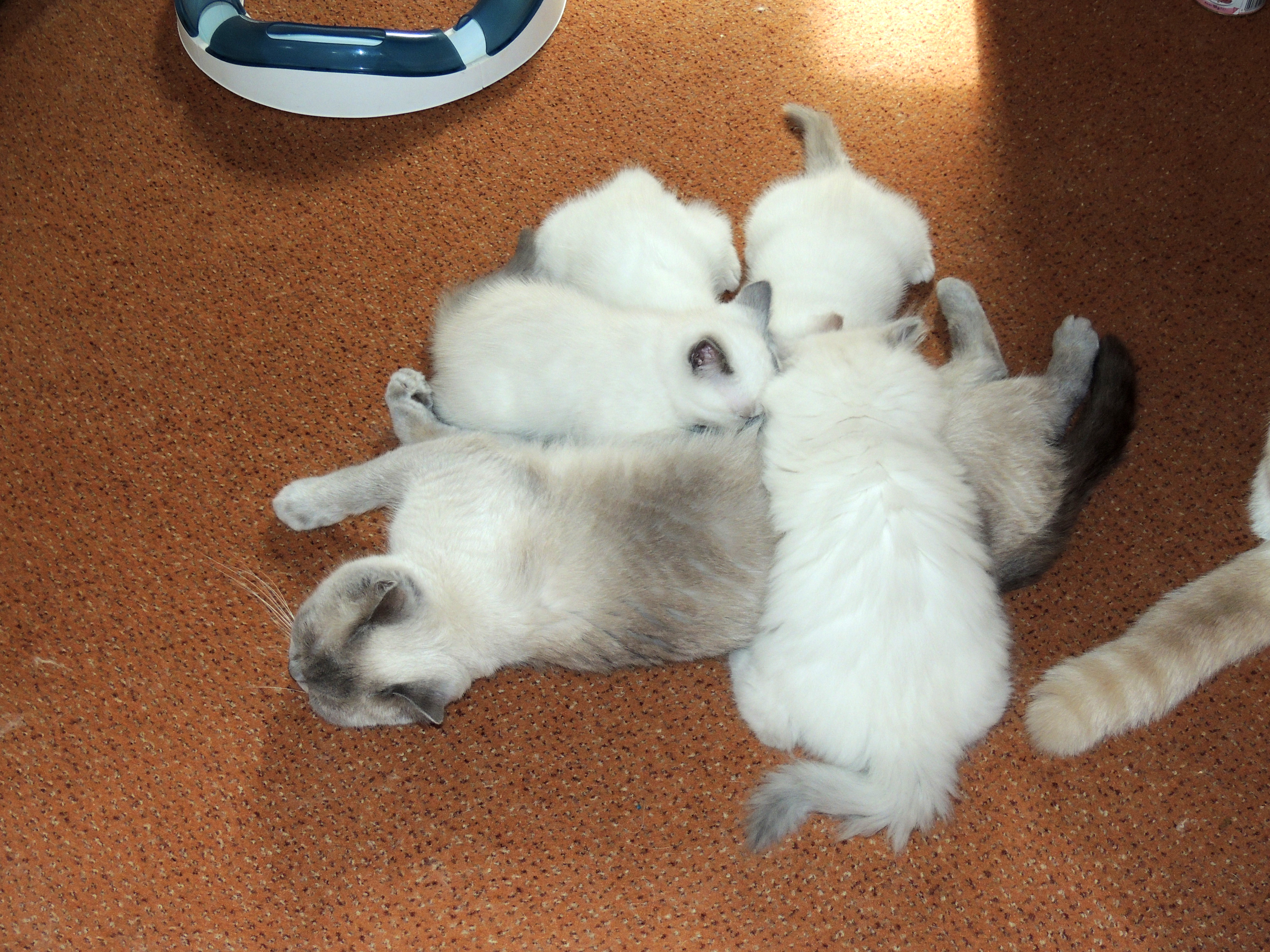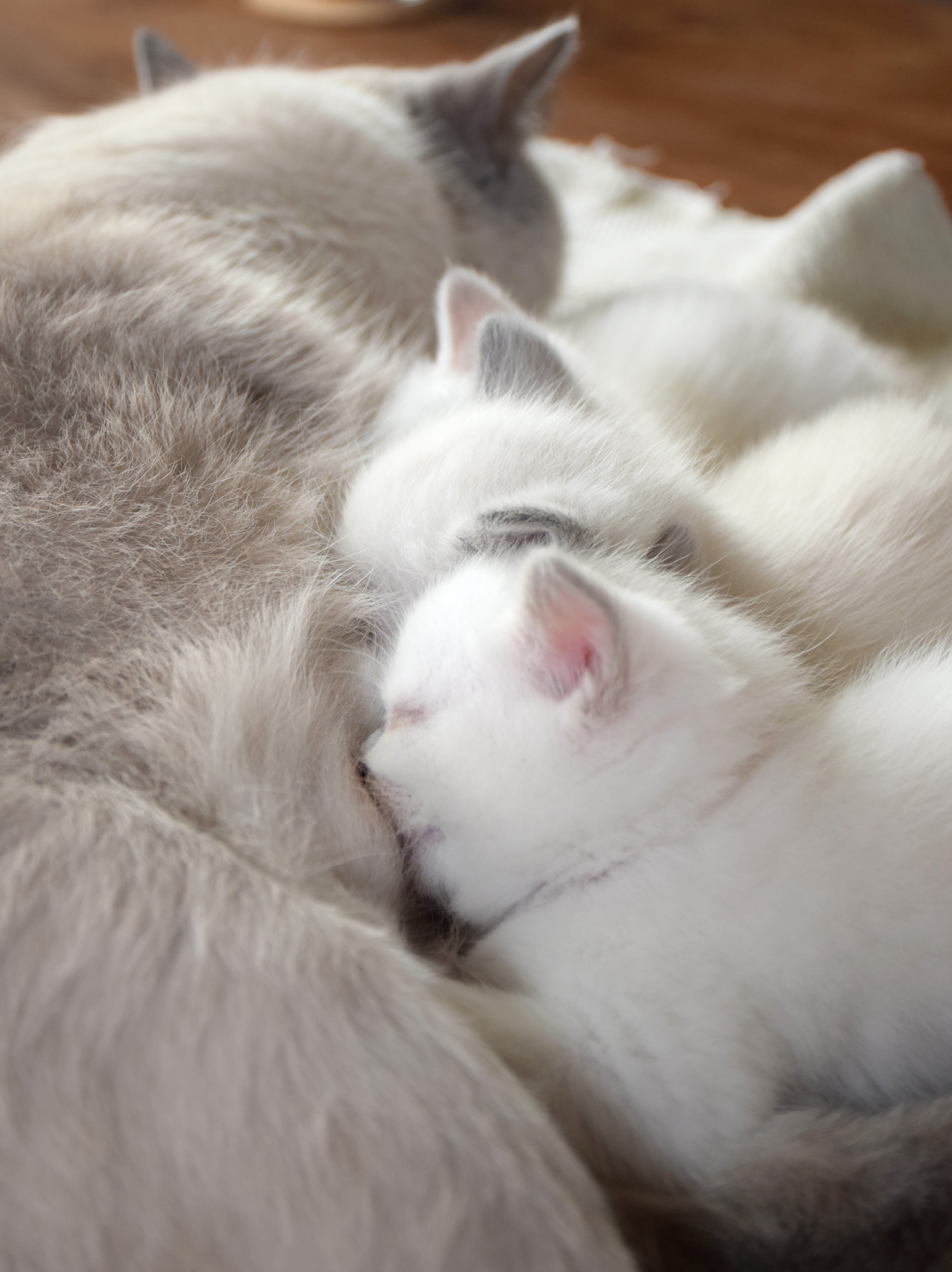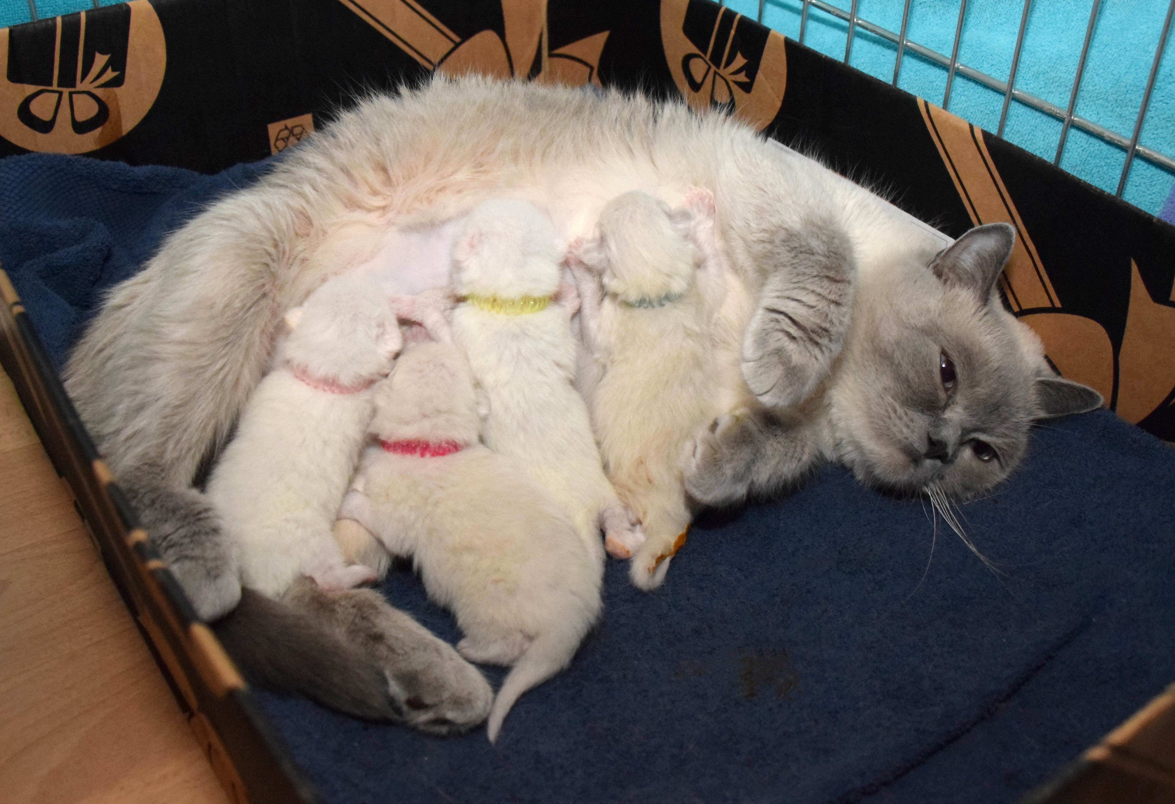 Na de moeizame start gaat het langzaamaan beter. Het duurt een paar dagen voordat Mili haar zorgplicht helemaal op zich neemt. Als gevolg van alle medicatie en de keizersnede heeft ze echt wel tijd nodig om te herstellen. Ze blijft wel goed bij de kleintjes liggen, verzorgd zichzelf ook goed, maar de zorg voor de kittens is wat minder. Geen nood, wij zijn er ook nog en met liefde en plezier nemen wij die zorg op ons: kontjes wassen met name. Je ziet bijna een gelukzalige glimlach op het koppie verschijnen als je ze van hun zware last af helpt… 😉