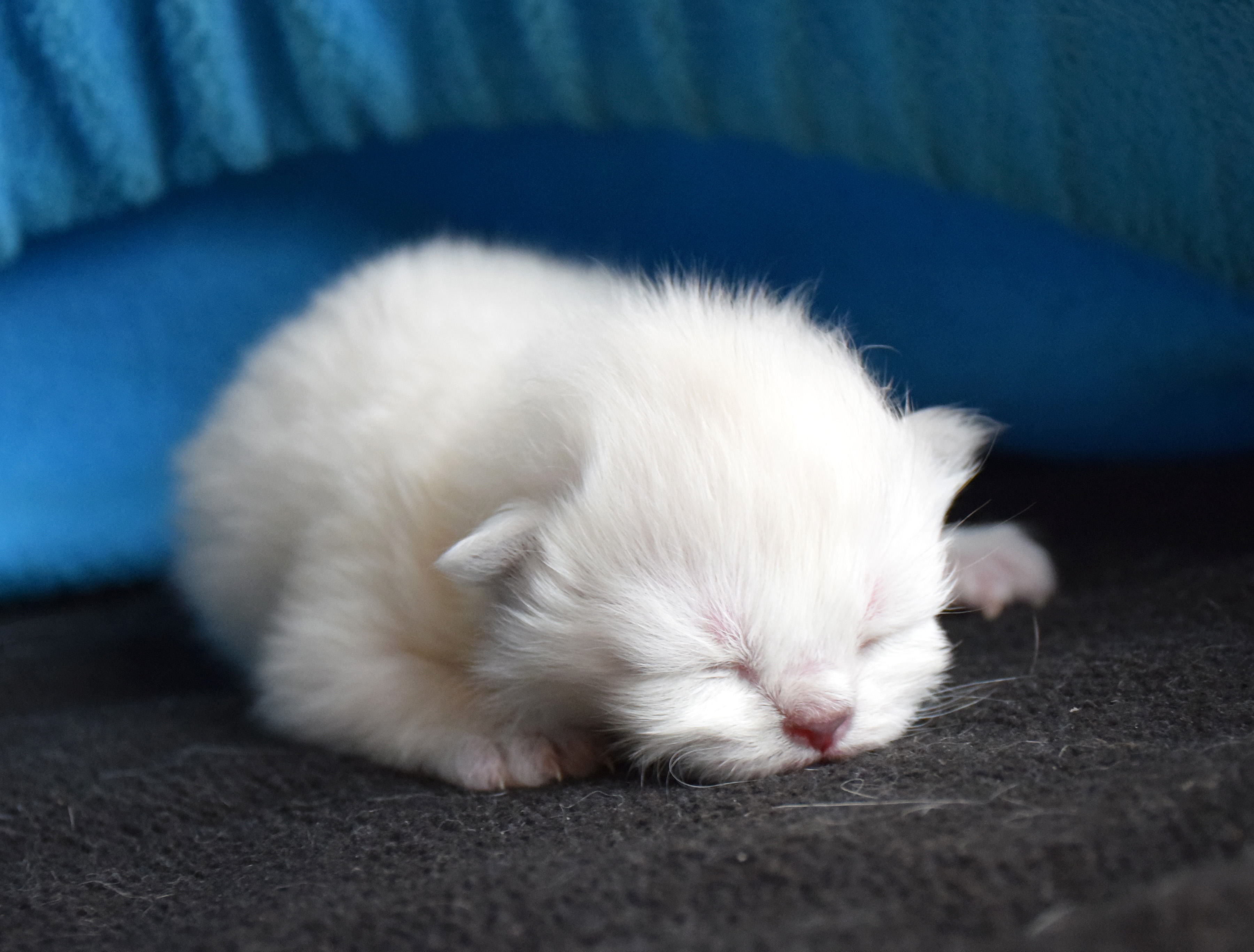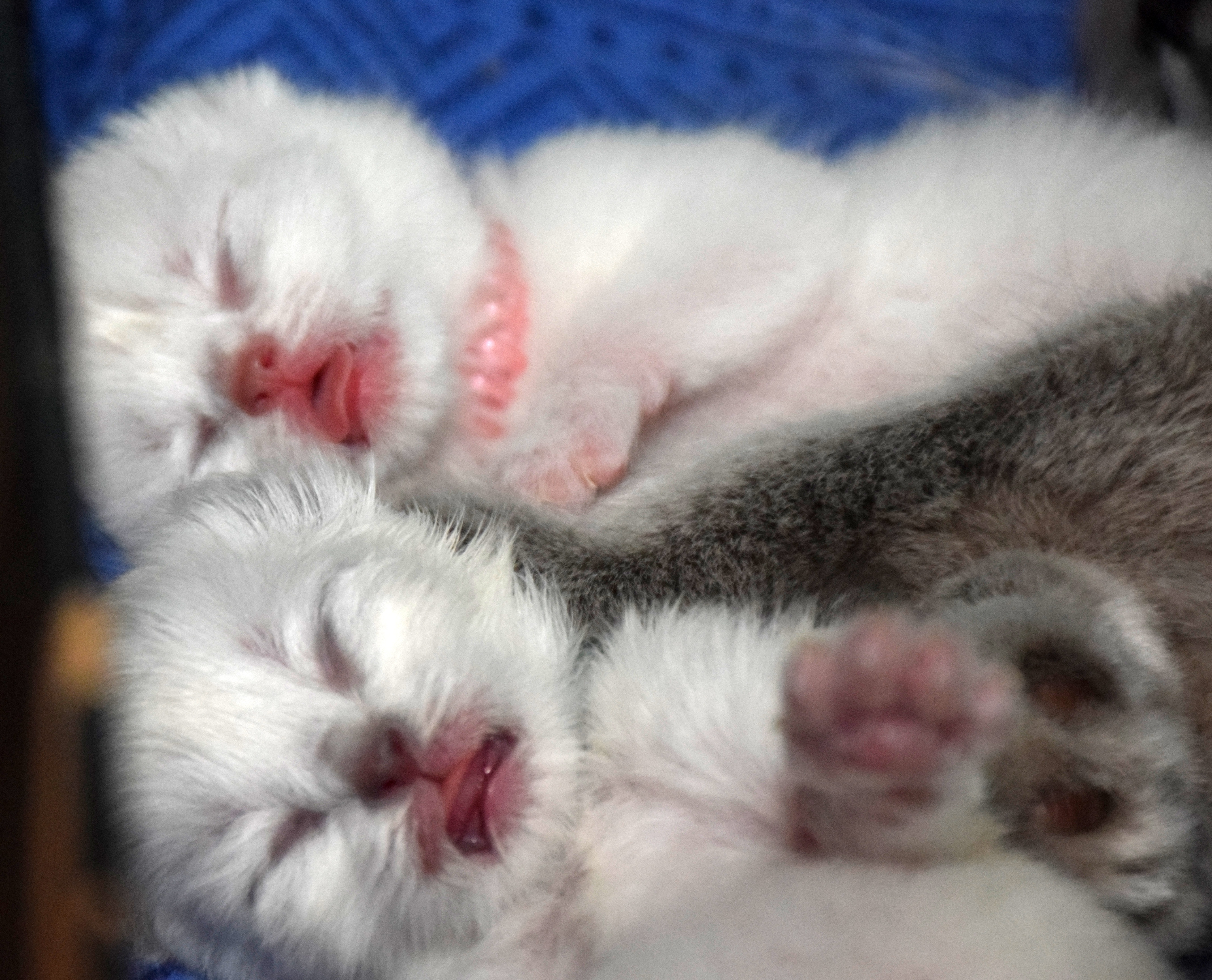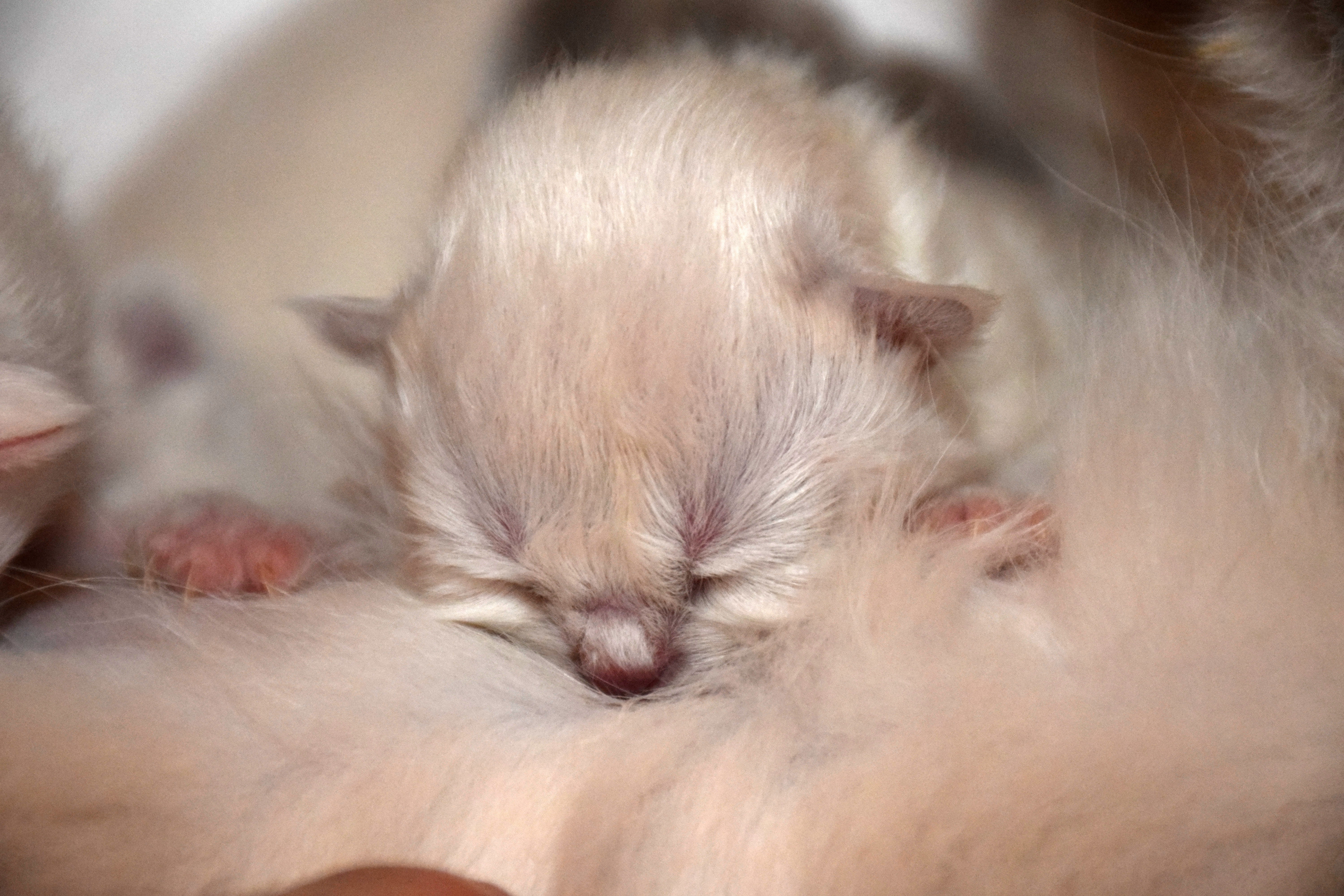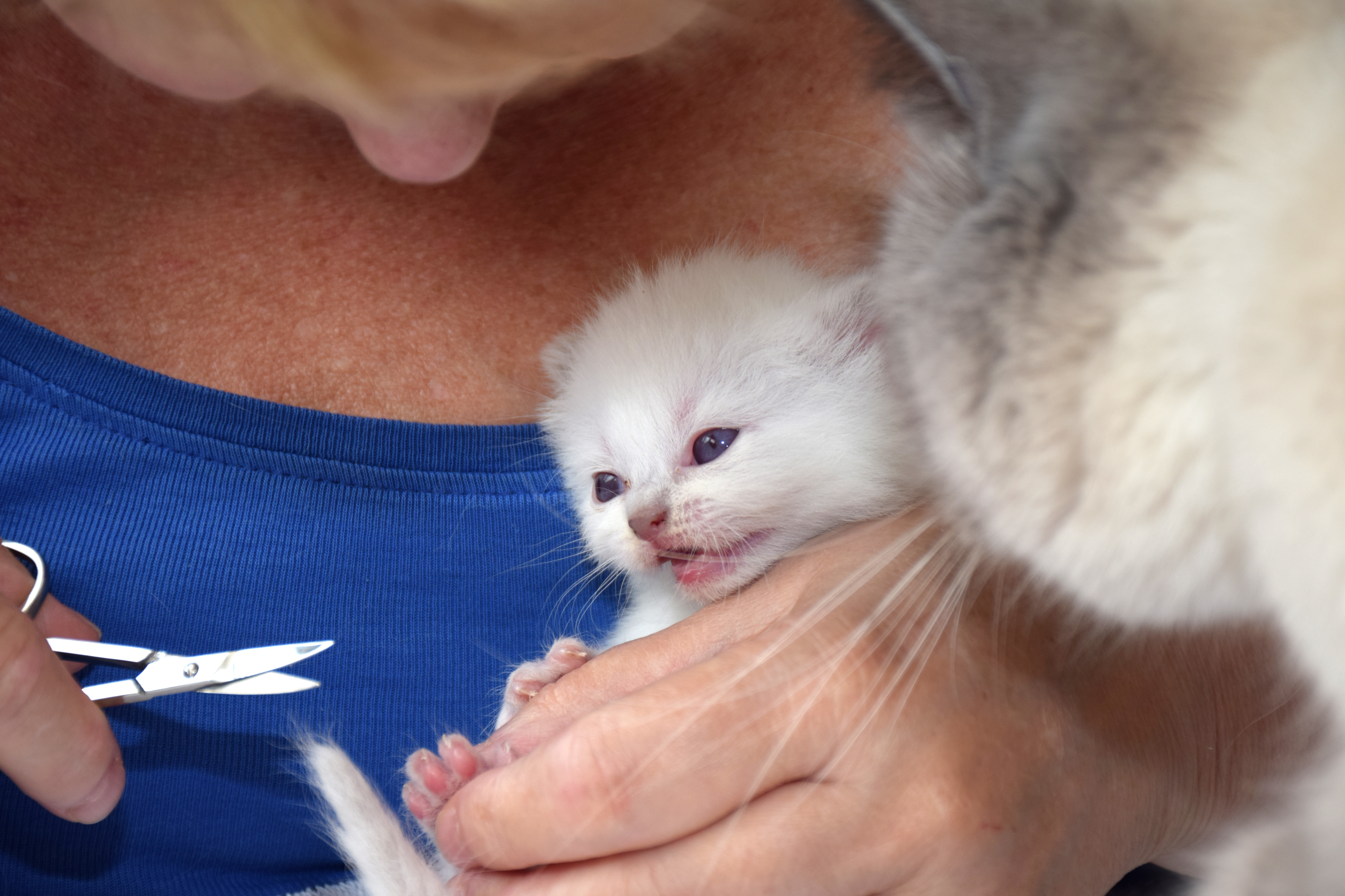 Na de moeizame start gaat het langzaamaan beter. Het duurt een paar dagen voordat Mili haar zorgplicht helemaal op zich neemt. Als gevolg van alle medicatie en de keizersnede heeft ze echt wel tijd nodig om te herstellen. Ze blijft wel goed bij de kleintjes liggen, verzorgd zichzelf ook goed, maar de zorg voor de kittens is wat minder. Geen nood, wij zijn er ook nog en met liefde en plezier nemen wij die zorg op ons: kontjes wassen met name. Je ziet bijna een gelukzalige glimlach op het koppie verschijnen als je ze van hun zware last af helpt… 😉