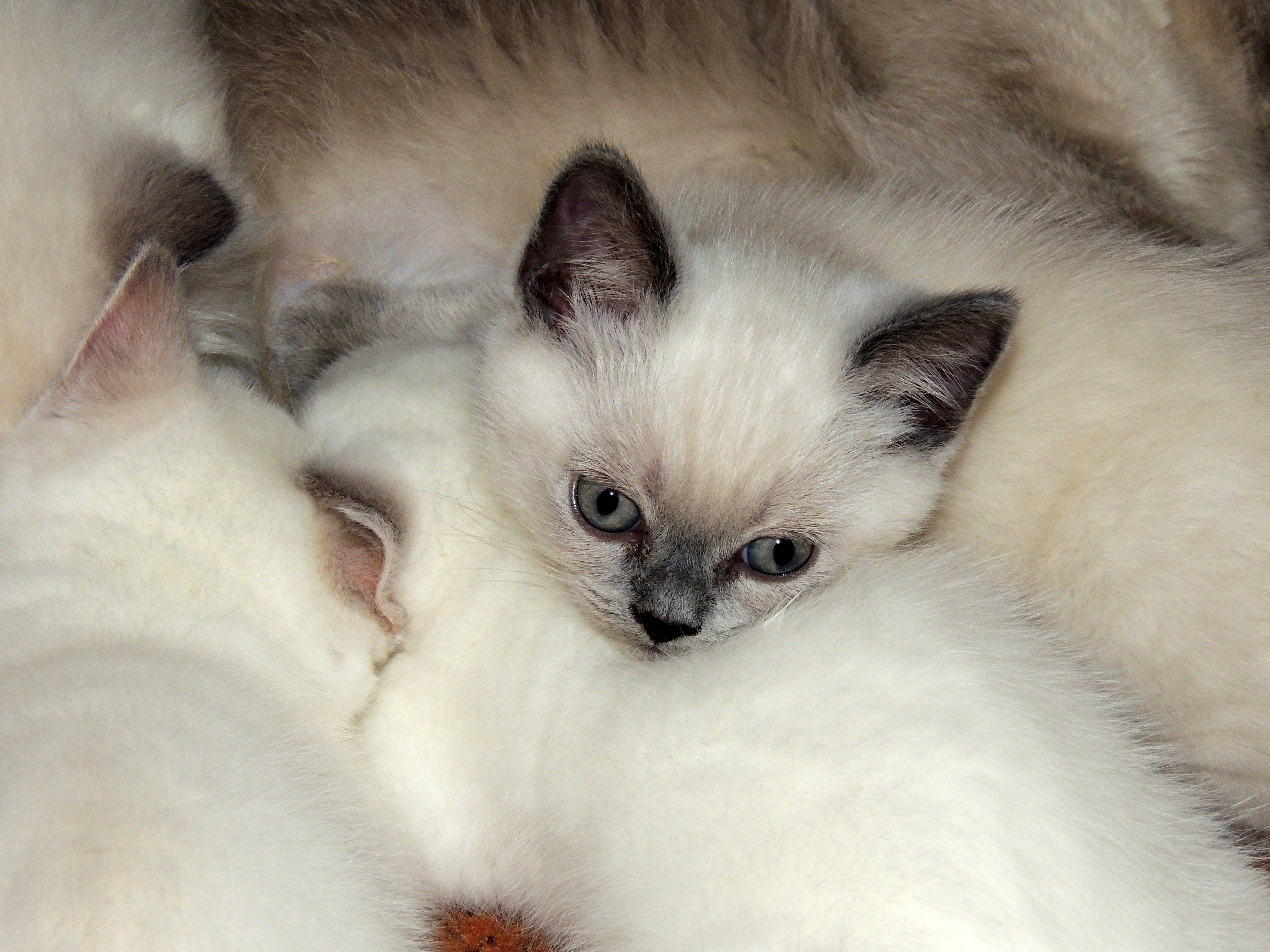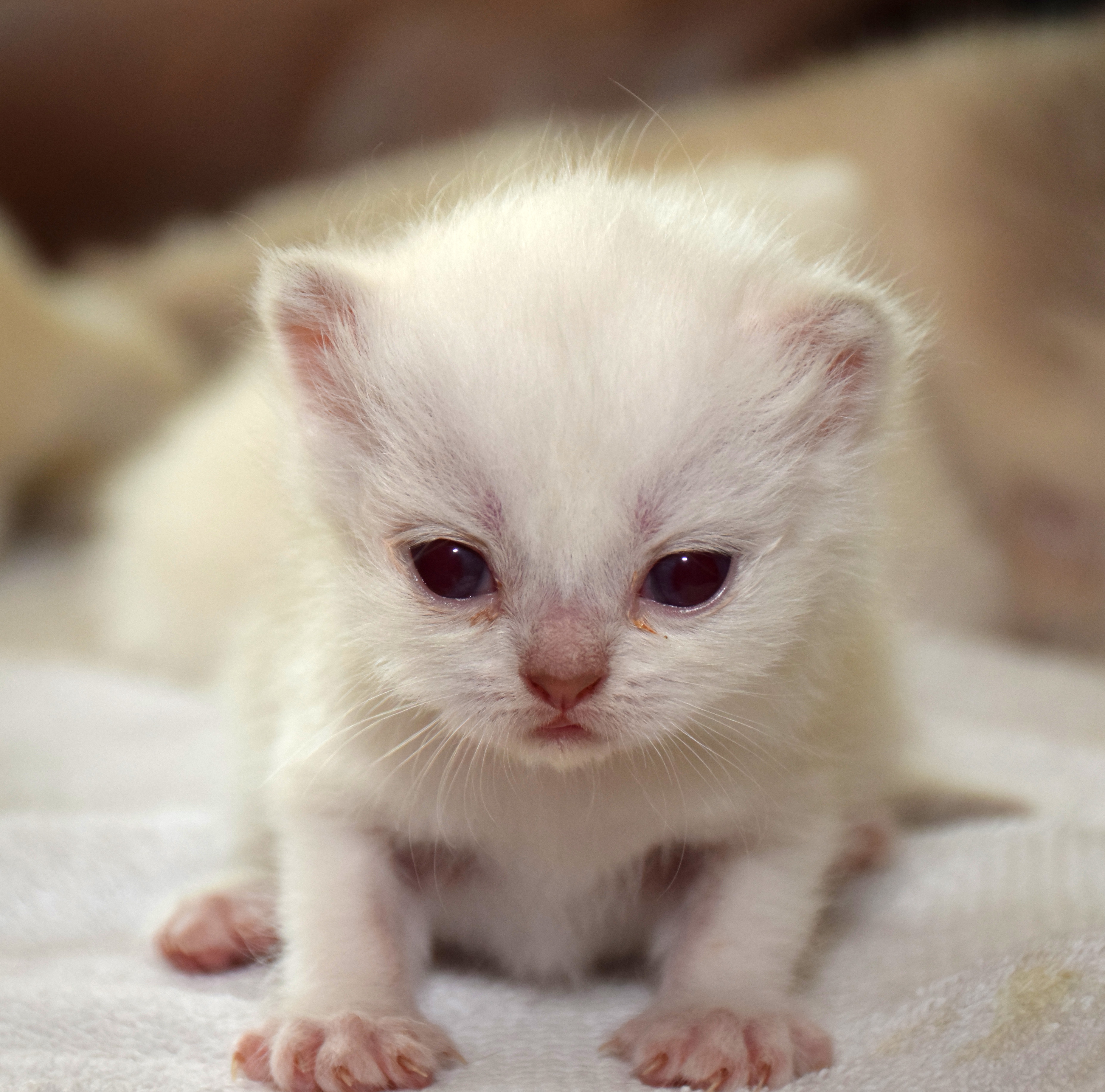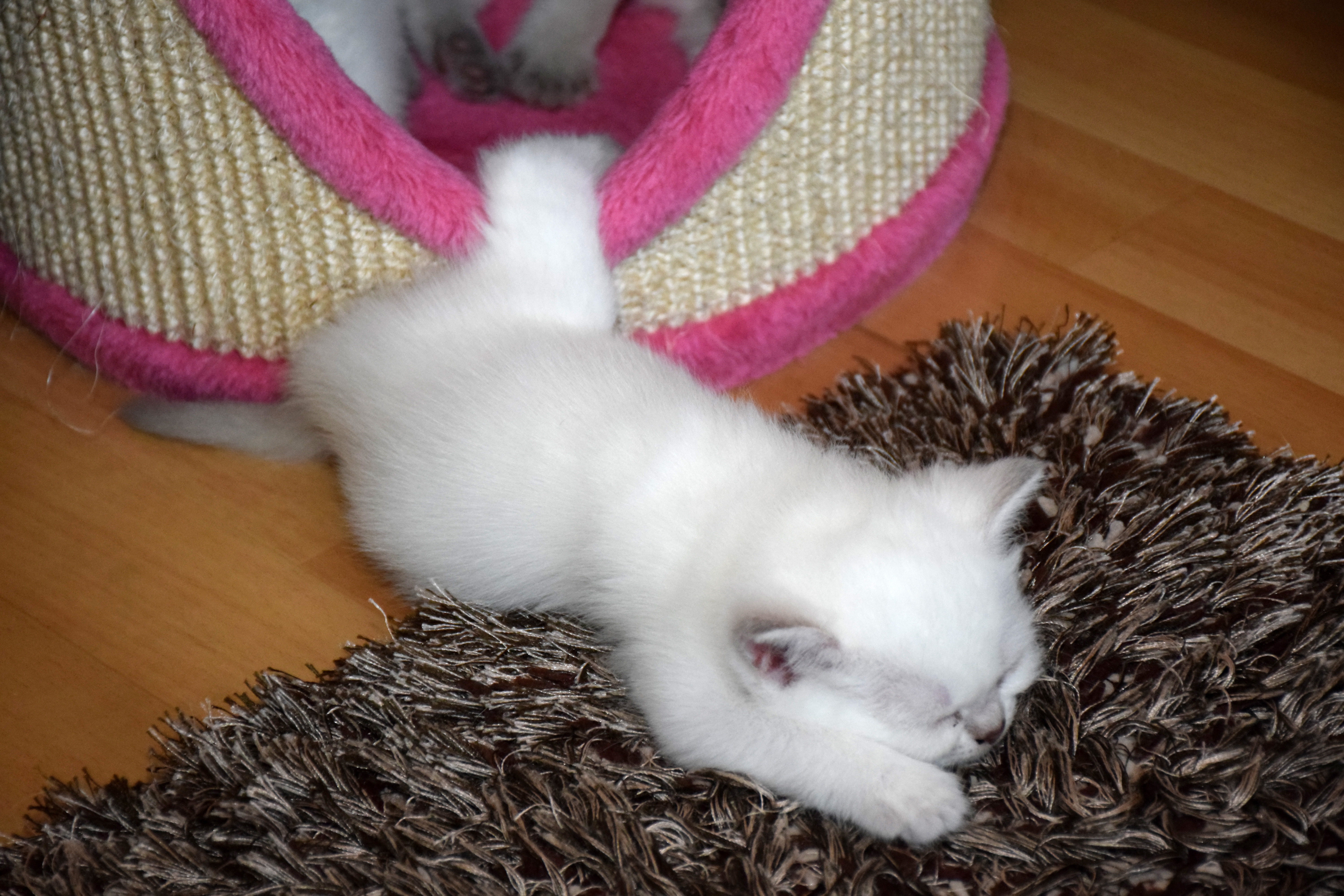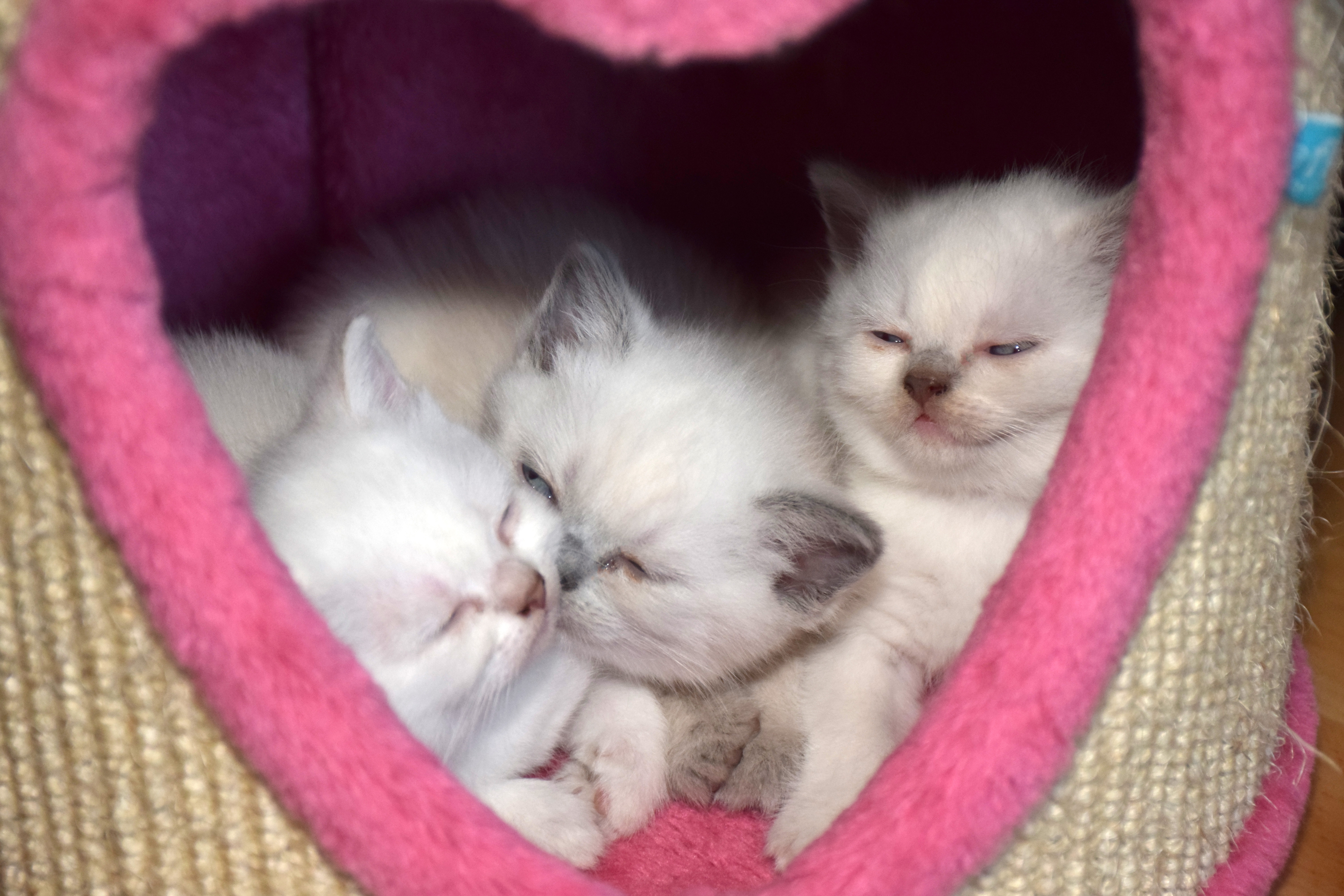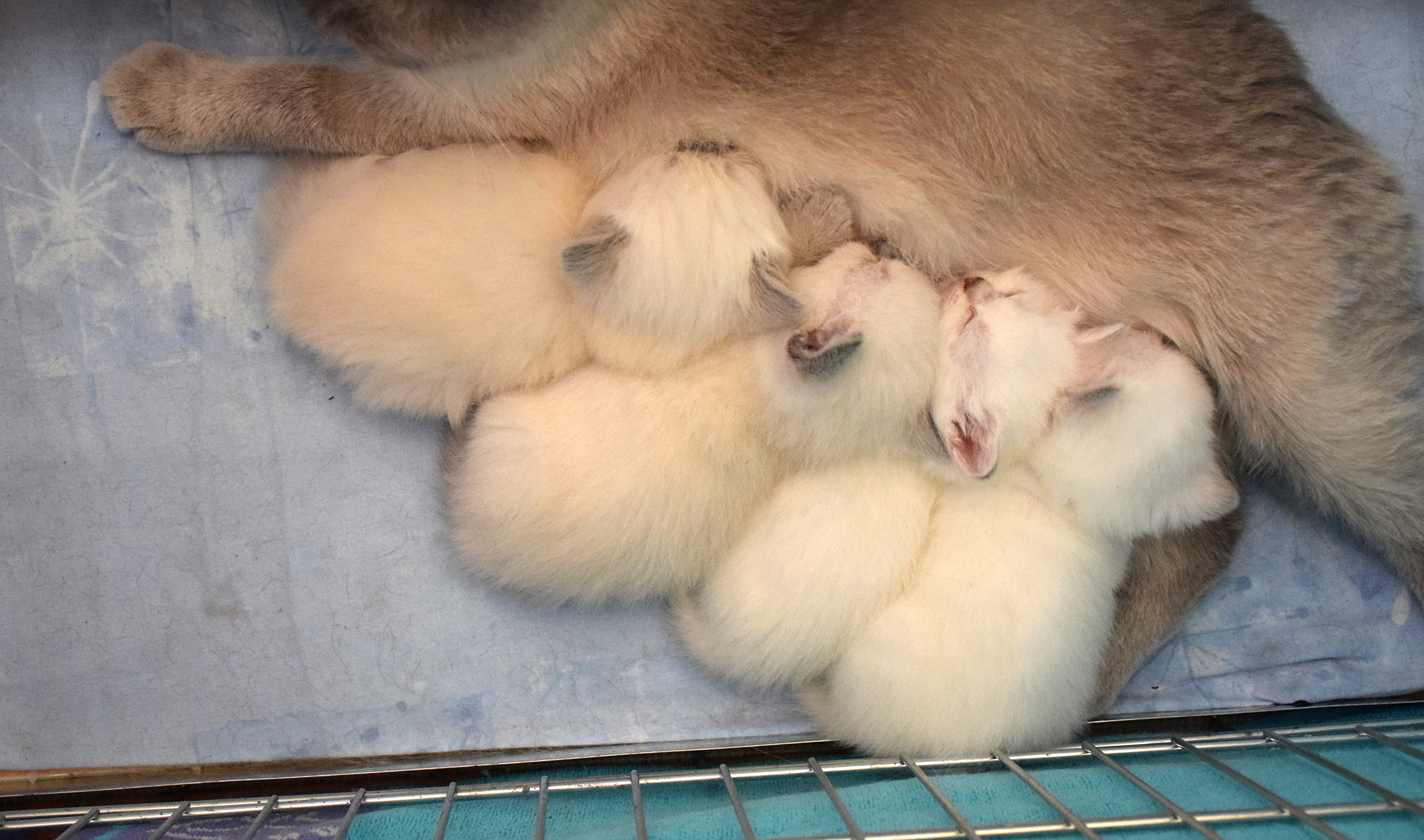 Na de moeizame start gaat het langzaamaan beter. Het duurt een paar dagen voordat Mili haar zorgplicht helemaal op zich neemt. Als gevolg van alle medicatie en de keizersnede heeft ze echt wel tijd nodig om te herstellen. Ze blijft wel goed bij de kleintjes liggen, verzorgd zichzelf ook goed, maar de zorg voor de kittens is wat minder. Geen nood, wij zijn er ook nog en met liefde en plezier nemen wij die zorg op ons: kontjes wassen met name. Je ziet bijna een gelukzalige glimlach op het koppie verschijnen als je ze van hun zware last af helpt… 😉