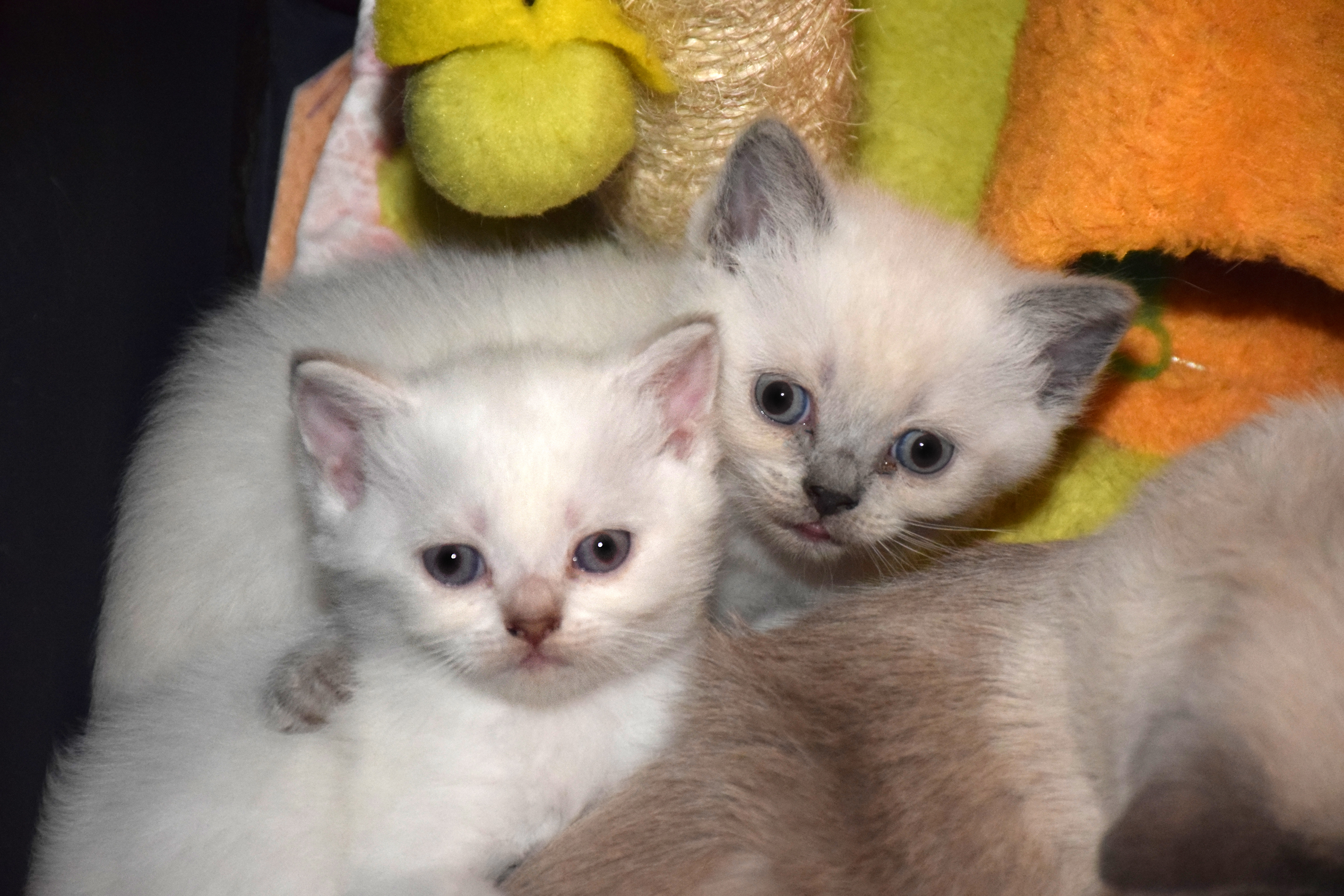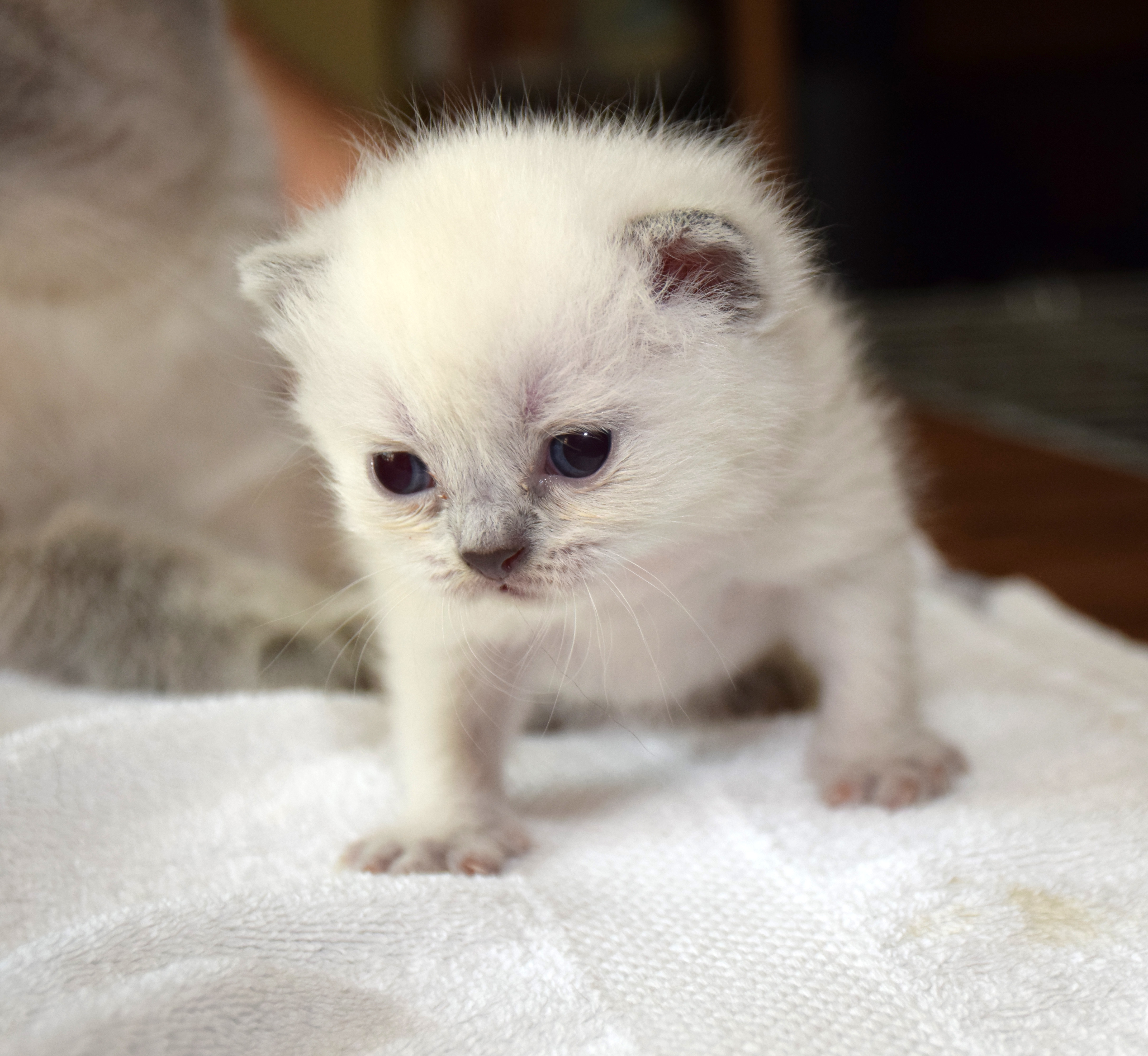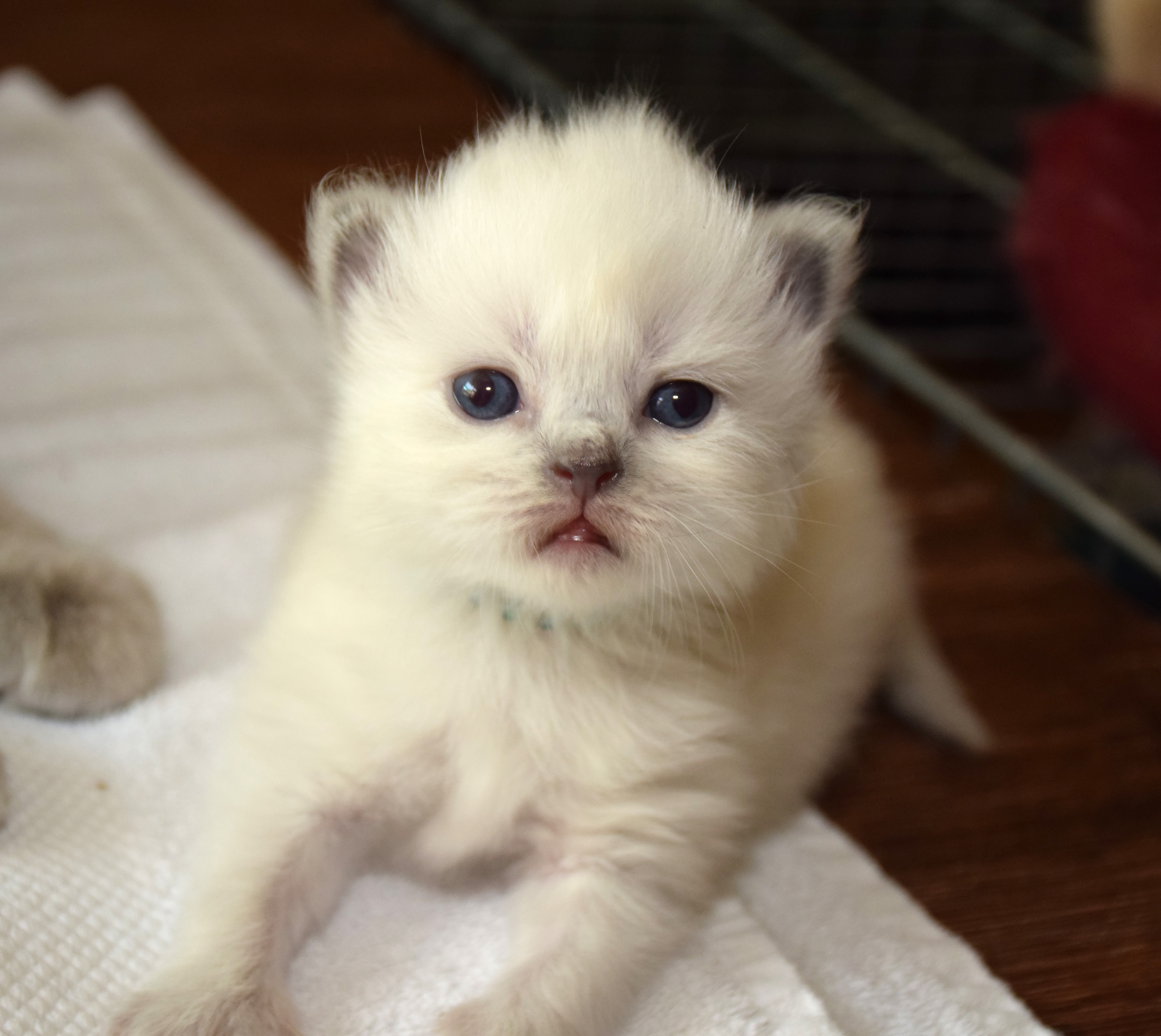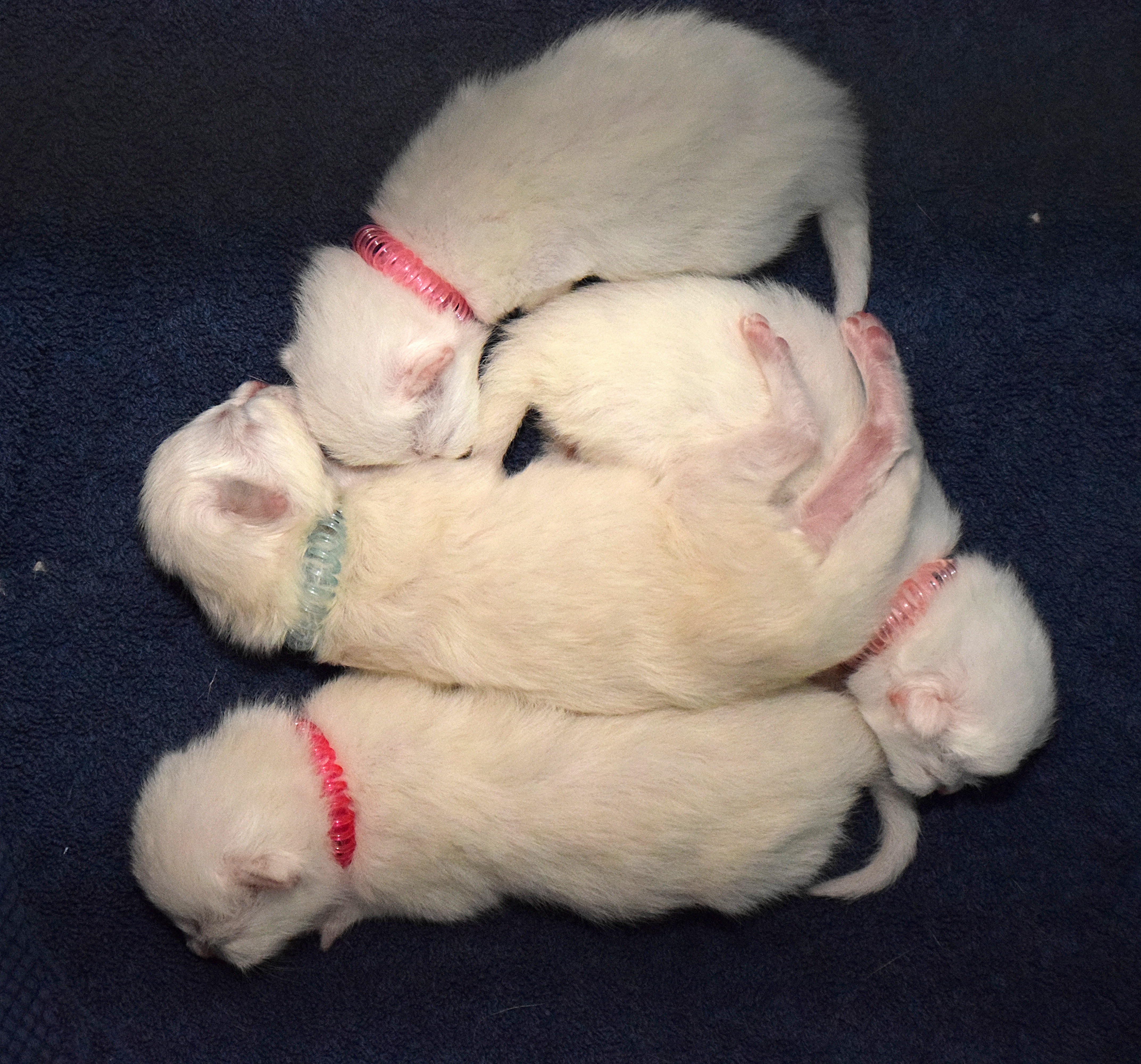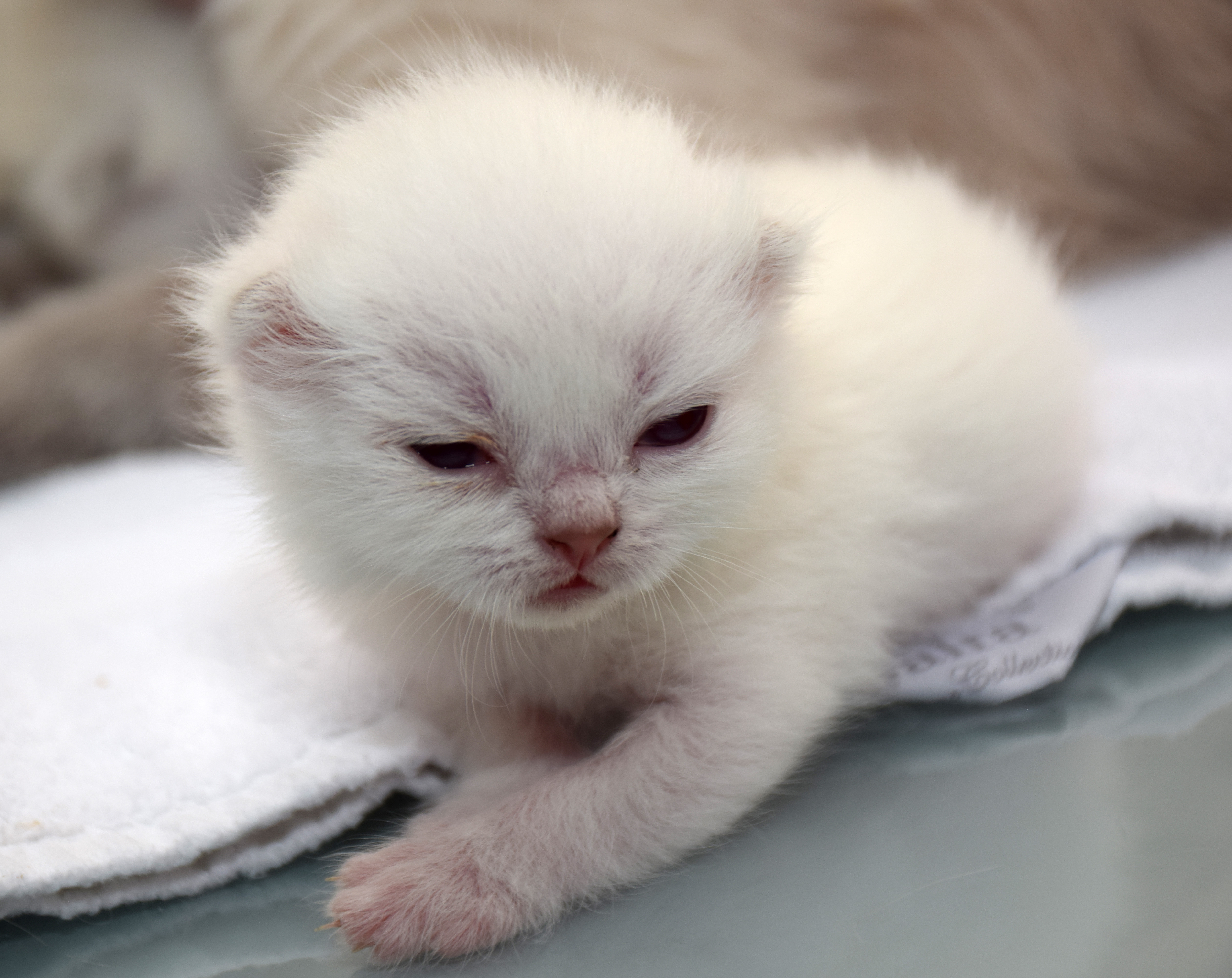 Mylou heeft na haar paar flesjes de draad goed opgepakt, wat zeg ik…. ze gaat als de brandweer!! Wanneer je ook maar in de bench kijkt, zij ligt lekker bij mama te drinken, ook al slapen de anderen. Miley en Myron vinden het nodig om dezelfde tit te kiezen… waarom?? Er zijn er genoeg! Dit leidt tot menig “kittengevecht”. Aan het eind van de week, ziet Rob dat Miley een vies oogje heeft. Als we dit schoonmaken, omdat we niet zeker weten of het misschien komt omdat ze tegen het kontje van een van de anderen heeft gelegen, zien we dat haar oogje wat dik is en opengaat. Oei… dit vertrouwen we niet, dus brengen we een bezoek aan de dierenarts. Na controle en een tube antibioticazalf, gaan we hier de dagen erna mee aan de gang. Na de eerste dag ziet het er al een stuk beter uit en in het weekend blijft het oogje open en schoon. Dat ze er toch wel wat last van had, zien we aan het gewicht. Ze groeit iets minder dan de rest.