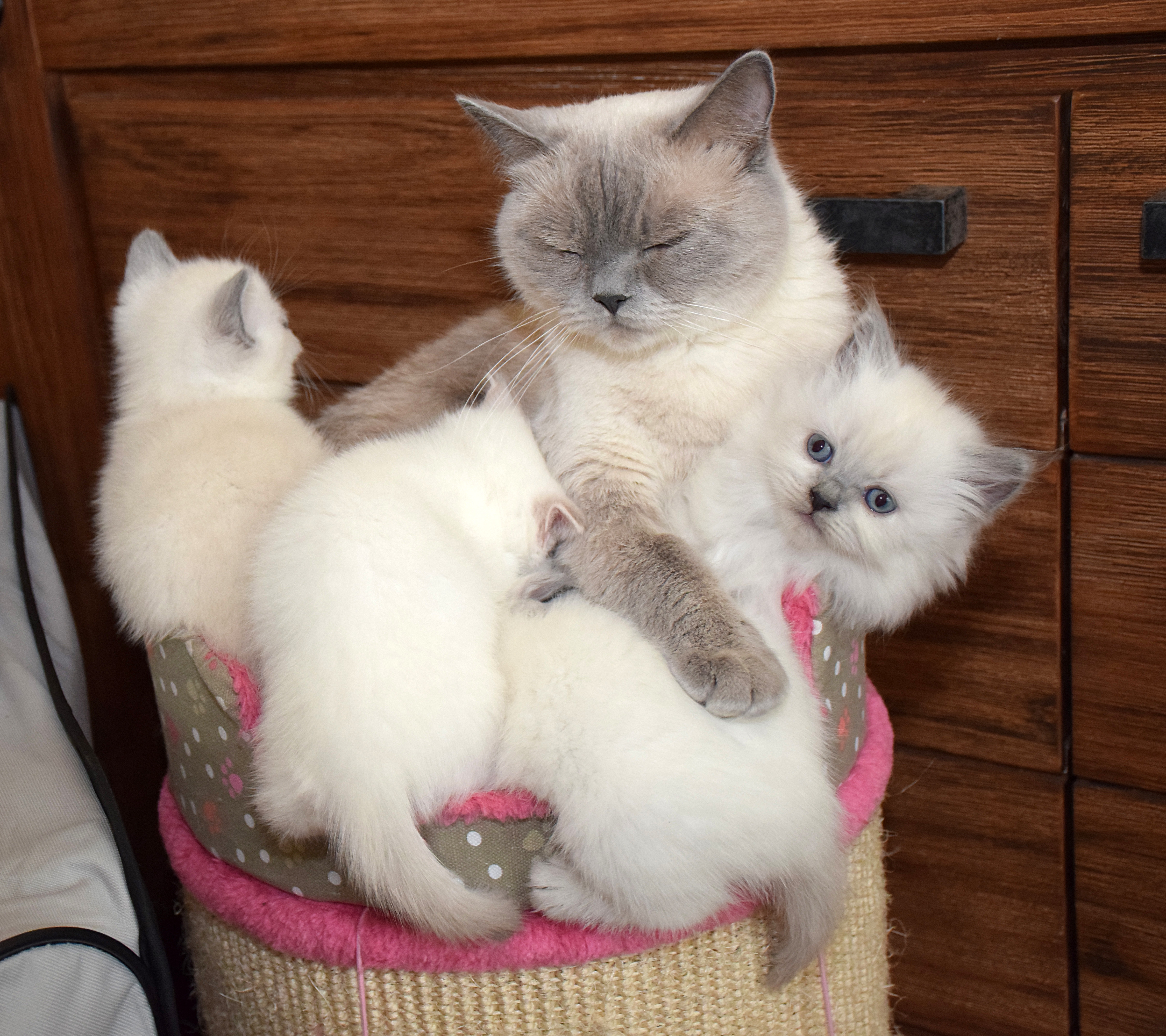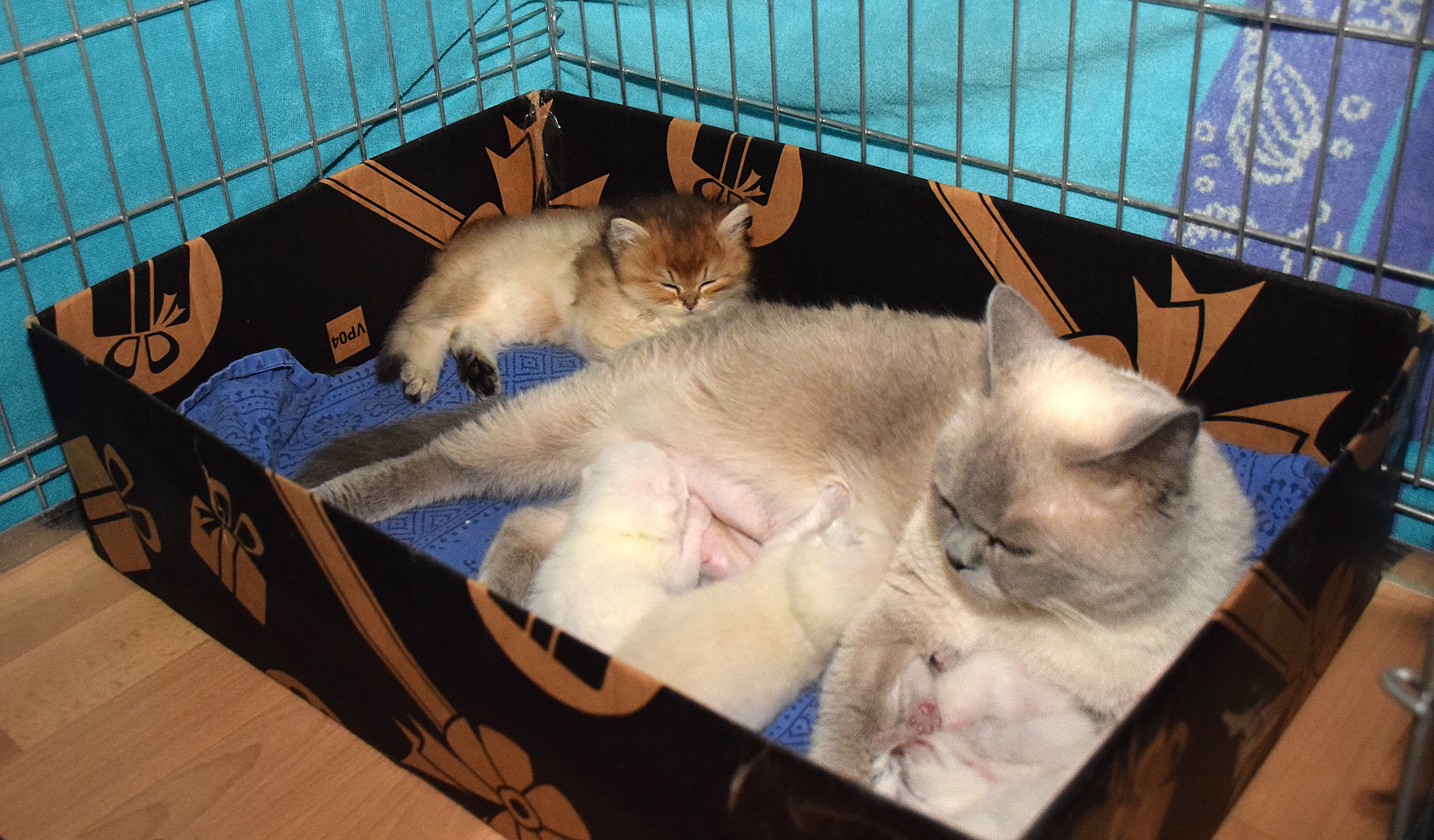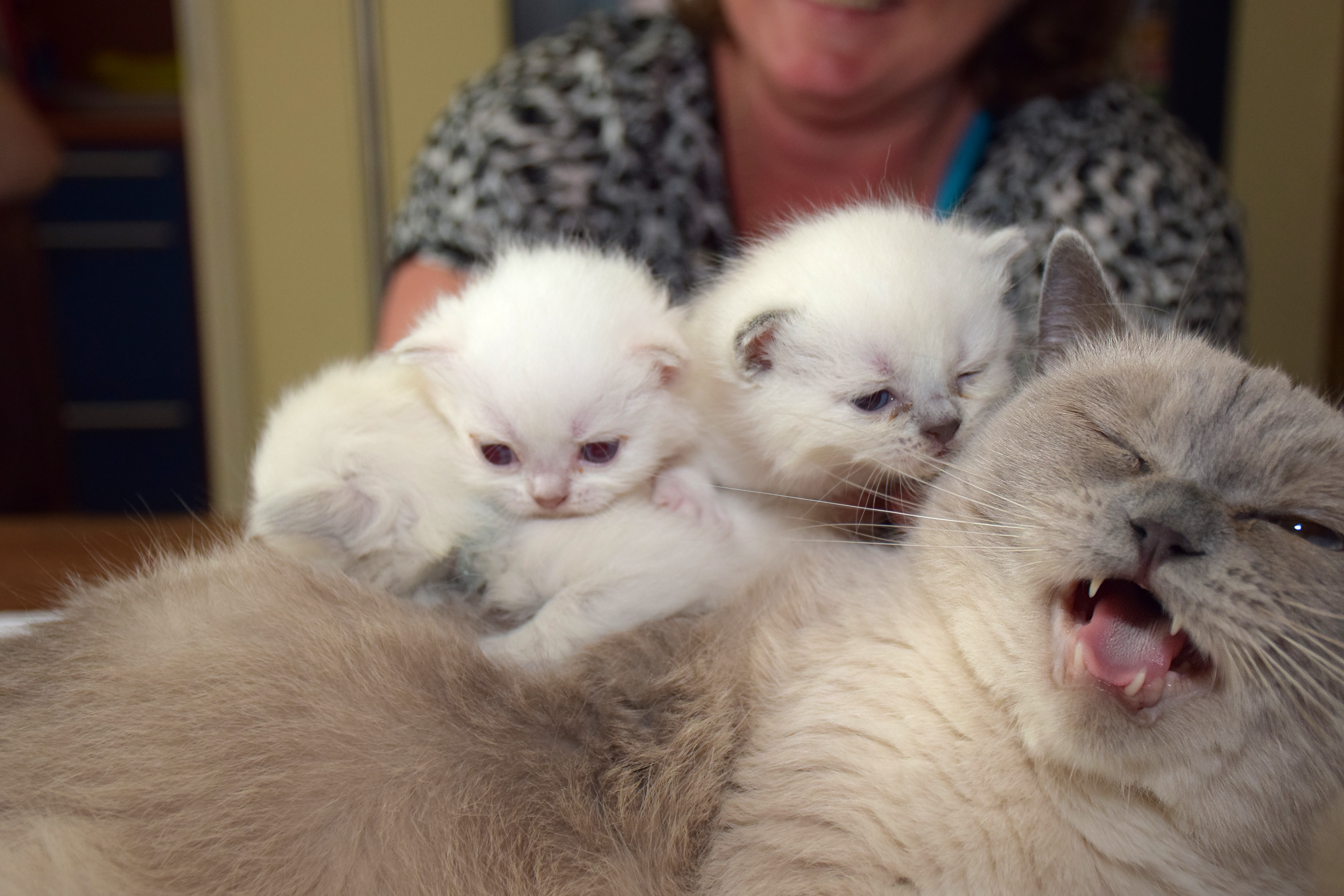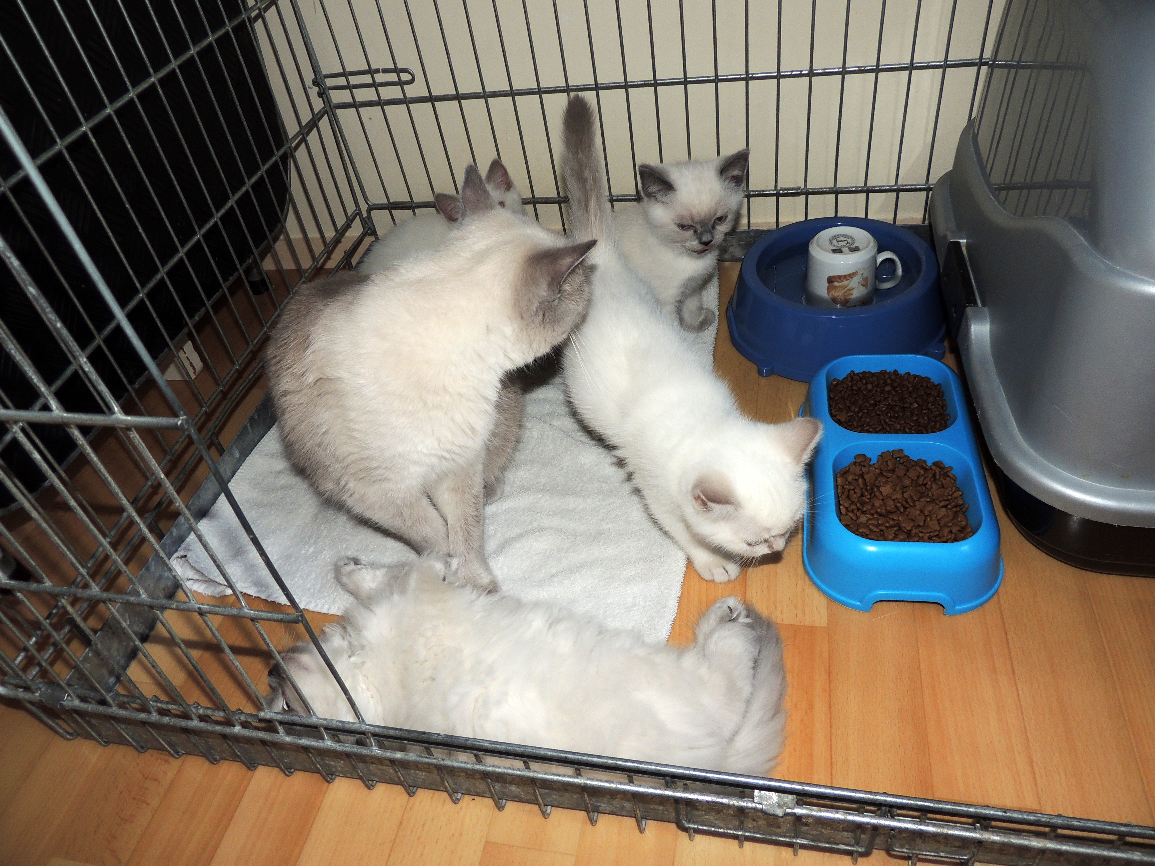 De eerste banksessie is ook geweldig. Was Aislinn in eerste instantie wat terughoudend, de dagen erna ging ze “waken” bij de ingang van de bench, om ervoor te zorgen dat Mili goed kon herstellen en tijdens de eerste banksessie, als we ook haar kittens op de bank zetten, komt ze er lekker bijzitten en duurt het niet lang of ze gaat zelfs een kitten van Mili wassen. Mooier kun je het niet krijgen!!