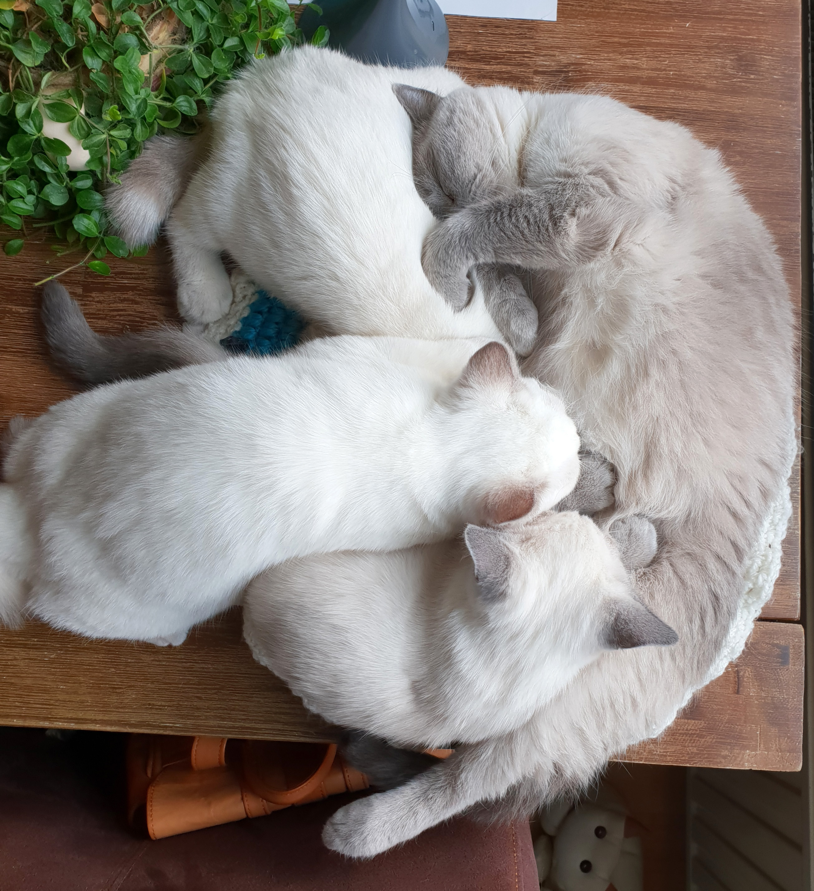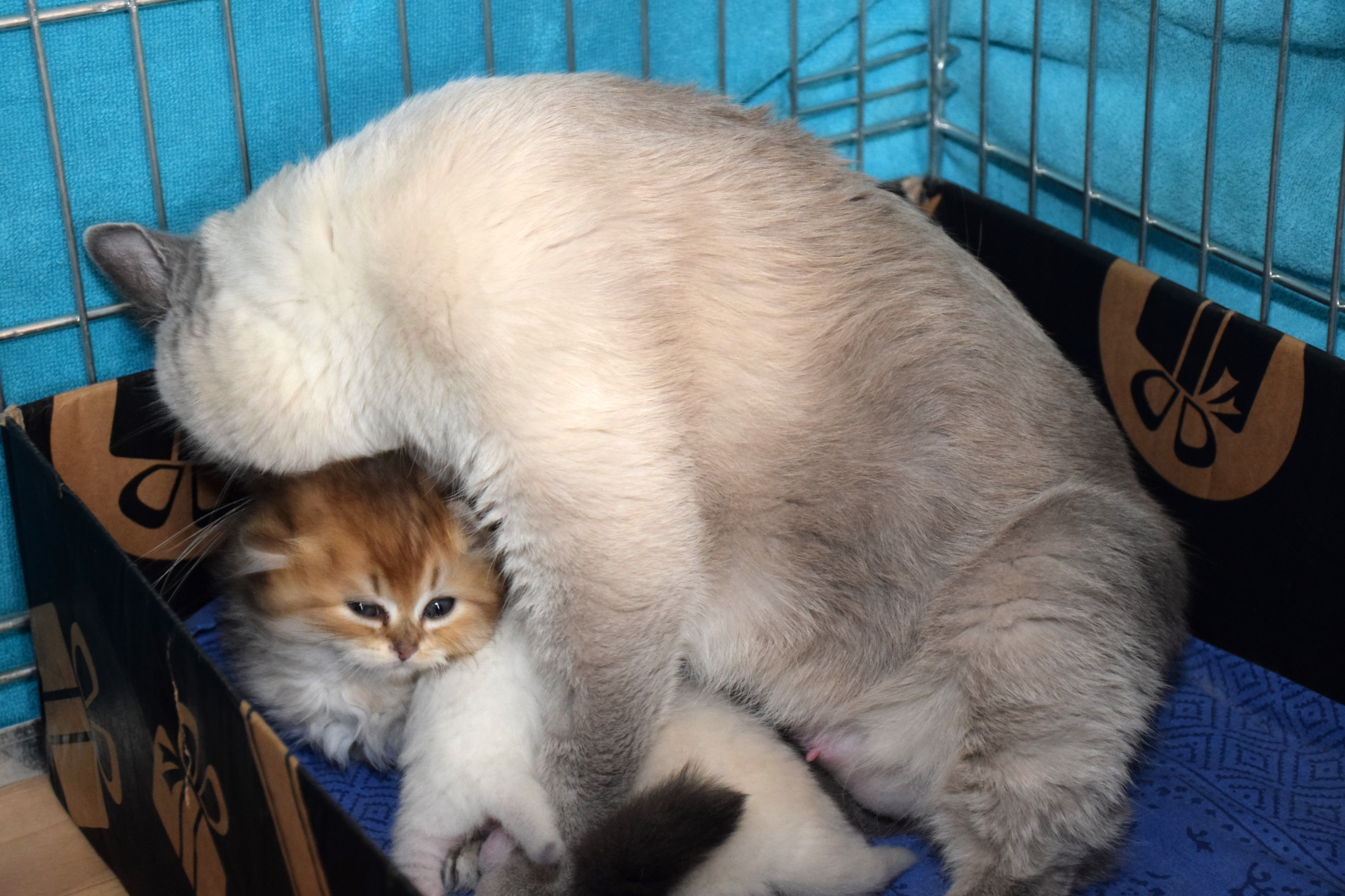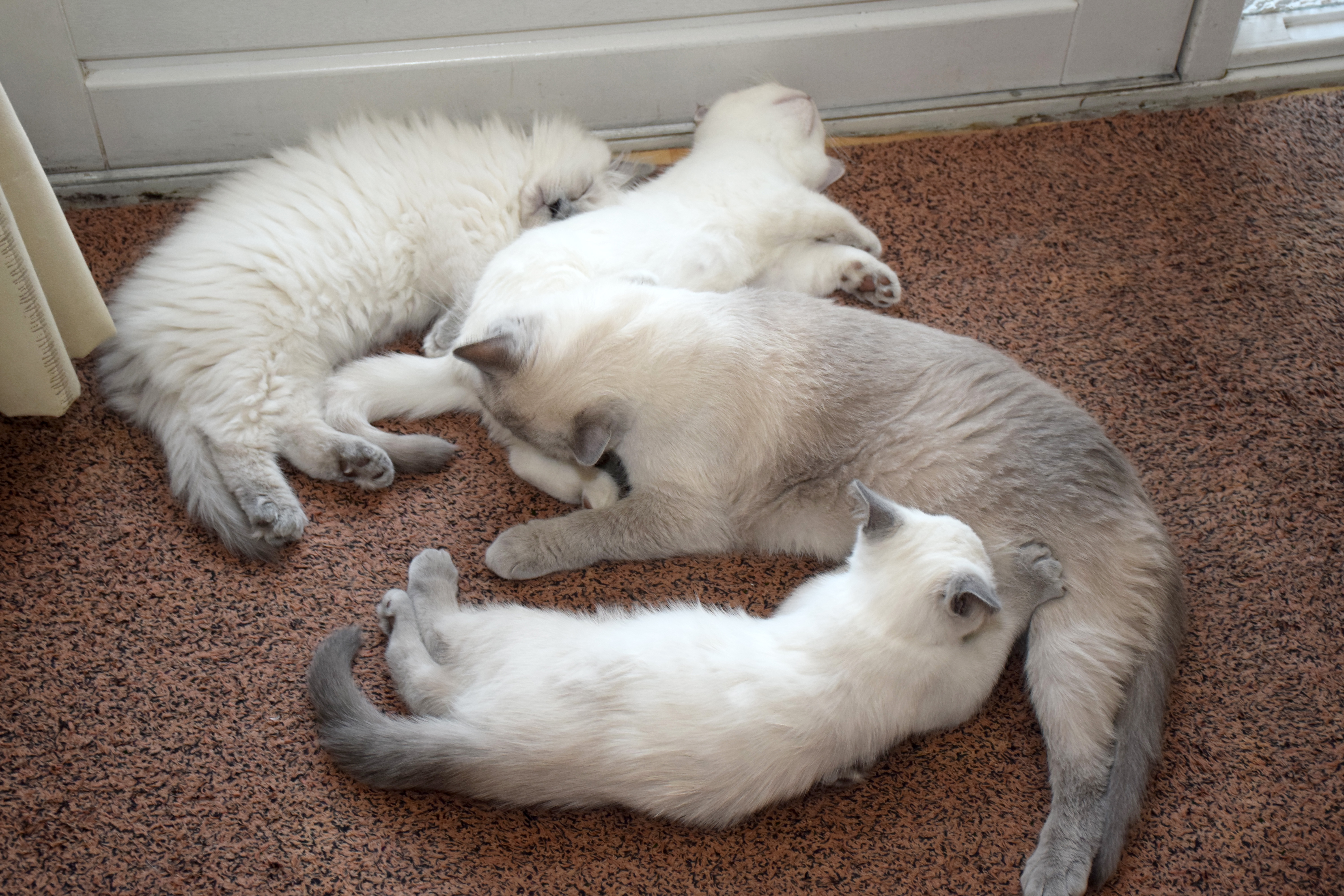 De eerste banksessie is ook geweldig. Was Aislinn in eerste instantie wat terughoudend, de dagen erna ging ze “waken” bij de ingang van de bench, om ervoor te zorgen dat Mili goed kon herstellen en tijdens de eerste banksessie, als we ook haar kittens op de bank zetten, komt ze er lekker bijzitten en duurt het niet lang of ze gaat zelfs een kitten van Mili wassen. Mooier kun je het niet krijgen!!