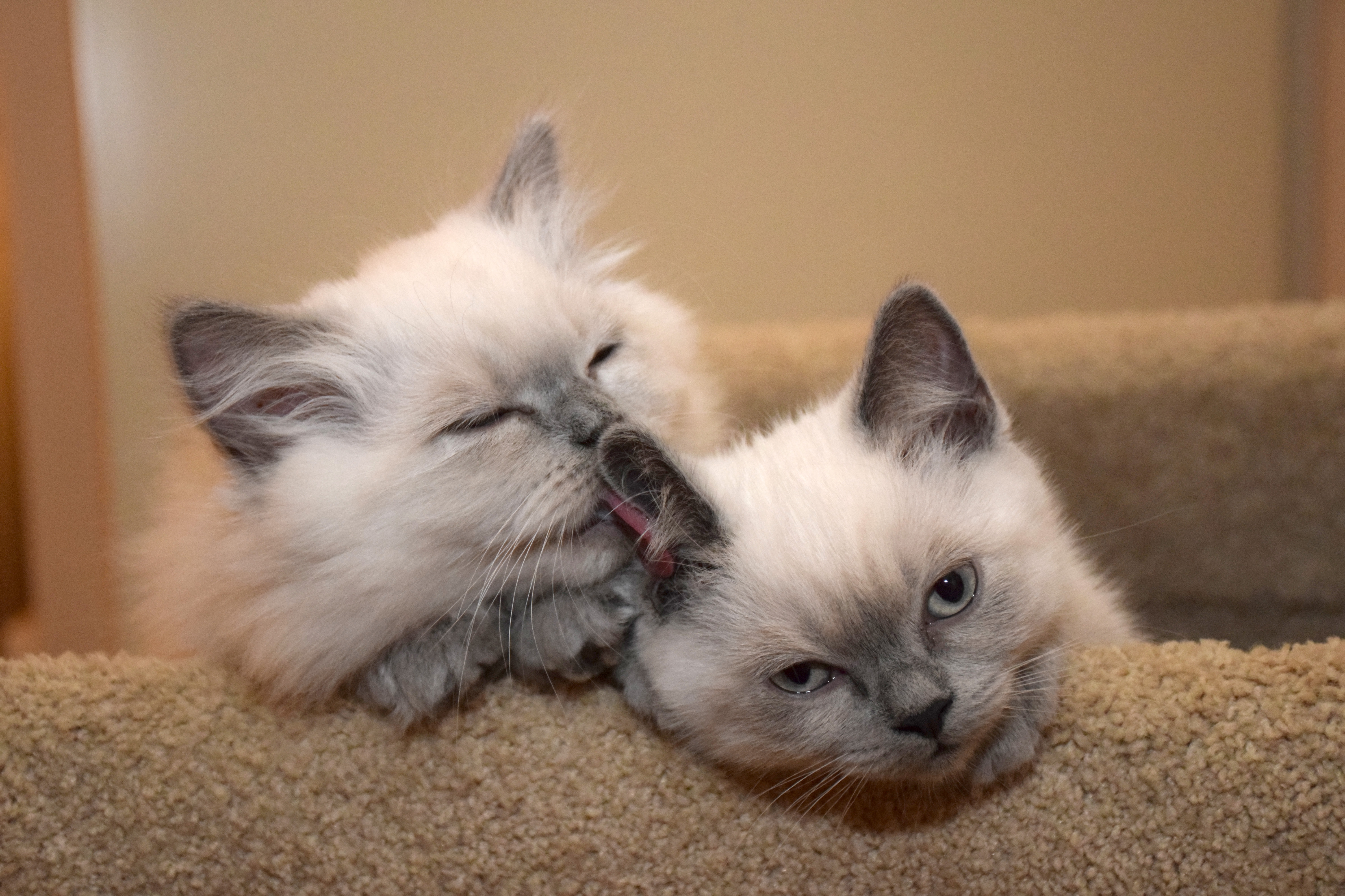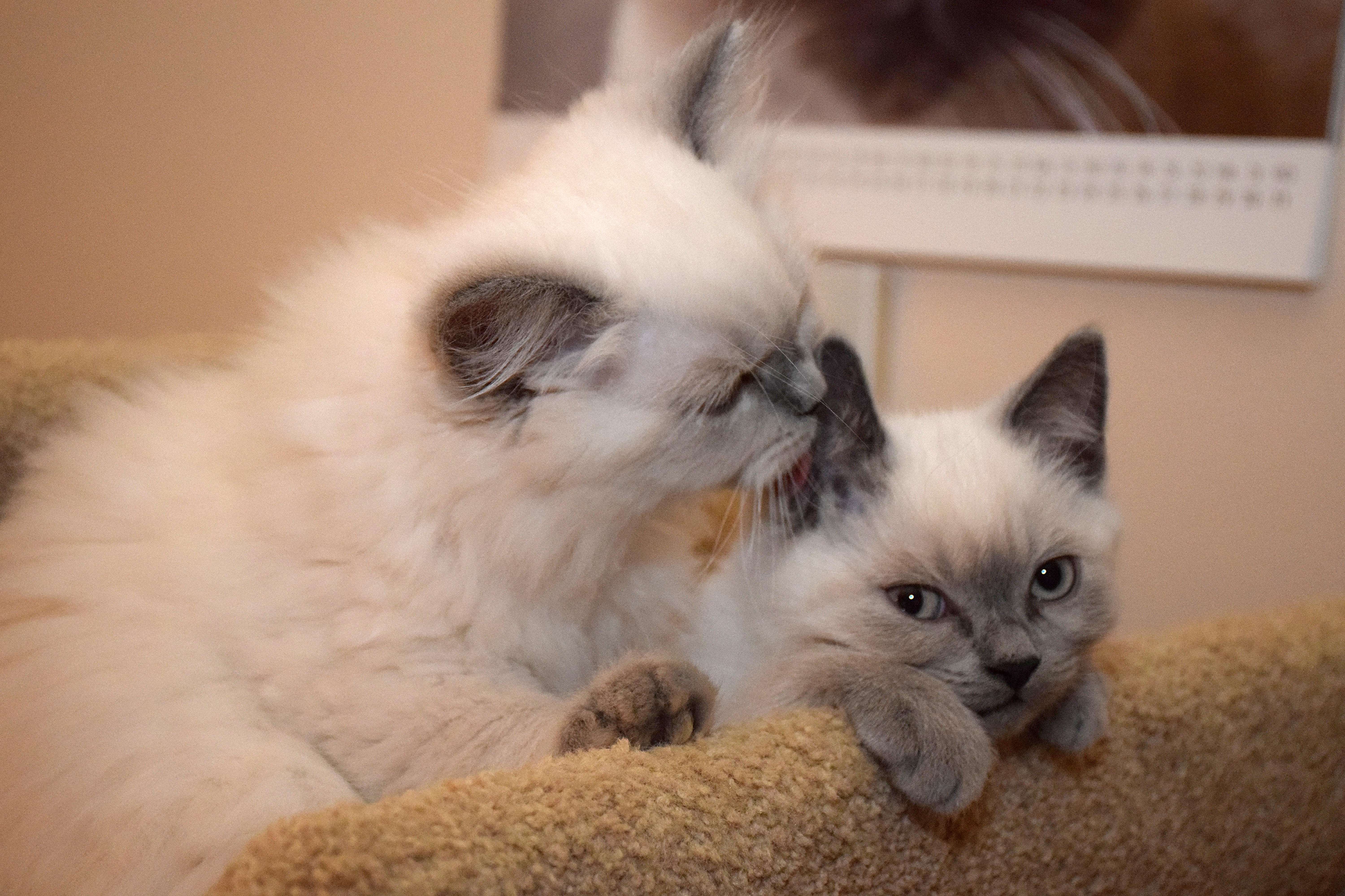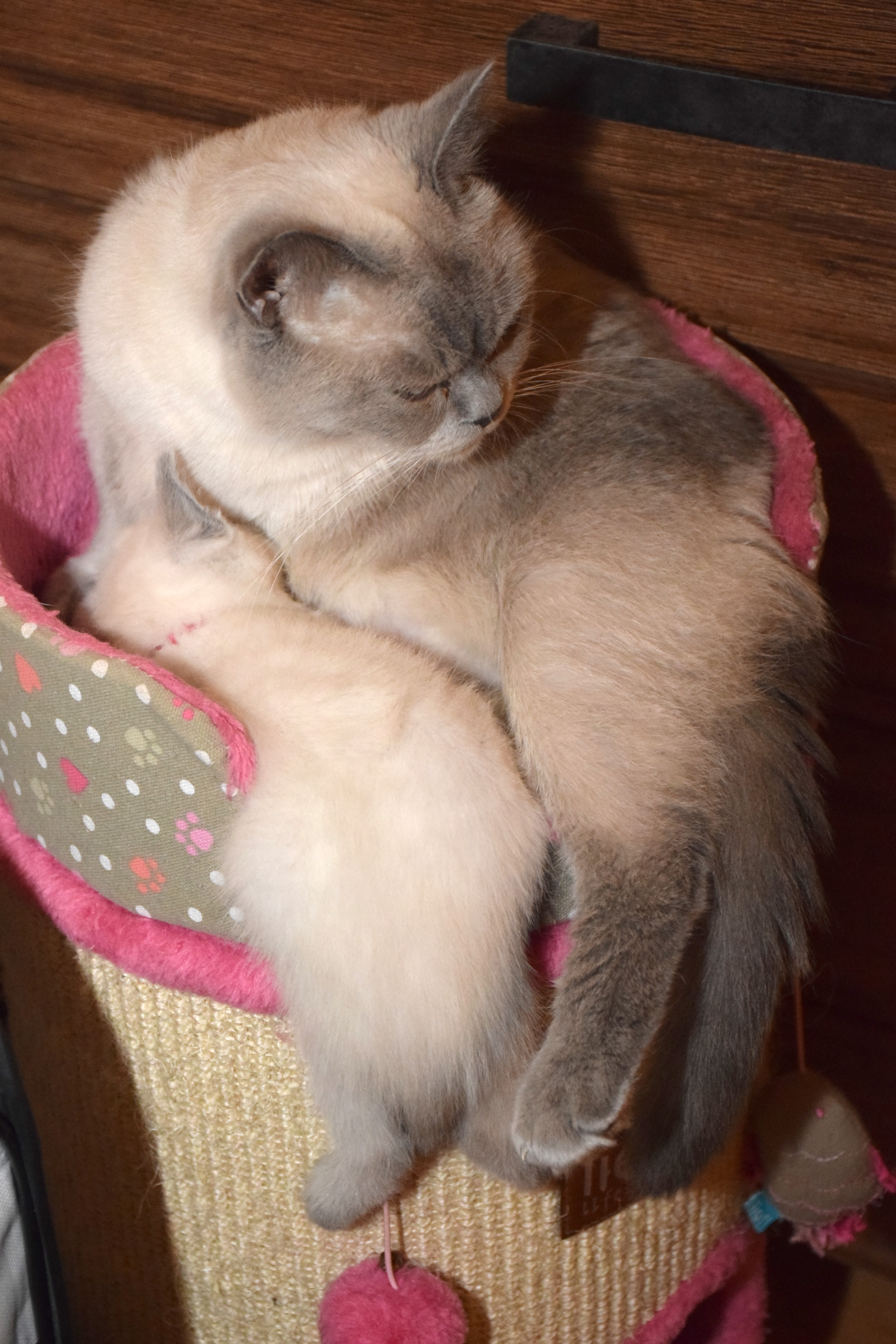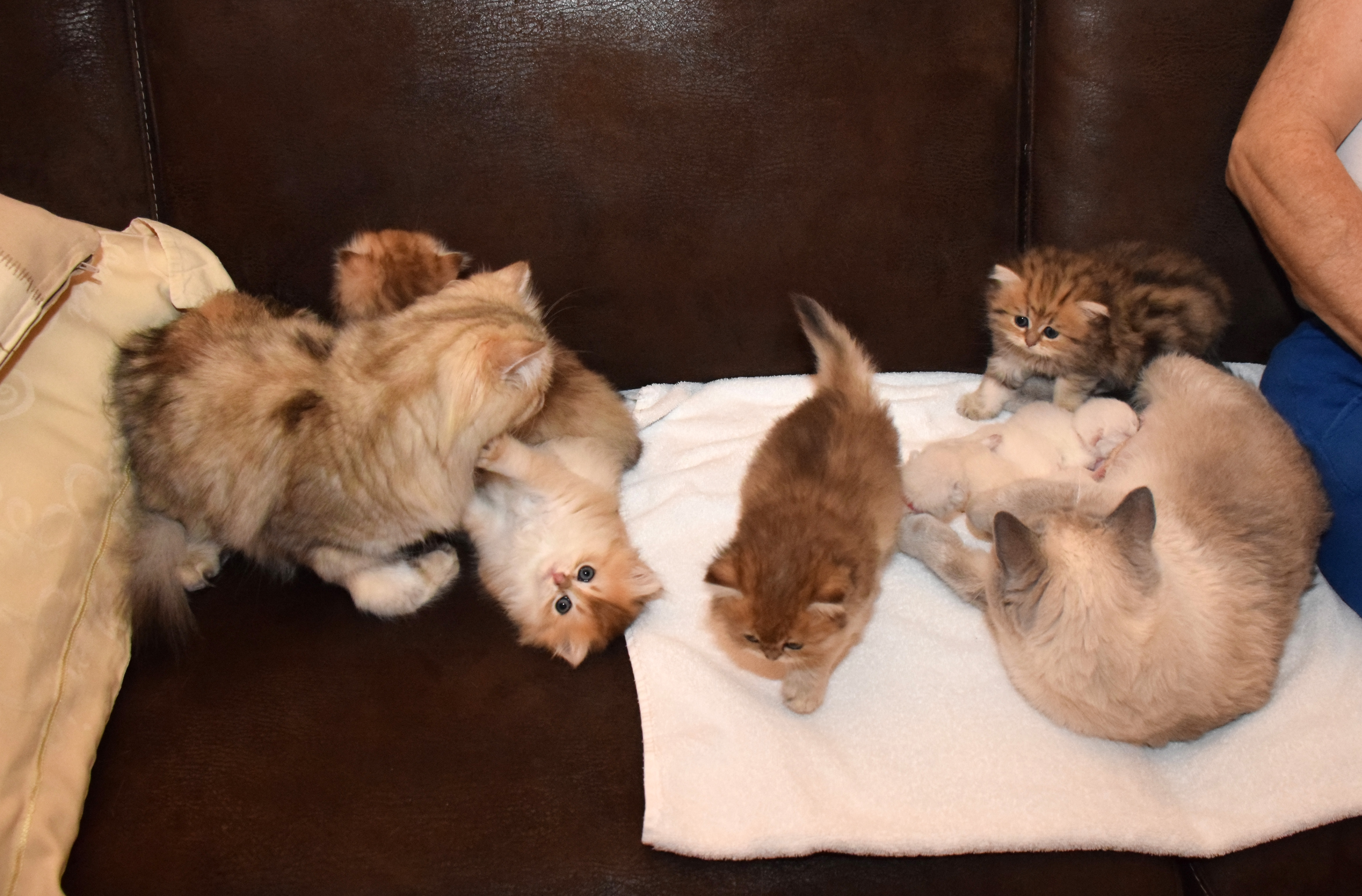De eerste banksessie is ook geweldig. Was Aislinn in eerste instantie wat terughoudend, de dagen erna ging ze “waken” bij de ingang van de bench, om ervoor te zorgen dat Mili goed kon herstellen en tijdens de eerste banksessie, als we ook haar kittens op de bank zetten, komt ze er lekker bijzitten en duurt het niet lang of ze gaat zelfs een kitten van Mili wassen. Mooier kun je het niet krijgen!!