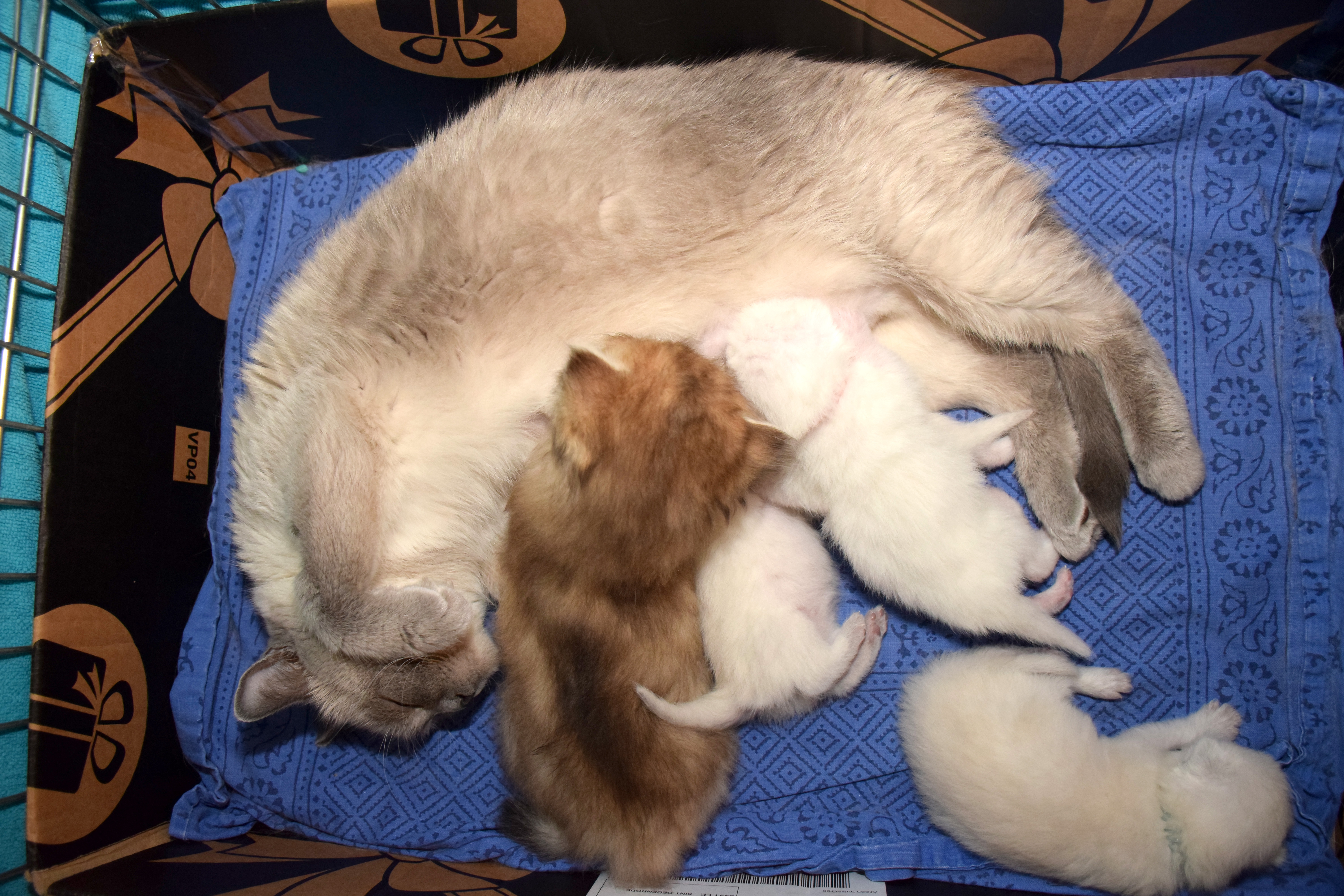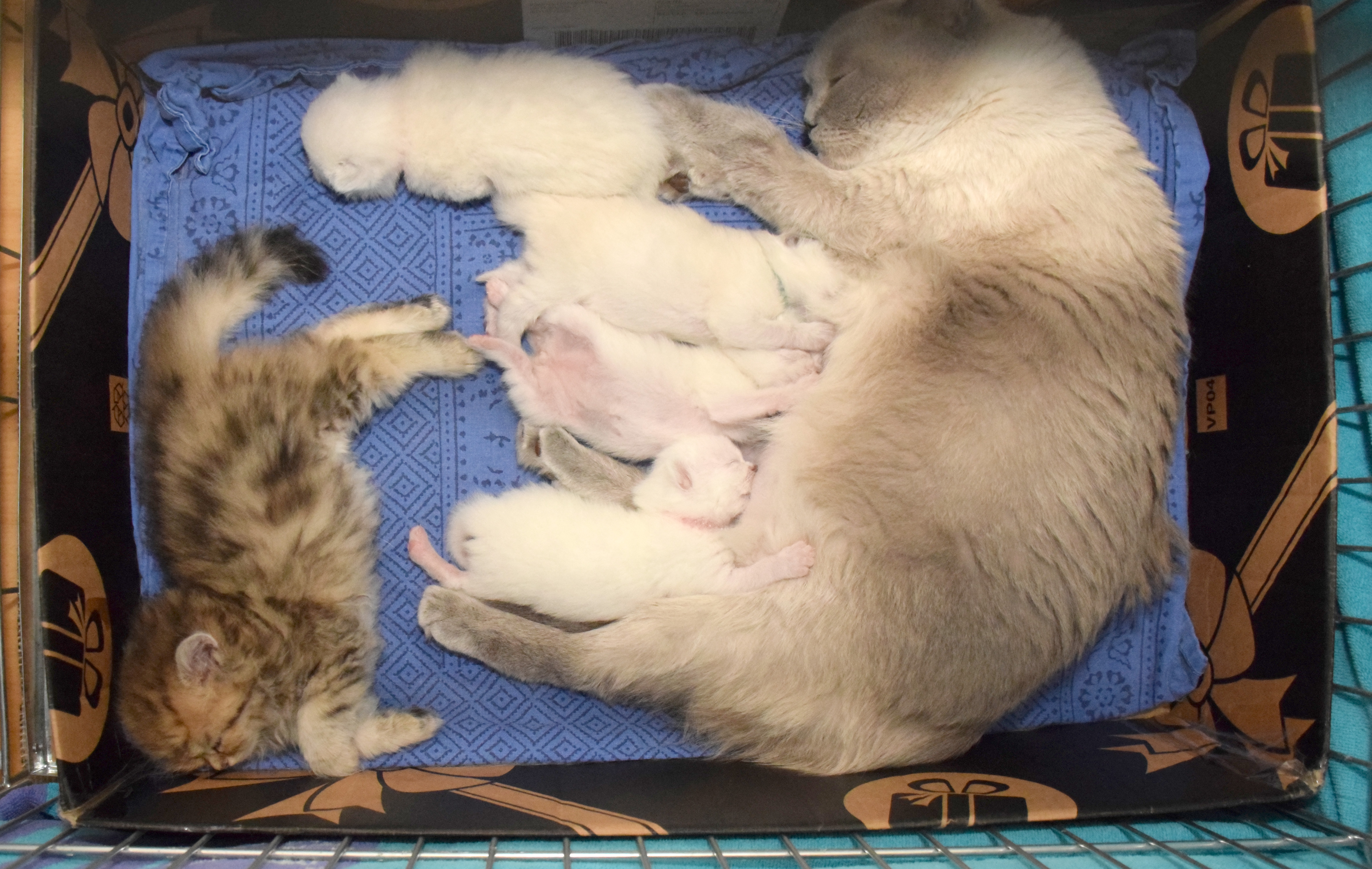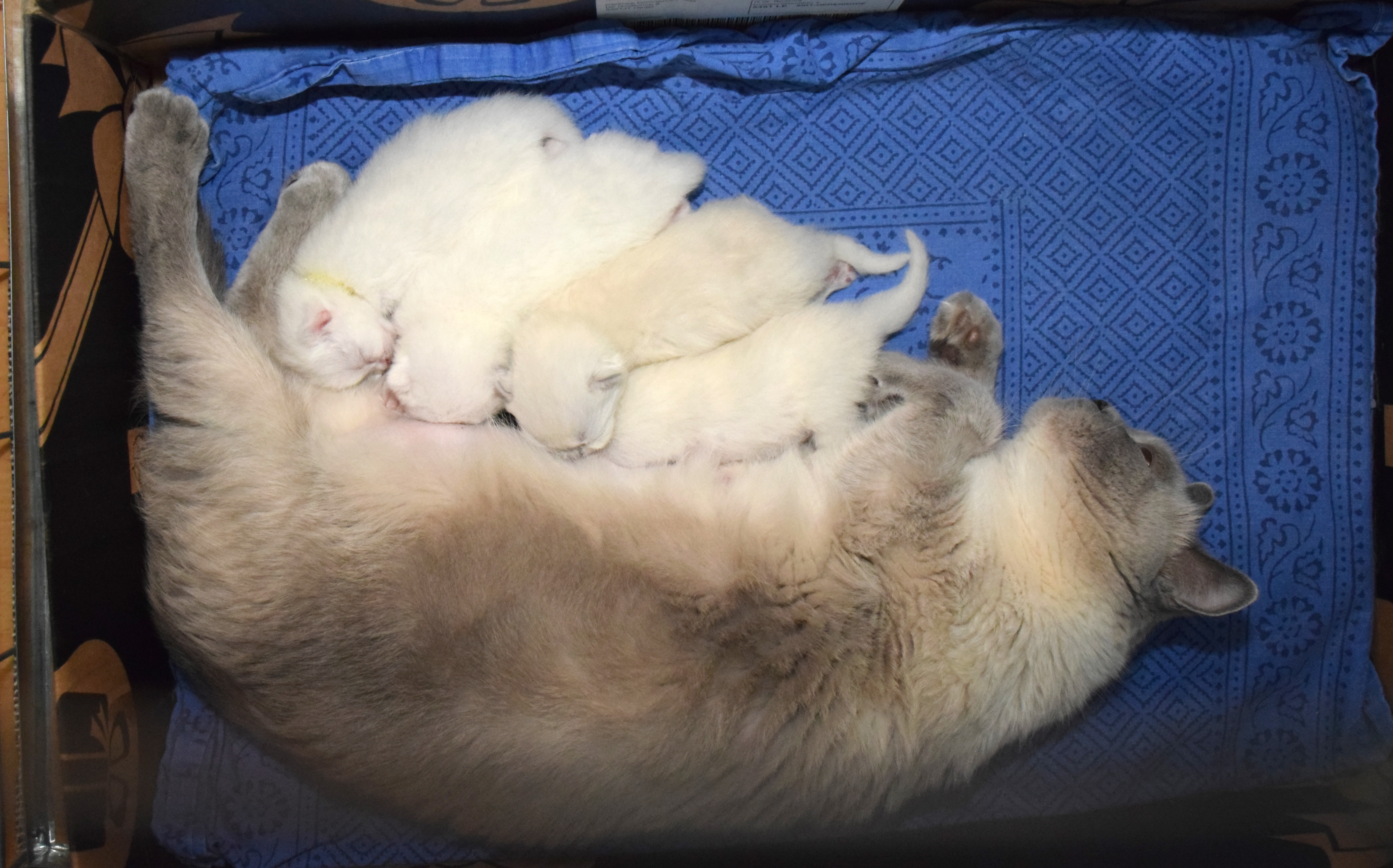Doordat het zolang geduurd heeft en ze zo hard heeft gewerkt, is Mili doodop. Ze is goed bijgebracht, maar kan de aandacht voor haar kleintjes nog niet opbrengen. We leggen haar lekker warm en blijven de hele nacht, om beurten, bij haar. We leggen de kittens aan en houden alles goed in de gaten.