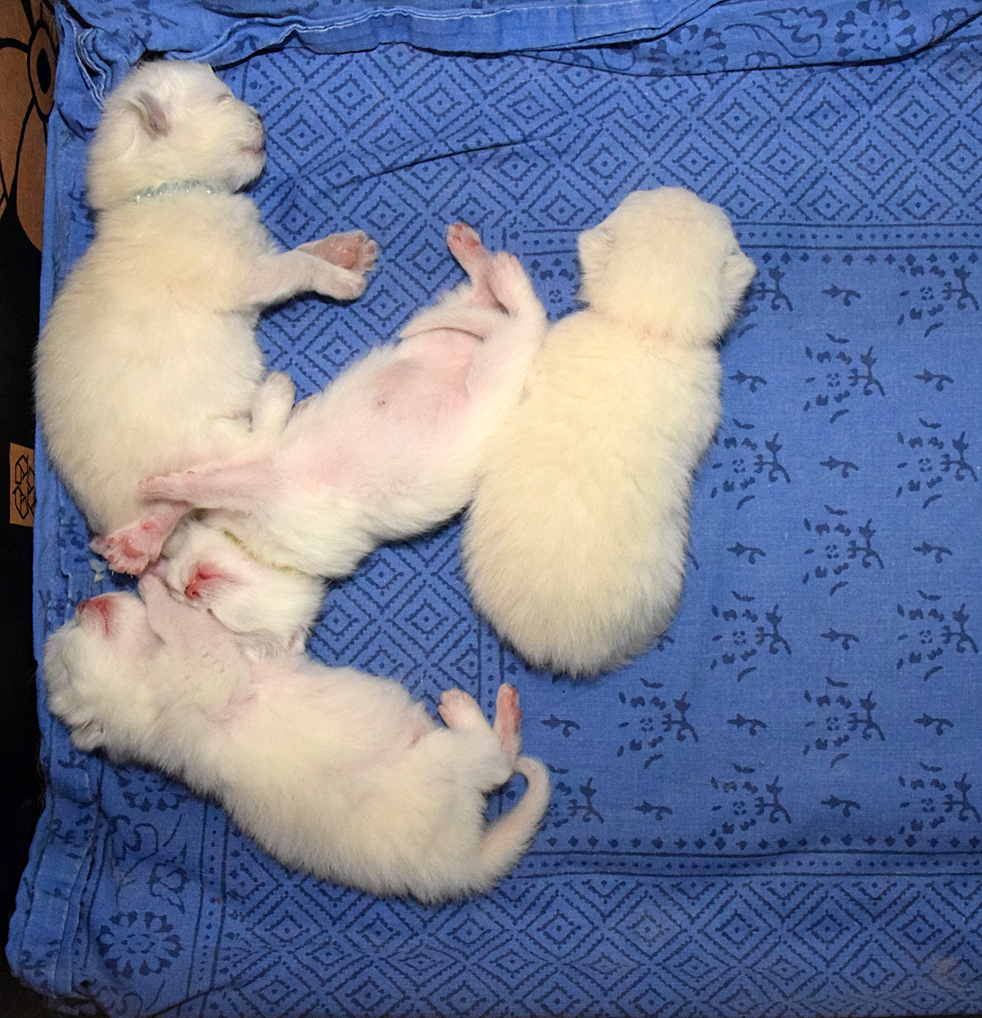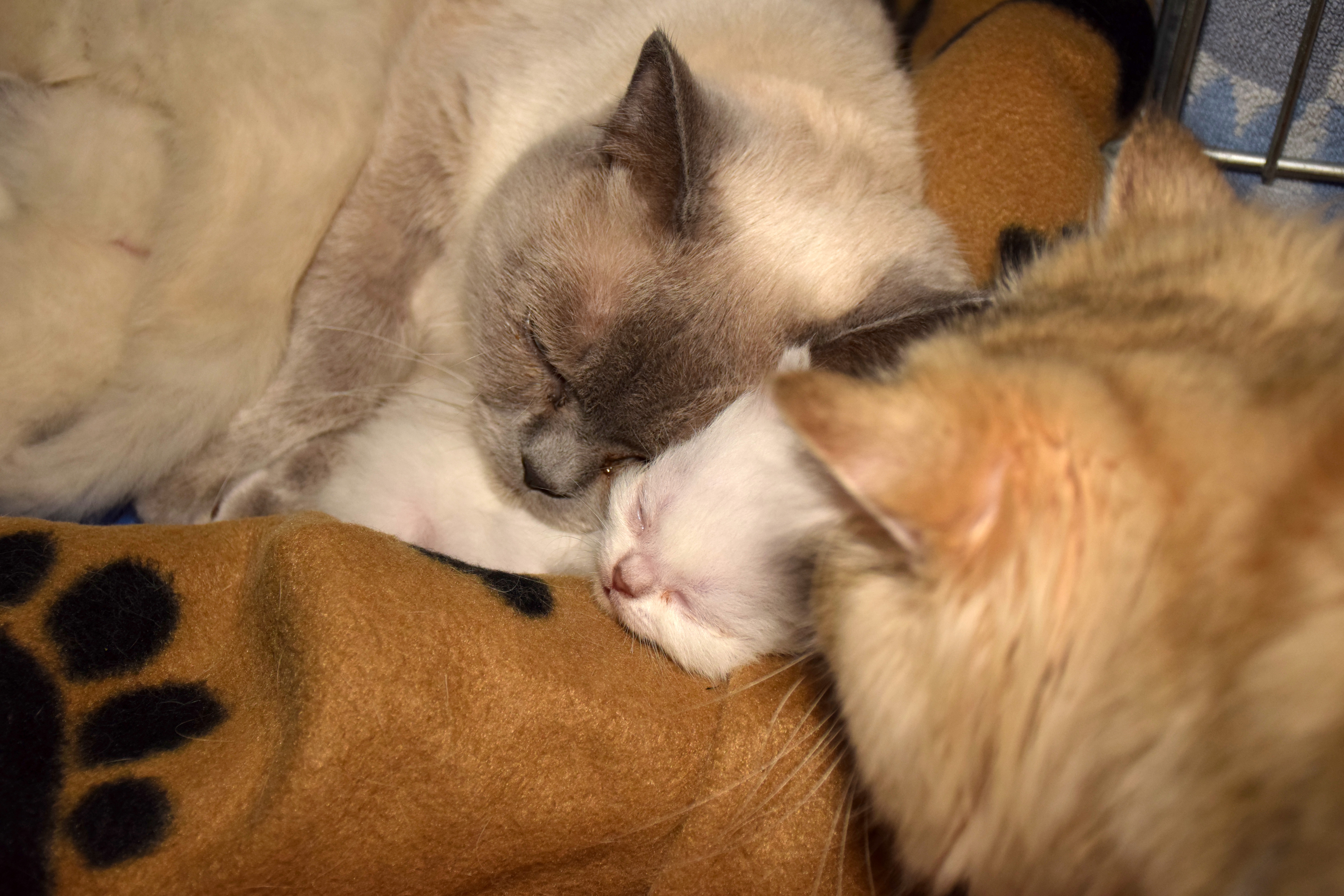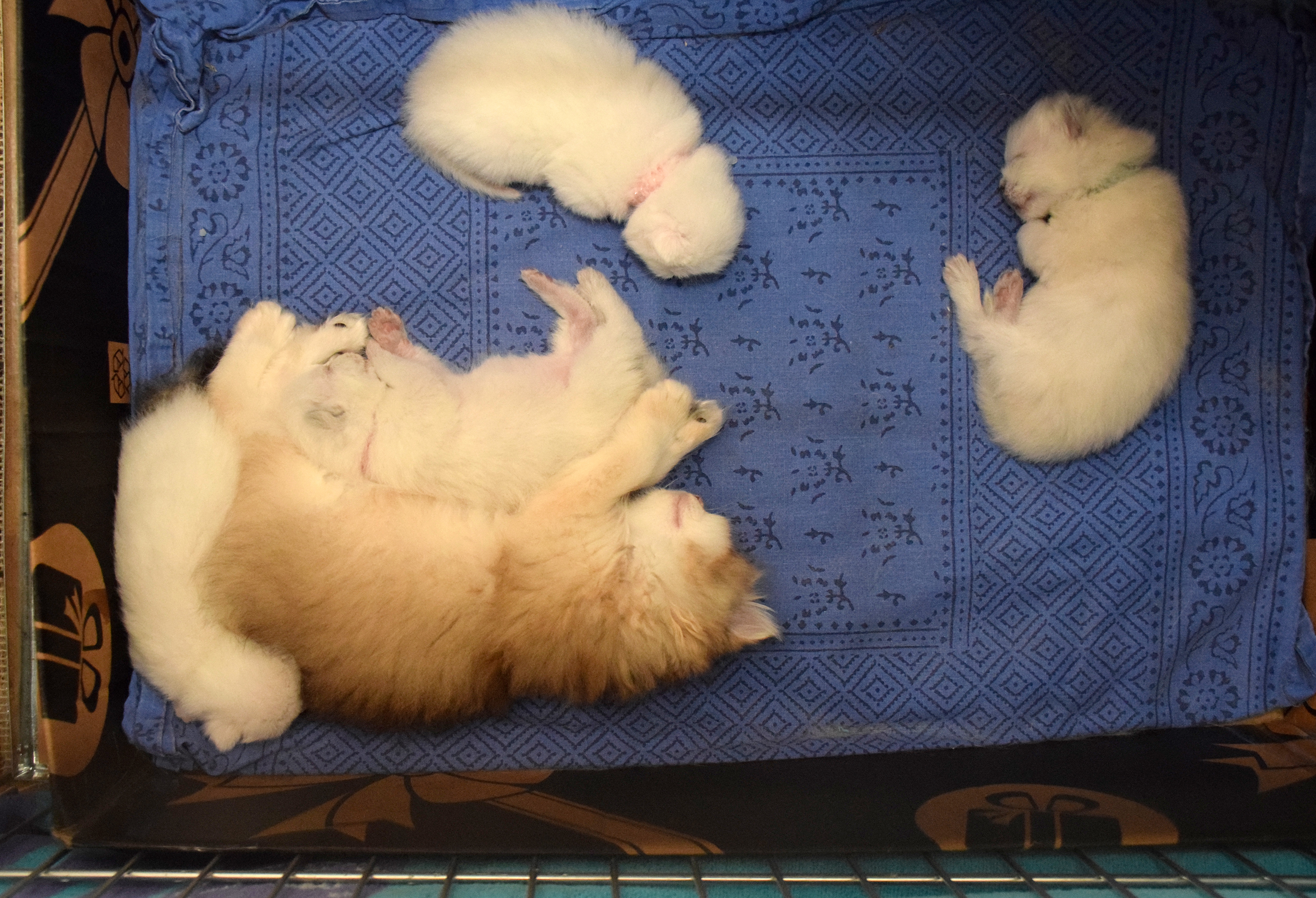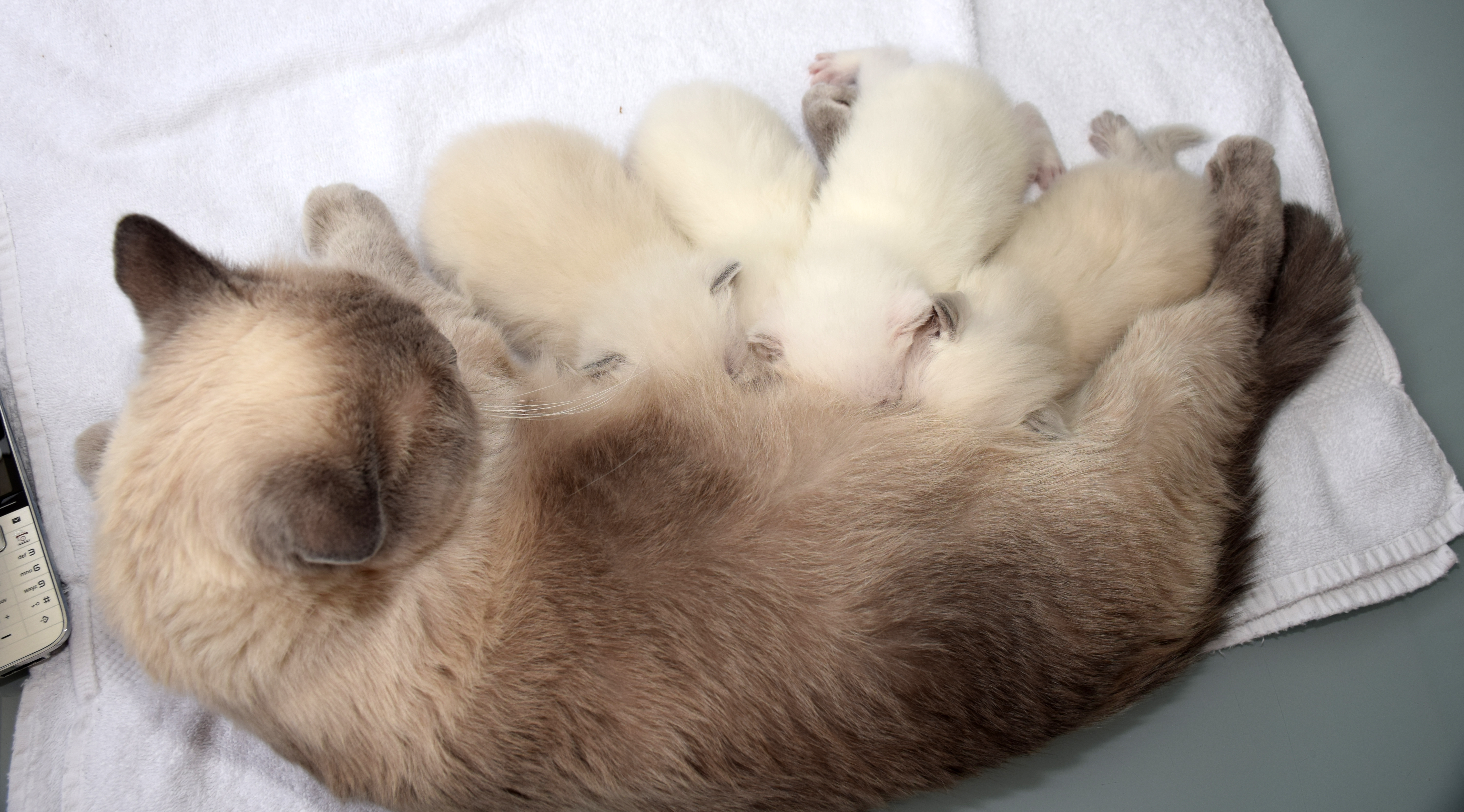 Doordat het zolang geduurd heeft en ze zo hard heeft gewerkt, is Mili doodop. Ze is goed bijgebracht, maar kan de aandacht voor haar kleintjes nog niet opbrengen. We leggen haar lekker warm en blijven de hele nacht, om beurten, bij haar. We leggen de kittens aan en houden alles goed in de gaten.