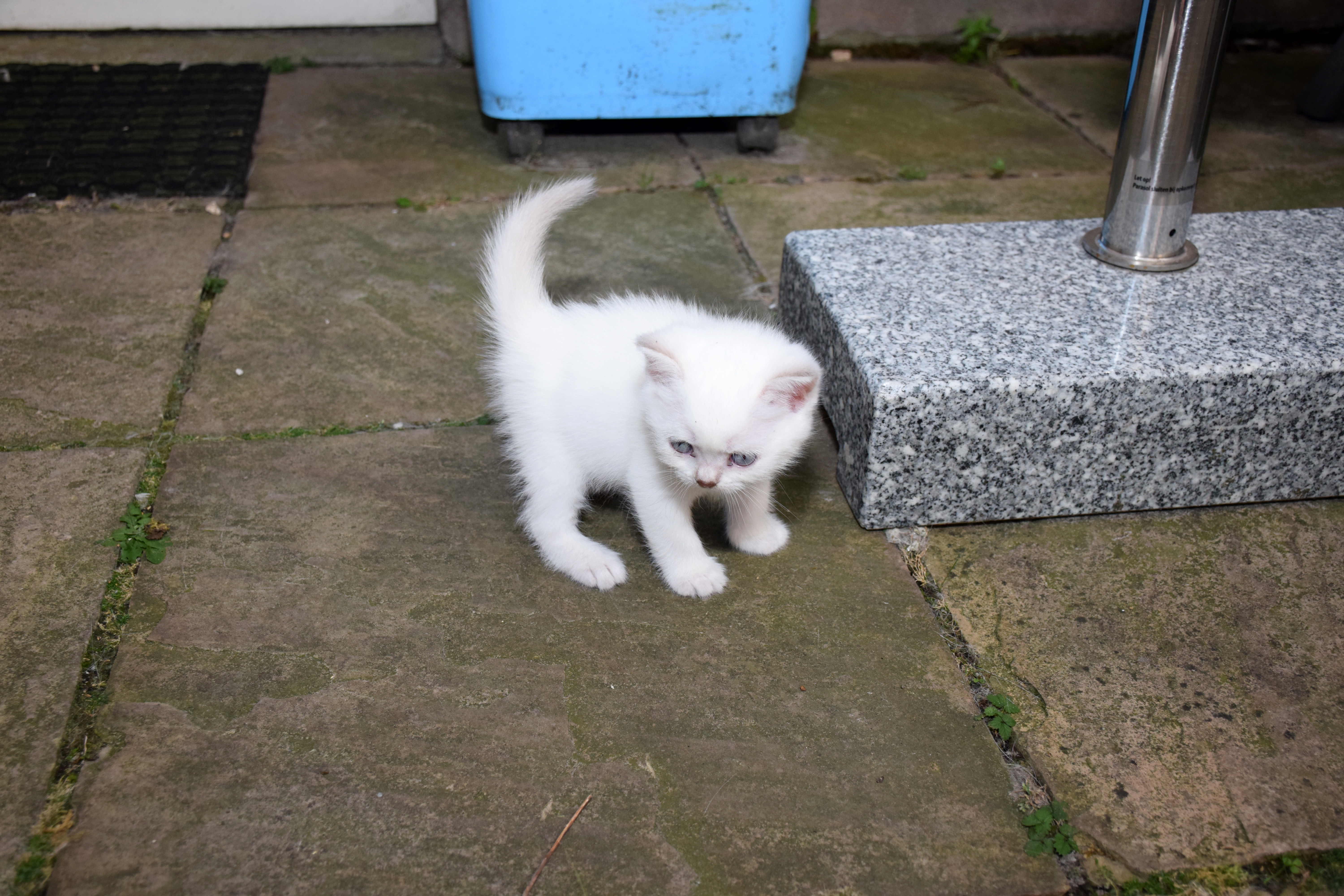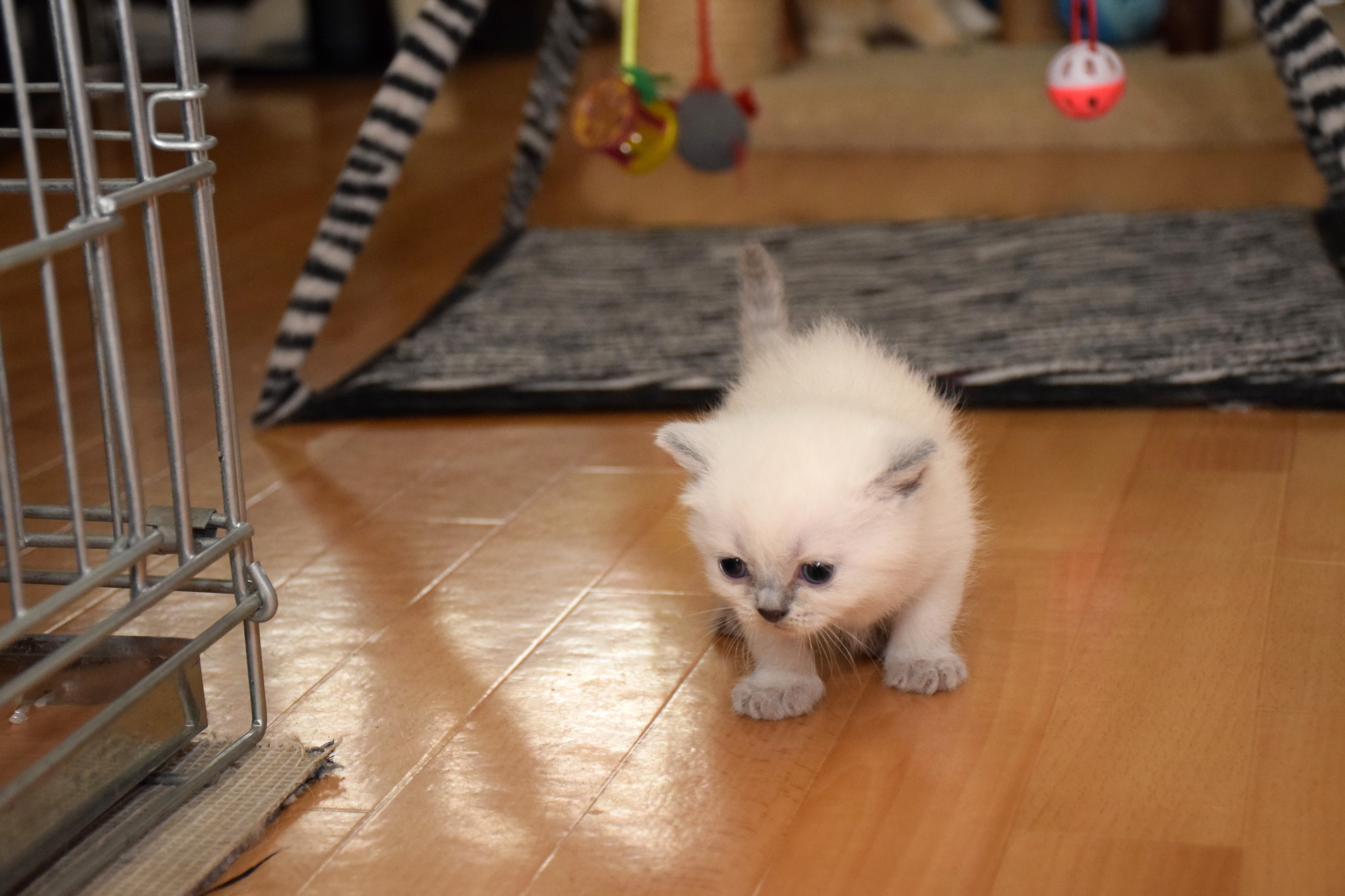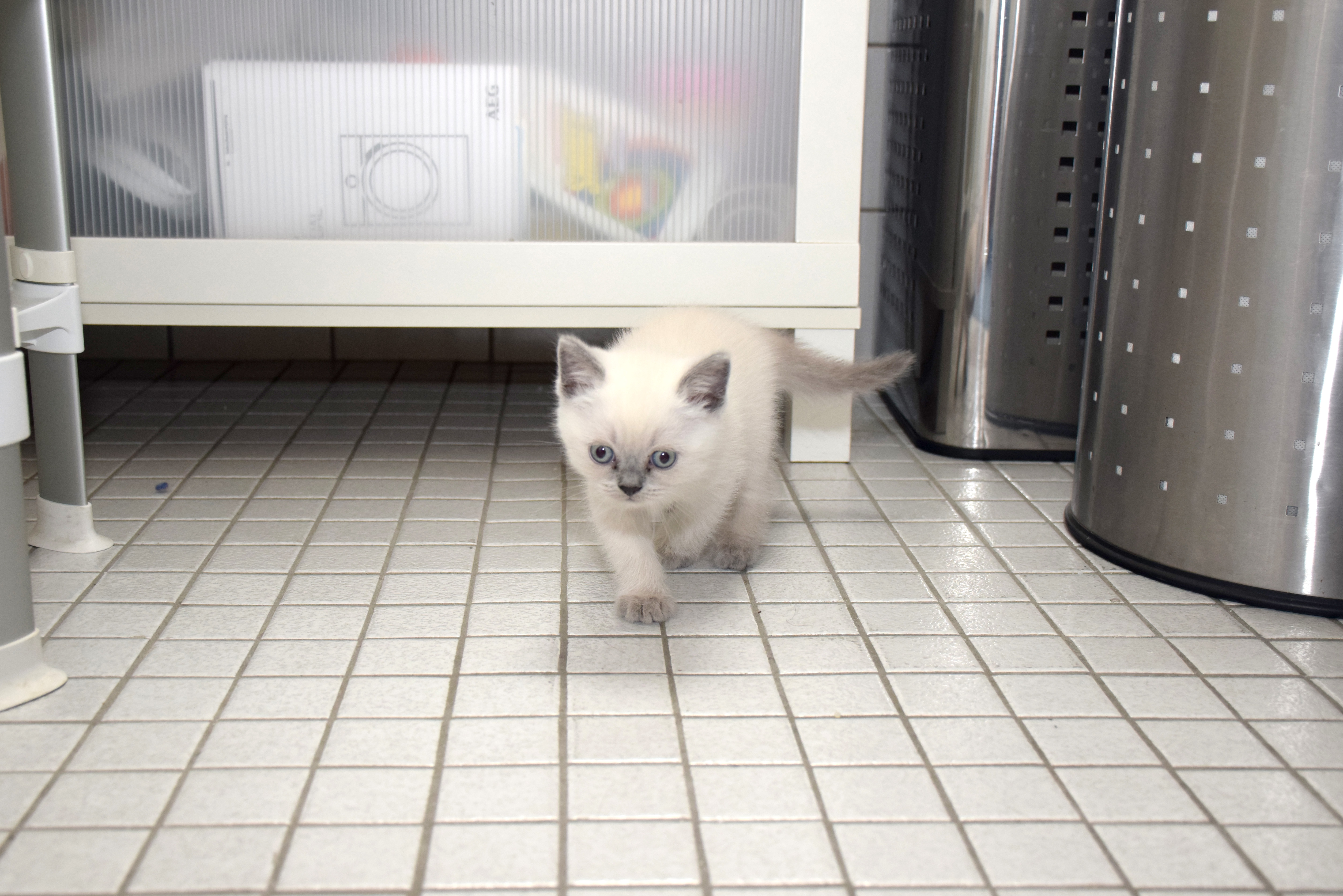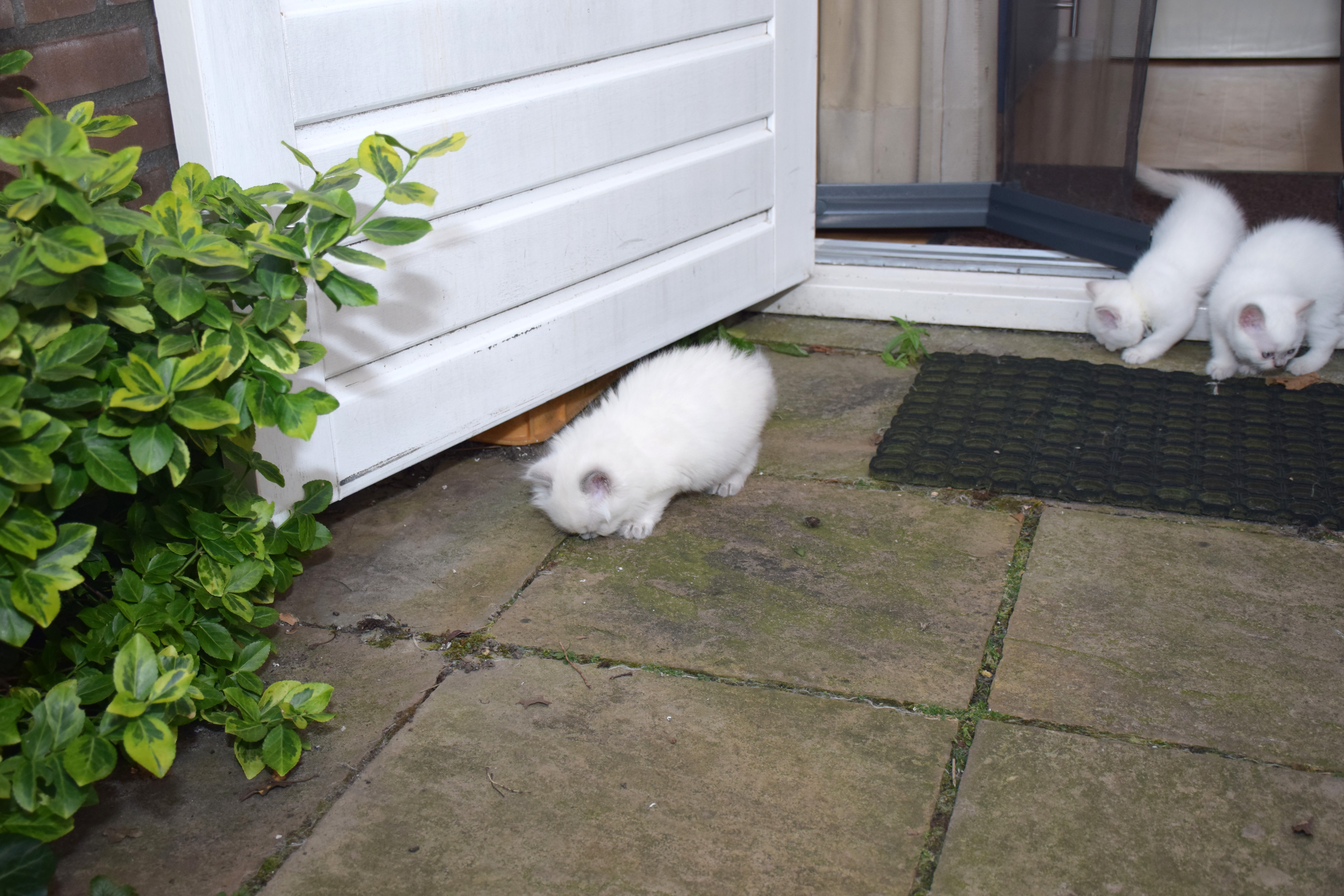 Hoezo een vlot nest? Nadat ze in het begin van de week voorzichtige stapjes in de bench beginnen te zetten, vinden ze het al gauw tijd om ook de wereld buiten de bench te ontdekken. Ervaringen uit het verleden, dat dit zeker een week duurt, worden hier dus compleet onder het kleed geschoven. Komt het omdat ze de kittens van Aislinn in en uit zien lopen, dat zien doen, doet doen? Geen idee, maar het is wel zo schattig om die hele kleine frummeltjes, eerst voorzichtig hun koppie over het randje te zien buigen, dan een pootje erover, wiebelwiebel, nog een pootje erover, weer wiebelwiebel, dan voorover laten vallen en de zwaartekracht doet de rest. Een dagje later kennen ze het al hoor en hebben ze de zwaartekracht niet meer nodig. Maar omdat ze nog klein zijn en wij soms ook even rust willen hebben, sluiten we af en toe de bench, zodat ze binnen moeten blijven. Kennen jullie dat beeld van de leeuw in de kooi, die continu heen en weer loopt. Dat effect heeft dit dus ook… kleine witte “leeuwtjes” die voor de tralies op en neer lopen en tegen de tralies duwen om er uit te kunnen… grappig om te zien. Dus tja, wat doe je dan??? Toch de deur maar weer open…. zucht.
