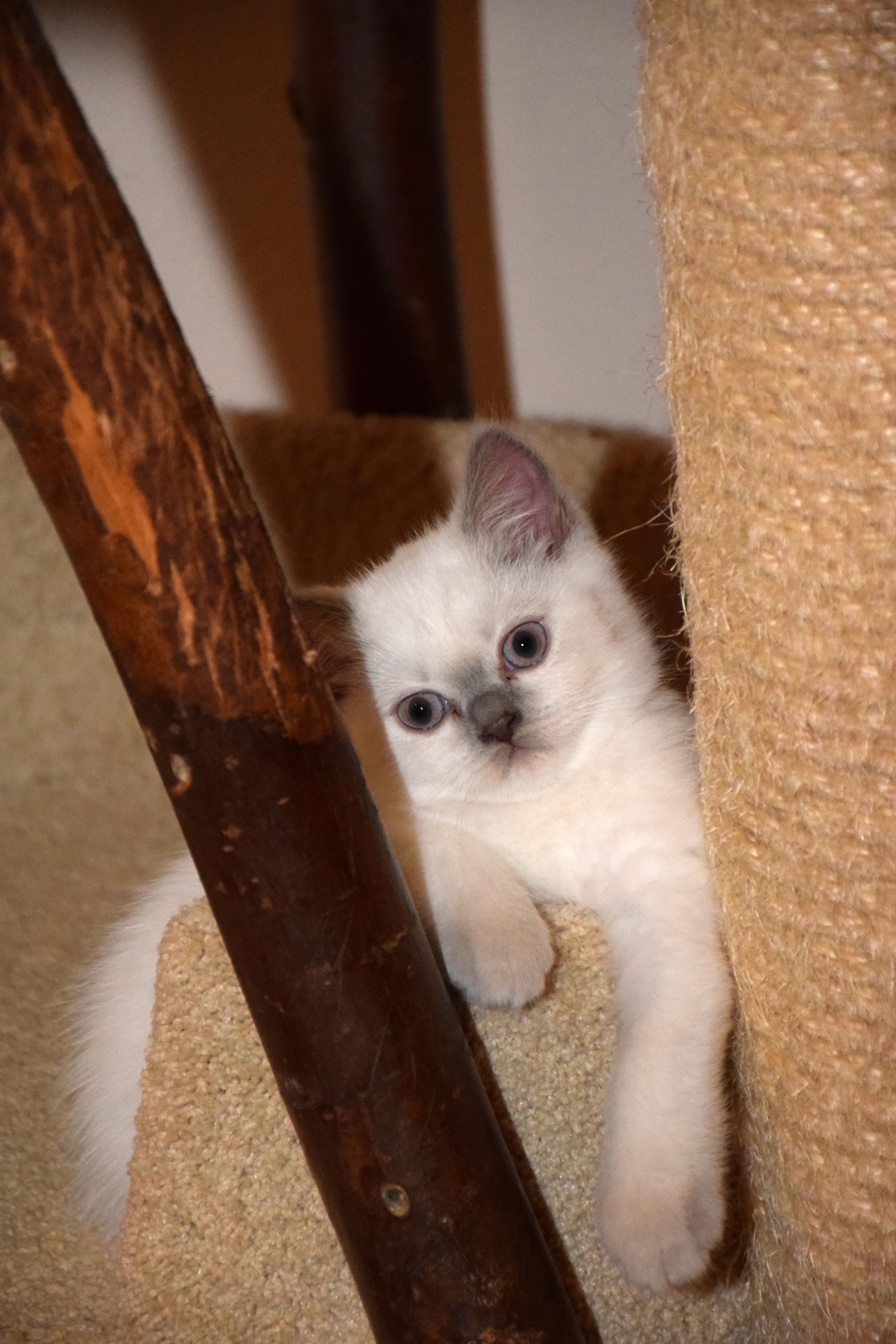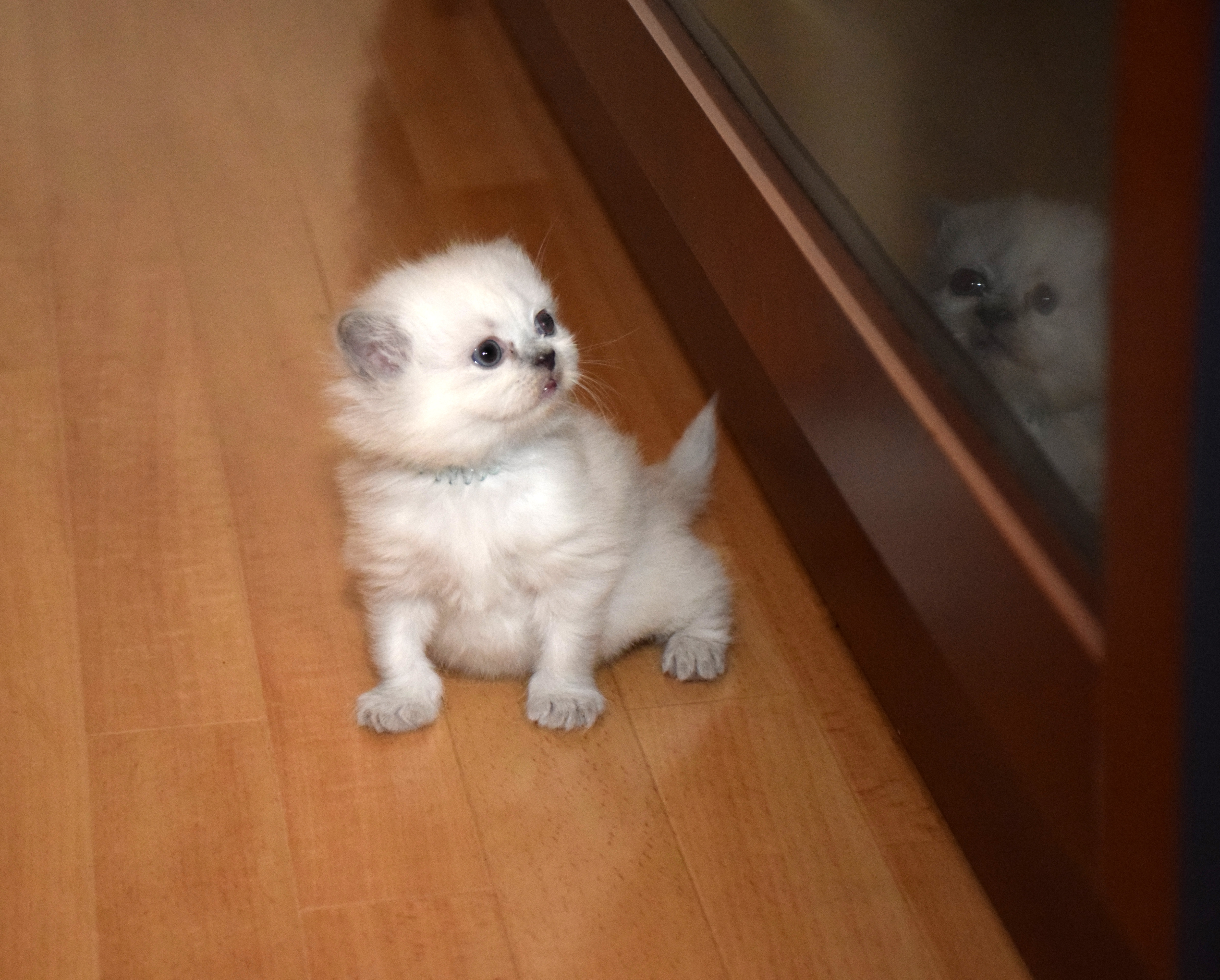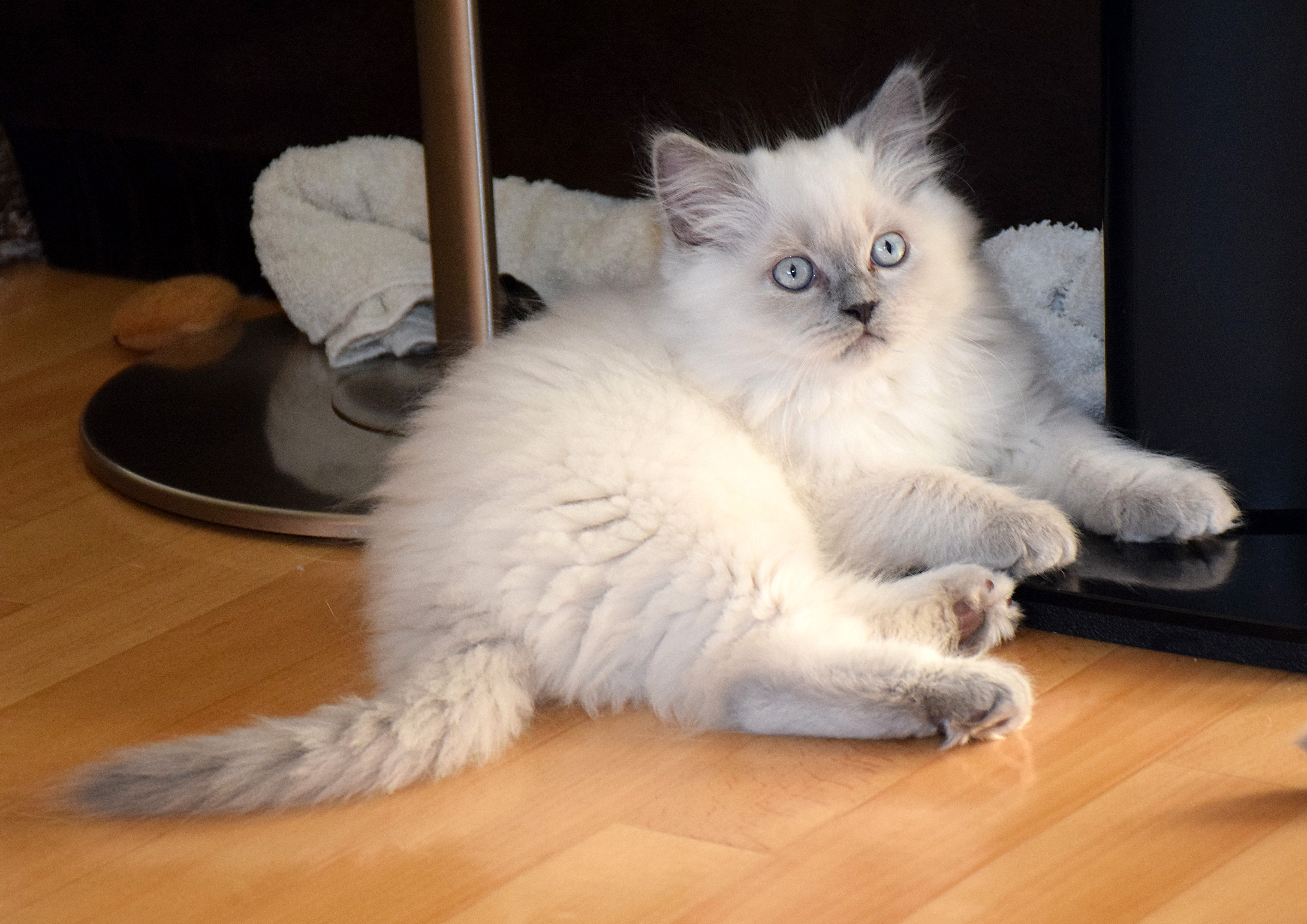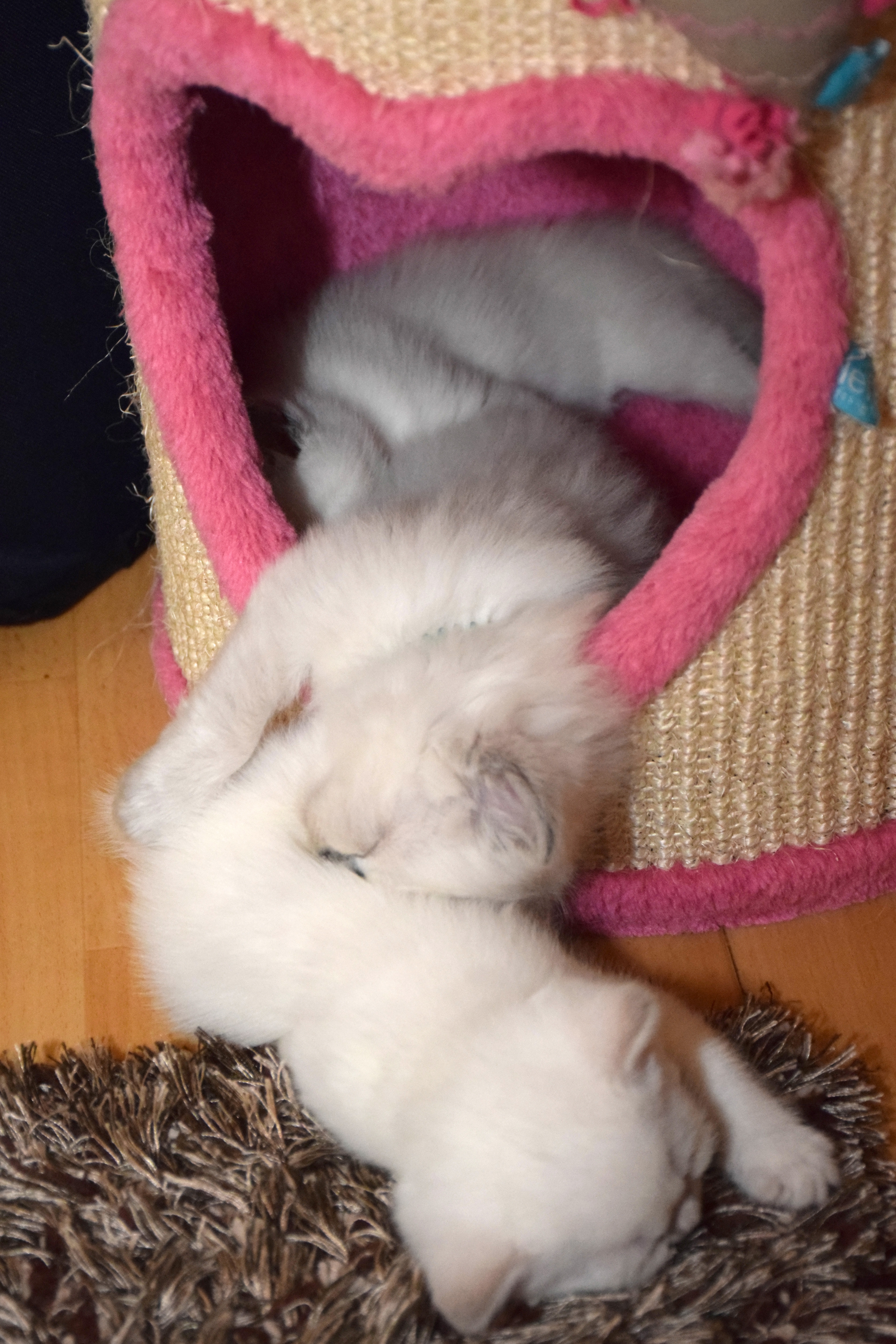 We zijn het inmiddels gewend, zou je denken, om dat kleine grut door het huis te zien hollen. En deels is dat ook zo, maar iedere keer is het weer genieten van die kleine bolletjes wol, die overal opduiken en overal spontaan in slaap vallen. Het is nooit gewoon, je blijft er van genieten en jezelf verbazen over hoe snel ze dingen oppikken en hoe hard ze groeien. En ja, dat laatste is soms zo apart. Myron bijvoorbeeld, die zie je met de dag groter worden, terwijl Miley, die veel fijner gebouwd is, een “spinnetje” blijft, hoewel ze toch goed op gewicht is. Nu oogt Myron met zijn lange vachtje natuurlijk ook wel groter, maar toch. Miley is gewoon een klein compact katje, maar ze is wel het meest ondernemend van allemaal. Alles wat er kan gebeuren, doet zij als eerste: op de kattenbak klimmen, uit de bench klimmen, op de kleine krabton klimmen, in de krabton slapen, een paar treden de trap opklimmen. Het is echt een kleine dondersteen.