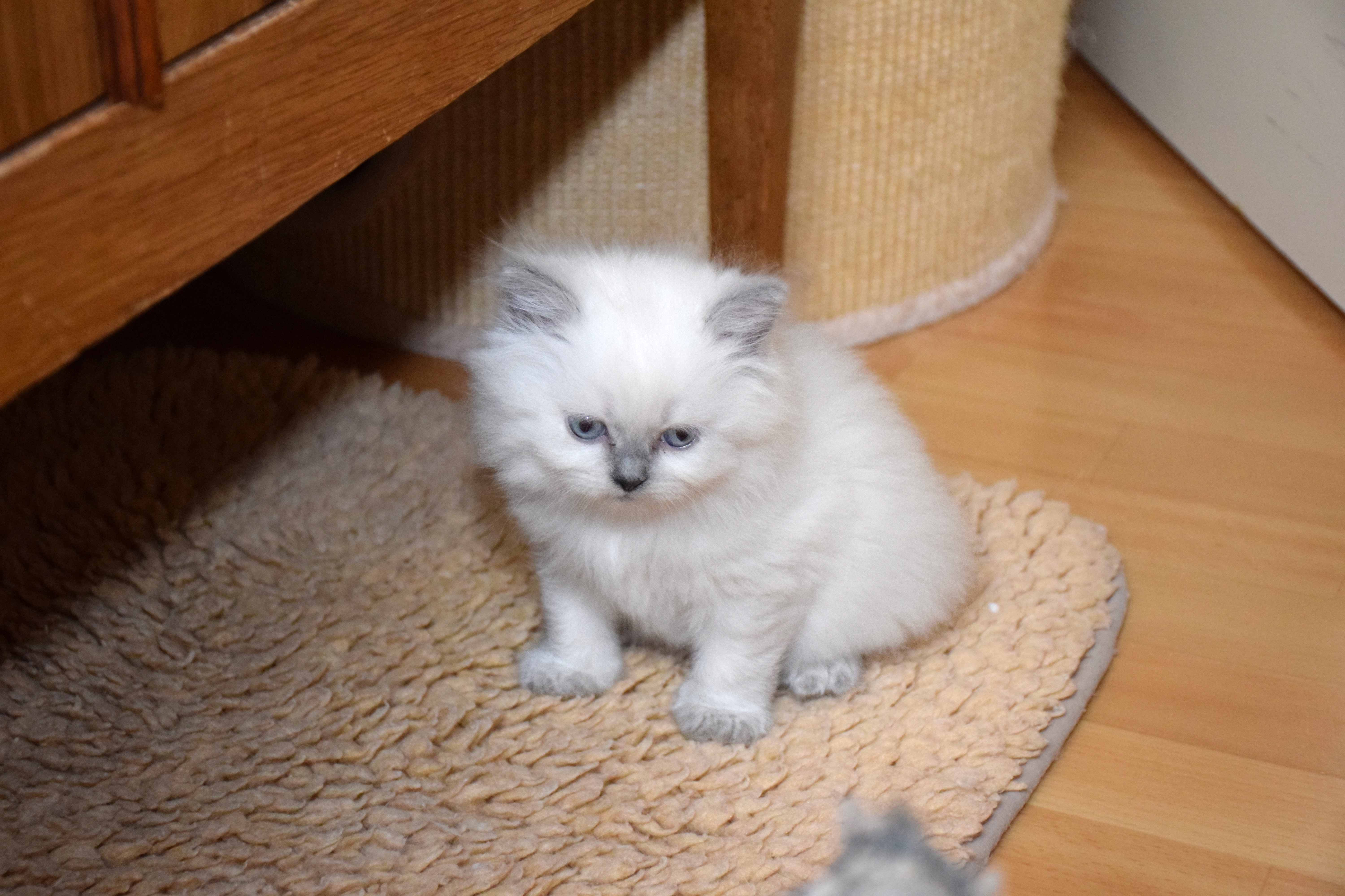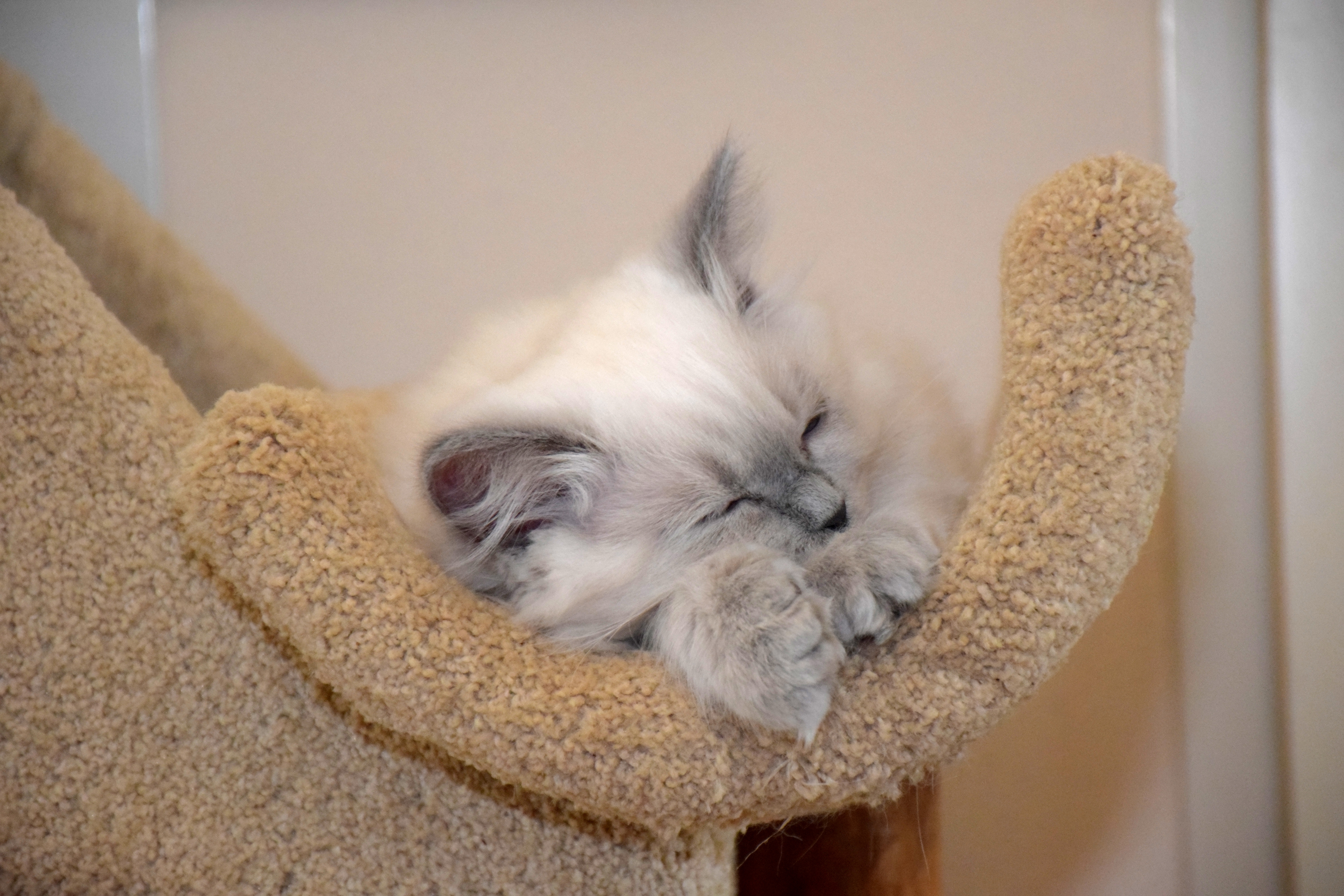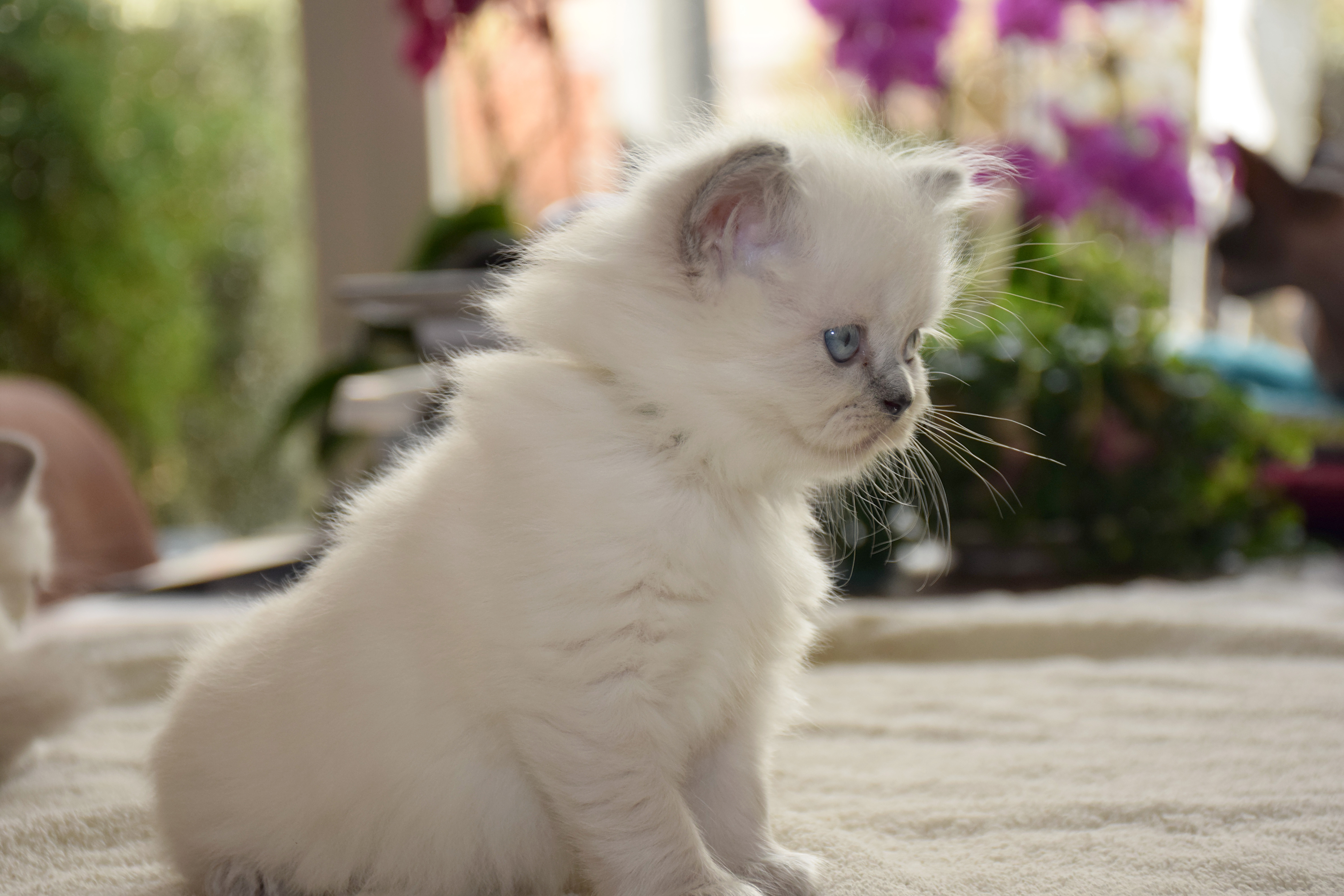 We zijn het inmiddels gewend, zou je denken, om dat kleine grut door het huis te zien hollen. En deels is dat ook zo, maar iedere keer is het weer genieten van die kleine bolletjes wol, die overal opduiken en overal spontaan in slaap vallen. Het is nooit gewoon, je blijft er van genieten en jezelf verbazen over hoe snel ze dingen oppikken en hoe hard ze groeien. En ja, dat laatste is soms zo apart. Myron bijvoorbeeld, die zie je met de dag groter worden, terwijl Miley, die veel fijner gebouwd is, een “spinnetje” blijft, hoewel ze toch goed op gewicht is. Nu oogt Myron met zijn lange vachtje natuurlijk ook wel groter, maar toch. Miley is gewoon een klein compact katje, maar ze is wel het meest ondernemend van allemaal. Alles wat er kan gebeuren, doet zij als eerste: op de kattenbak klimmen, uit de bench klimmen, op de kleine krabton klimmen, in de krabton slapen, een paar treden de trap opklimmen. Het is echt een kleine dondersteen.