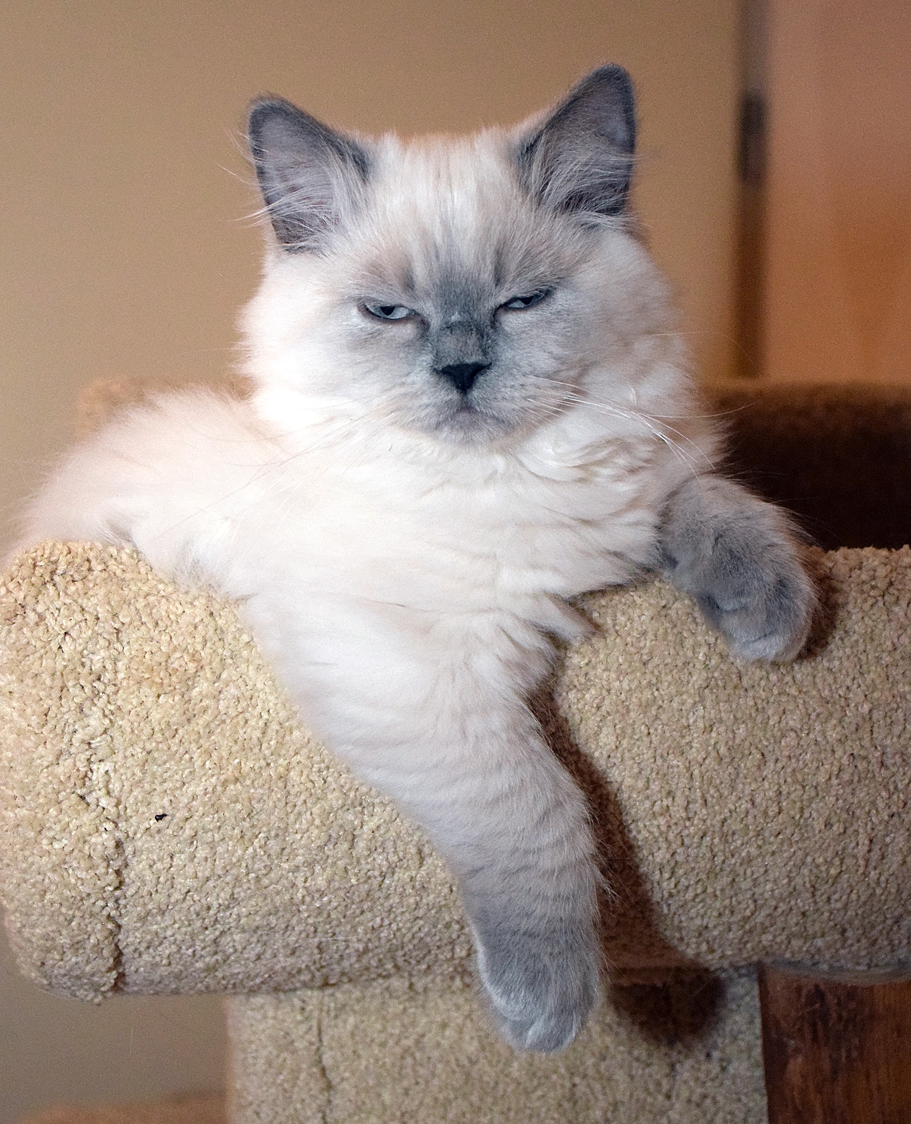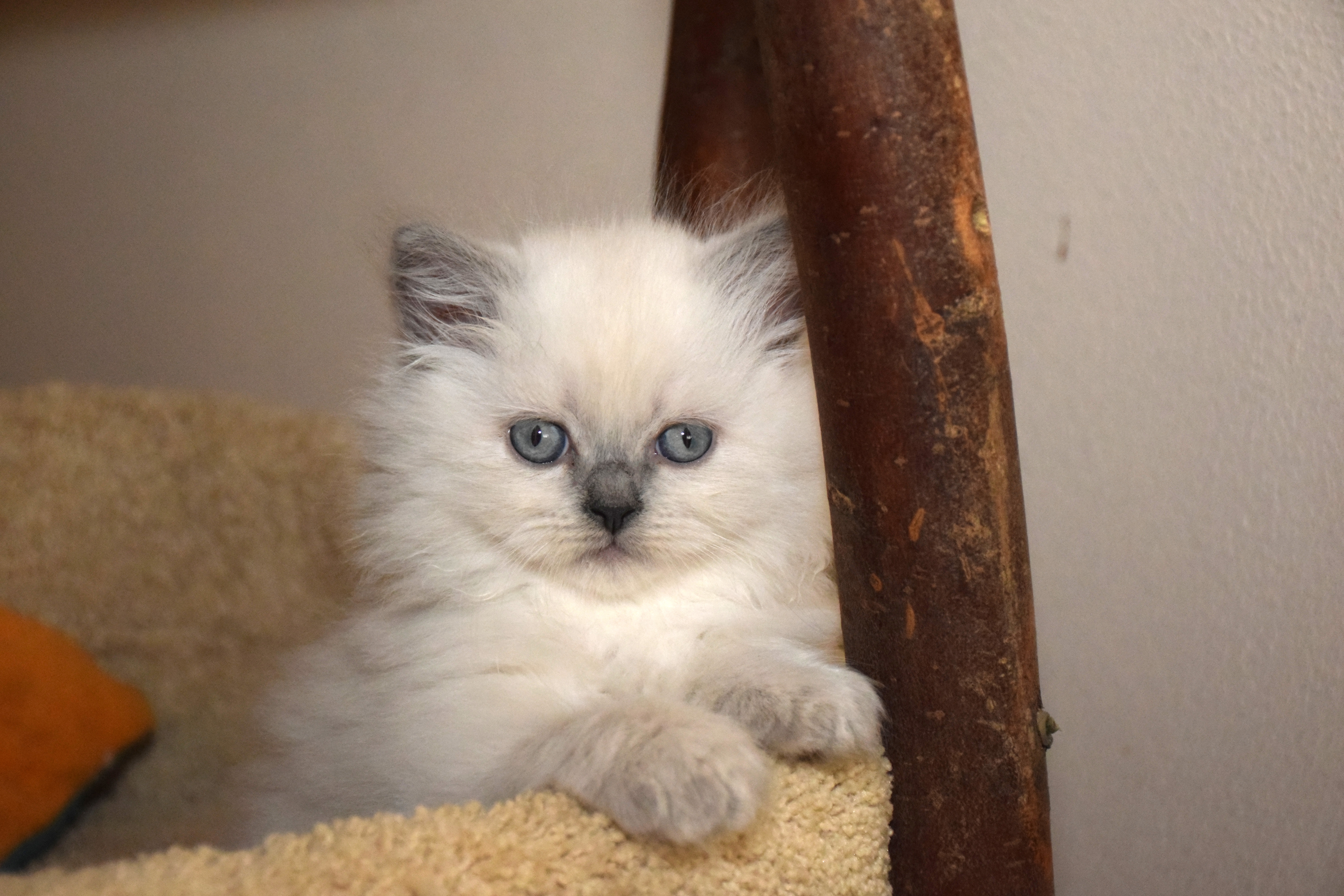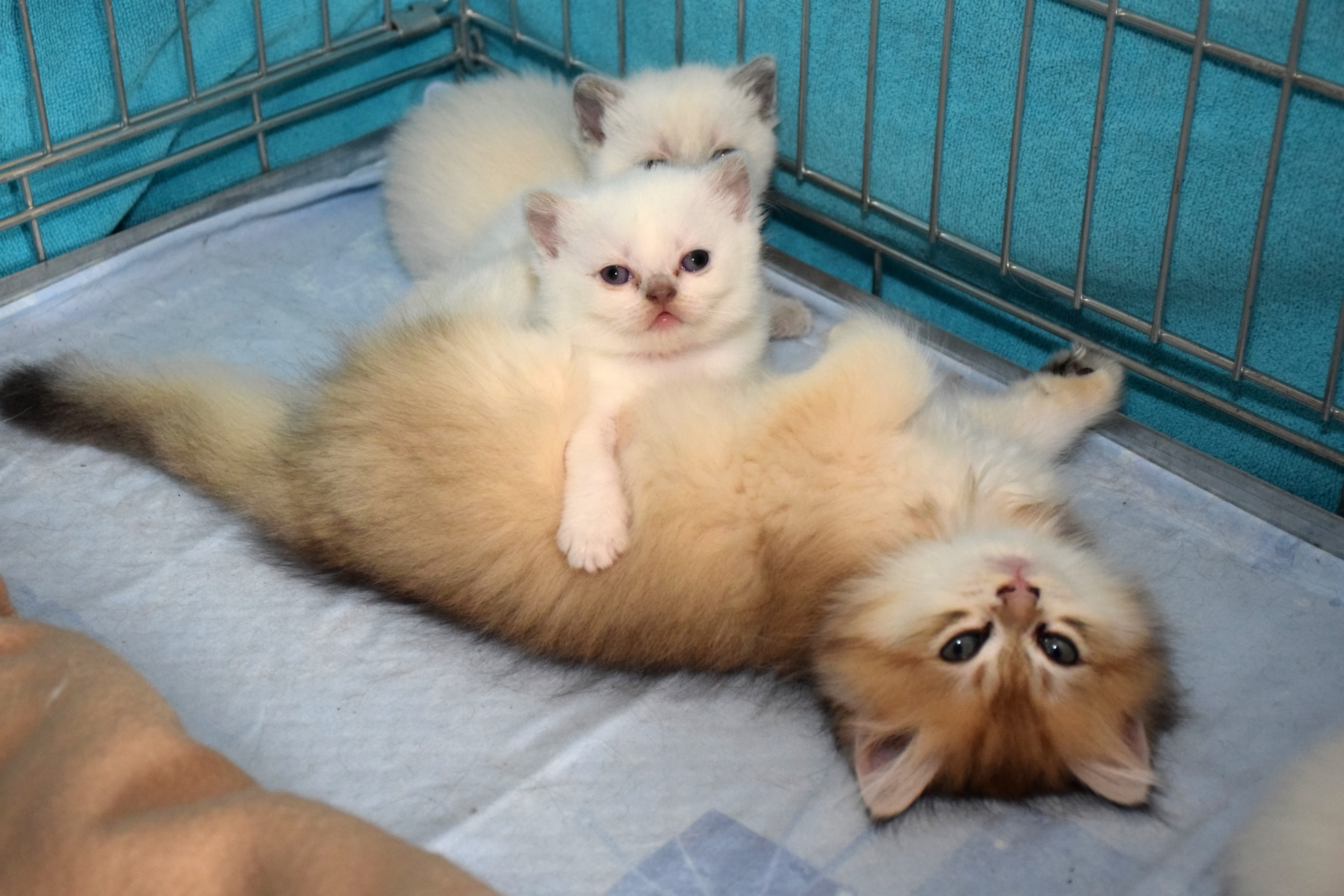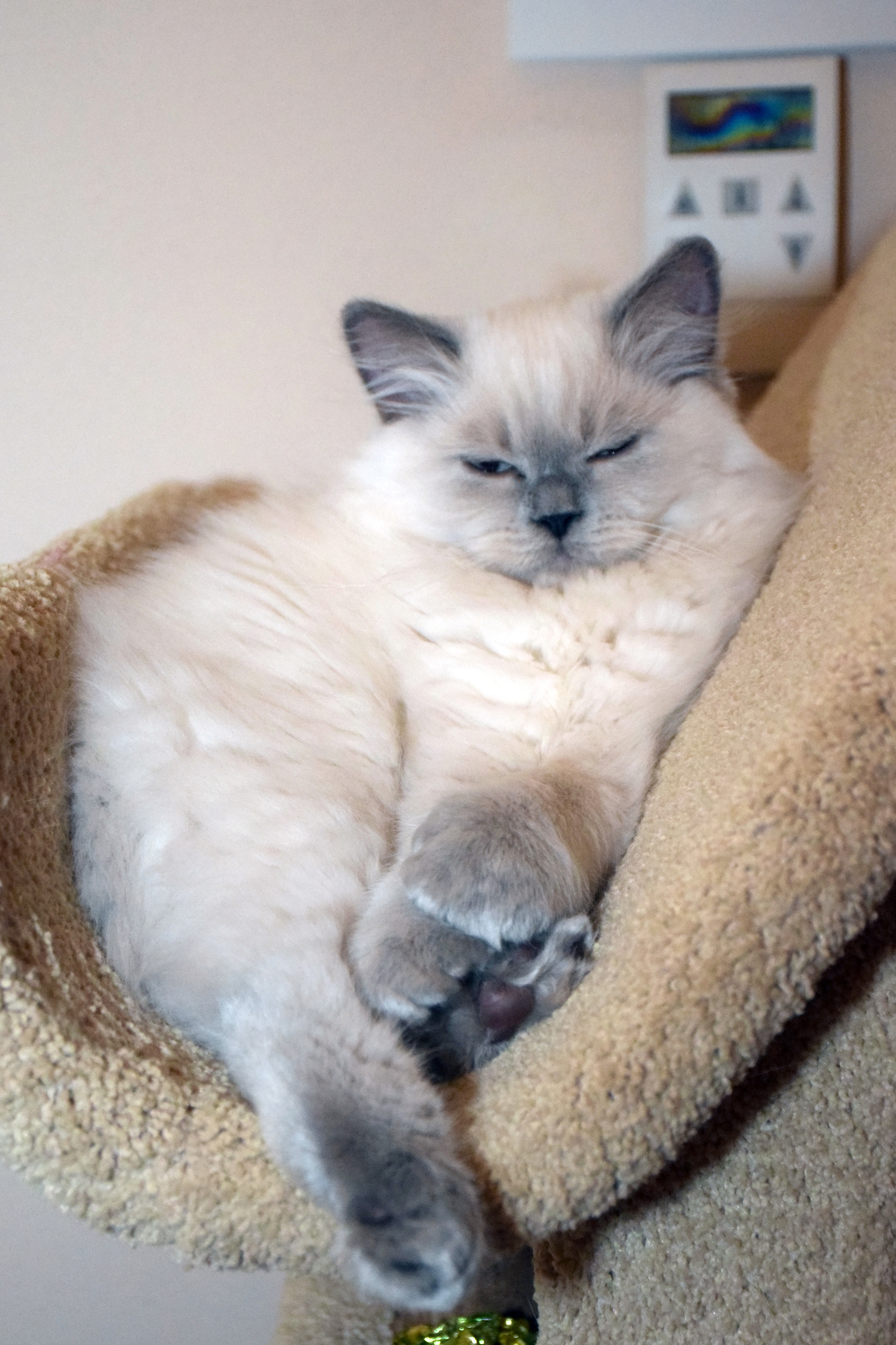 We zijn het inmiddels gewend, zou je denken, om dat kleine grut door het huis te zien hollen. En deels is dat ook zo, maar iedere keer is het weer genieten van die kleine bolletjes wol, die overal opduiken en overal spontaan in slaap vallen. Het is nooit gewoon, je blijft er van genieten en jezelf verbazen over hoe snel ze dingen oppikken en hoe hard ze groeien. En ja, dat laatste is soms zo apart. Myron bijvoorbeeld, die zie je met de dag groter worden, terwijl Miley, die veel fijner gebouwd is, een “spinnetje” blijft, hoewel ze toch goed op gewicht is. Nu oogt Myron met zijn lange vachtje natuurlijk ook wel groter, maar toch. Miley is gewoon een klein compact katje, maar ze is wel het meest ondernemend van allemaal. Alles wat er kan gebeuren, doet zij als eerste: op de kattenbak klimmen, uit de bench klimmen, op de kleine krabton klimmen, in de krabton slapen, een paar treden de trap opklimmen. Het is echt een kleine dondersteen.