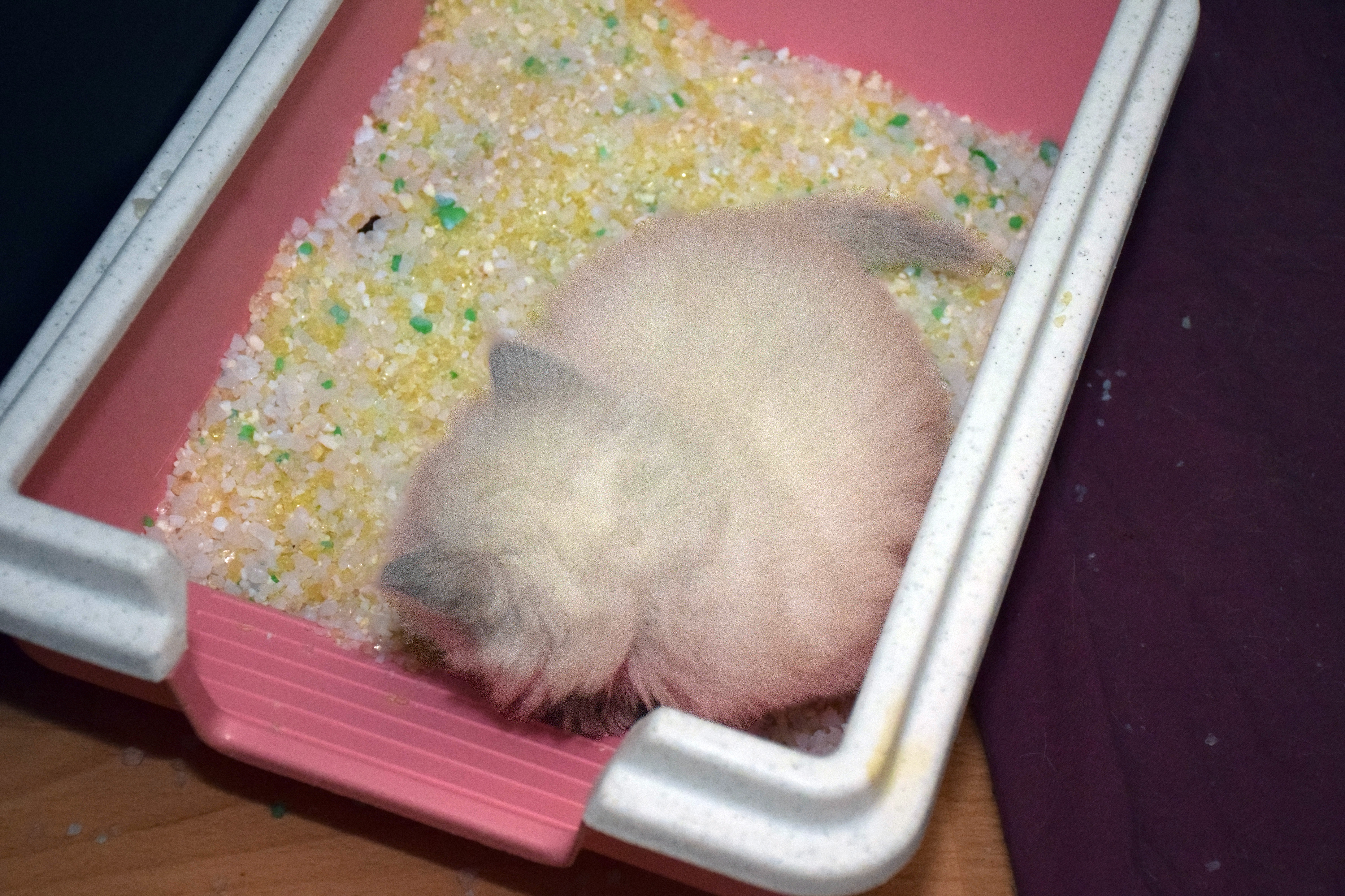 Inmiddels hebben ze de functie van het kattenbakje ook ontdekt… jajaja… juffrouw Miley was natuurlijk weer de eerste die gebruik maakte van het kattentoilet en de rest volgde als snel. En dat niet alleen… juffrouw Miley vond het ook tijd om aan het einde van de week geen gebruik meer te maken van het kittenbakje… nee, zij ging op de grote kattenbak. En wat denk je….. de rest ging haar achterna. Op Mylou na… die had tijd genoeg. Jammer voor haar, want na een paar keer oefenen, hebben we het kleine bakje op vrijdag uit de bench gehaald. Geen drolletjes meer open en bloot aan het geuren!