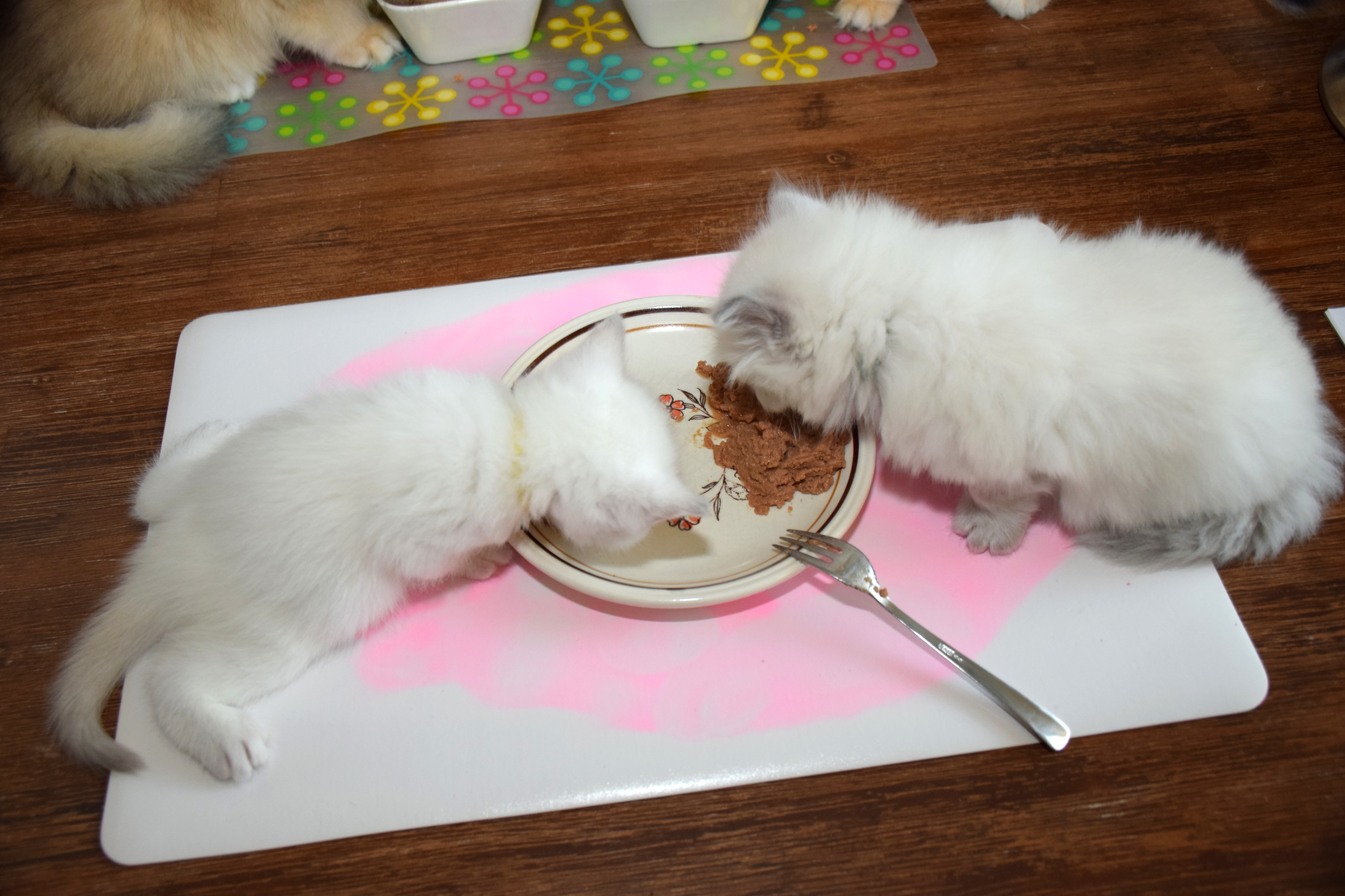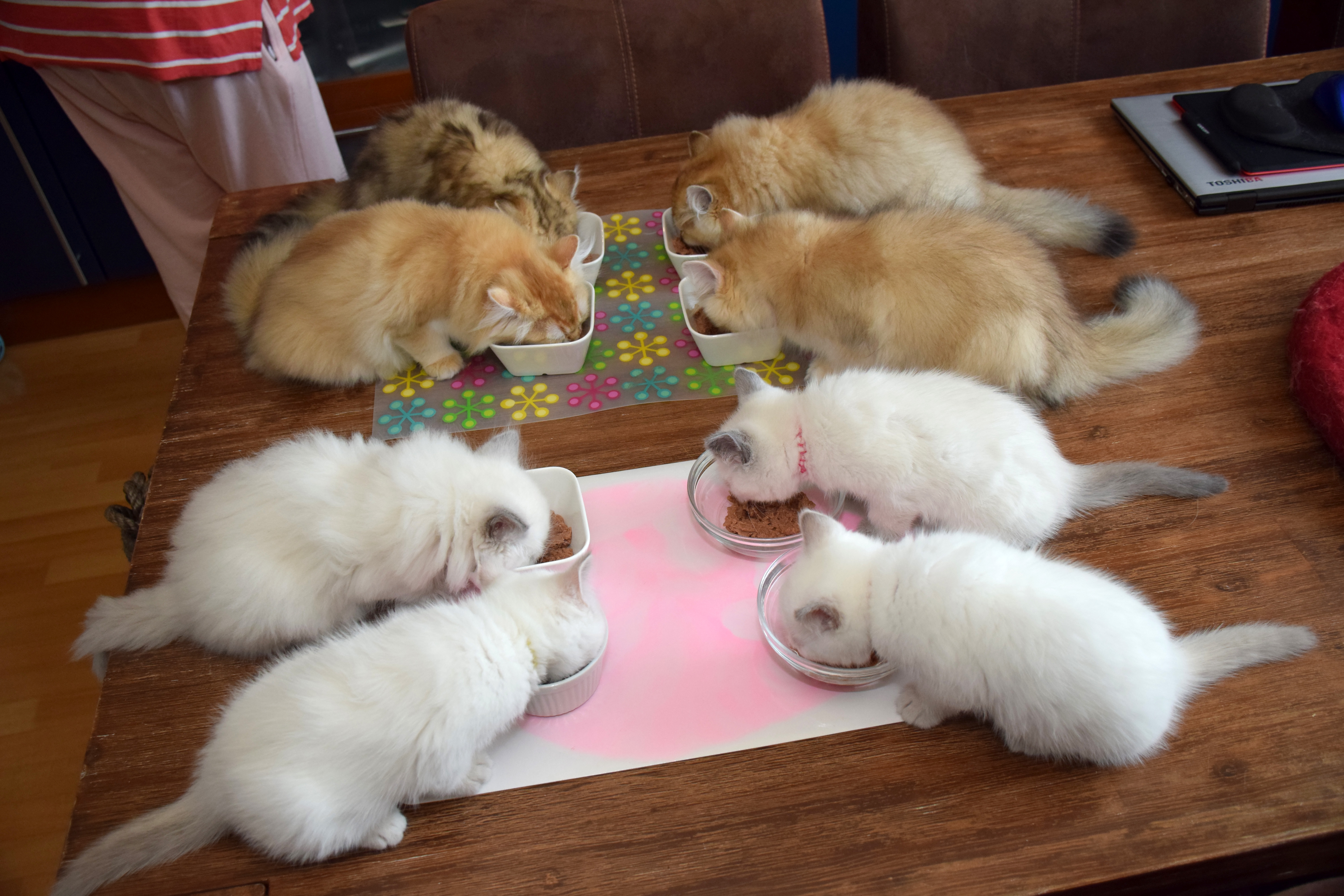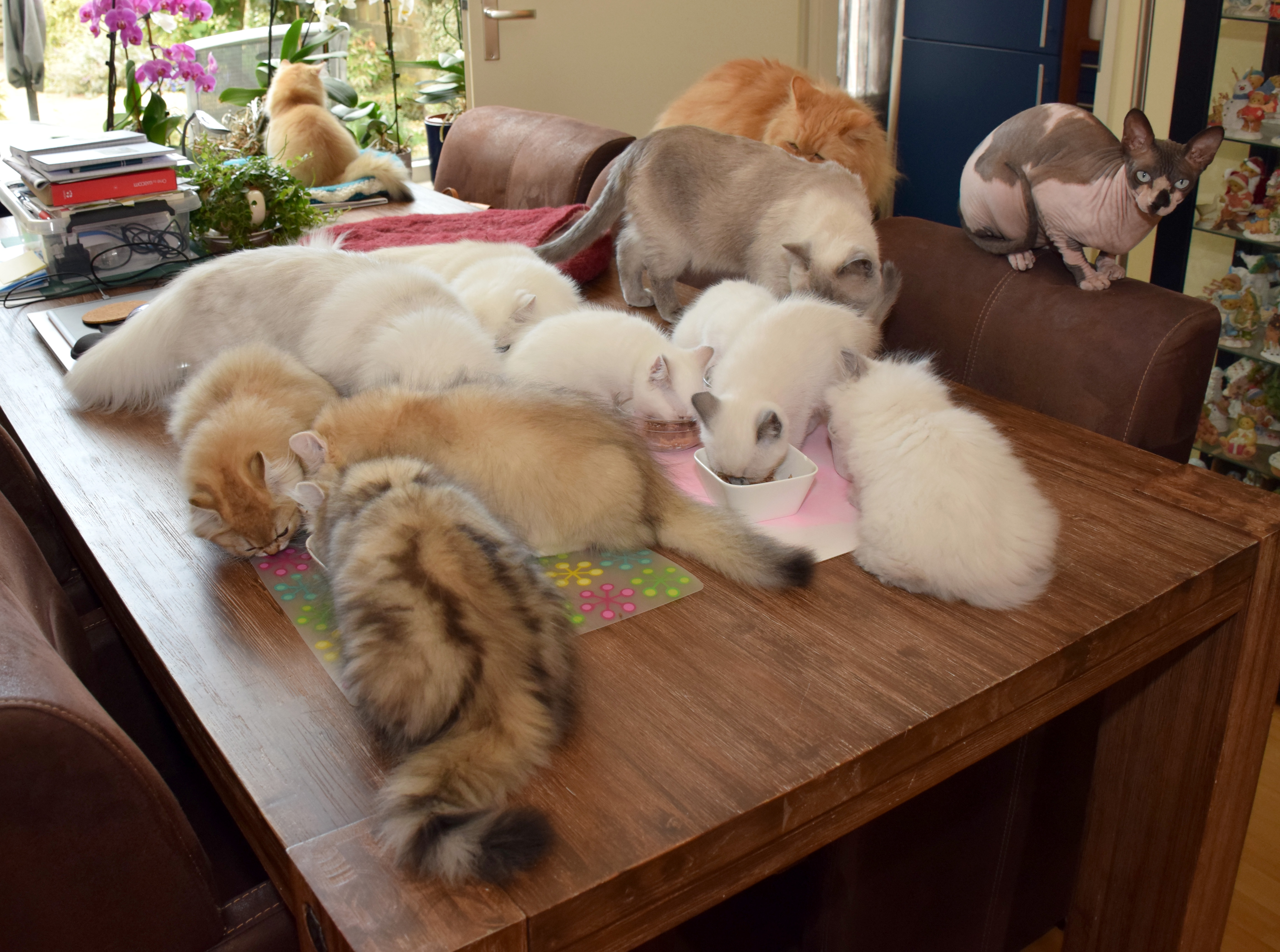 Je hebt altijd laatbloeiers… dachten we dat Macey en Mylou echte brokkenkinderen waren… ineens “zien ze het licht” en gaan ze ook aan het zachtvoer… zo mooi om acht kittens heerlijk te zien smullen op tafel!