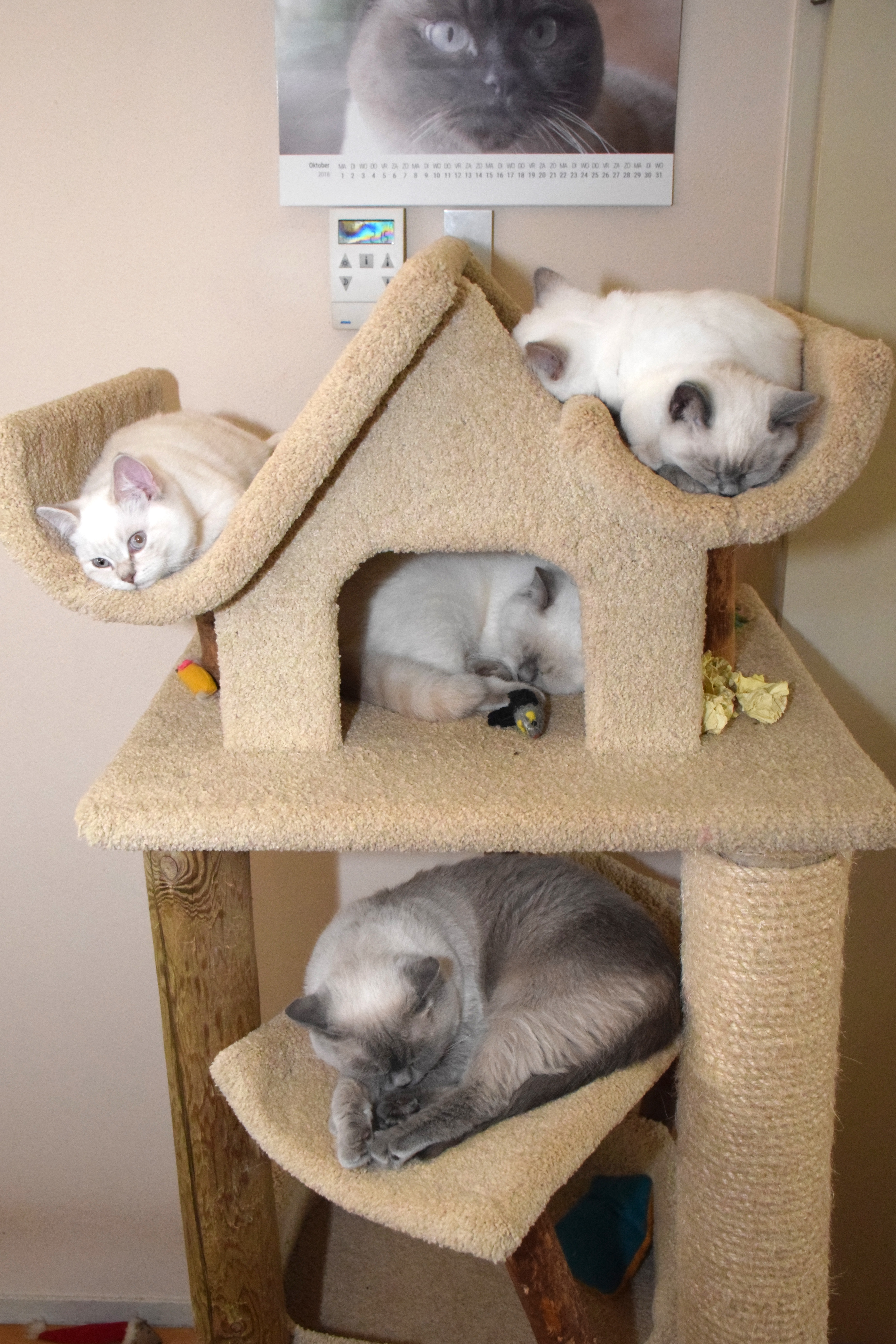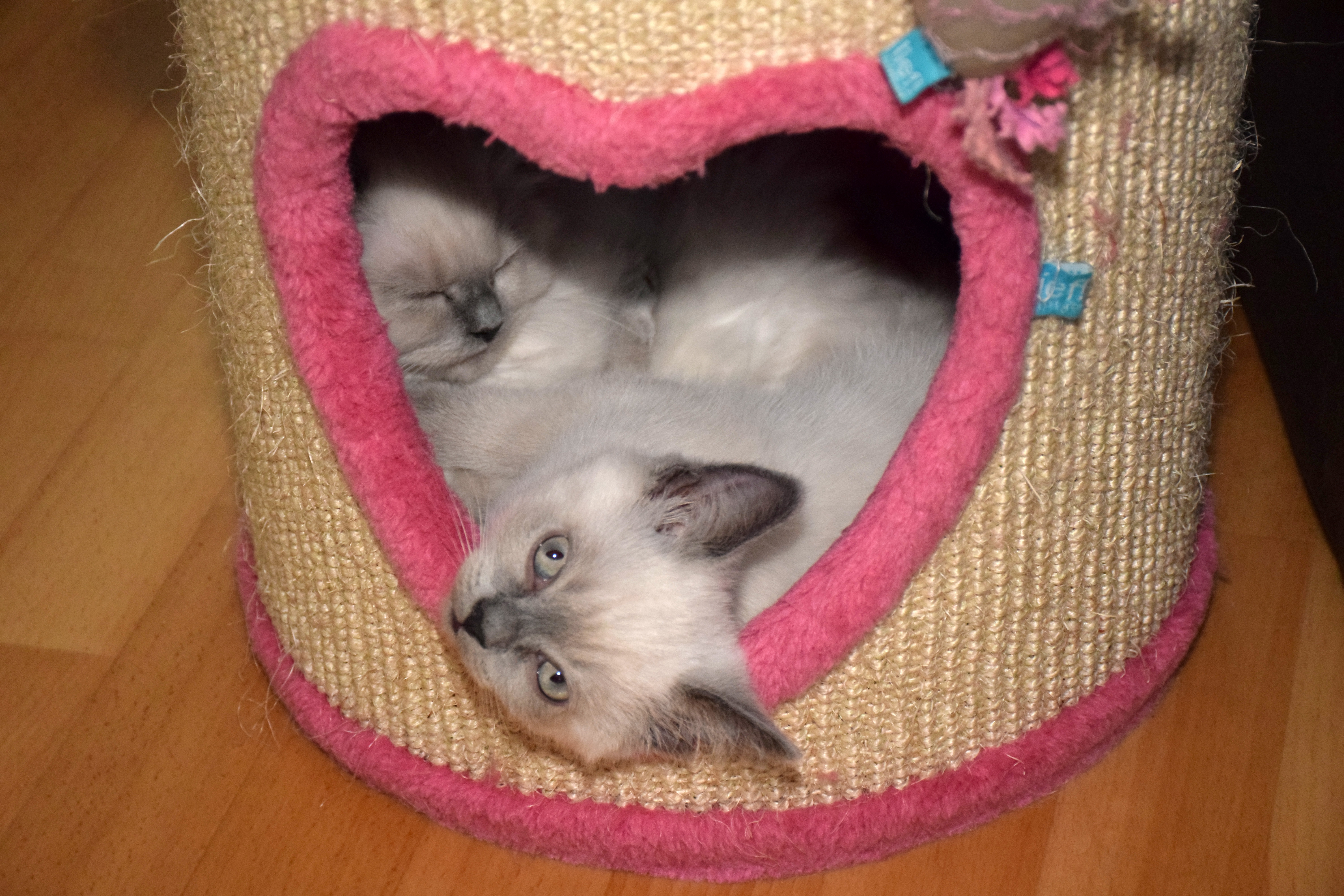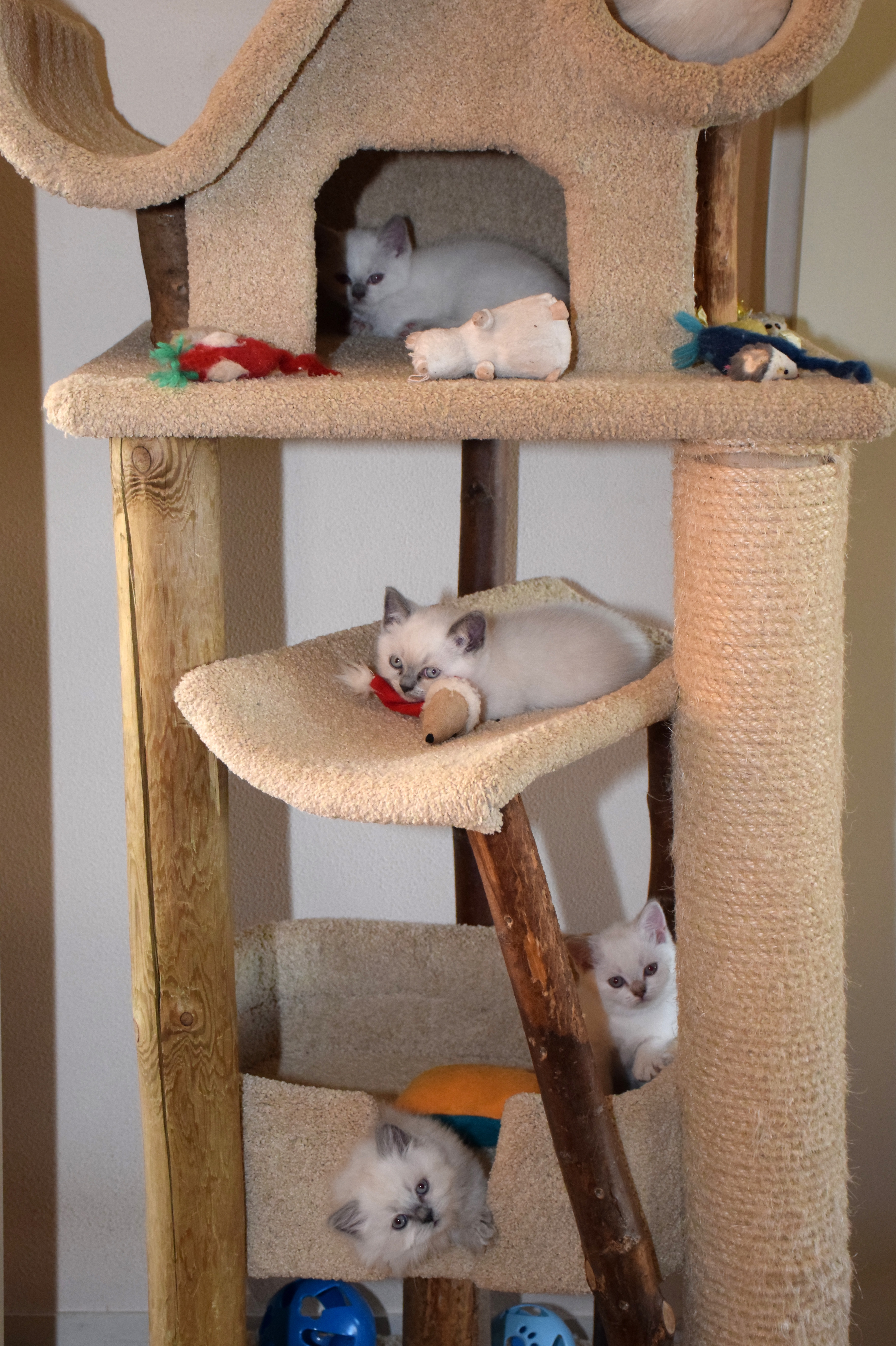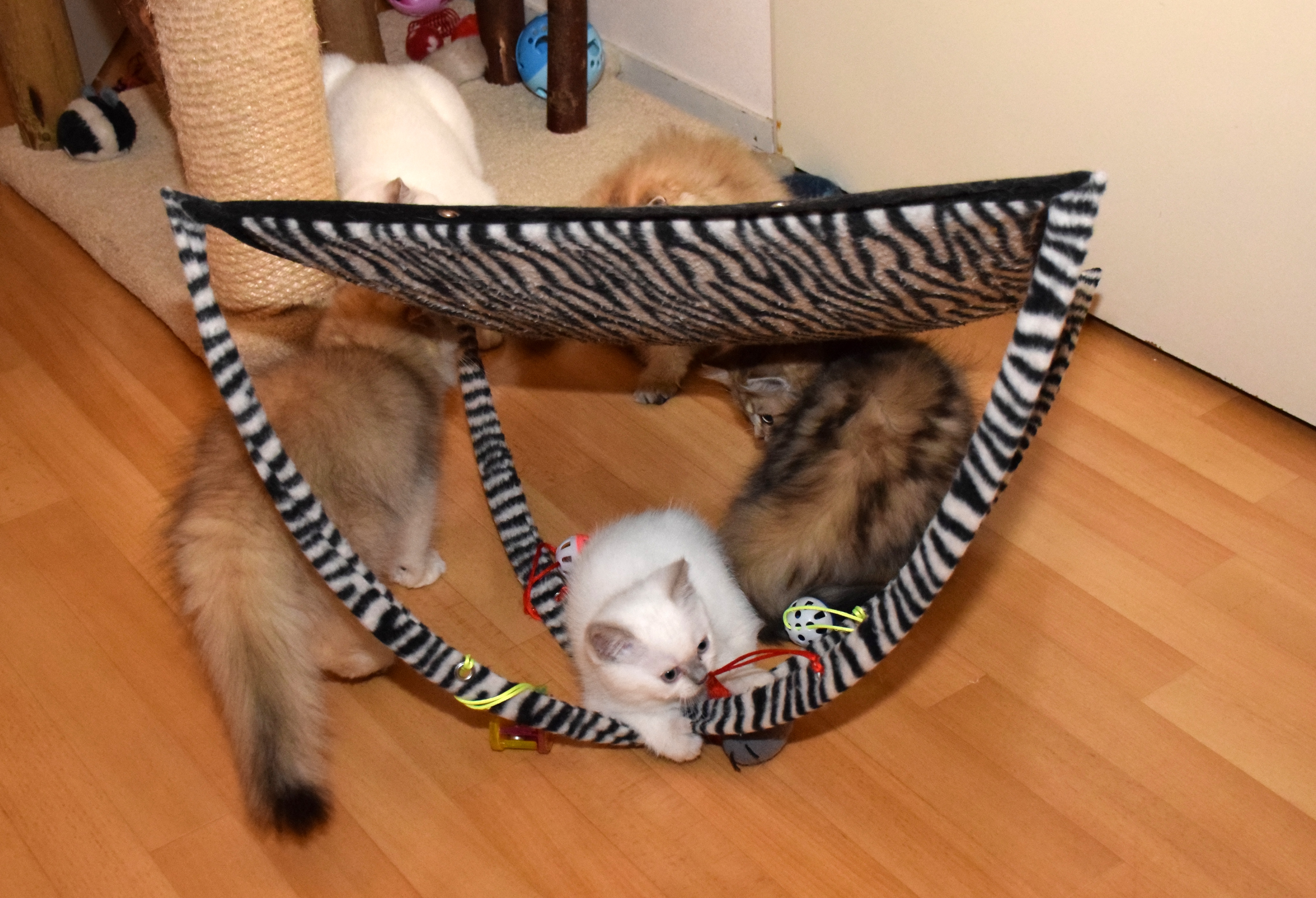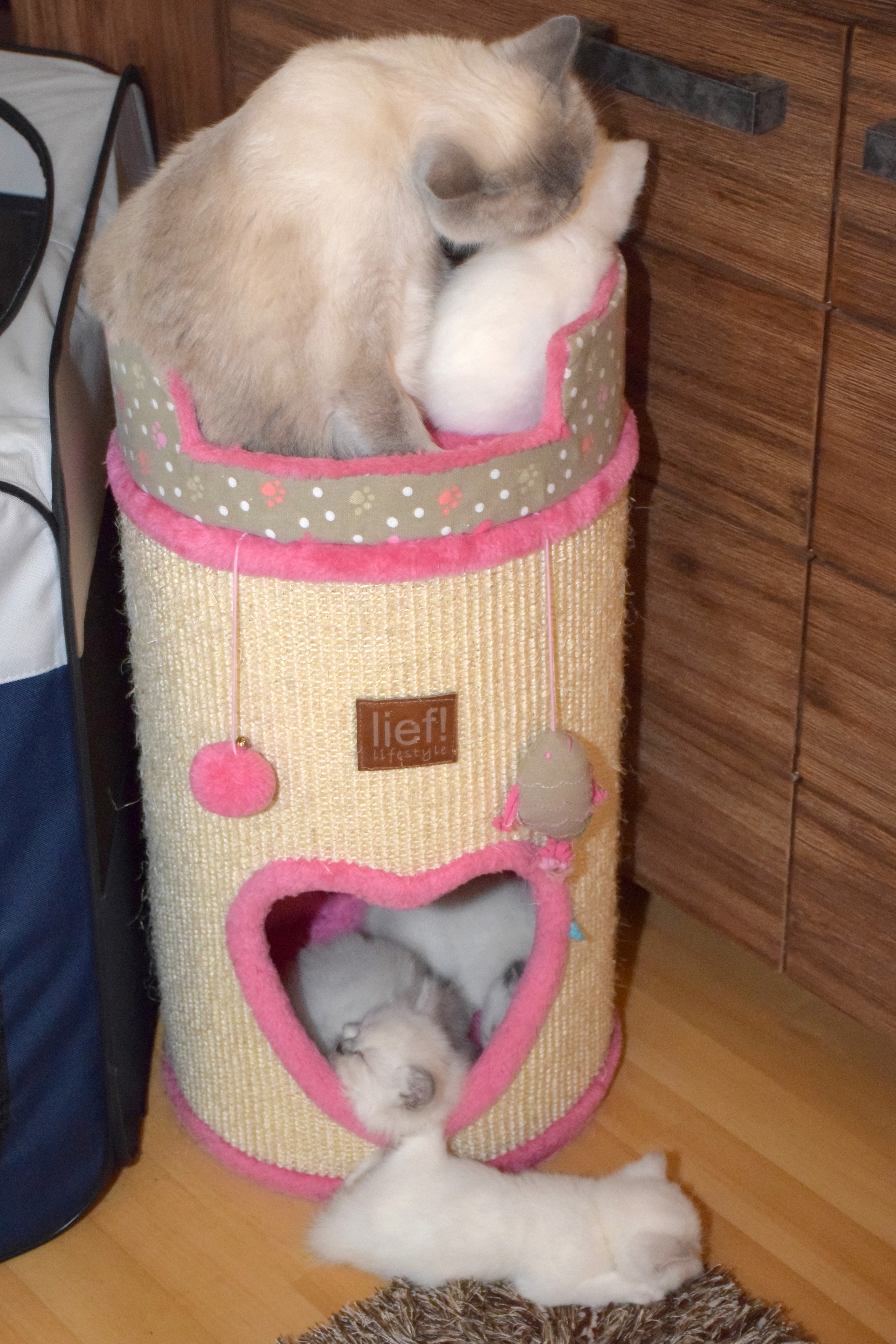Het kittenkrabtonnetje is inmiddels te klein, dus is mama Mili verhuisd naar de krabmandjes… maar ook vinden ze het leuk om met zijn allen, op diverse verdiepingen in de krabpaal te liggen. En dan van boven eraf springen…. je houdt je hart vast, maar je bent nooit op tijd om ze er uit te zetten.