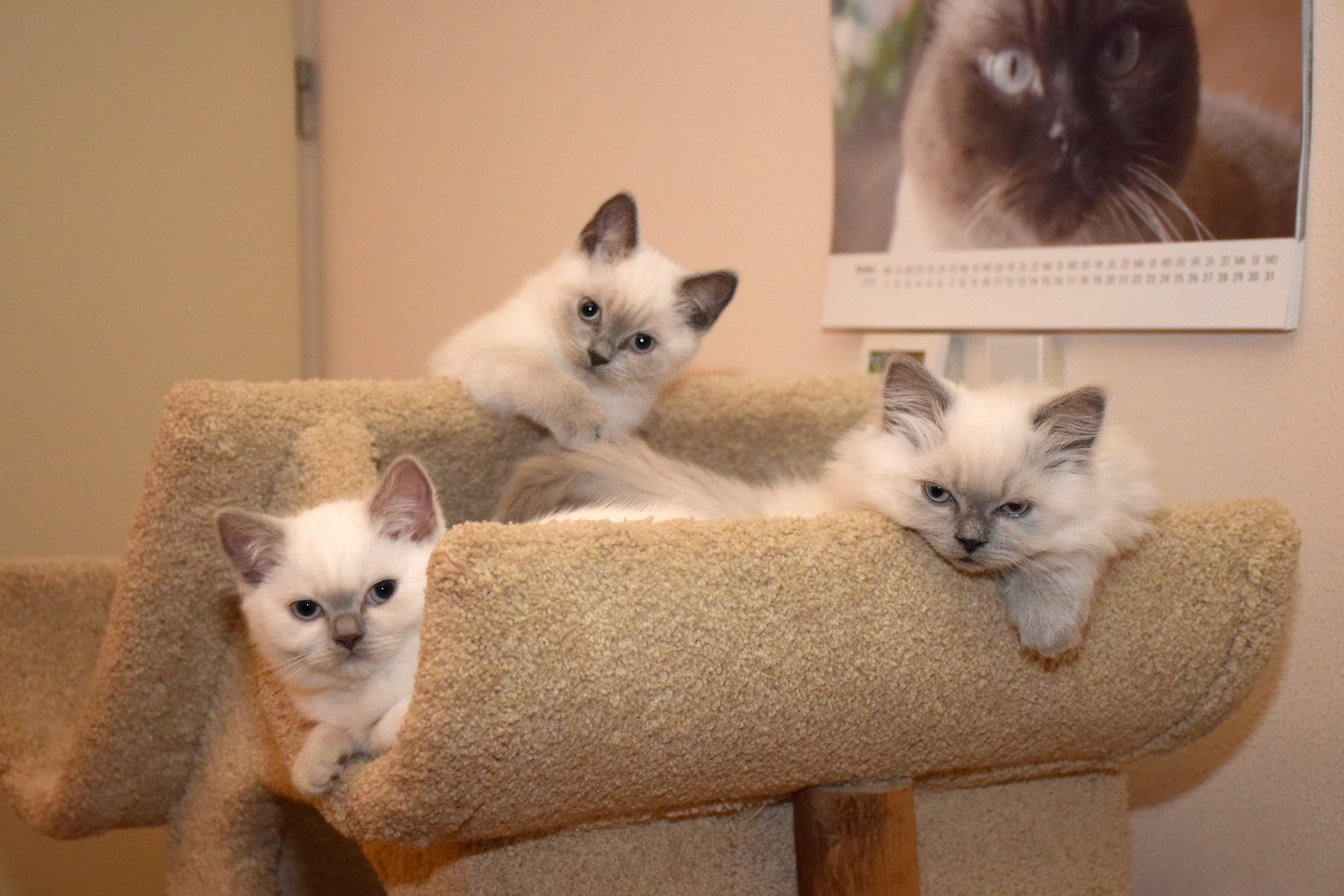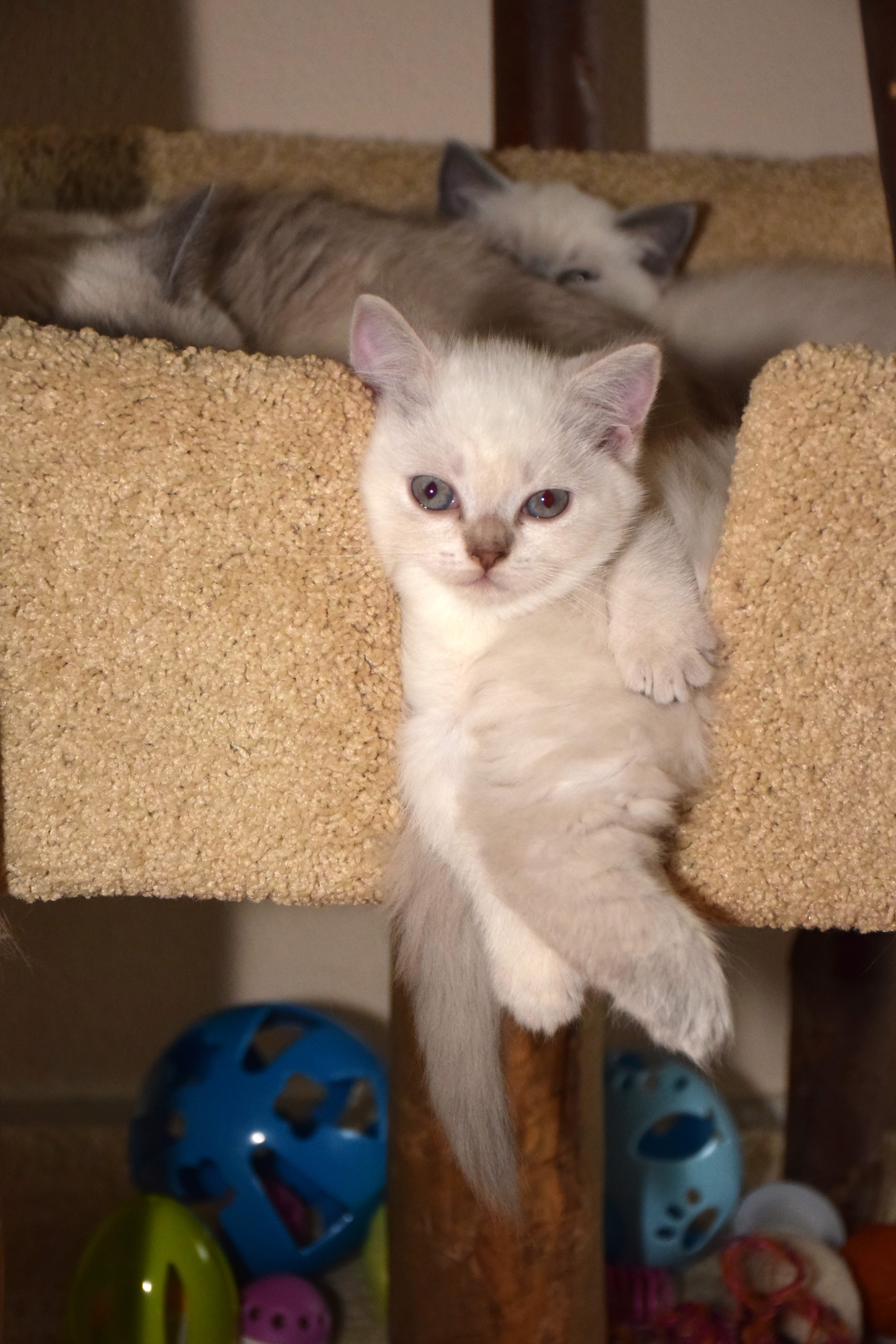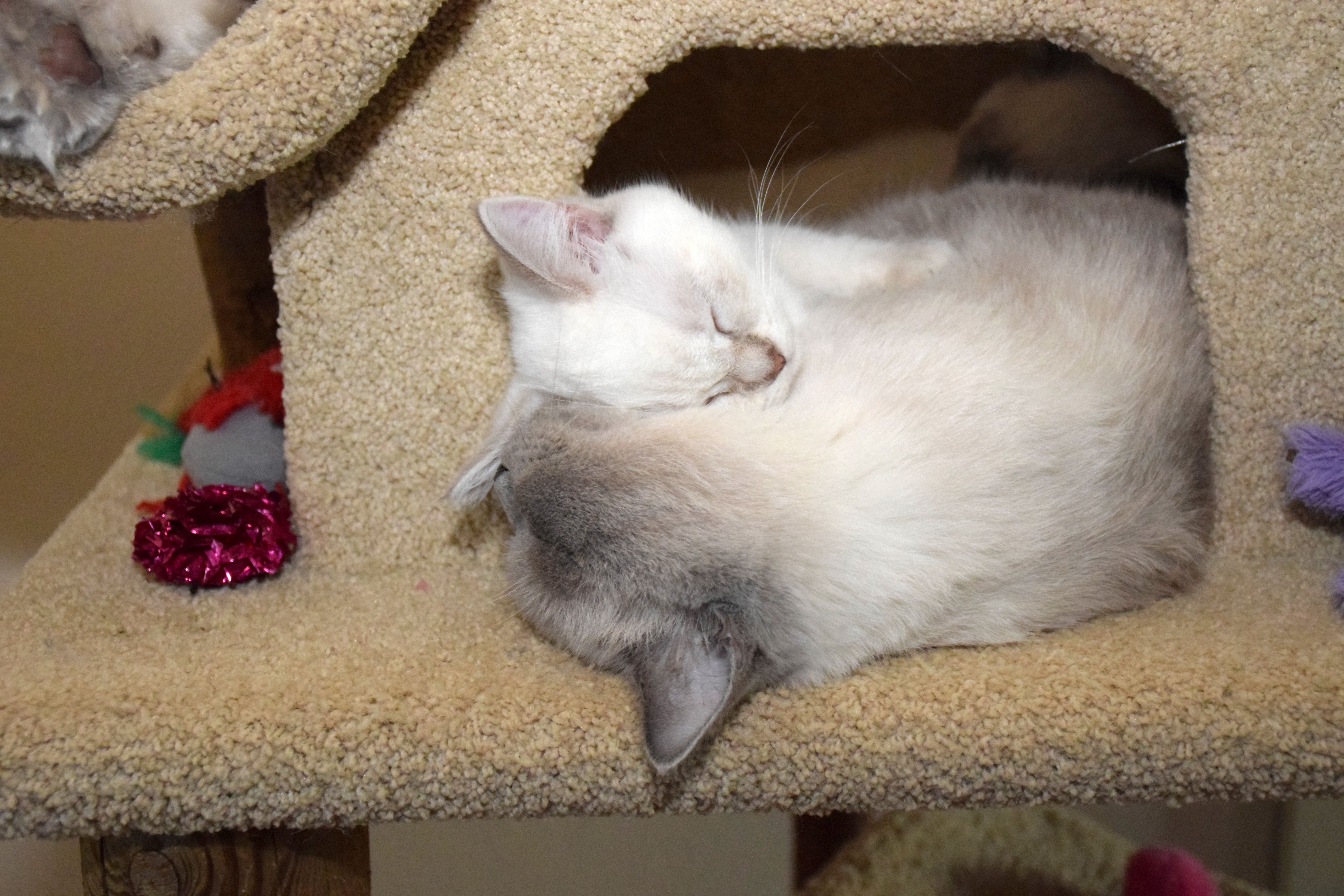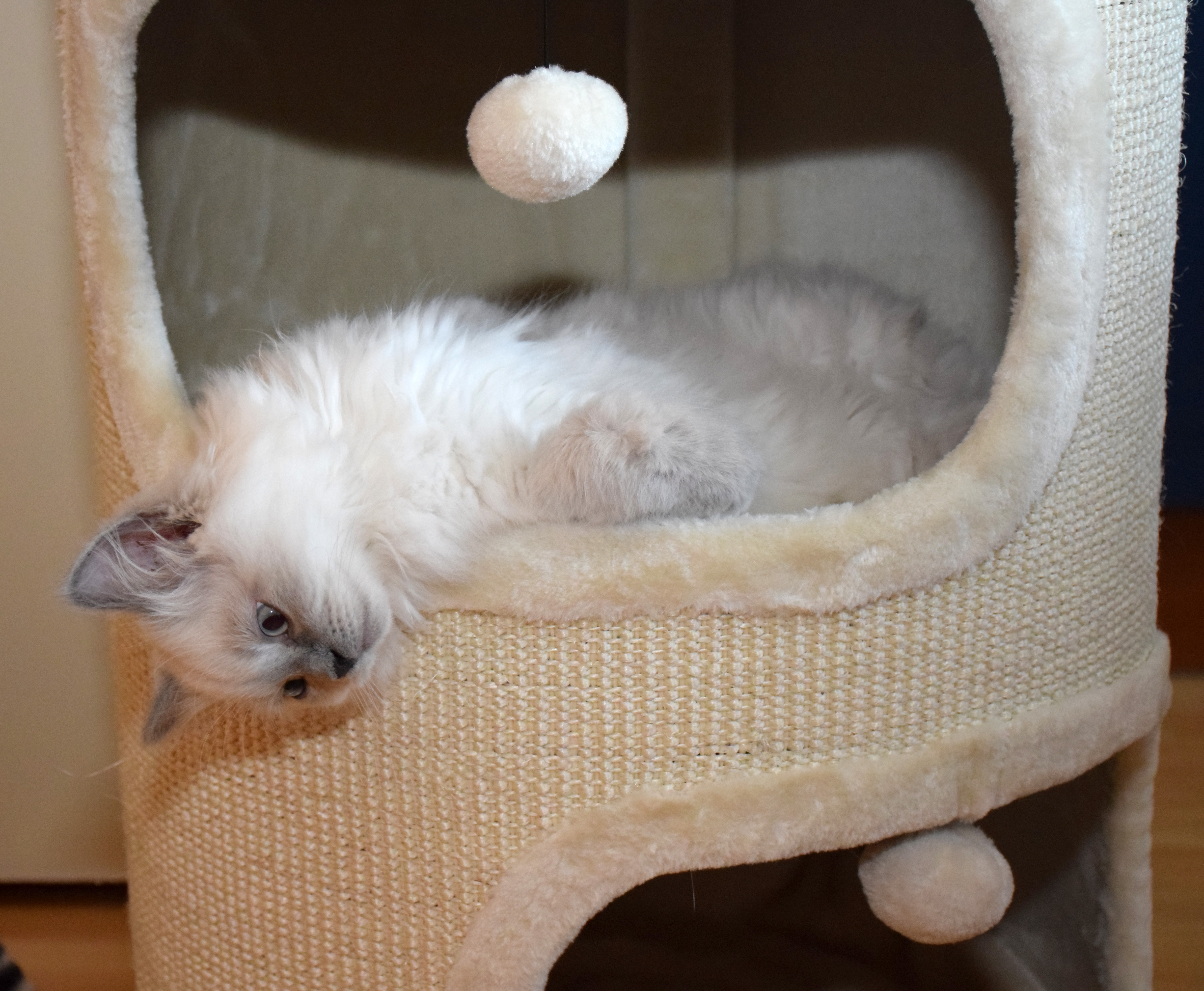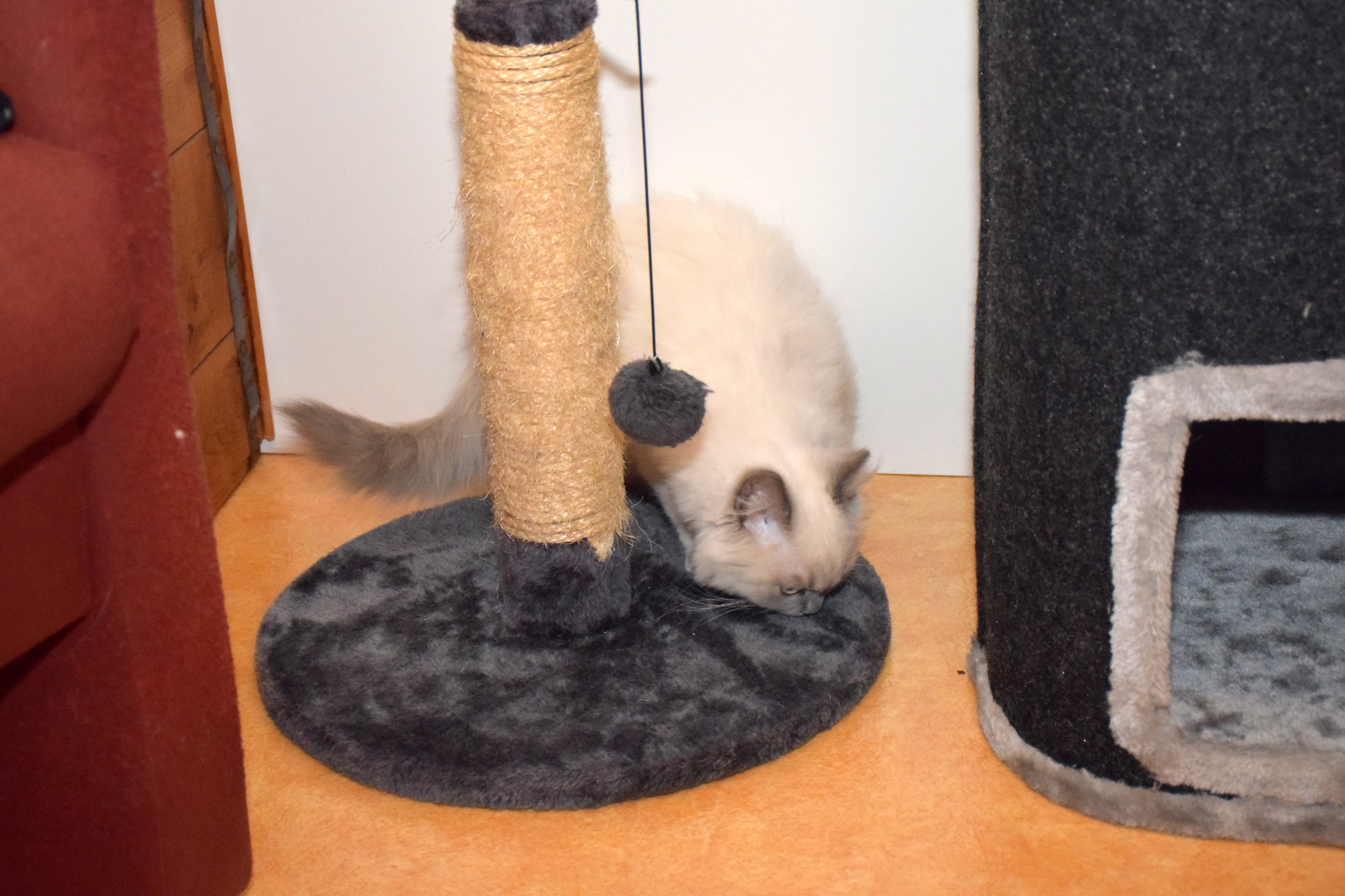 Het kittenkrabtonnetje is inmiddels te klein, dus is mama Mili verhuisd naar de krabmandjes… maar ook vinden ze het leuk om met zijn allen, op diverse verdiepingen in de krabpaal te liggen. En dan van boven eraf springen…. je houdt je hart vast, maar je bent nooit op tijd om ze er uit te zetten.