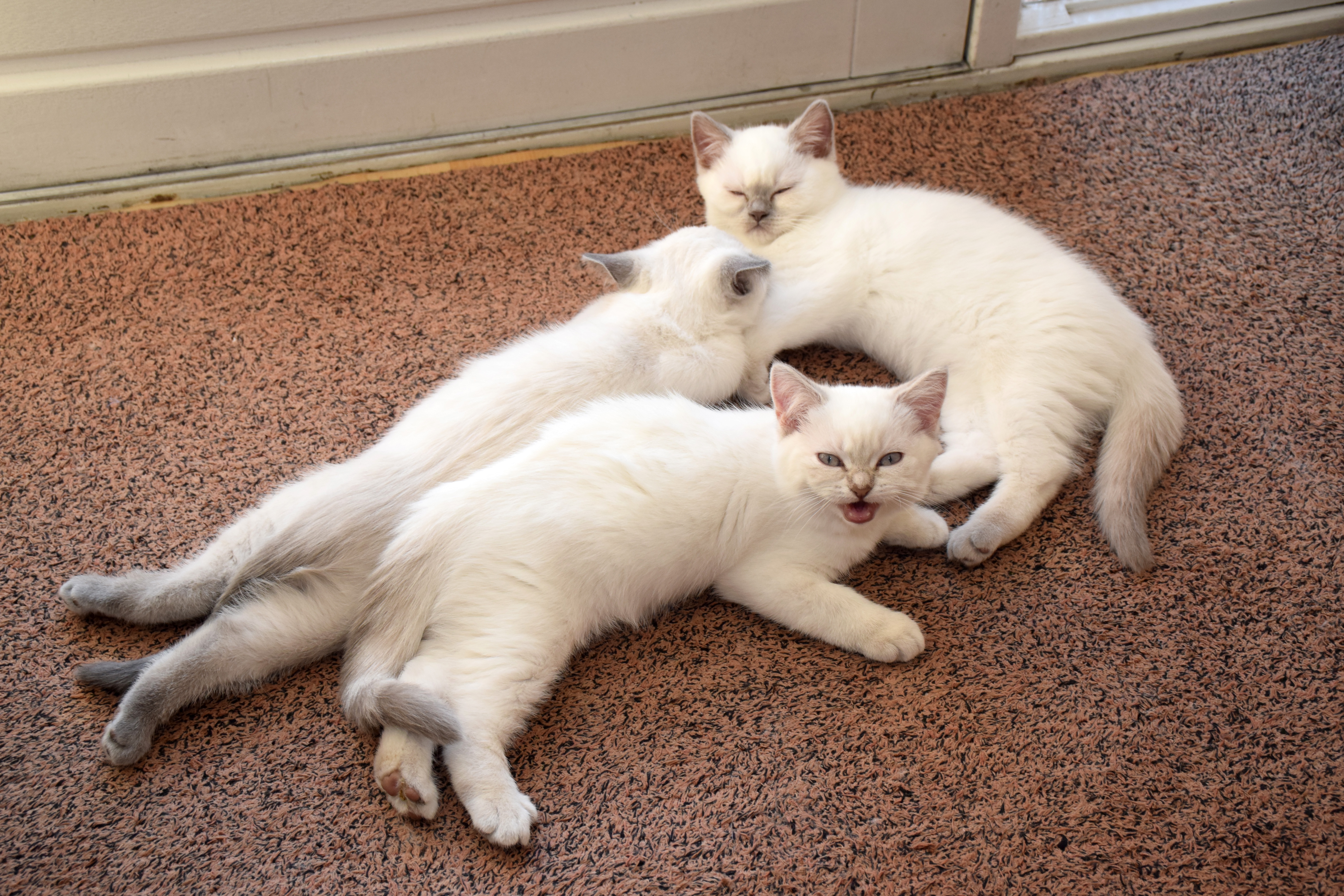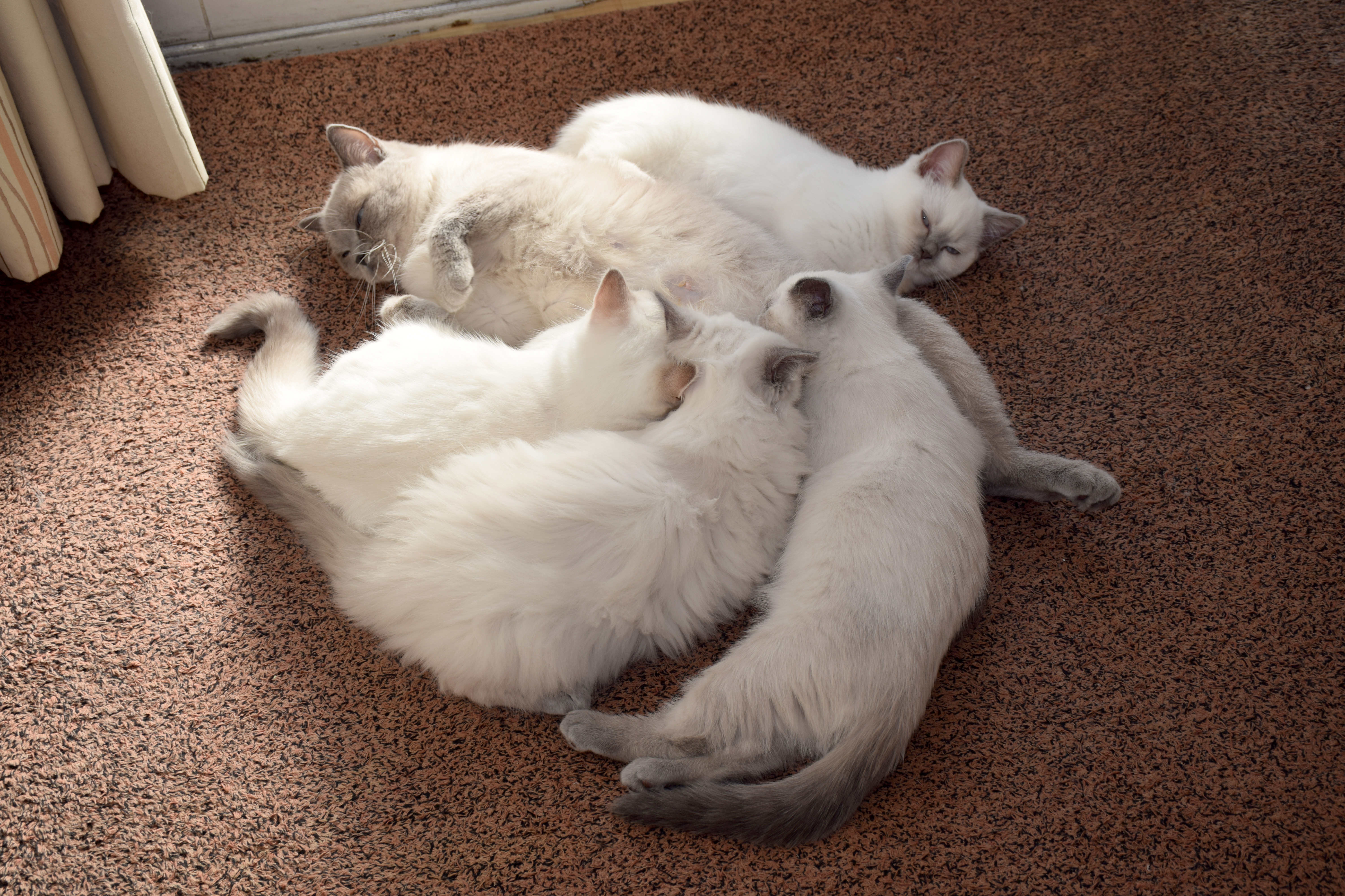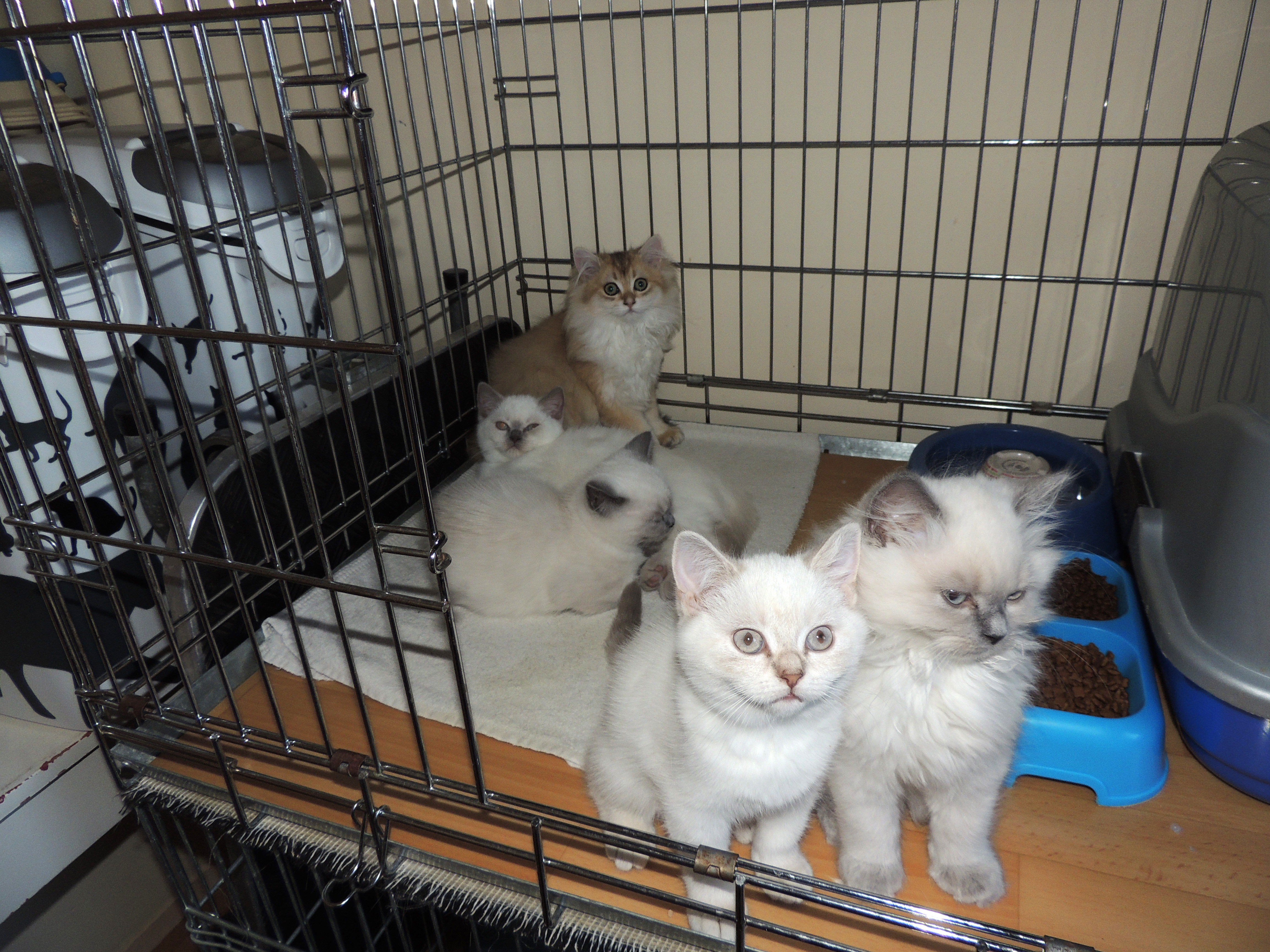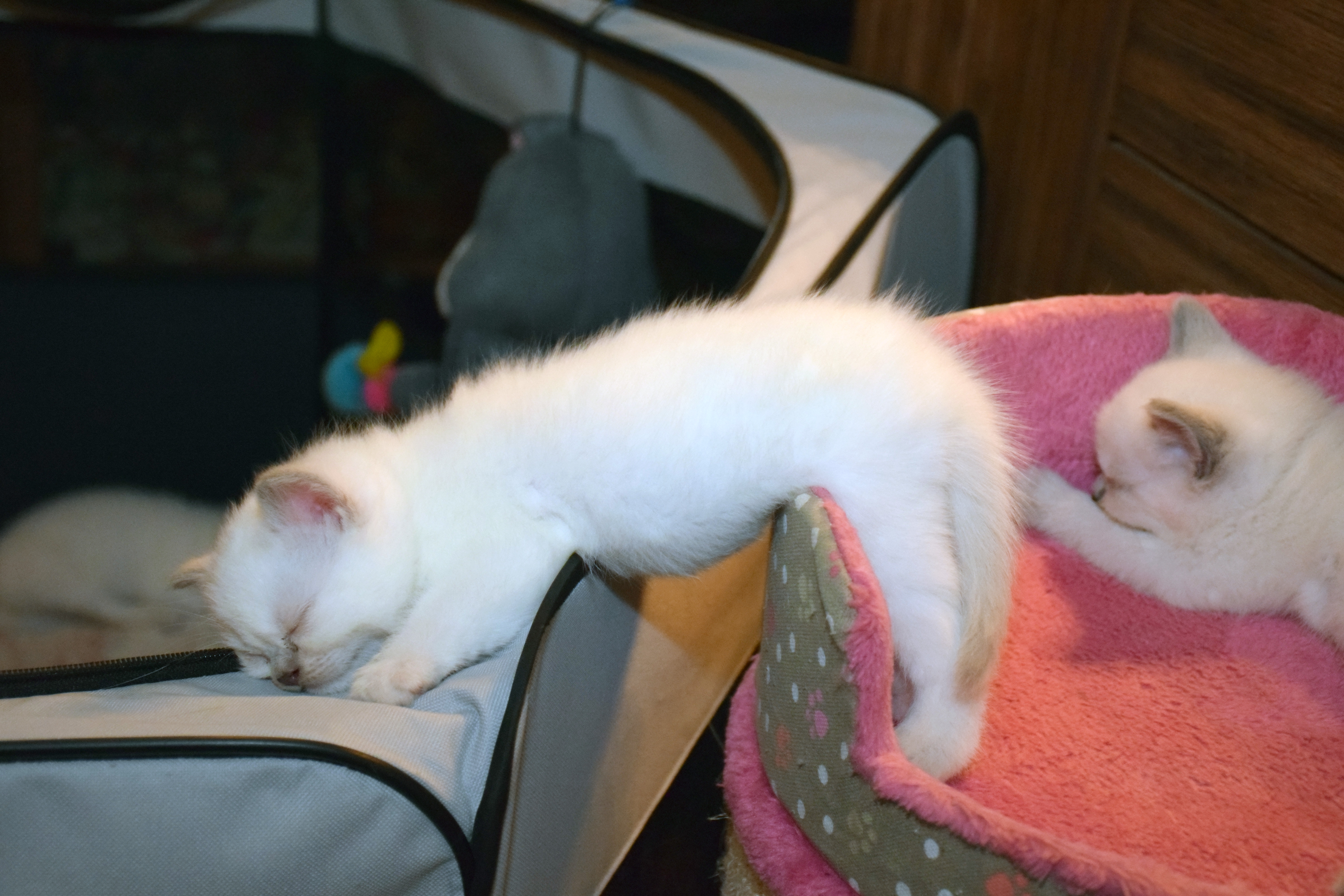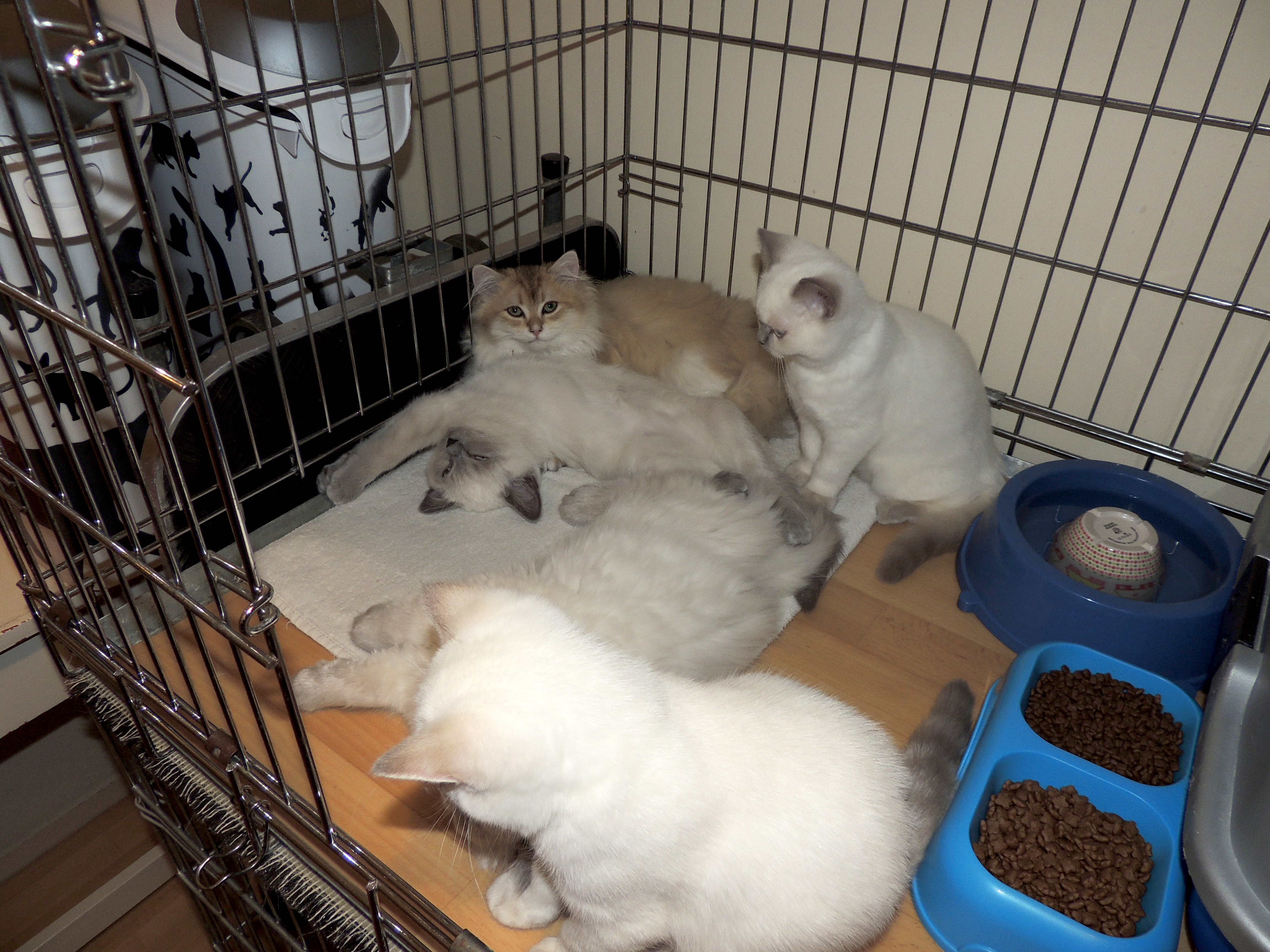 De grote verhuizing heeft plaatsgevonden.. YES.. we hebben ons huis weer terug.. of toch niet? In plaats van dat ze nu af en toe in de bench gezet worden om te slapen, vallen ze nu waar dan ook in slaap… met tijd en wijlen ligt de kamer bezaaid met katten: 10 volwassenen en 8 kittens… Maar oh, wat is dat genieten! Voor de kittens is het wel even wennen om nu naar boven te moeten. Na iedere maaltijd worden ze naar boven gebracht, even de bench in voor een bakbezoek en een slaapje. Dan weer naar beneden. Iedere avond klinkt het bekende “alle katten verzamelen”… helaas, weten de kleintjes van Mili nog niet dat het de bedoeling is naar boven te gaan… in plaats daarvan stuiven ze alle kanten uit.. zucht. Het verzamelen van de kittens kan beginnen en als de kamerdeur dan op een kier staat, druppelt de rest van de katten ook weer naar binnen… het kost ons echt zo’n vijf minuten extra om iedereen boven te krijgen. Maar… ook dit wordt beter naarmate de tijd verstrijkt en binnenkort zullen ze het commando wel kennen.