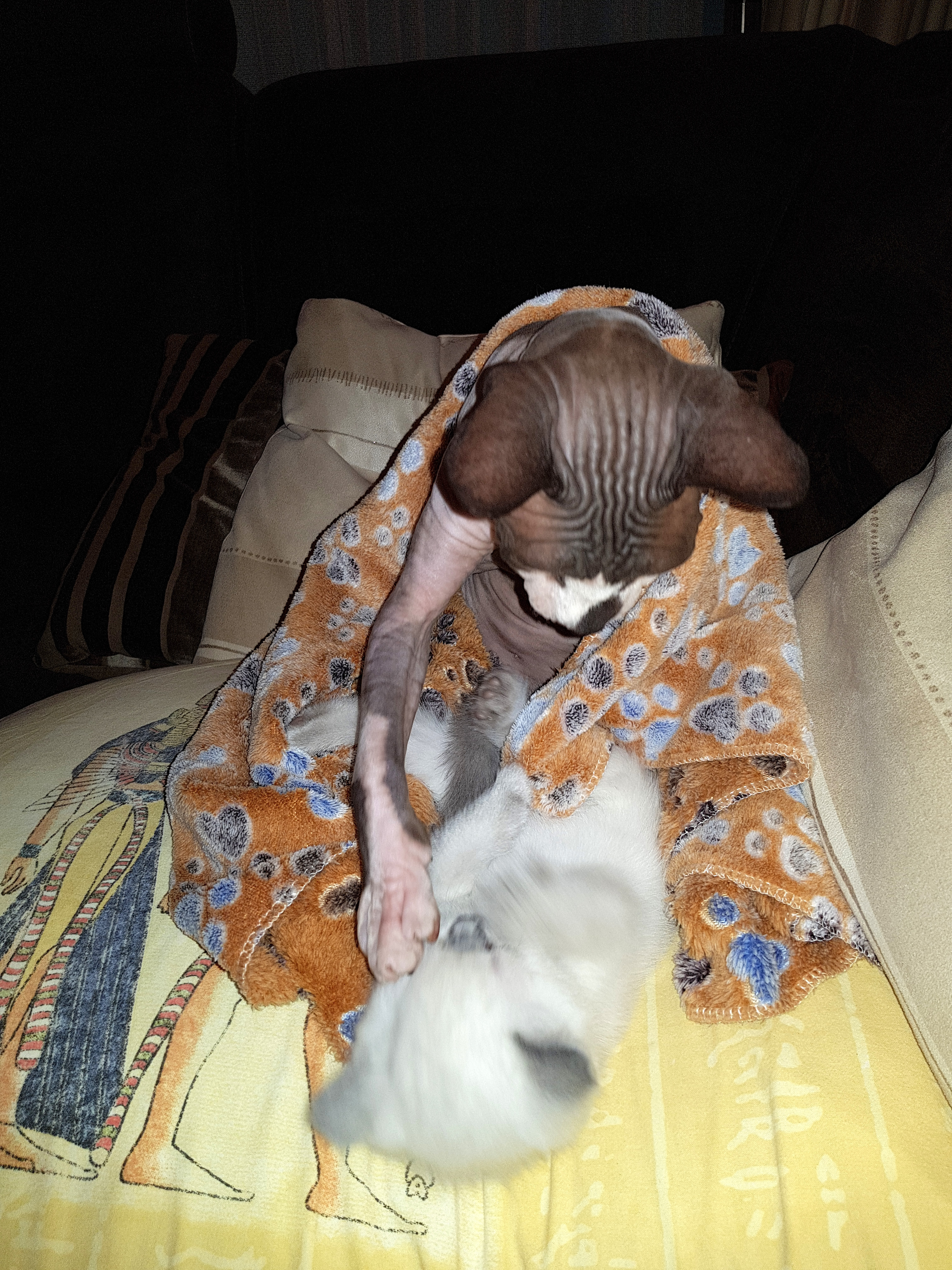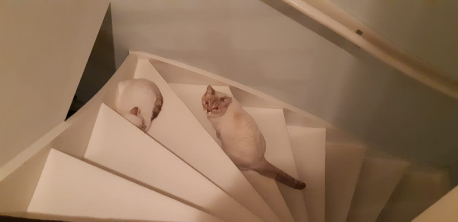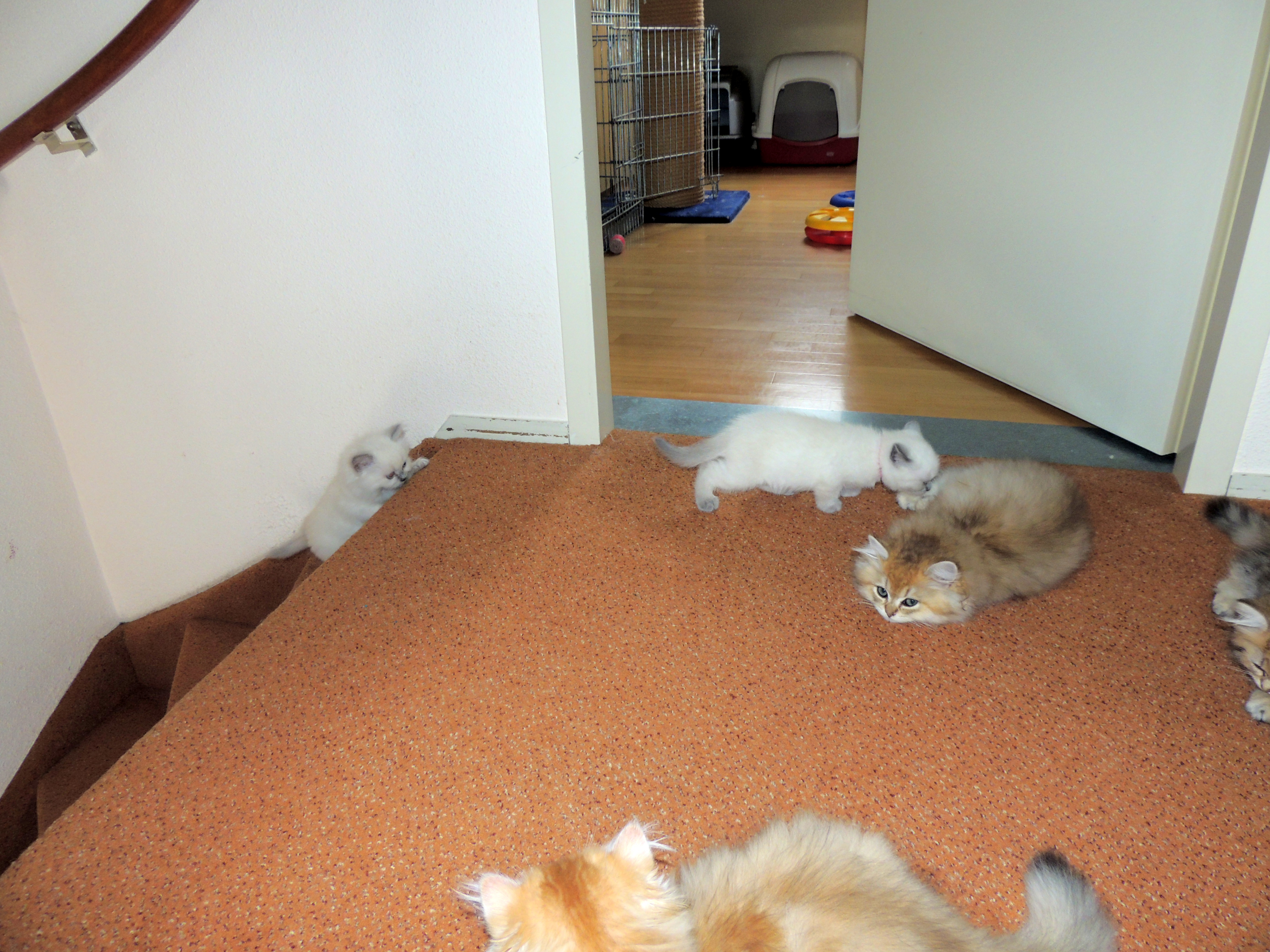 Ze kennen de dril inmiddels, maar zijn het er niet altijd mee eens… eten en dan even naar boven voor een dutje en kattenbakbezoek. Wat gebeurt er, ze eten… rennen vervolgens alle kanten uit en je kunt ze proberen te vangen.. we krijgen er routine in, als we met zijn tweeën zijn. Rob gaat boven staan, ik pak ze voordat ze kunnen gaan sprinten, zet ze op de trap, geef ze een klein duwtje, ze sprinten naar boven en Rob vangt ze daar op… LOL… tja…. zeg niet dat fokkers een luizenleventje hebben als ze kittens hebben!!