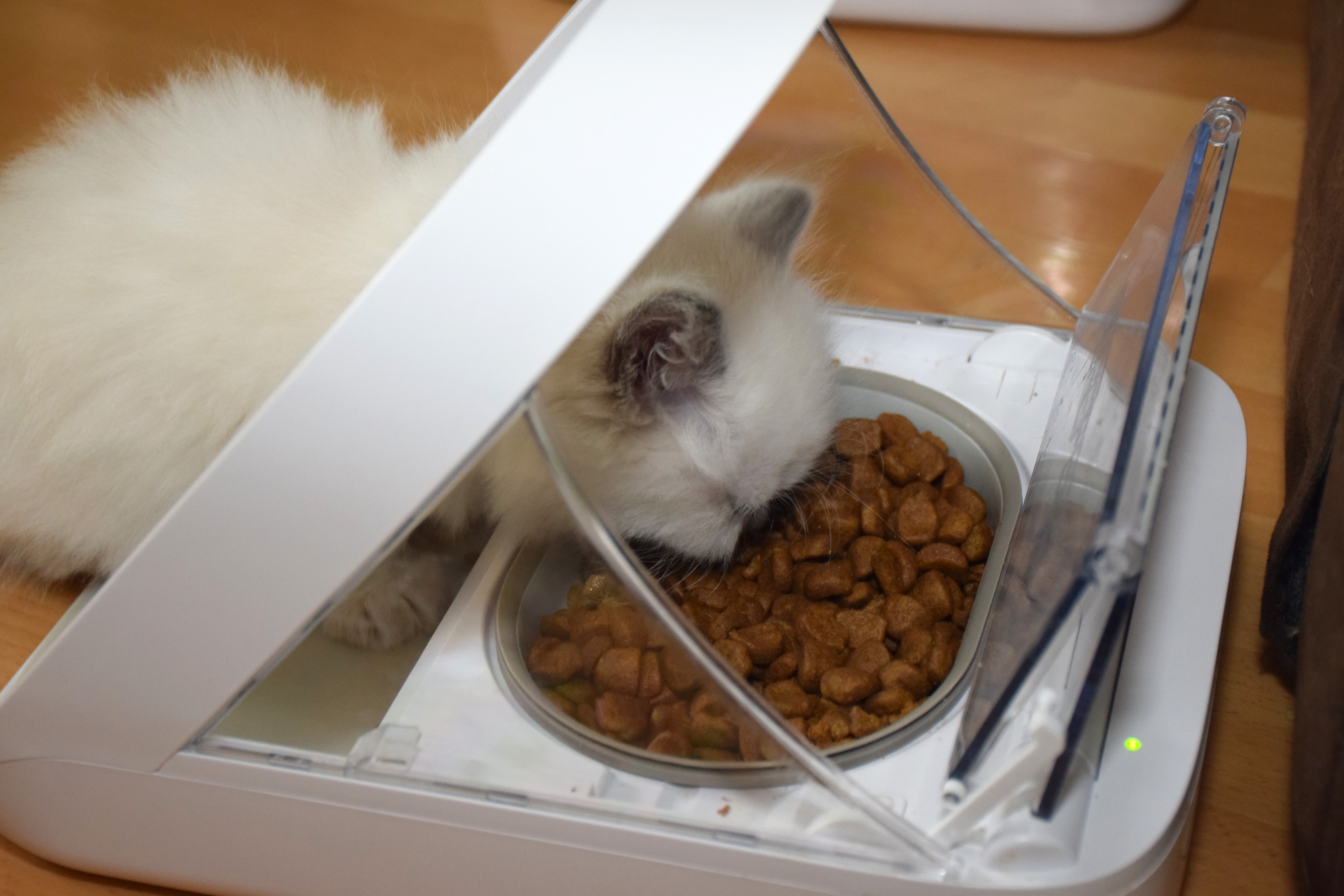 Myron heeft ontdekt dat hij, als de voedselautomaat open staat, heerlijk kan snoepen van de brokjes die daarin zitten… wat een mannetje!!