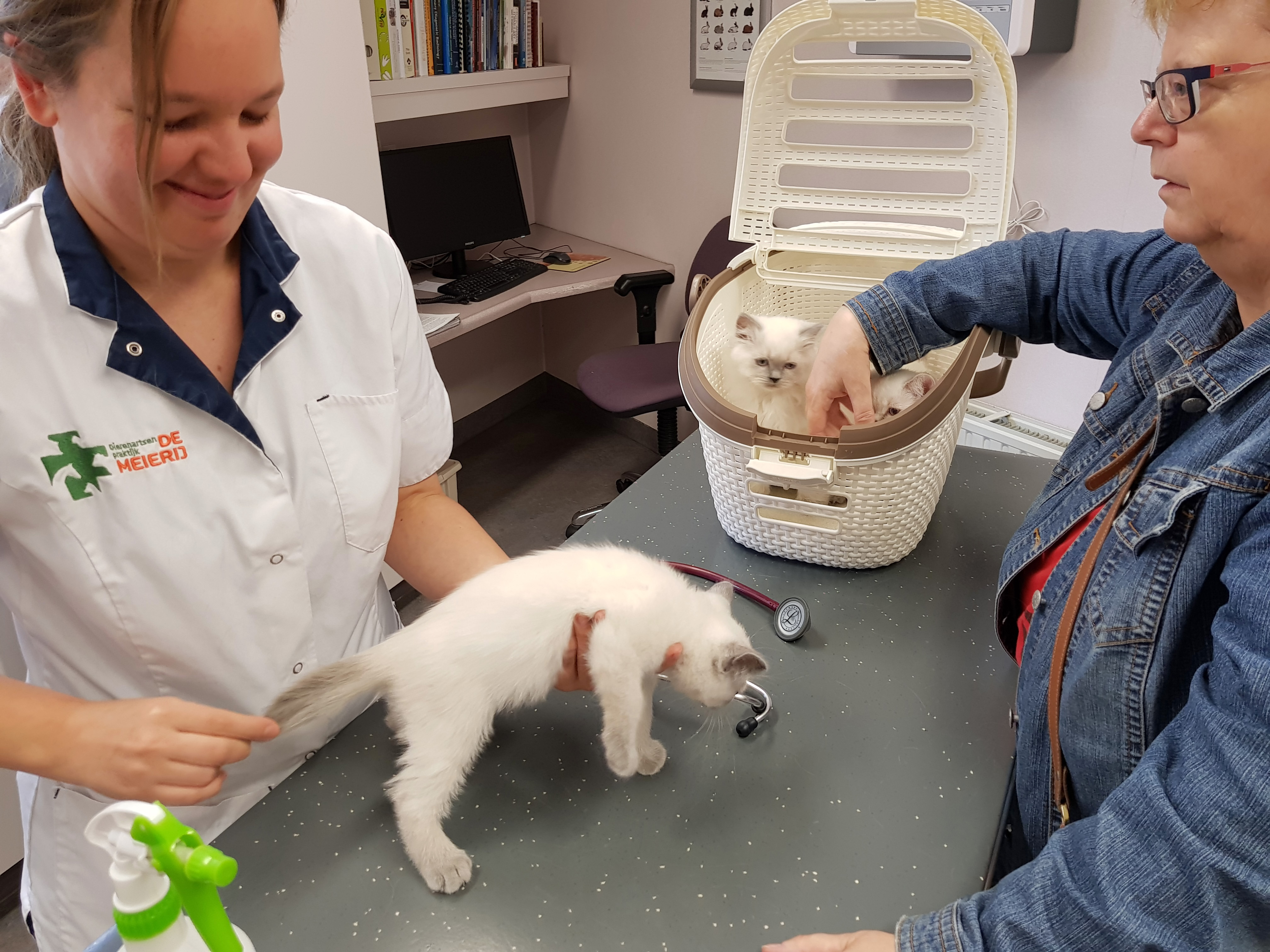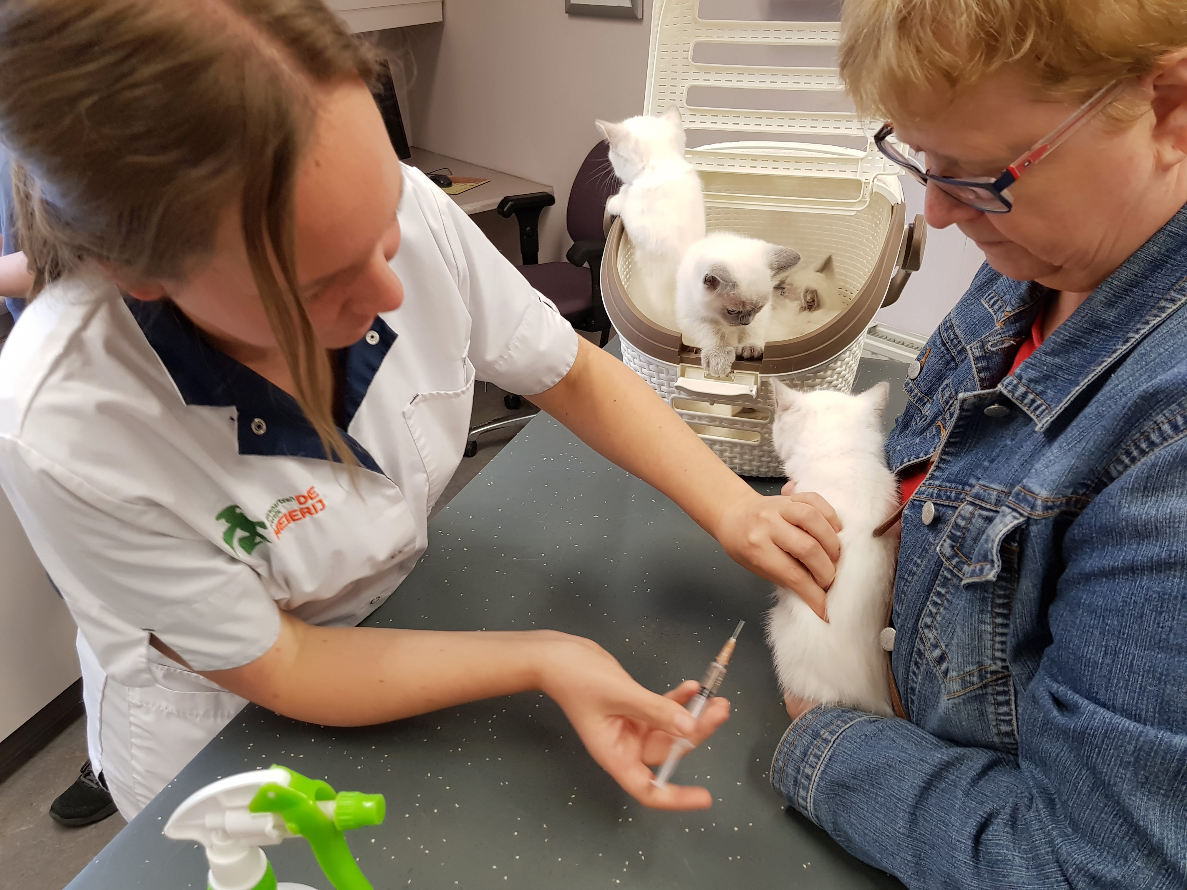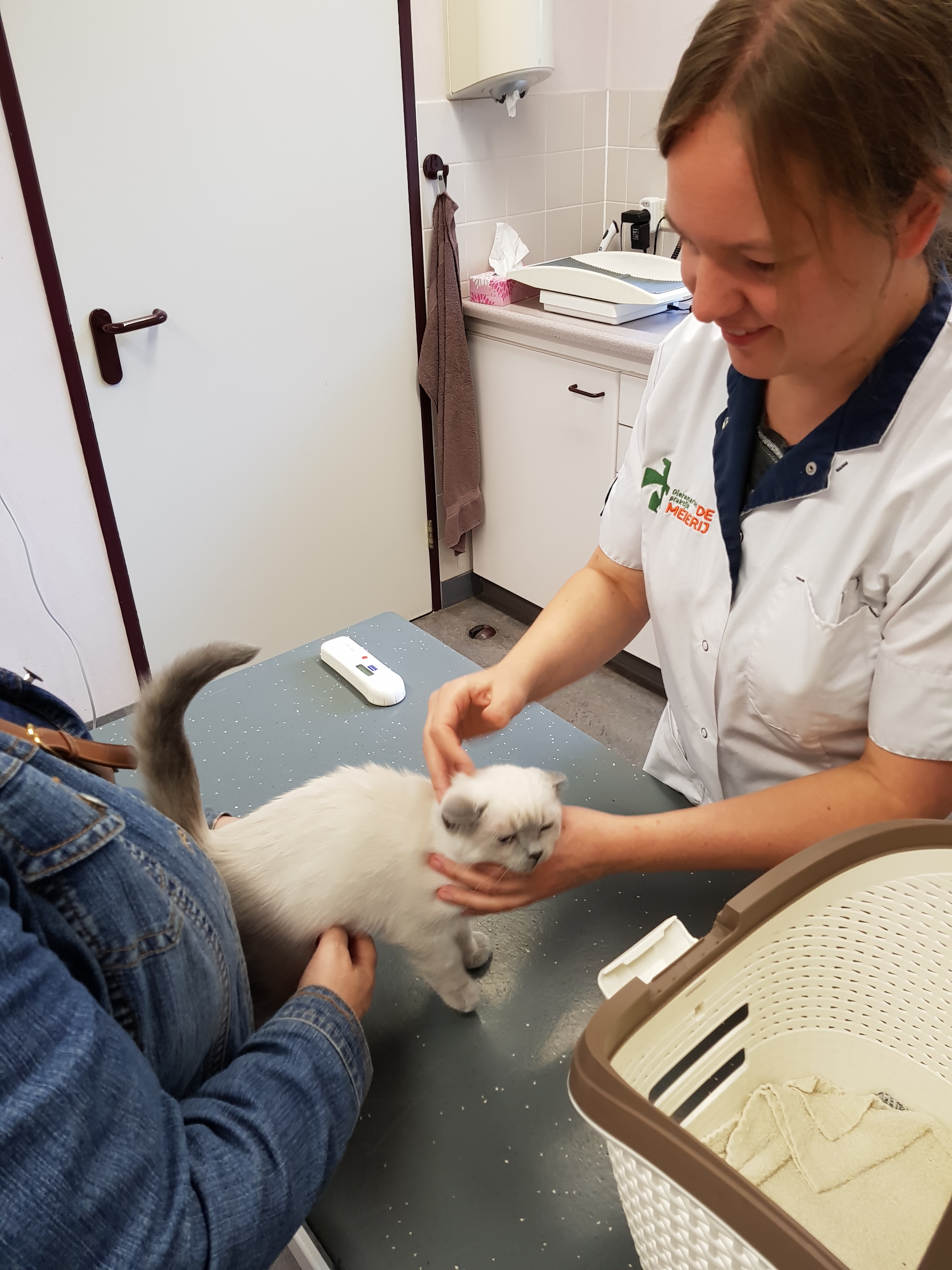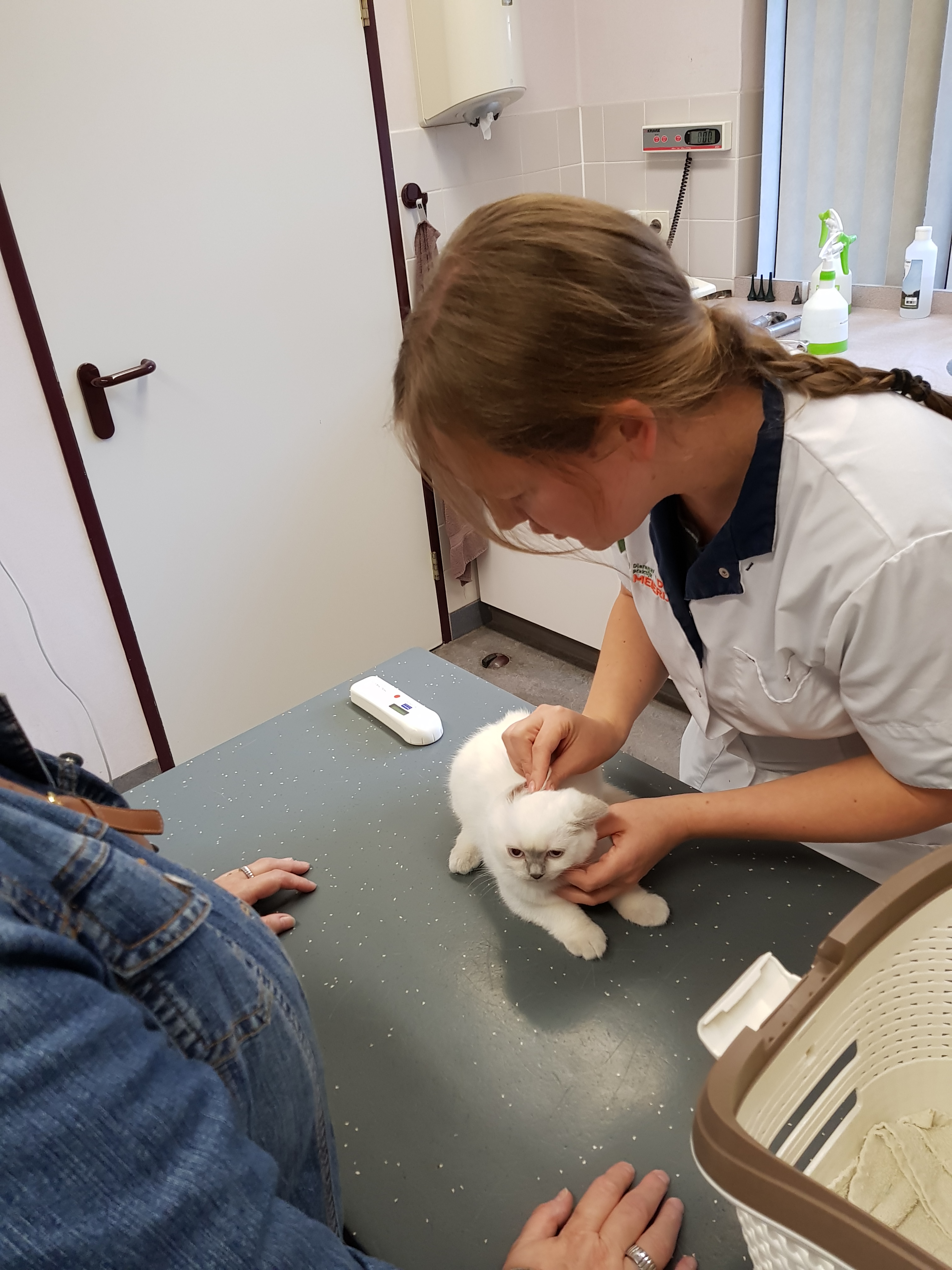 Entingtijd! Vol goede moed gaan we met Mili en de kleintjes naar de dierenarts. Nadat mama het voorbeeld heeft gegeven, is eerst Myron aan de beurt. Hij gedraagt zich goed, maar vindt het prikje toch niet zo leuk en probeert hij zich uit onze handen te wriemelen. Macey is de volgende patiënt en ook zij gedraagt zich keurig, ondanks dat zij ook nog wat gewriemel, waardoor we besluiten om de volgende twee dametjes maar goed in de houdgreep te houden. Miley is ook dapper en ondergaat alles zonder klagen. Ons eigen poesje Mylou wordt extra gecheckt, om er toch maar zeker van te zijn dat ze een poesje is en dat ze geen gekke afwijkingen heeft, waardoor we niet met haar zouden kunnen fokken. Al met al geen echt slechte ervaring en geen slechte herinnering aan Saskia, want die zien ze nog wel een keertje terug… 🙂