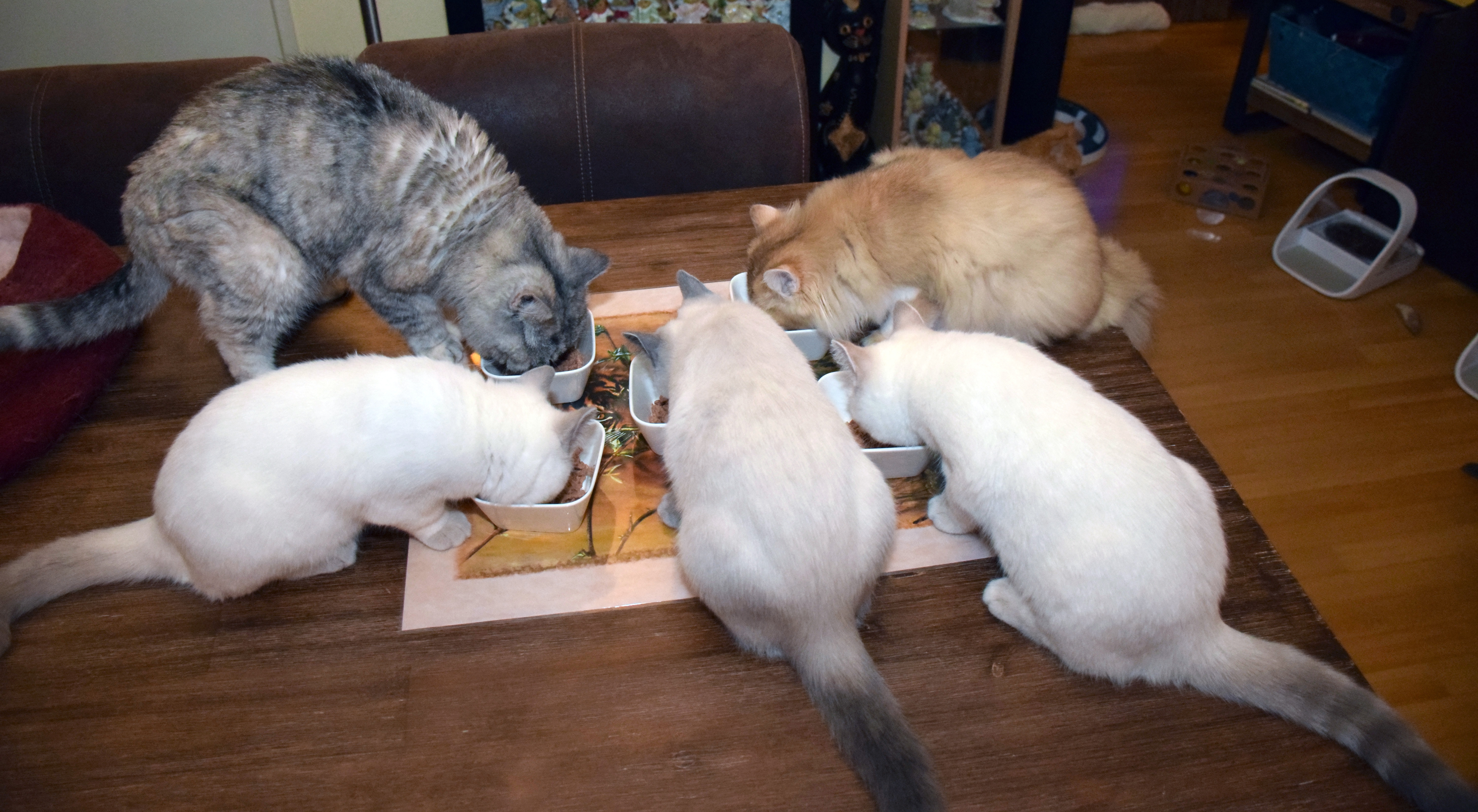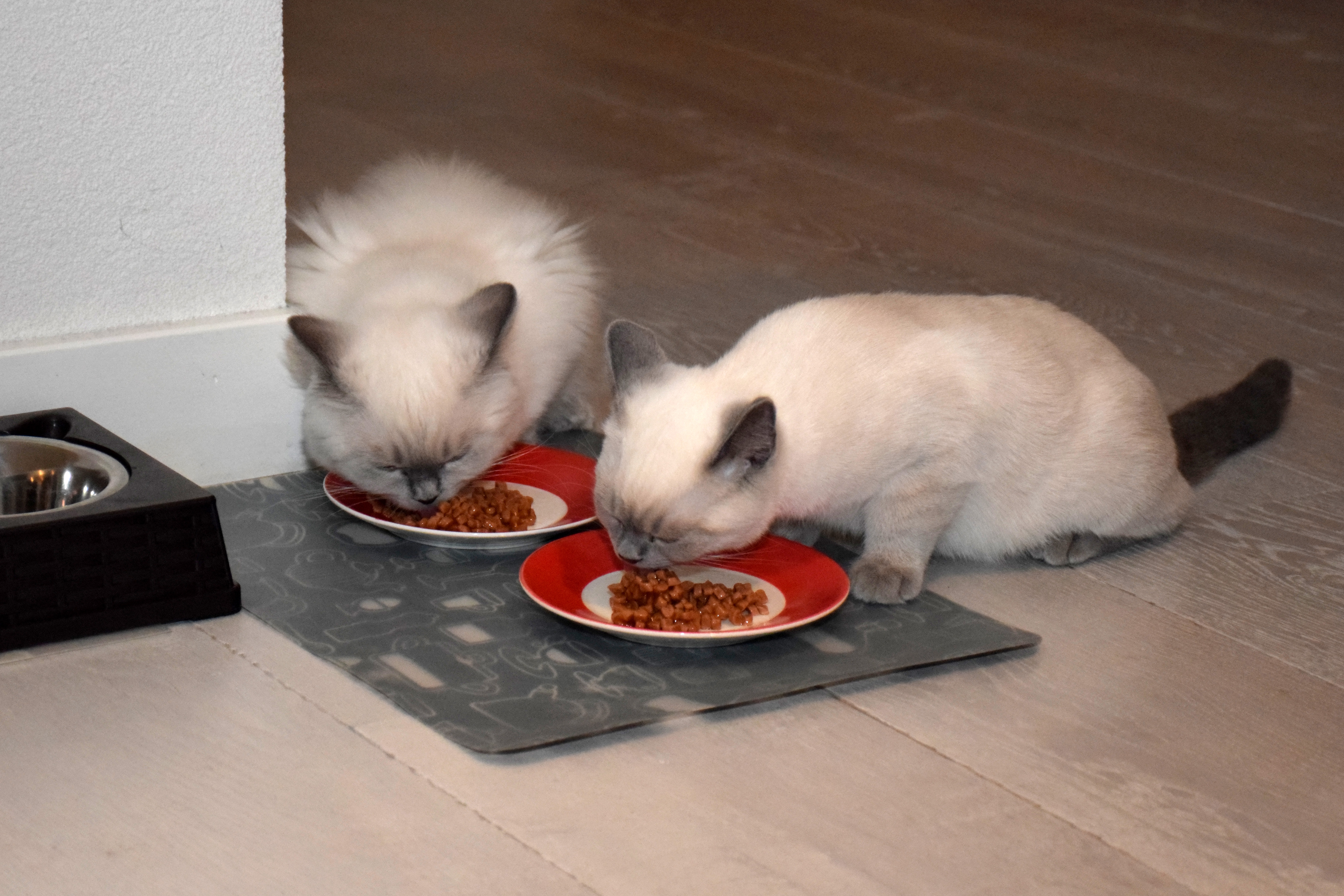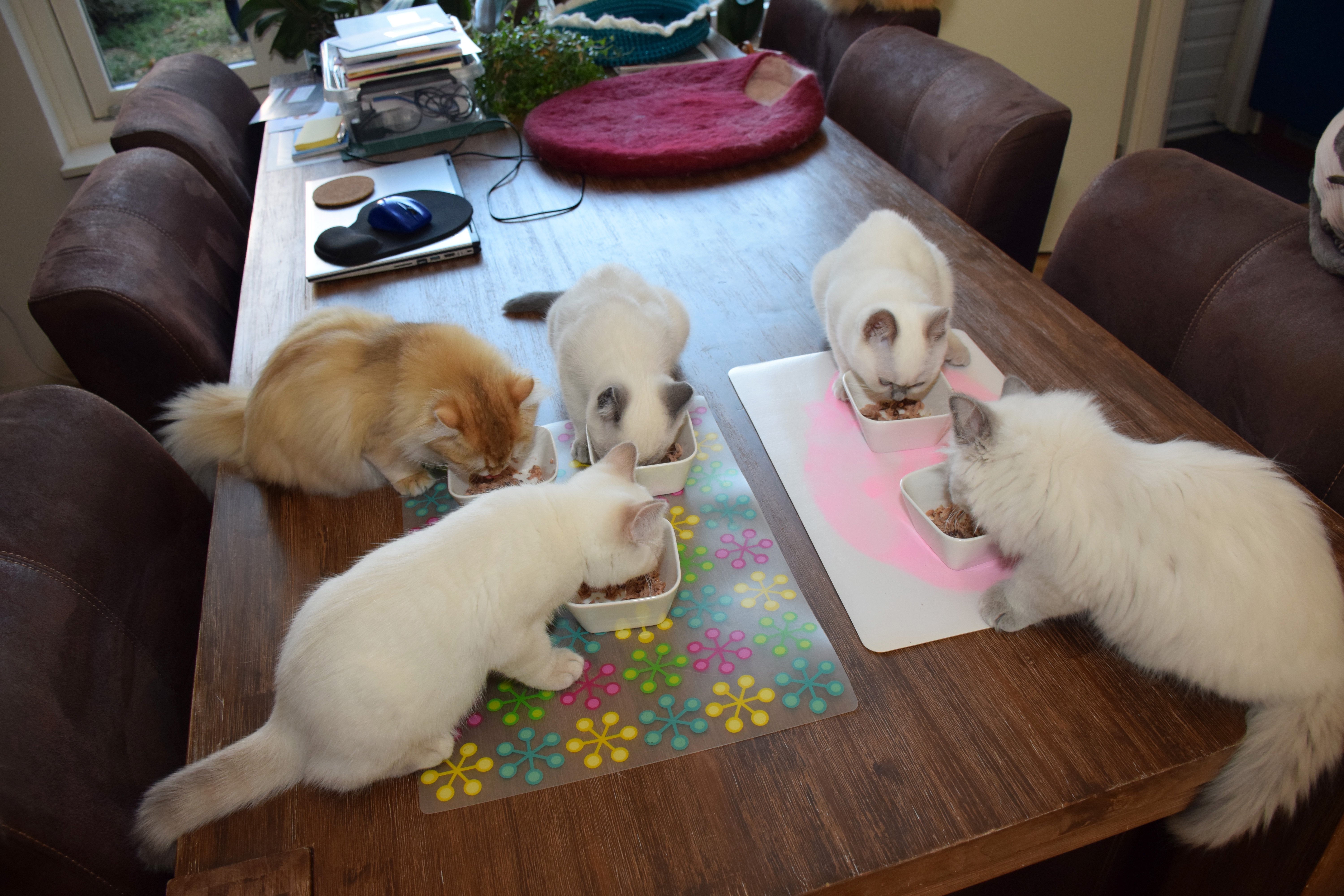 Miley heeft een nieuwe “streek”… niet eten als we haar het bakje zachtvoer voorzetten, nee….. eerst moet het bakje bij Mili neergezet worden en dan kan Miley lekker bij mama stelen.