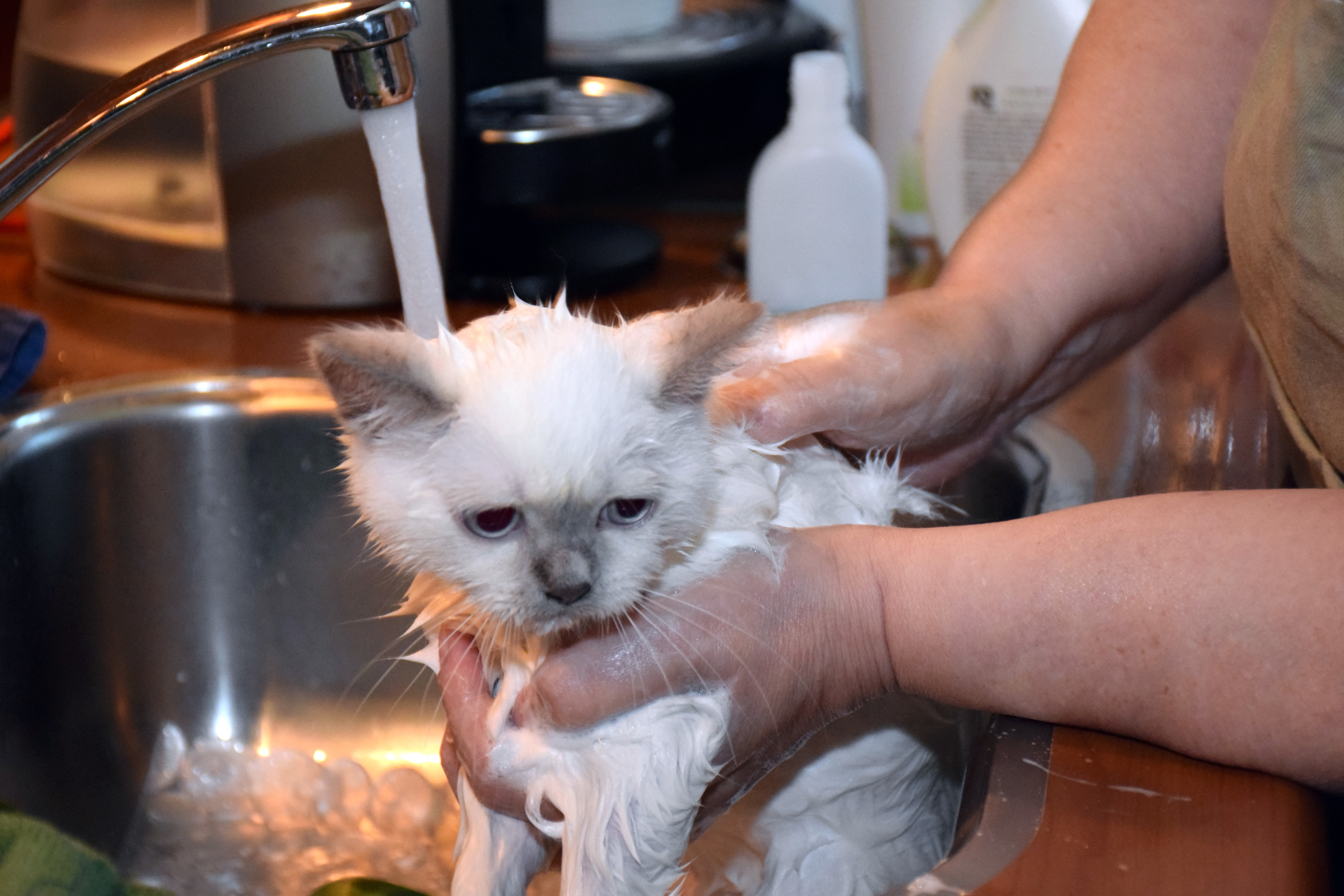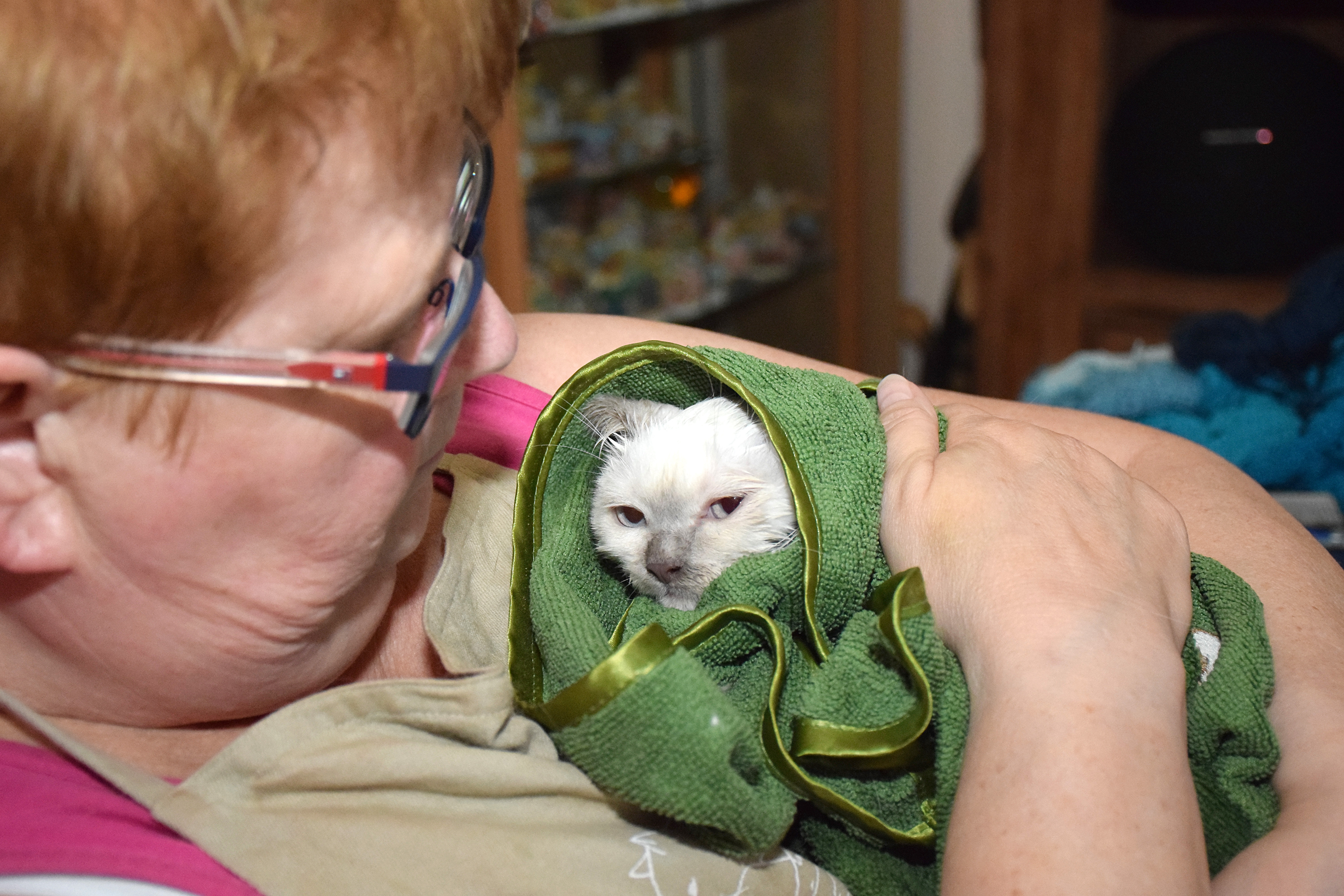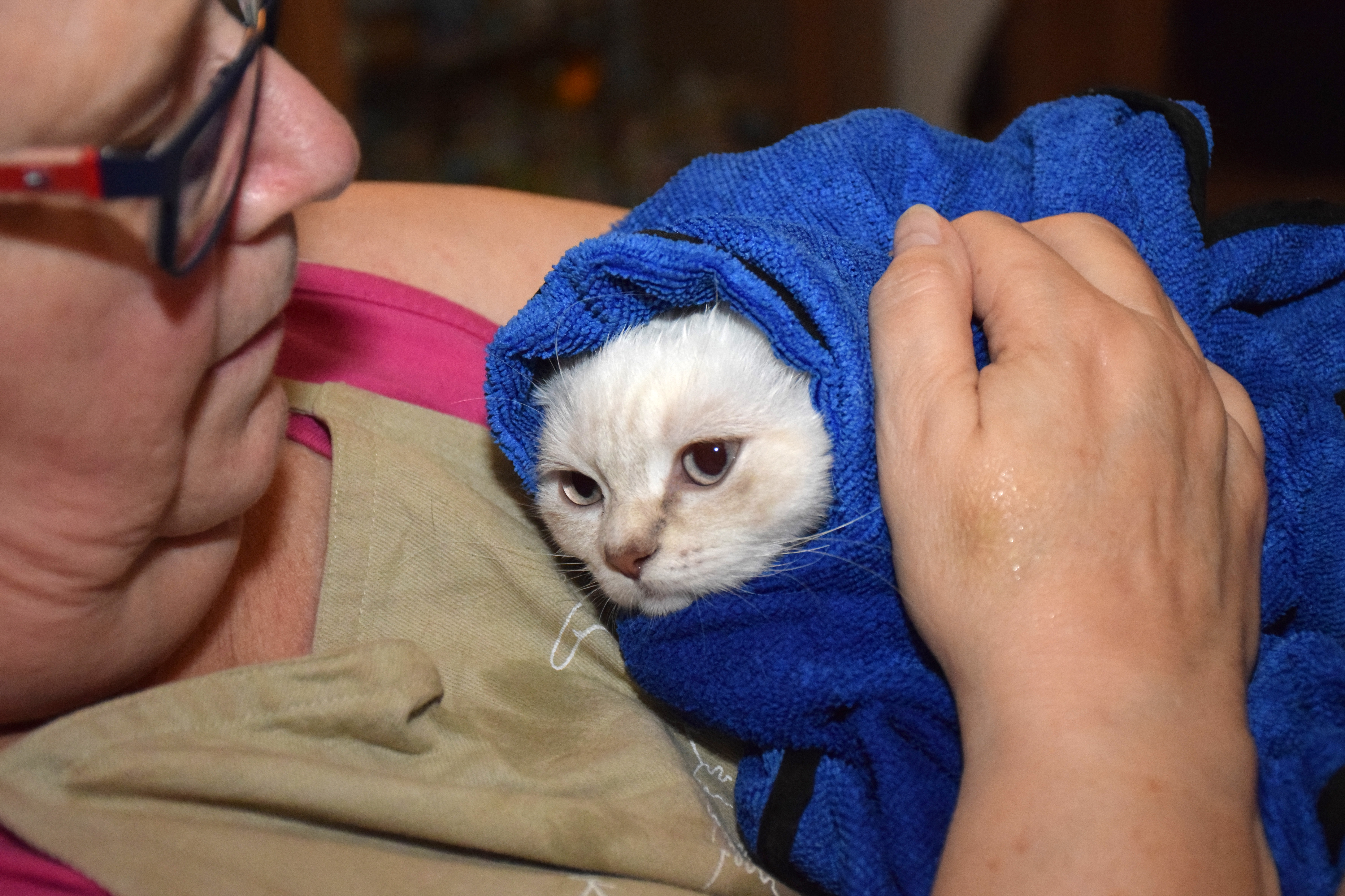 Omdat de kittens al eens met hun kontjes onder de kraan zijn geweest, is het water op zich niet eng, maar er helemaal onder gezet worden, dat is toch wel een ander verhaal. Maar als ze voelen dat het water lekker warm is, ondergaan ze de behandeling zonder problemen. Na het badderen deppen we ze lekker droog in een heerlijk zachte microvezel handdoek. Dan het föhnen, iets wat ze nog nooit meegemaakt hebben. Dus laten we ze eerste de fohn horen, waarna we voorzichtig op hun kontje beginnen te fohnen. Macey Coco vindt het helemaal niets, maar als we haar een handdoek over haar koppie leggen, kalmeert ze en even later vindt ze het prima.