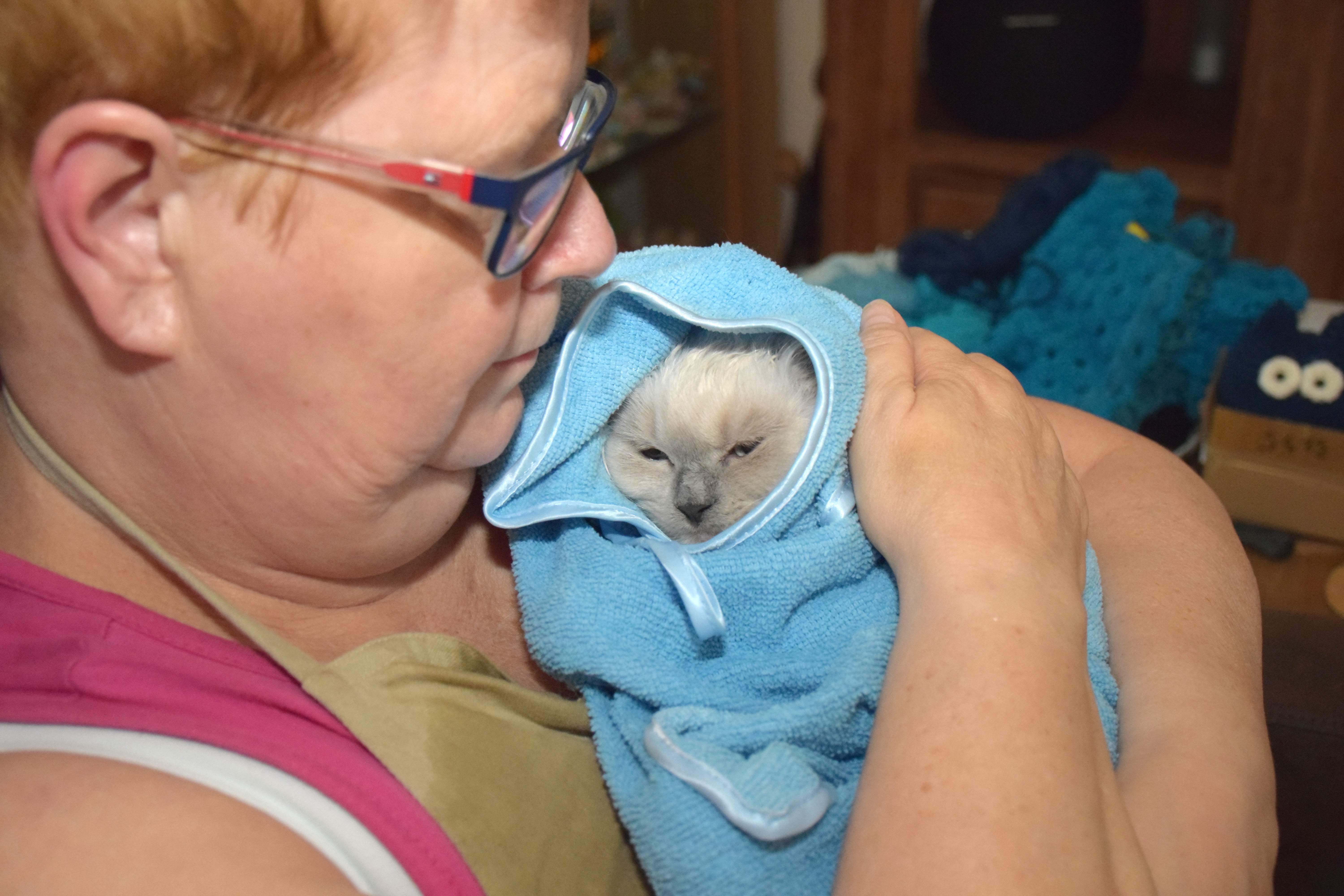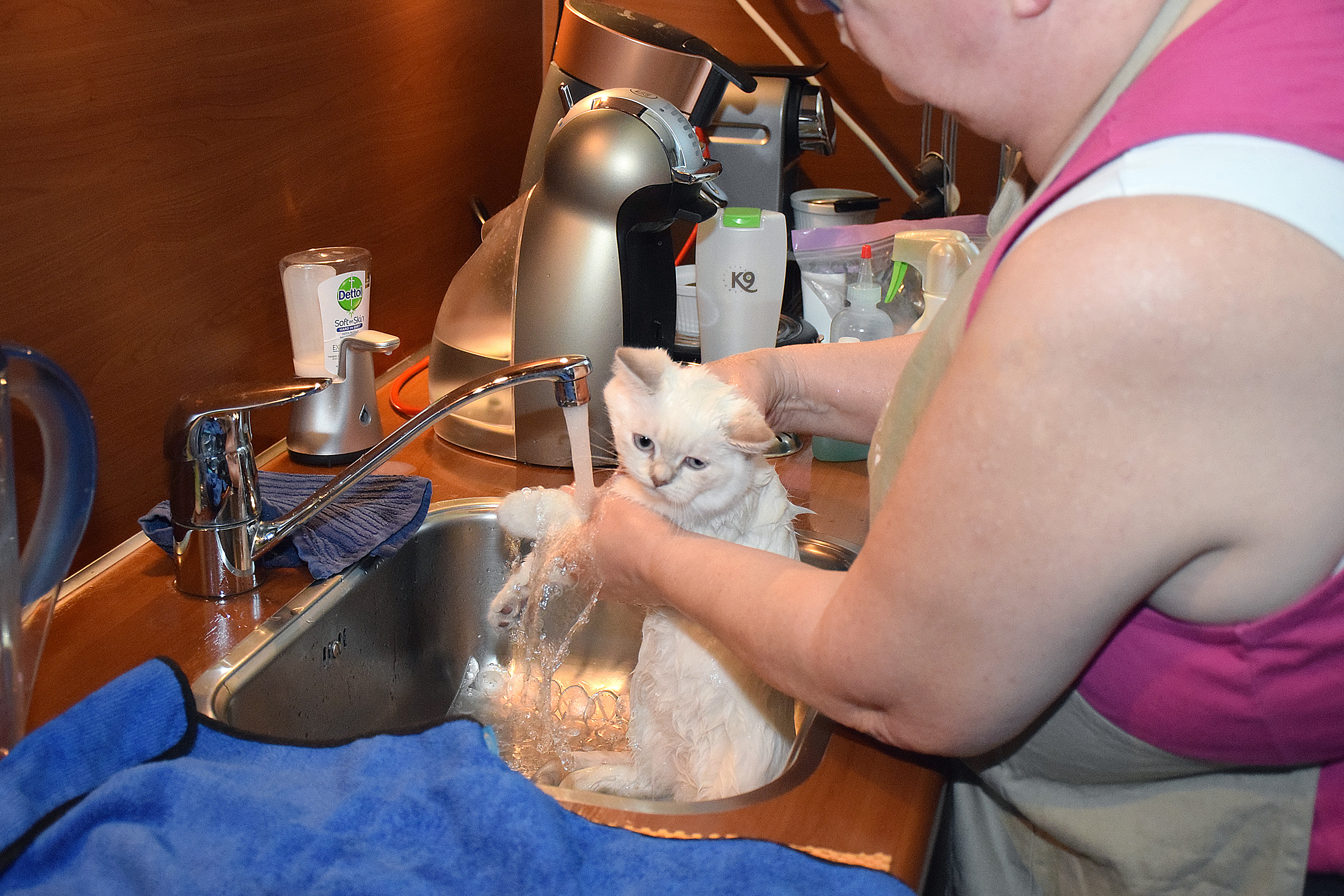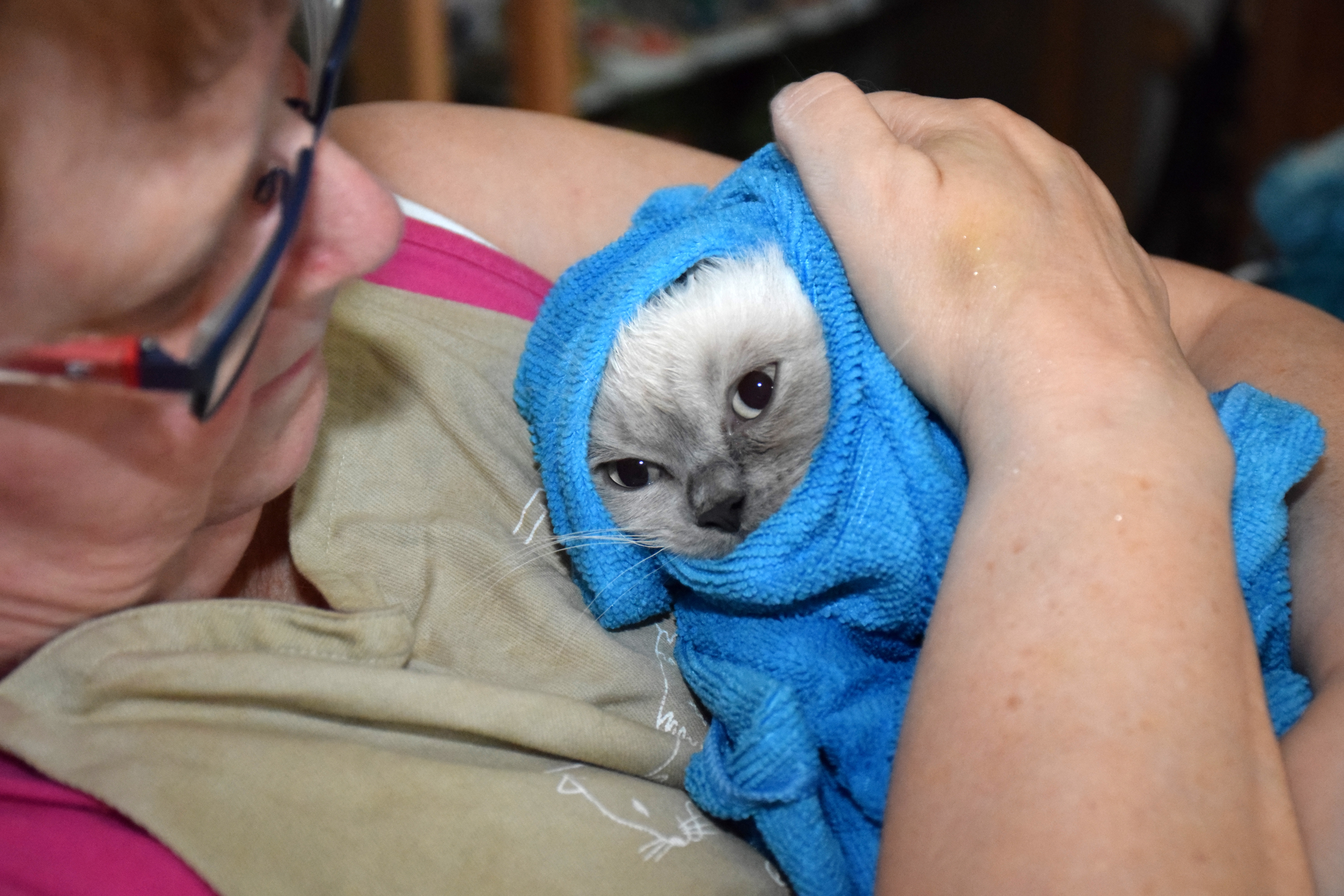 Omdat de kittens al eens met hun kontjes onder de kraan zijn geweest, is het water op zich niet eng, maar er helemaal onder gezet worden, dat is toch wel een ander verhaal. Maar als ze voelen dat het water lekker warm is, ondergaan ze de behandeling zonder problemen. Na het badderen deppen we ze lekker droog in een heerlijk zachte microvezel handdoek. Dan het föhnen, iets wat ze nog nooit meegemaakt hebben. Dus laten we ze eerste de fohn horen, waarna we voorzichtig op hun kontje beginnen te fohnen. Macey Coco vindt het helemaal niets, maar als we haar een handdoek over haar koppie leggen, kalmeert ze en even later vindt ze het prima.